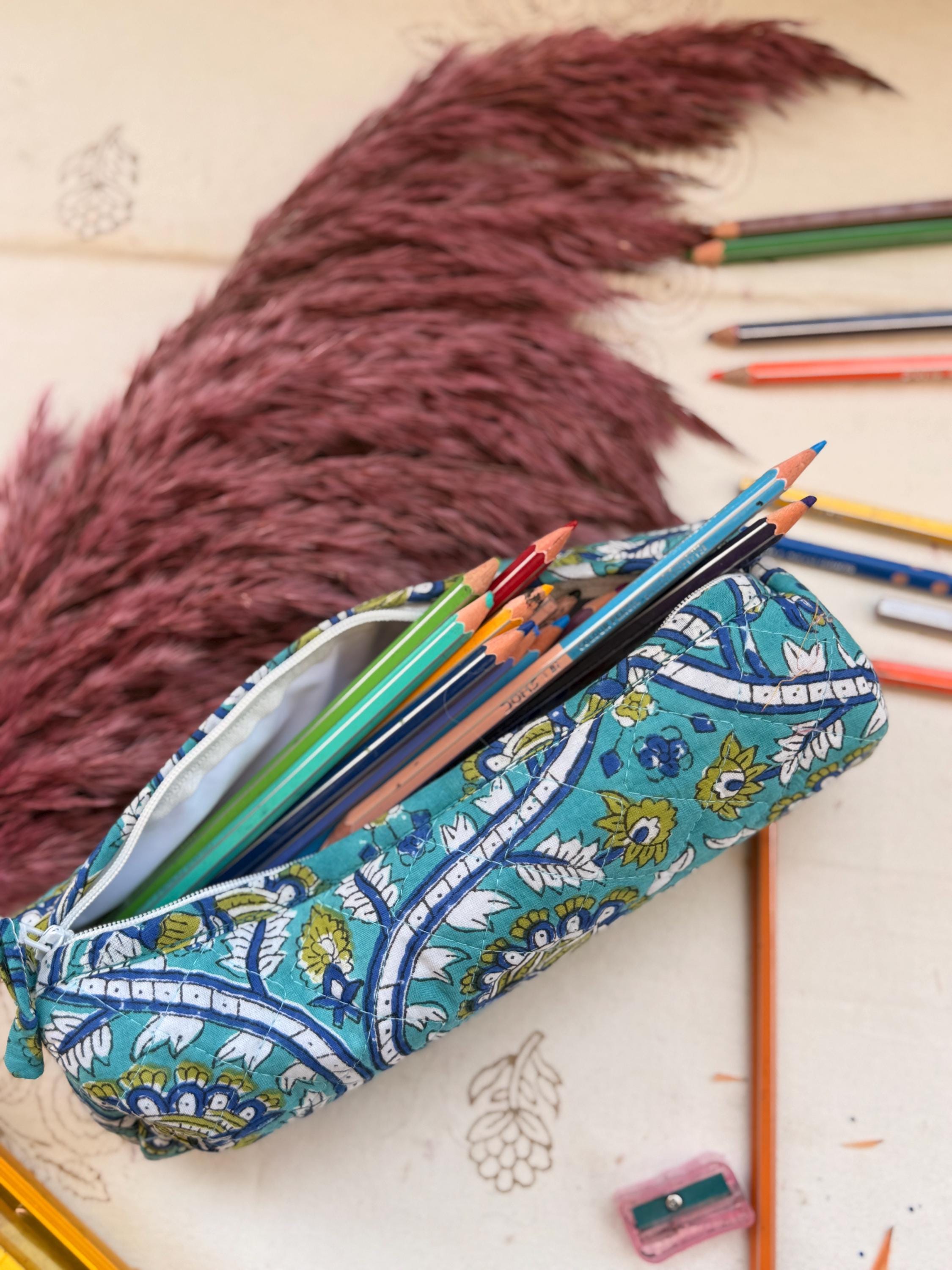 Hand Block Print Pencil Case, Cotton Stationery Pouch, Handmade Zipper Bag, Unique Gift for Students
