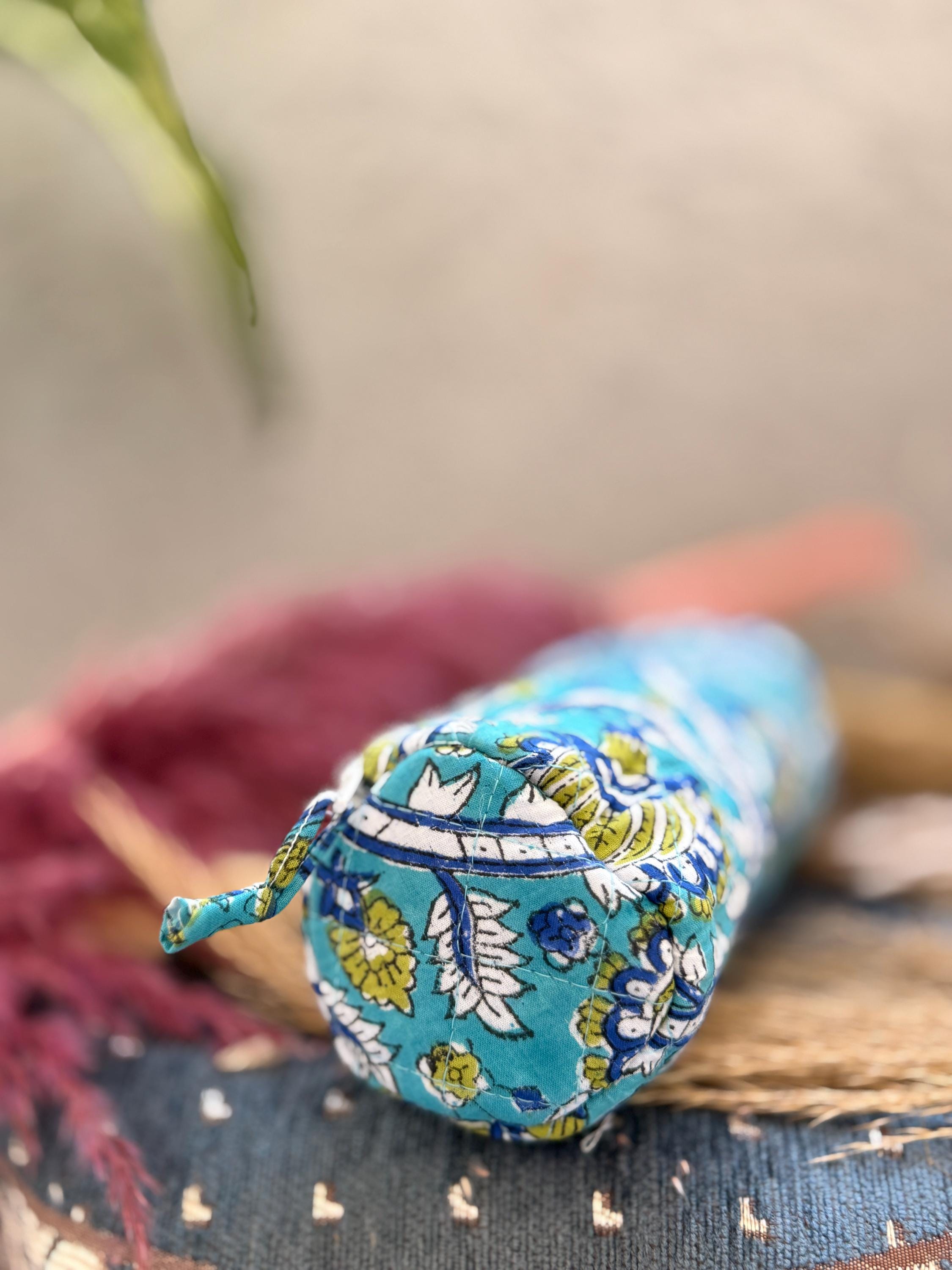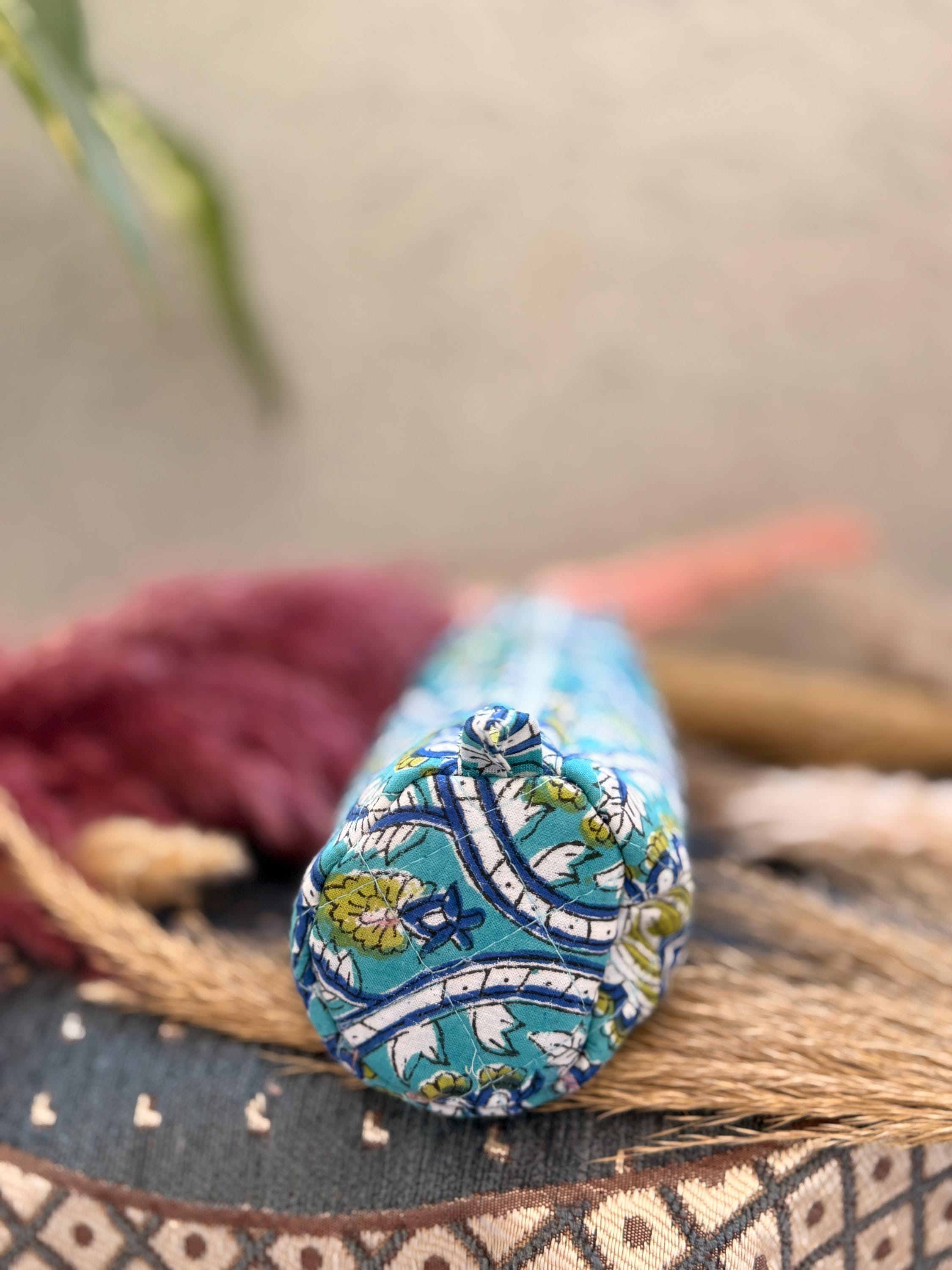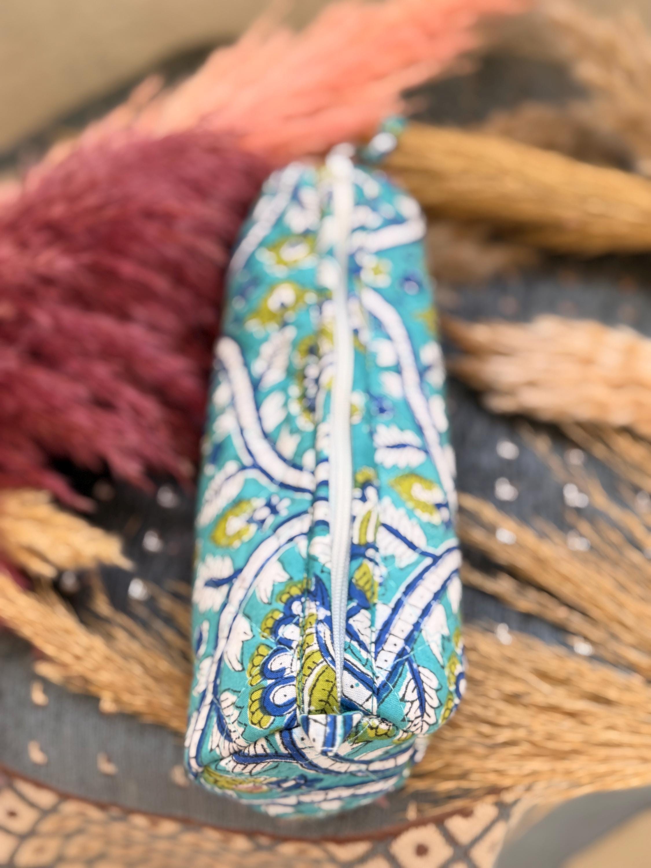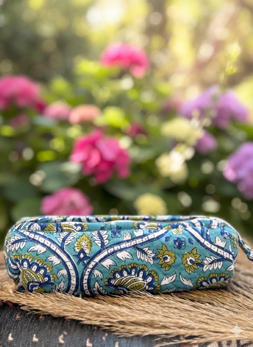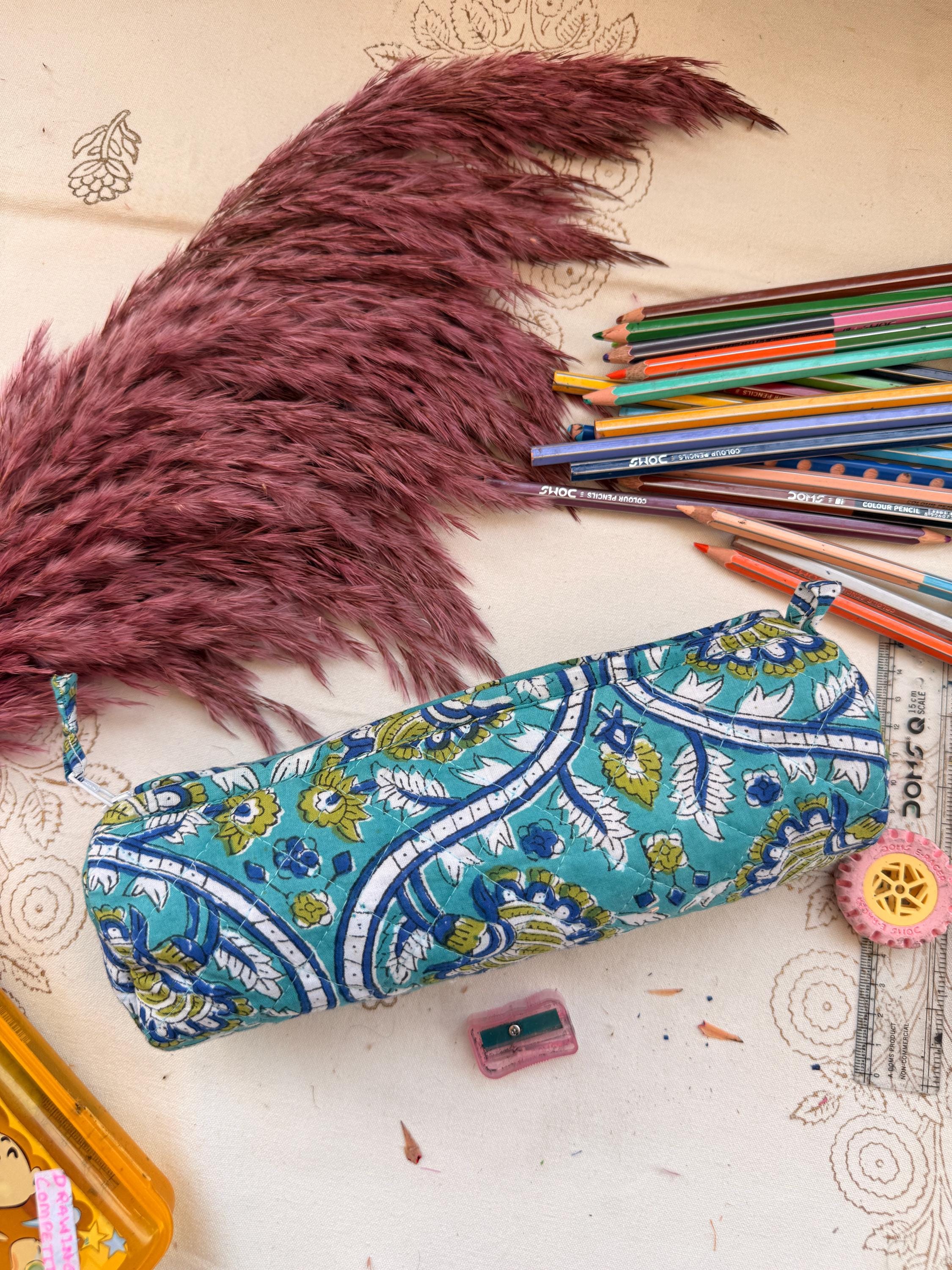 This beautiful block-printed pencil pouch is handcrafted using traditional techniques and soft, durable cotton fabric. Featuring an elegant floral pattern in calming blue and green tones, it’s perfect for organizing your stationery, makeup, or small travel essentials.