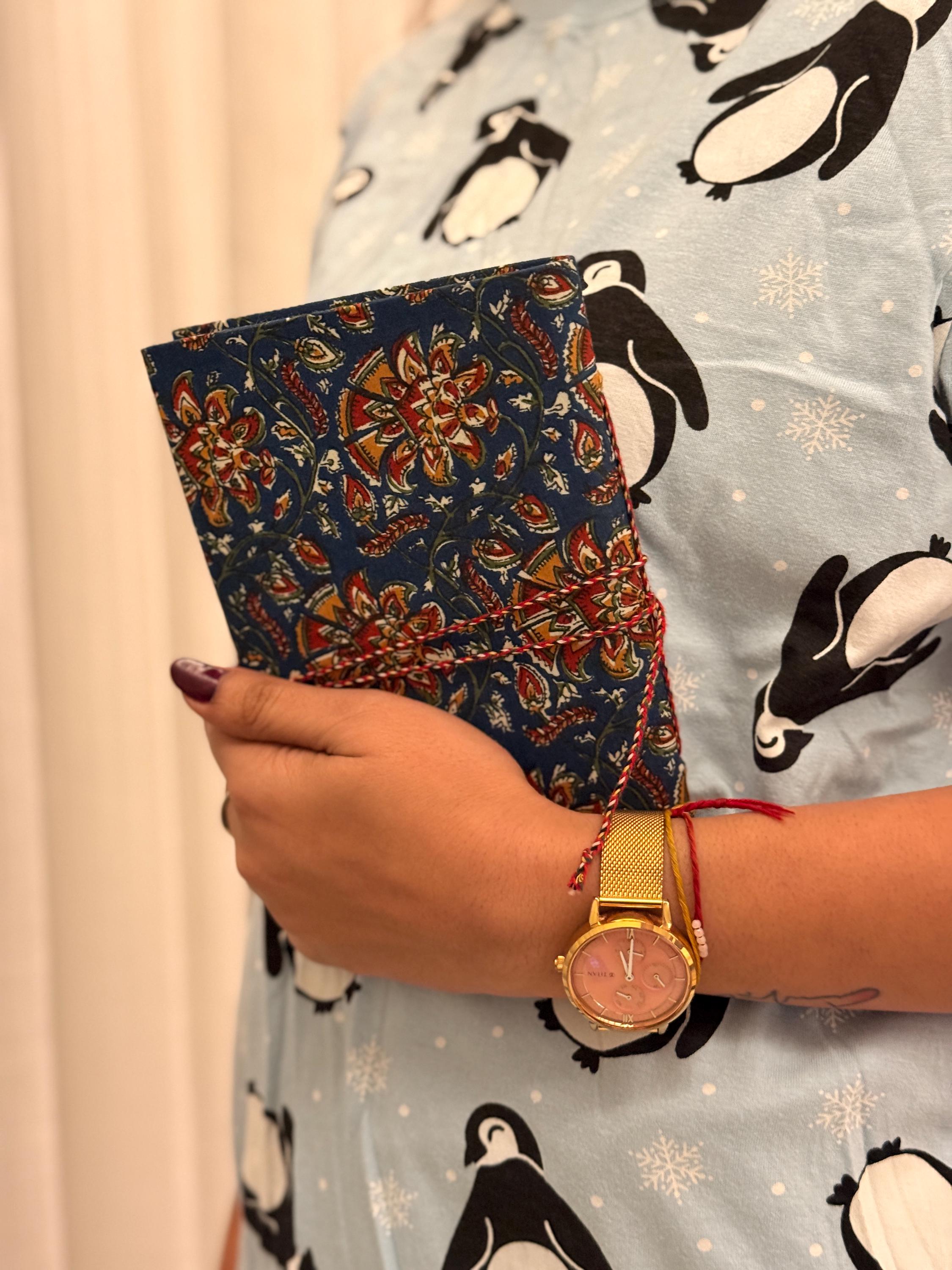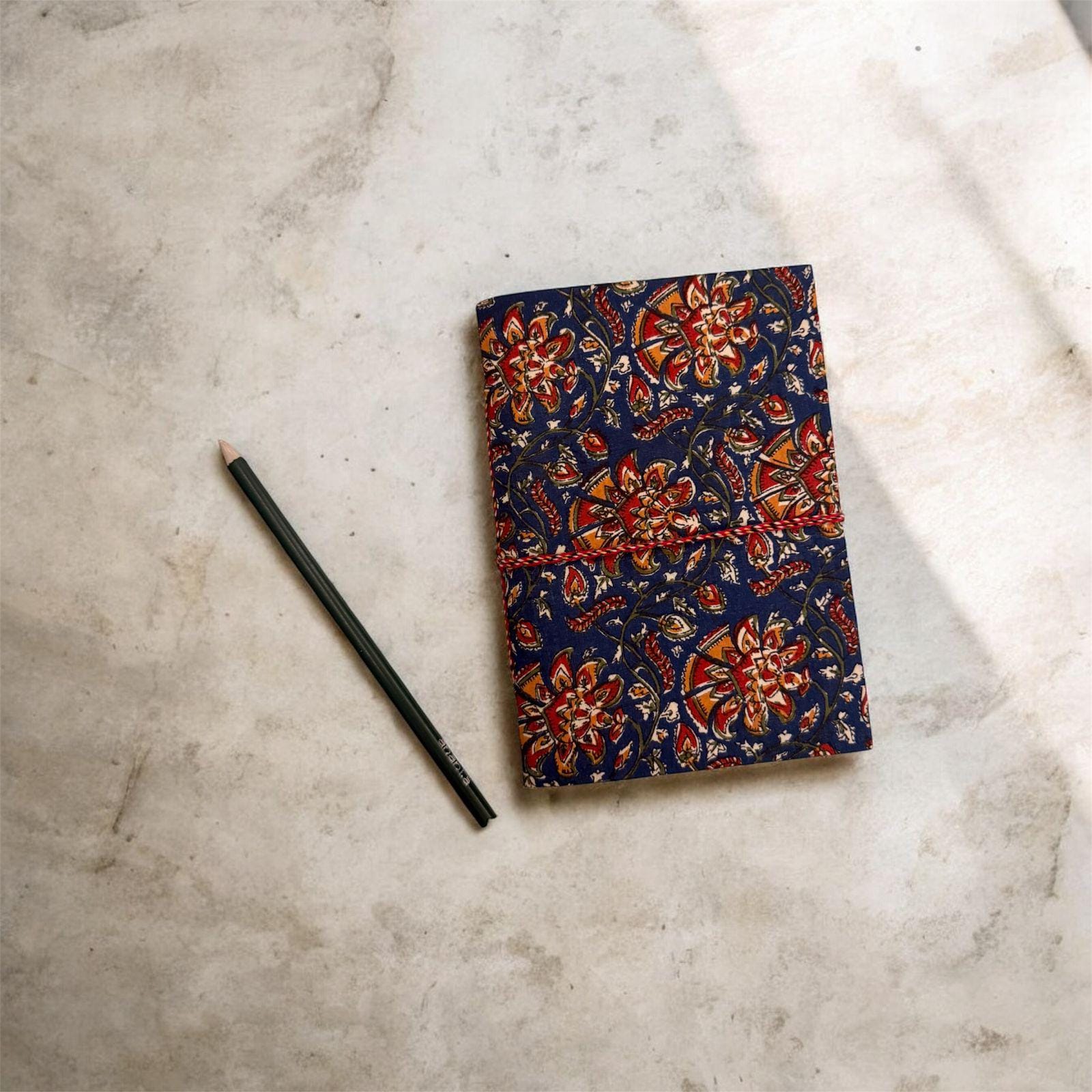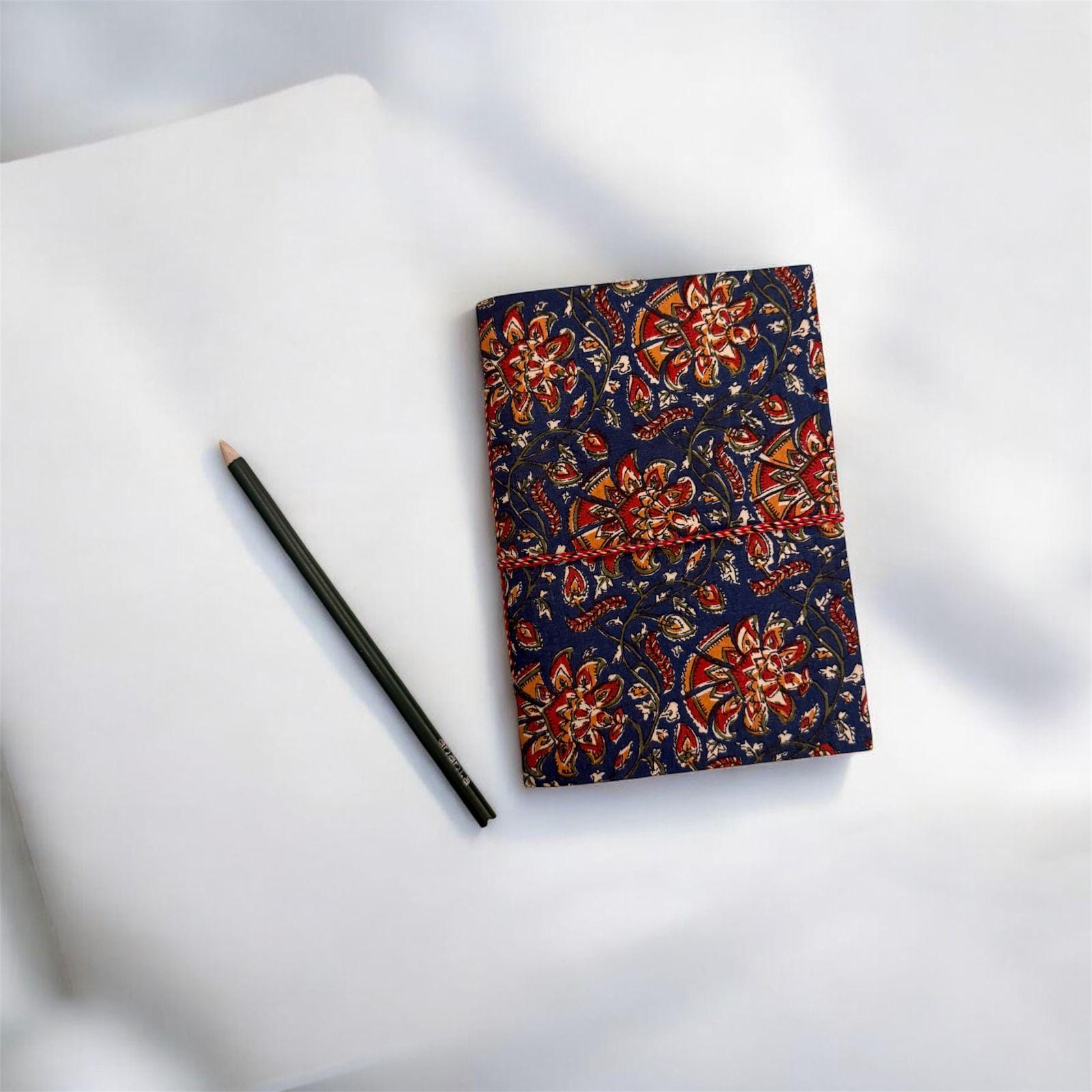 Crafted using traditional block printing techniques, this journal features a rich deep blue cotton cover adorned with intricate floral motifs in warm earthy tones. Each piece is unique, celebrating the charm of handcrafted artistry.