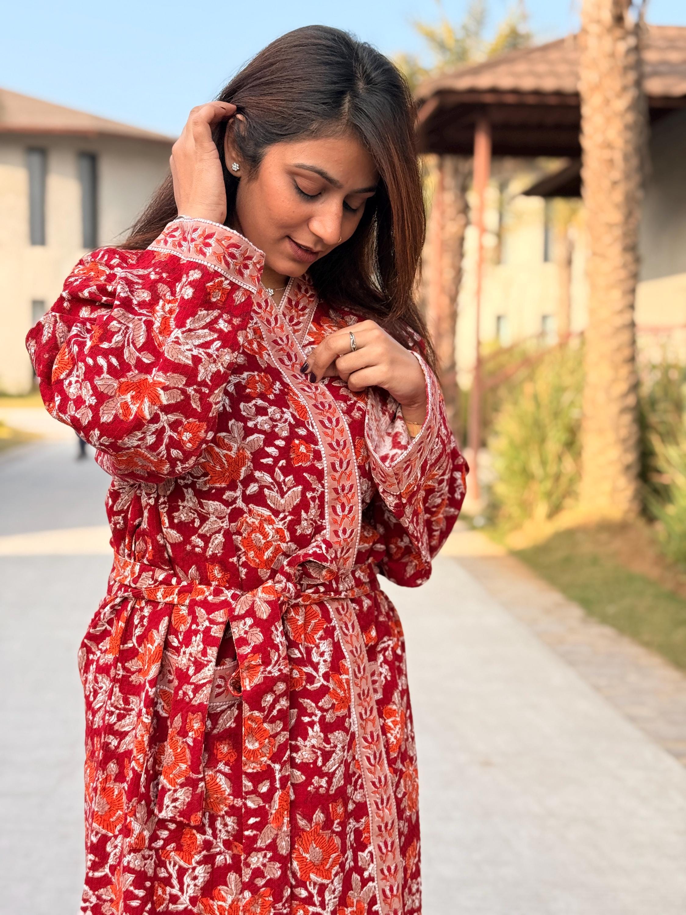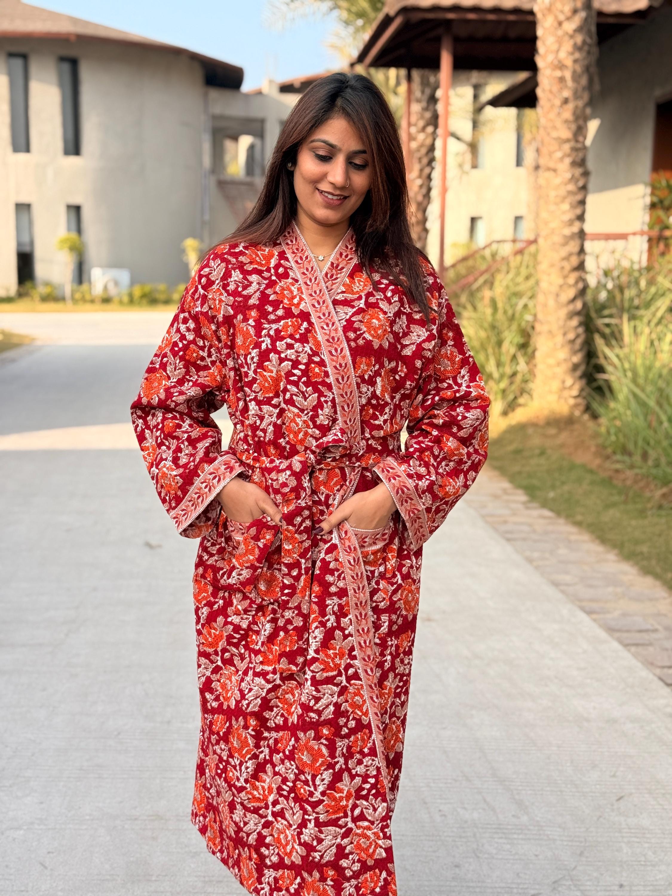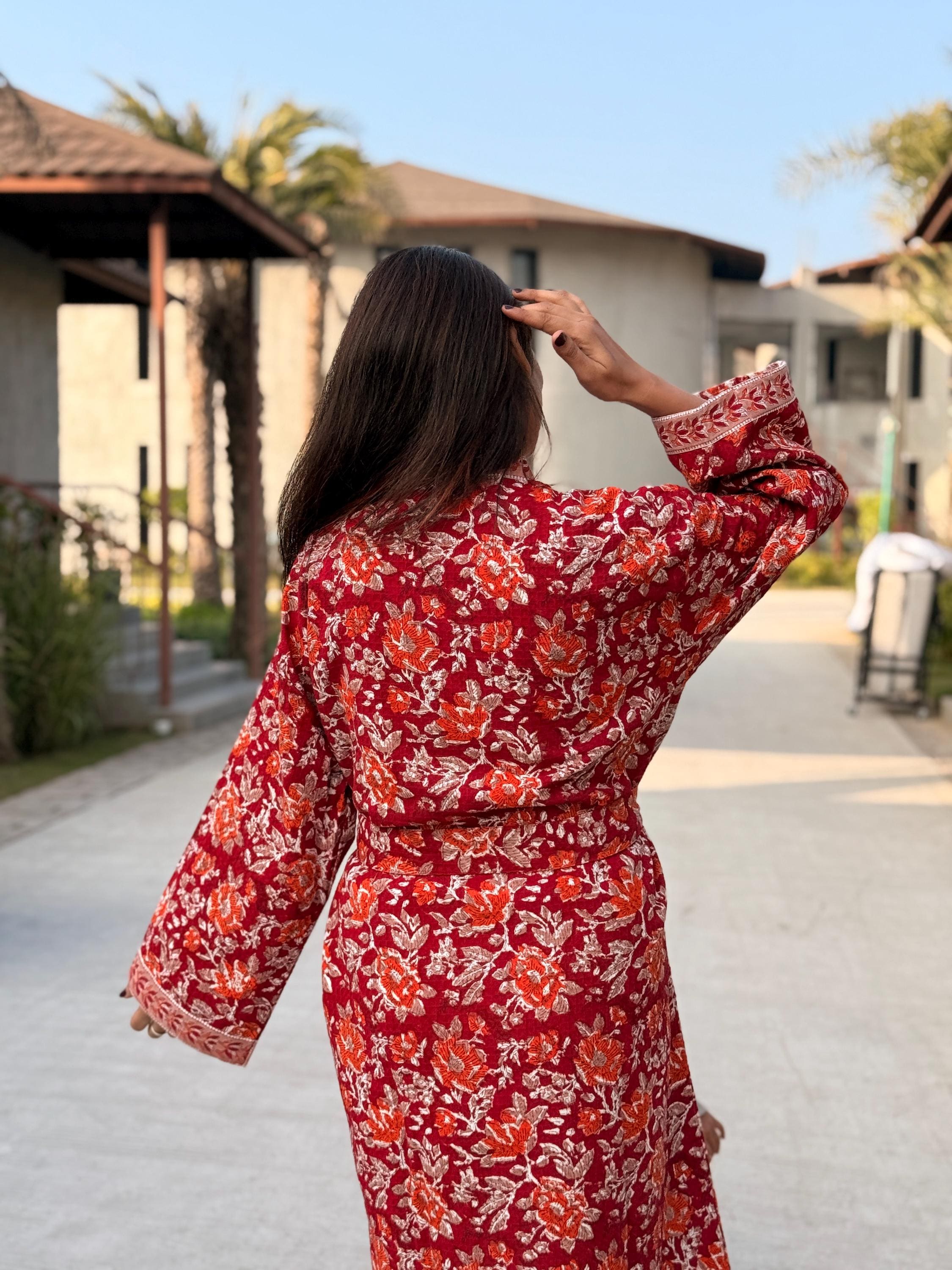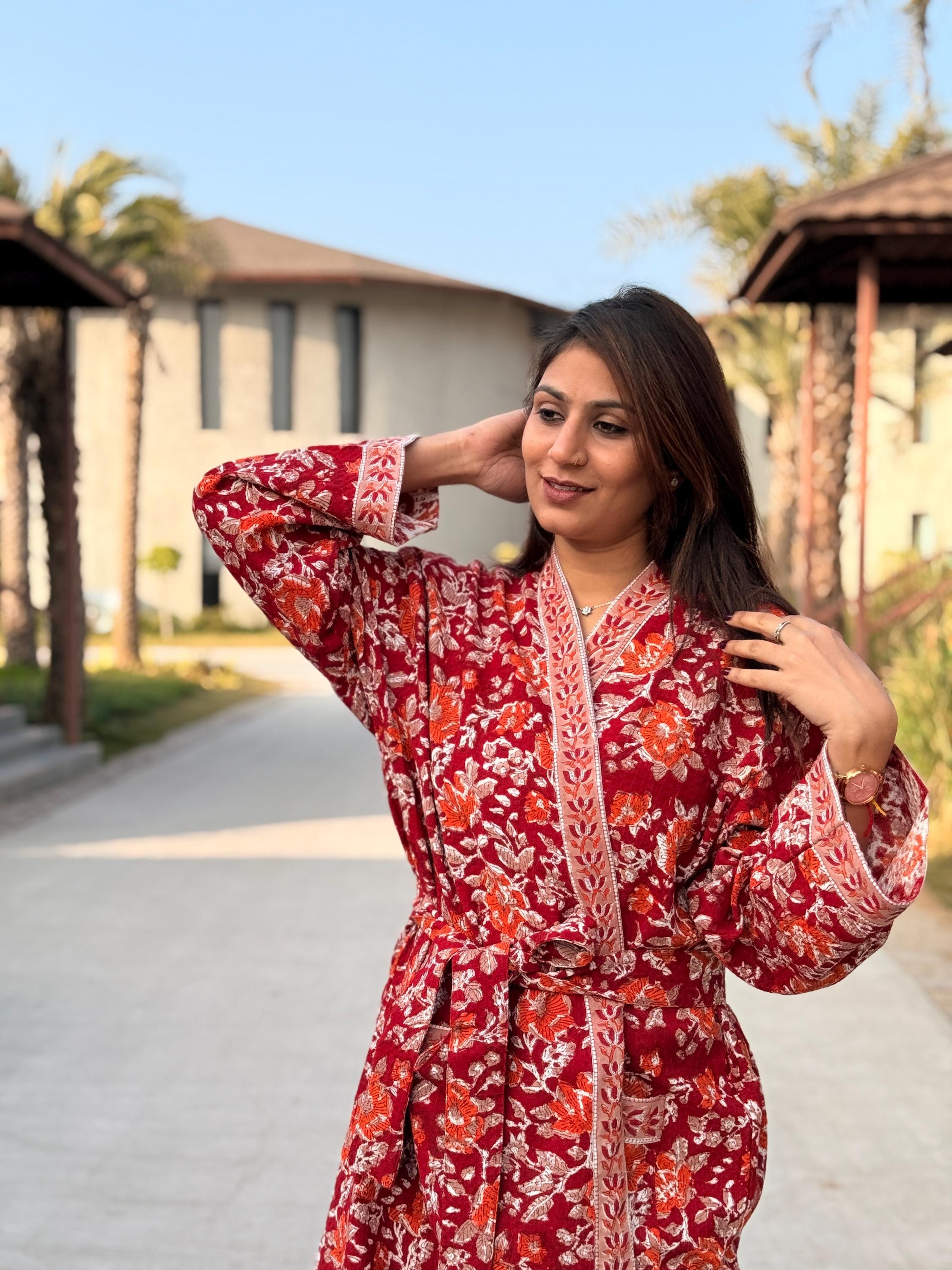 Indulge in everyday luxury with this hand block print cotton waffle bathrobe, thoughtfully handcrafted using traditional artisan techniques. Designed for comfort, breathability, and timeless style, this robe features a soothing Red base adorned with delicate floral block prints in warm orange tones.