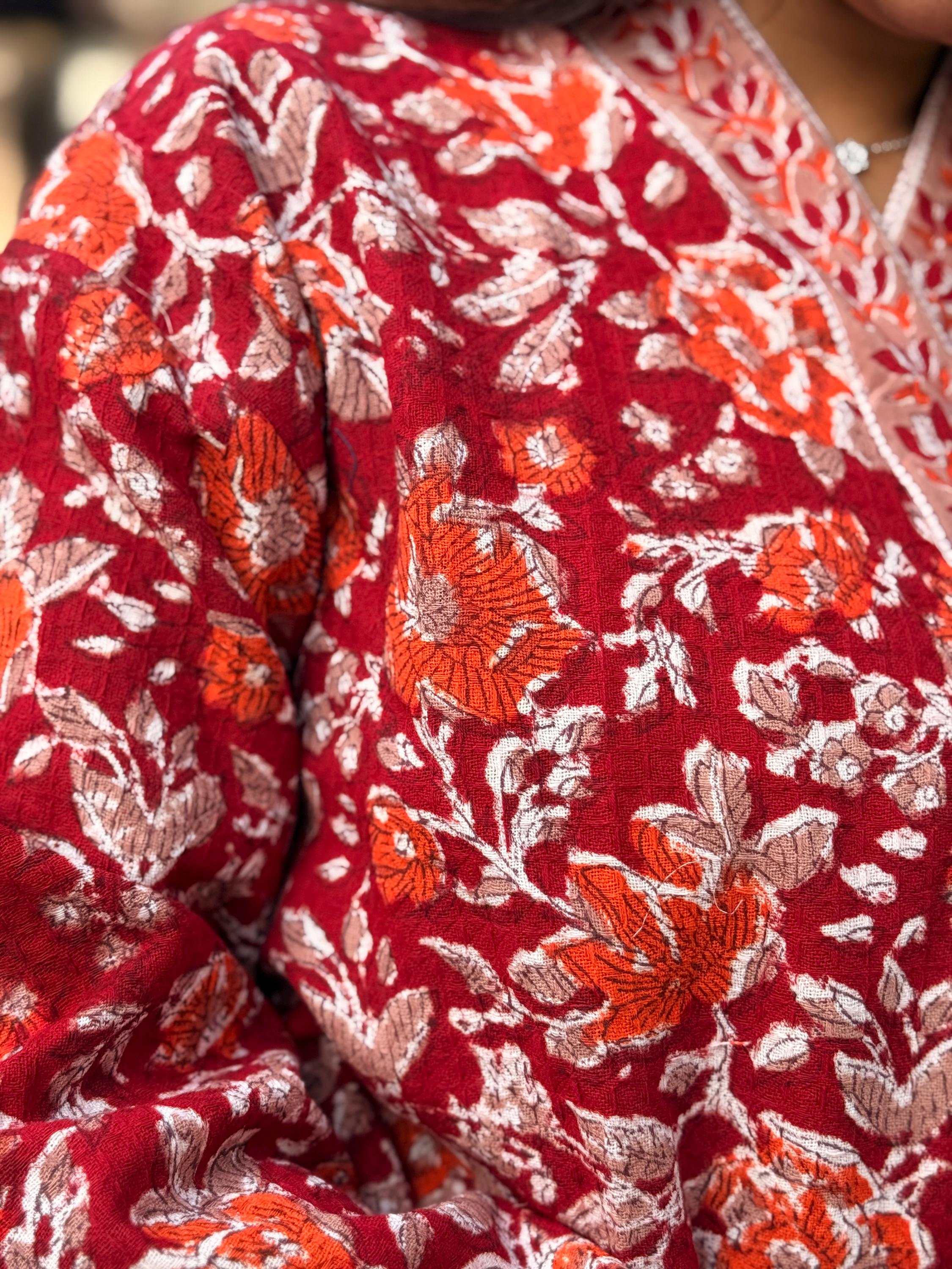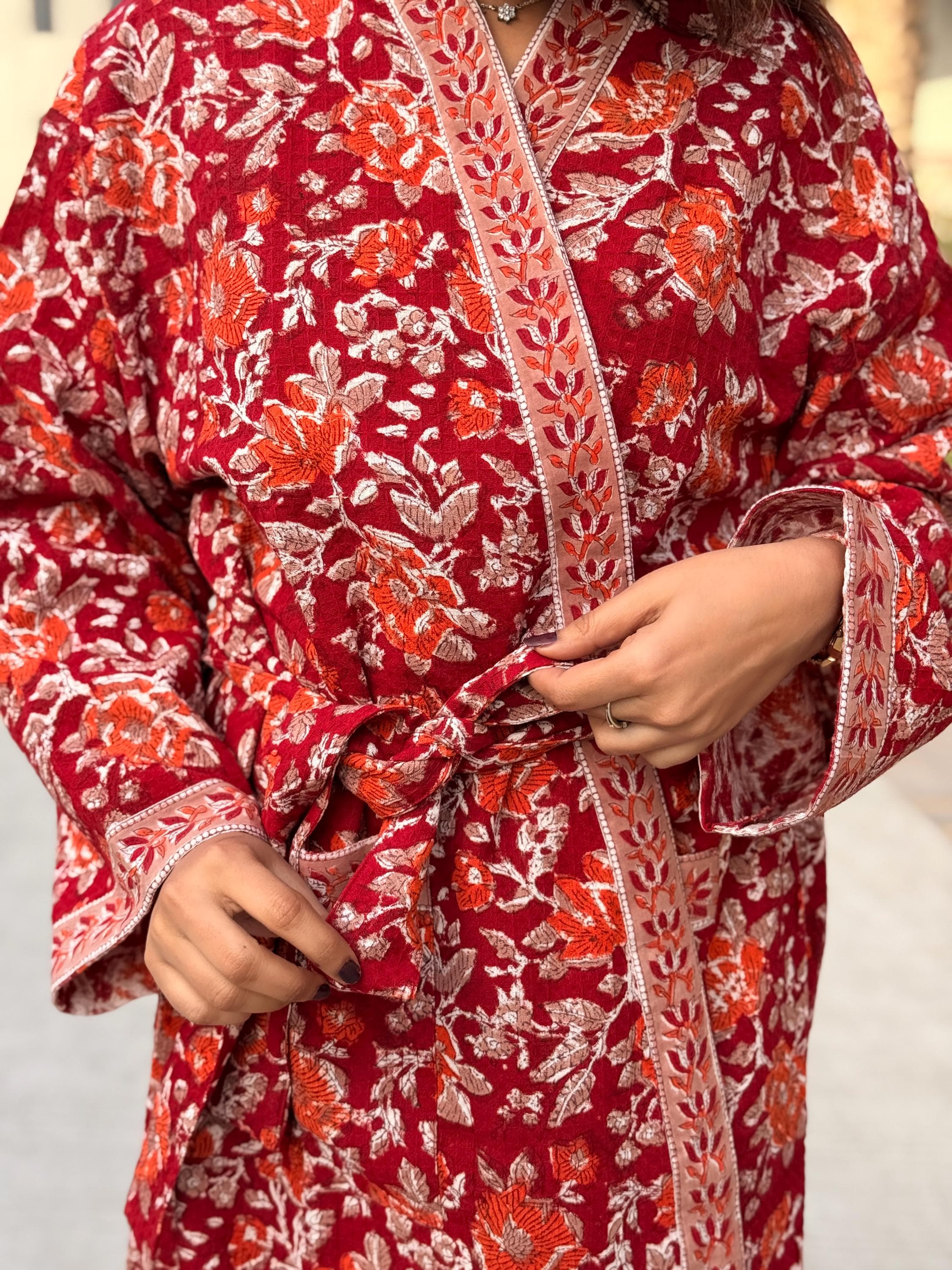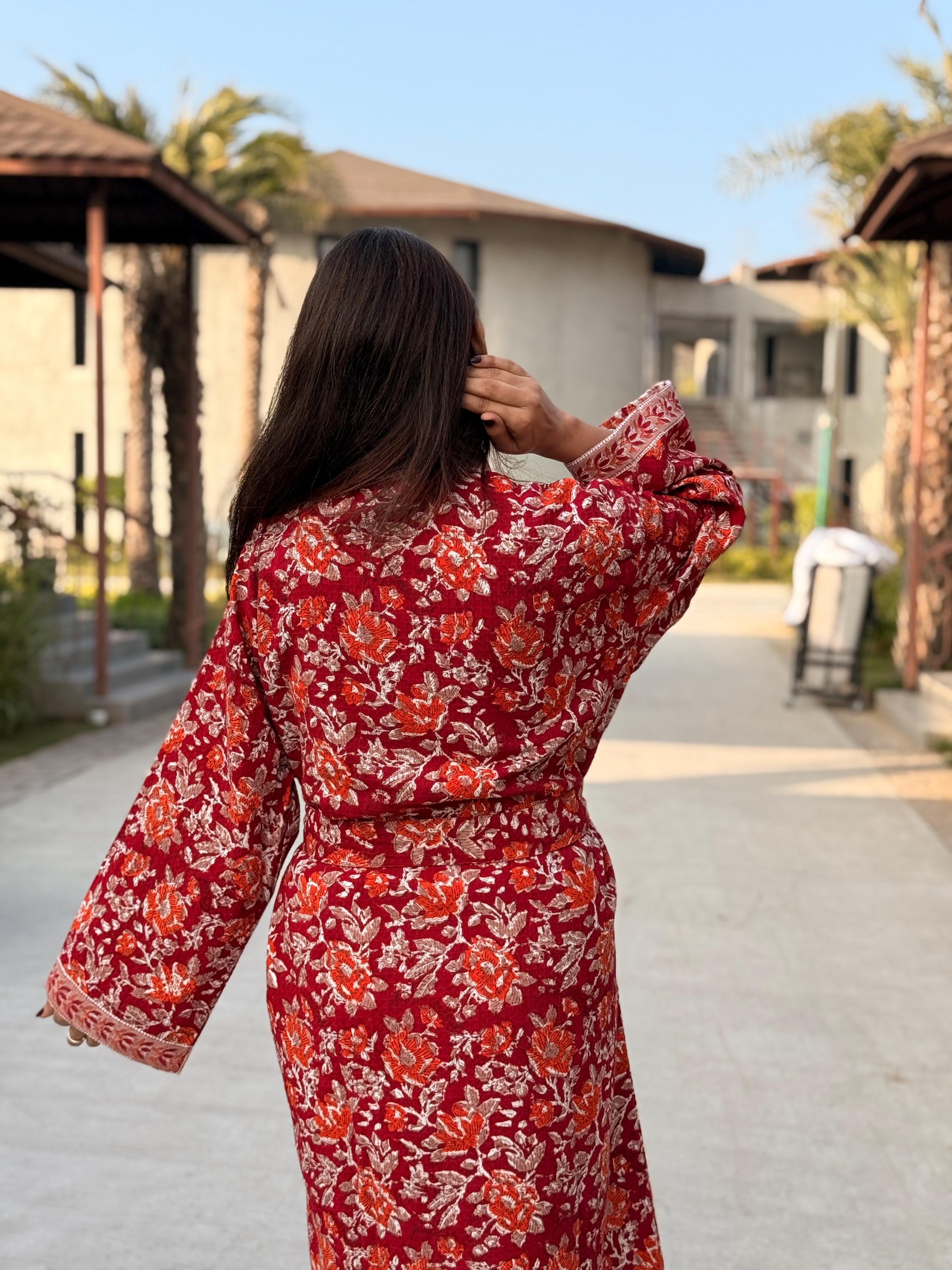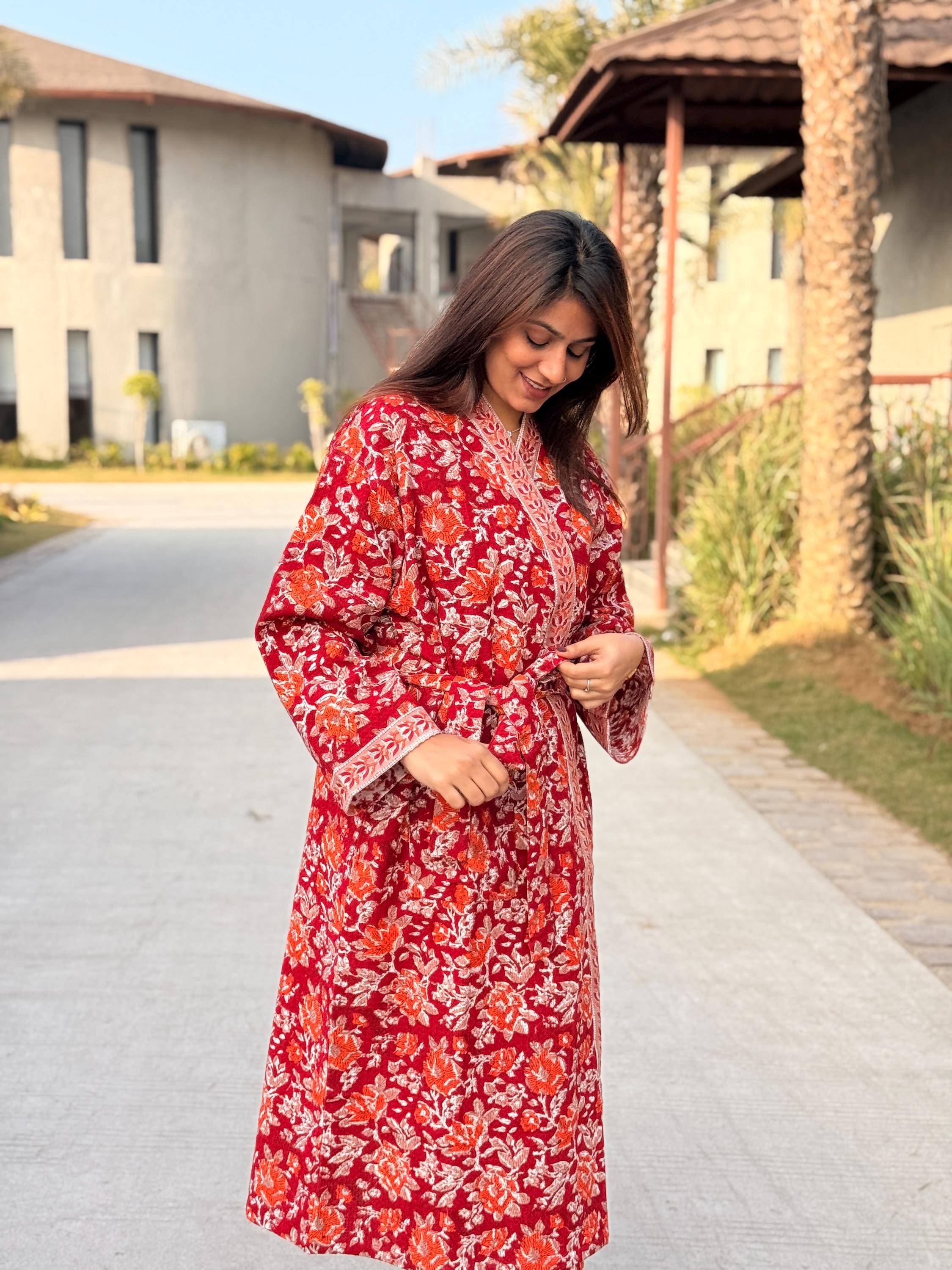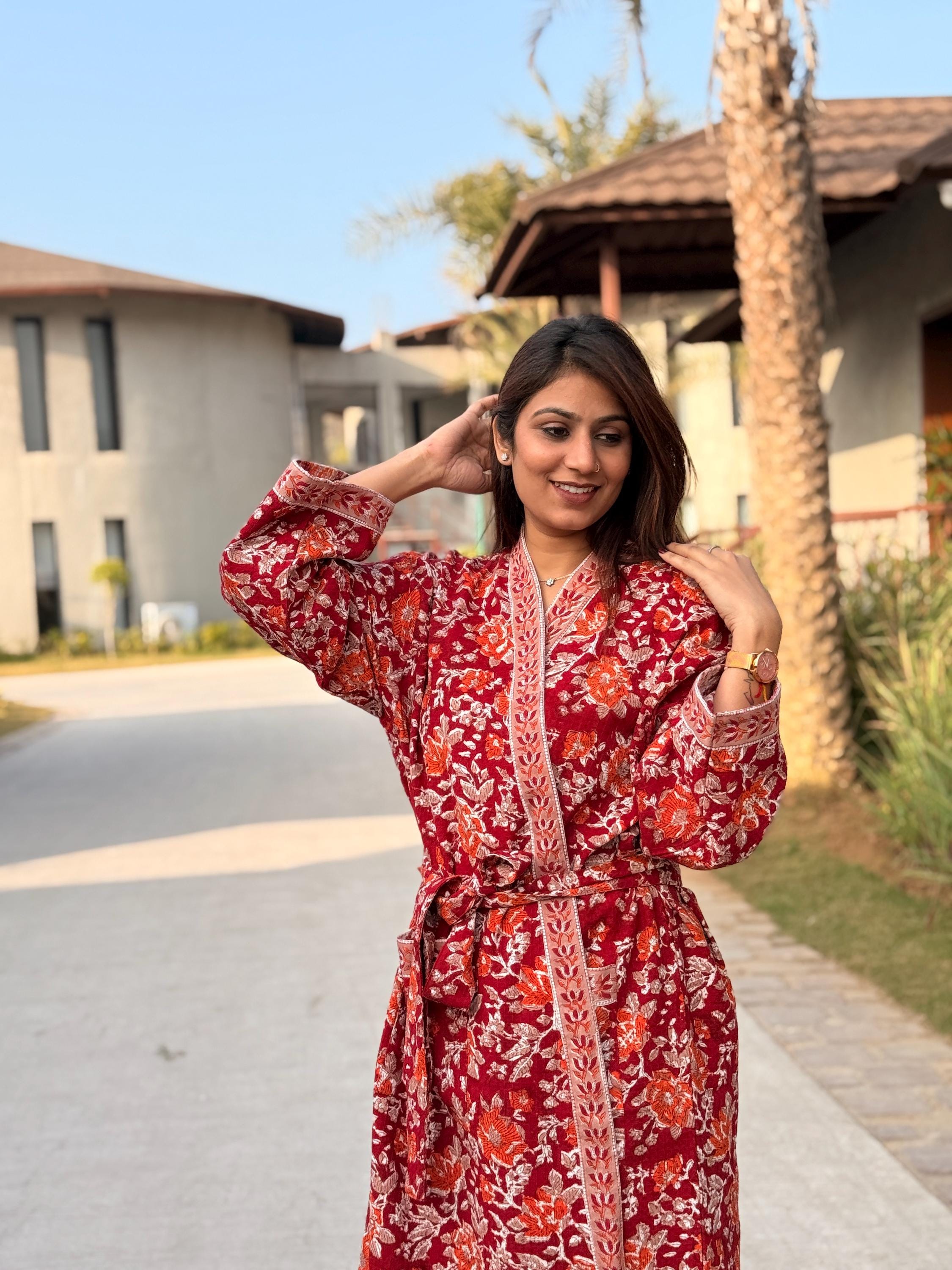 Indulge in everyday luxury with this hand block print cotton waffle bathrobe, thoughtfully handcrafted using traditional artisan techniques. Designed for comfort, breathability, and timeless style, this robe features a soothing Red base adorned with delicate floral block prints in warm orange tones.