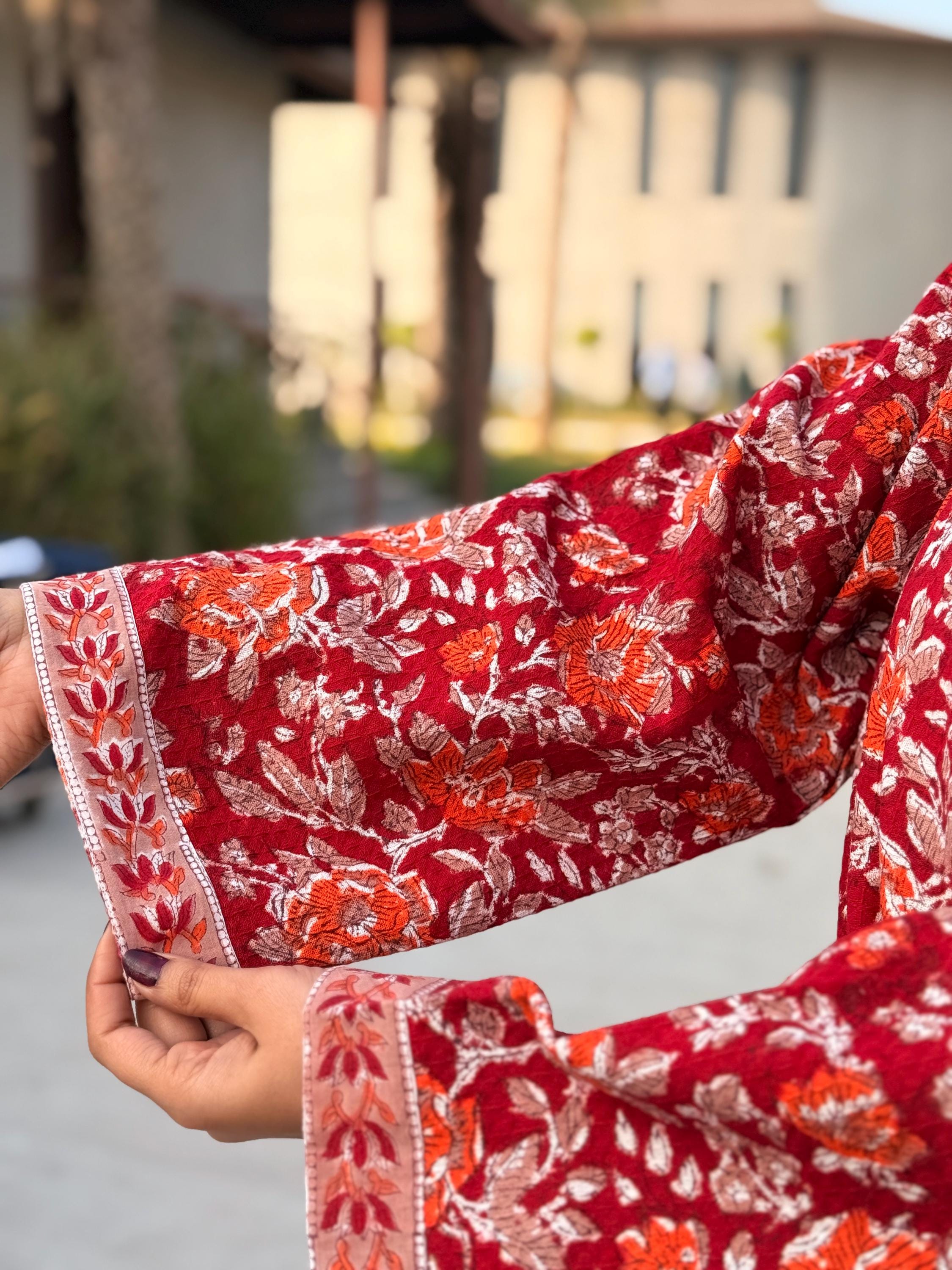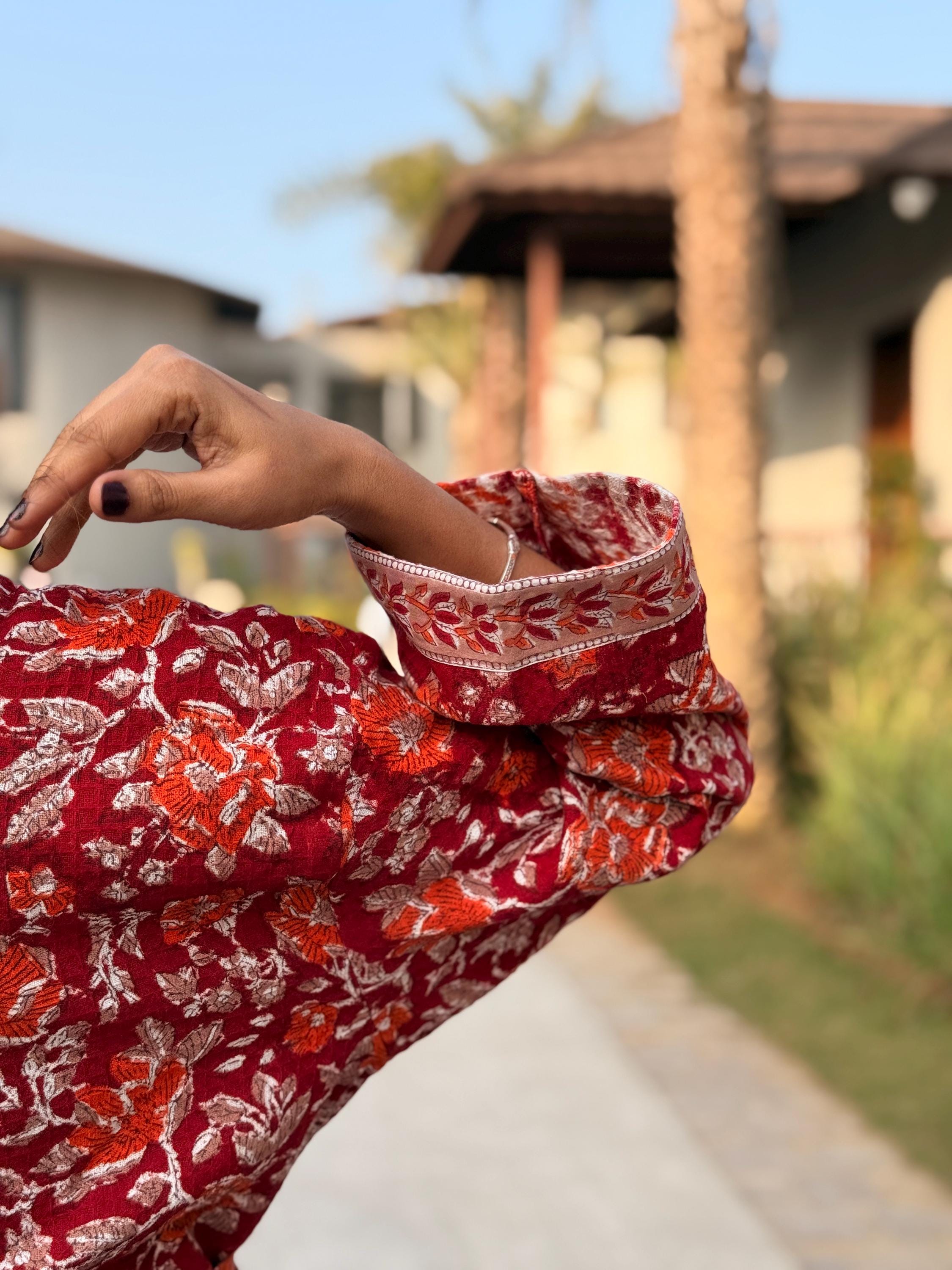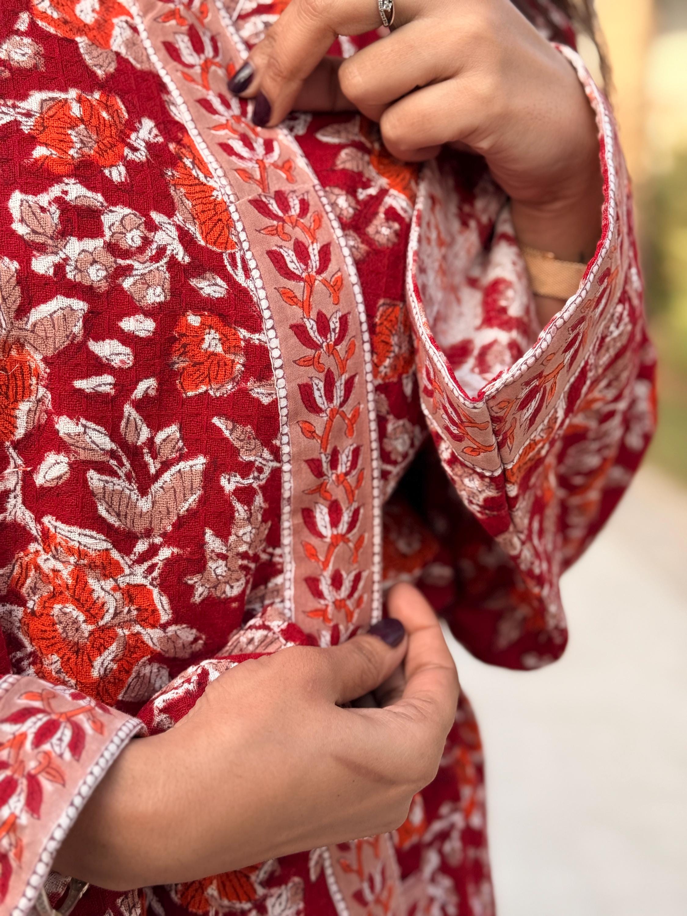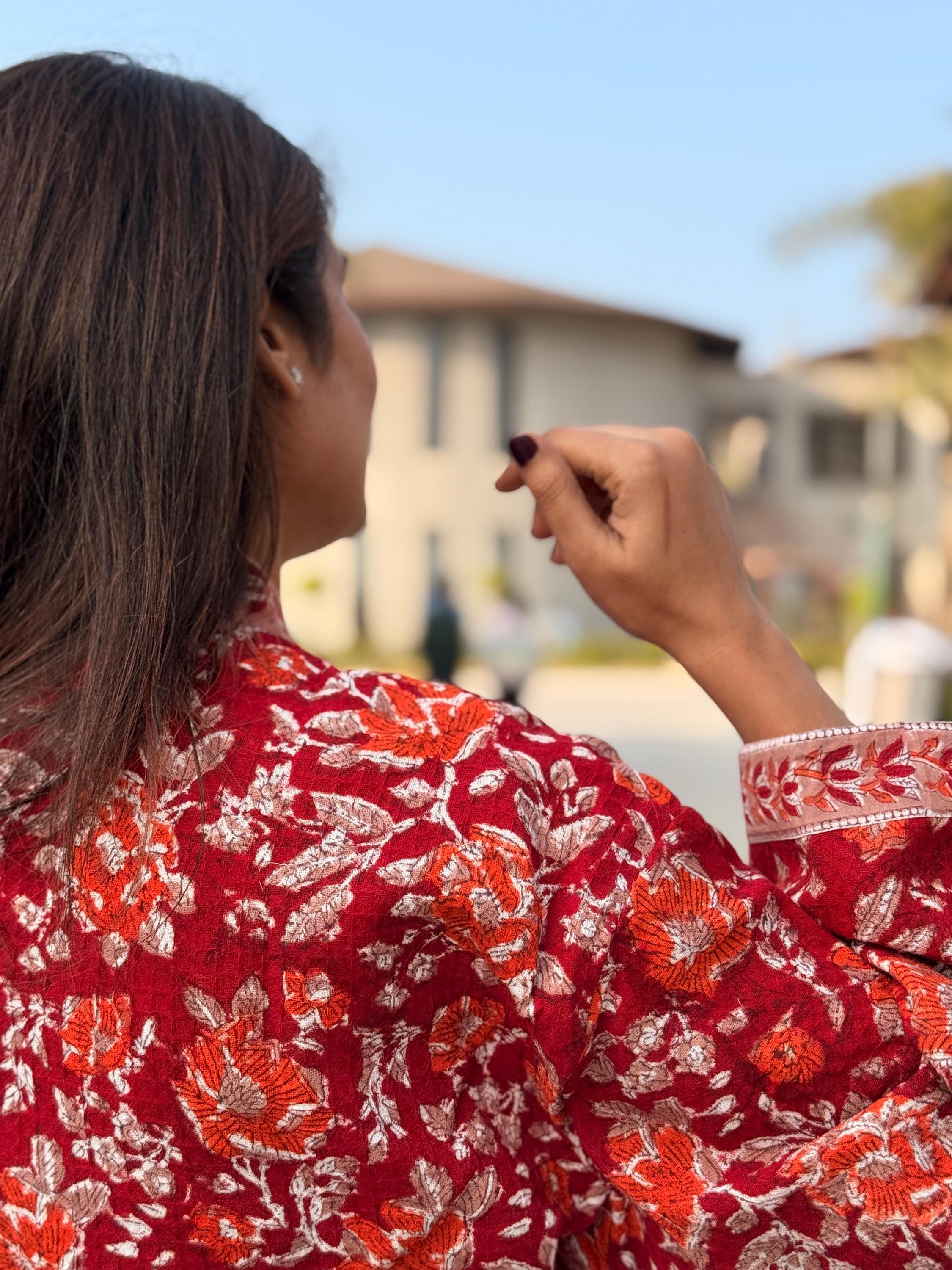 Indulge in everyday luxury with this hand block print cotton waffle bathrobe, thoughtfully handcrafted using traditional artisan techniques. Designed for comfort, breathability, and timeless style, this robe features a soothing Red base adorned with delicate floral block prints in warm orange tones.