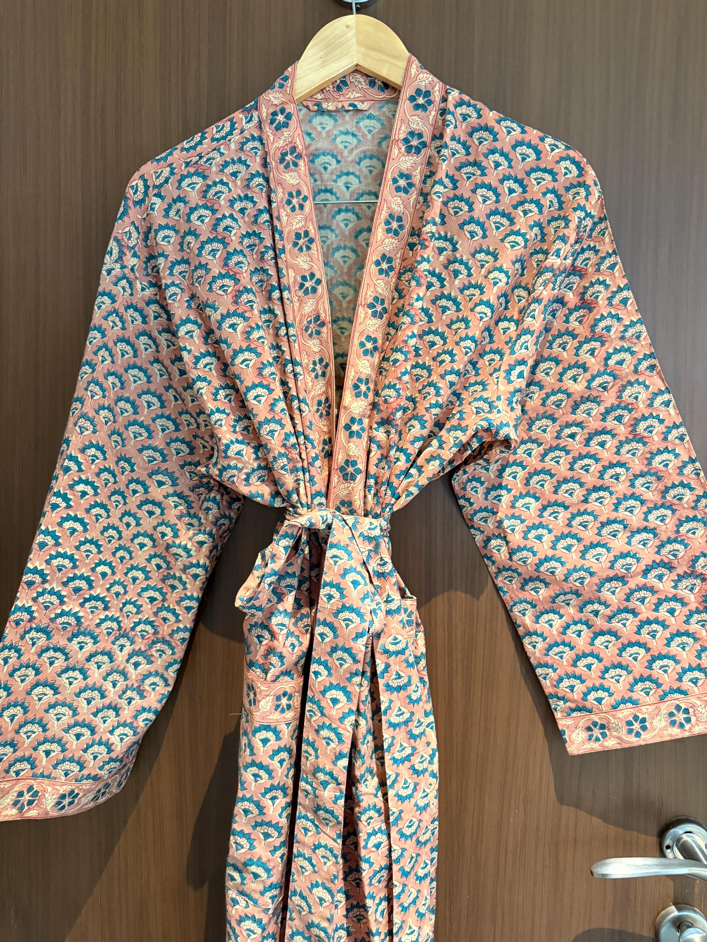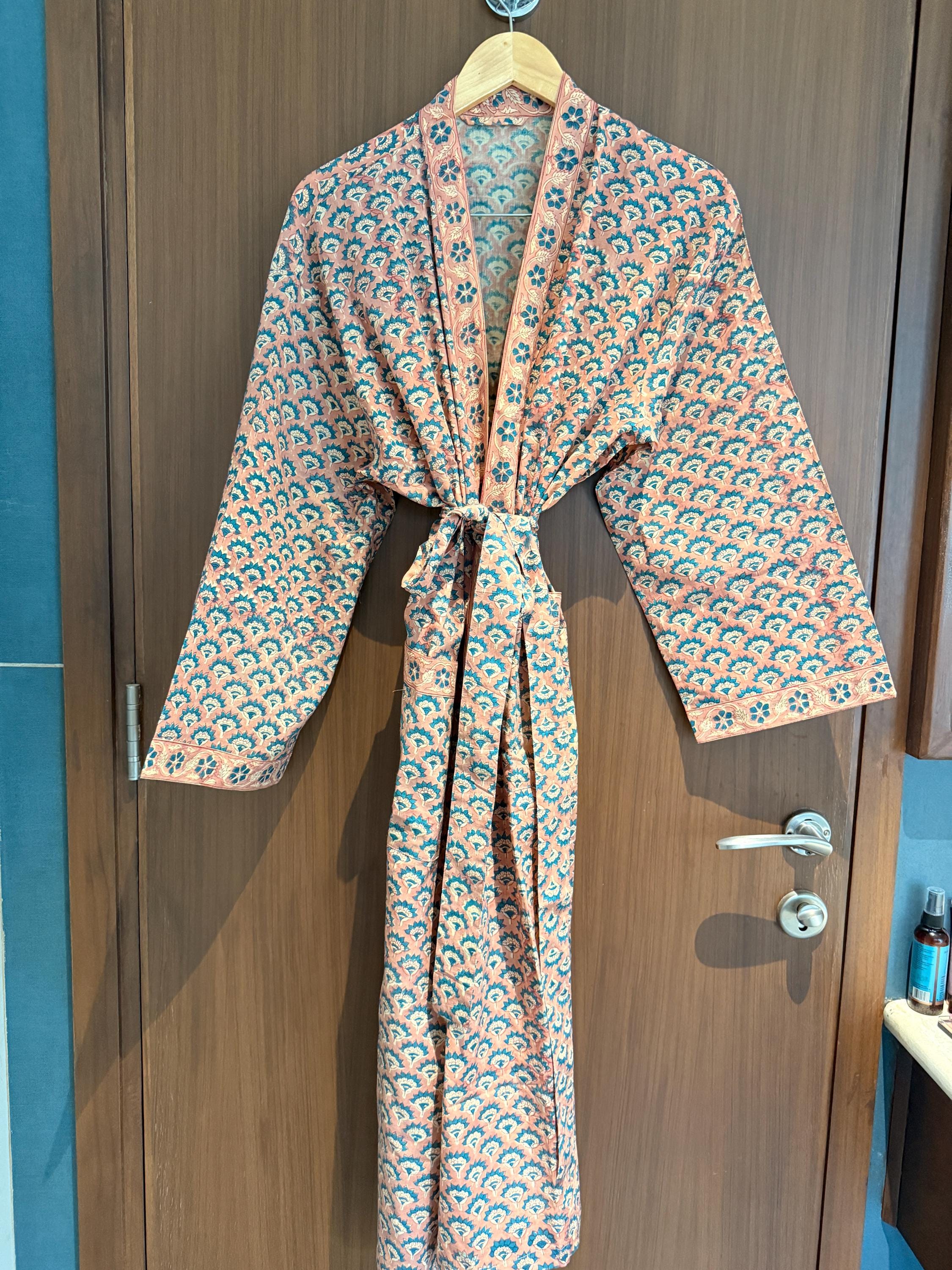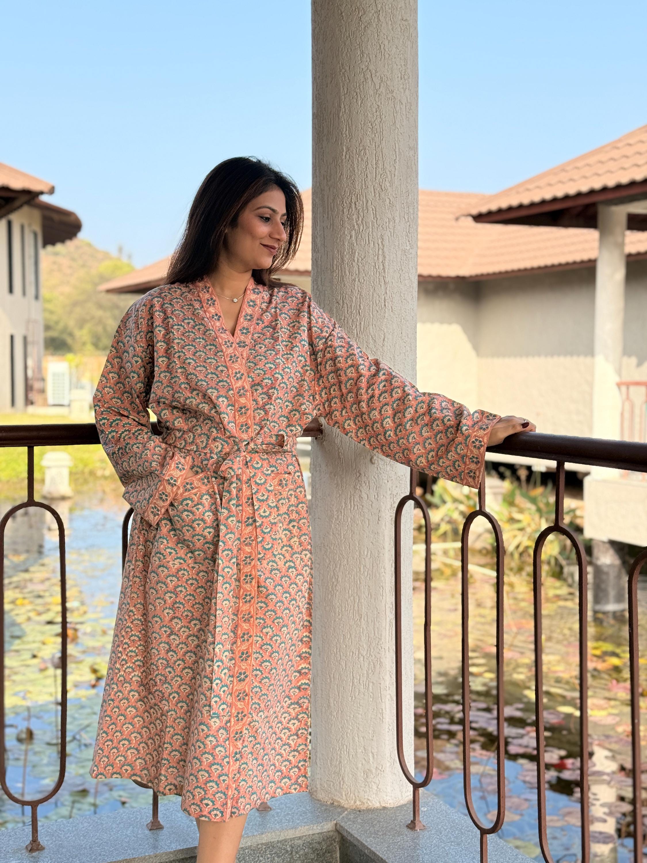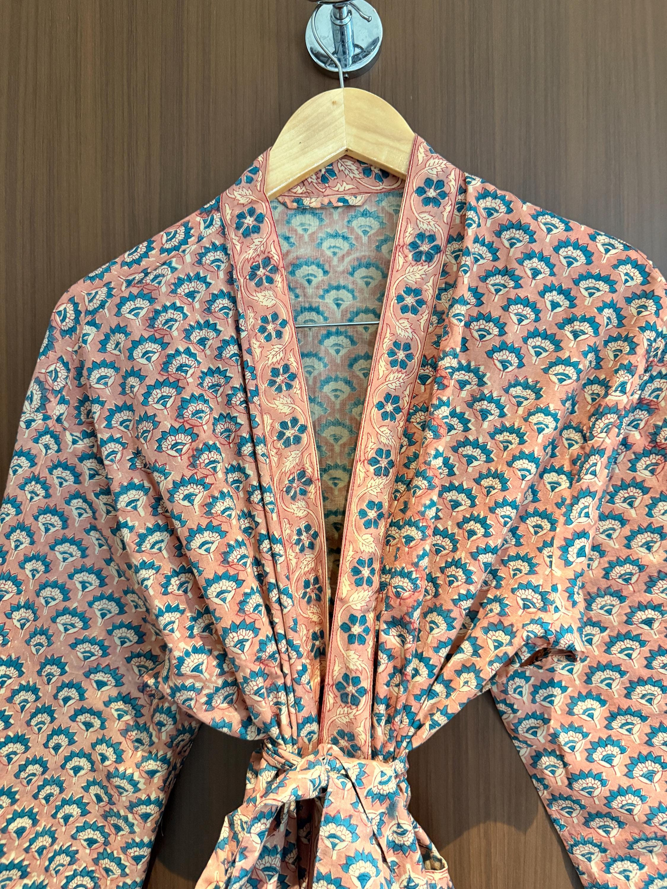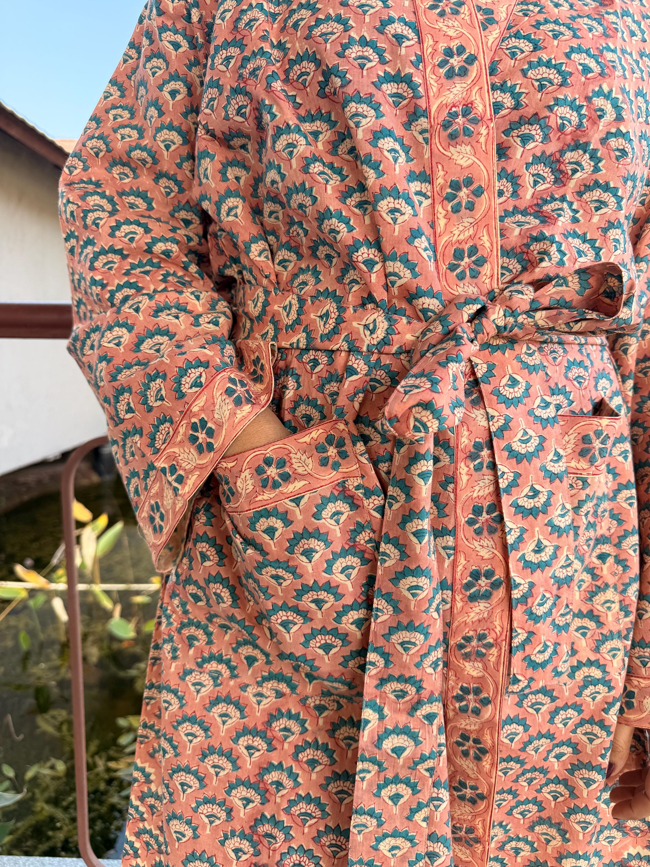 Experience relaxed elegance with our Hand Block Printed Cotton Bathrobe , thoughtfully handcrafted using traditional Indian block printing techniques. This Cotton Kimono features a soothing peach base with delicate teal and ivory floral motifs, creating a soft, earthy palette that feels both timeless and calming.