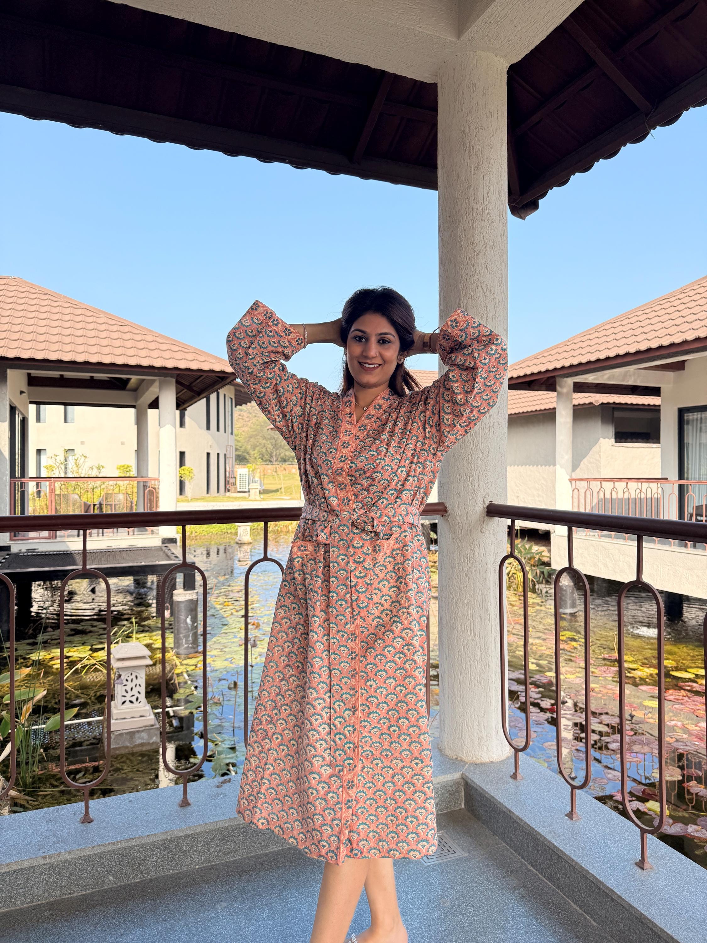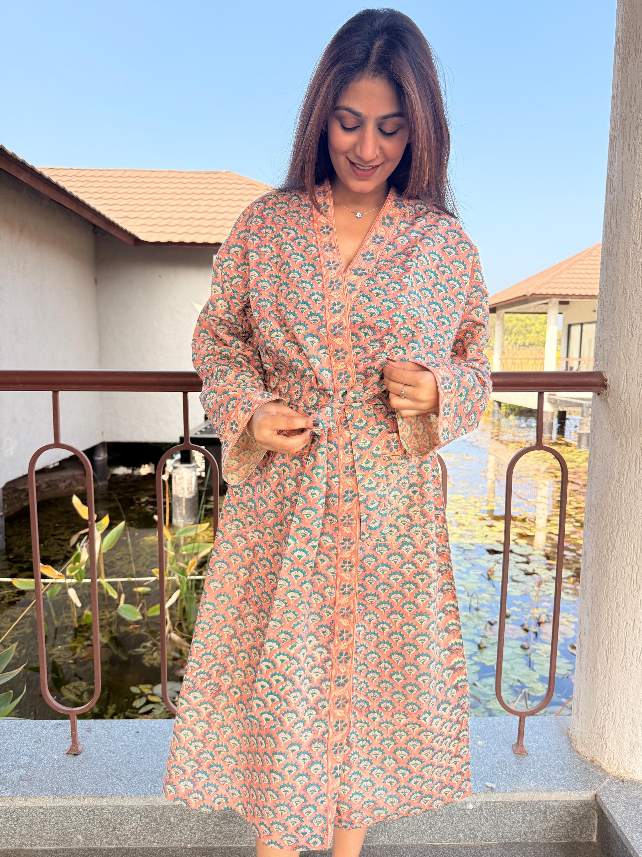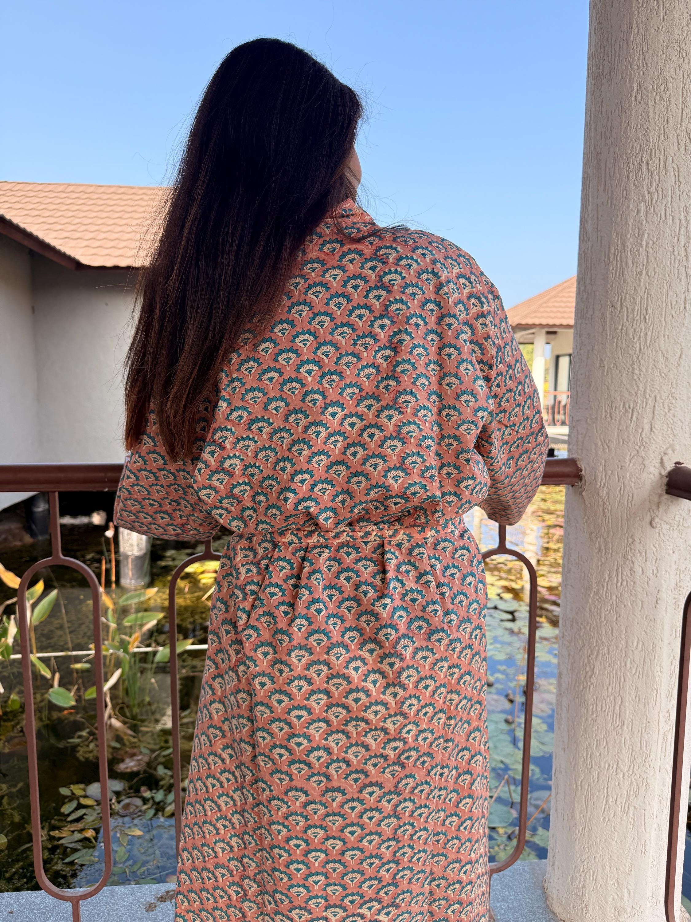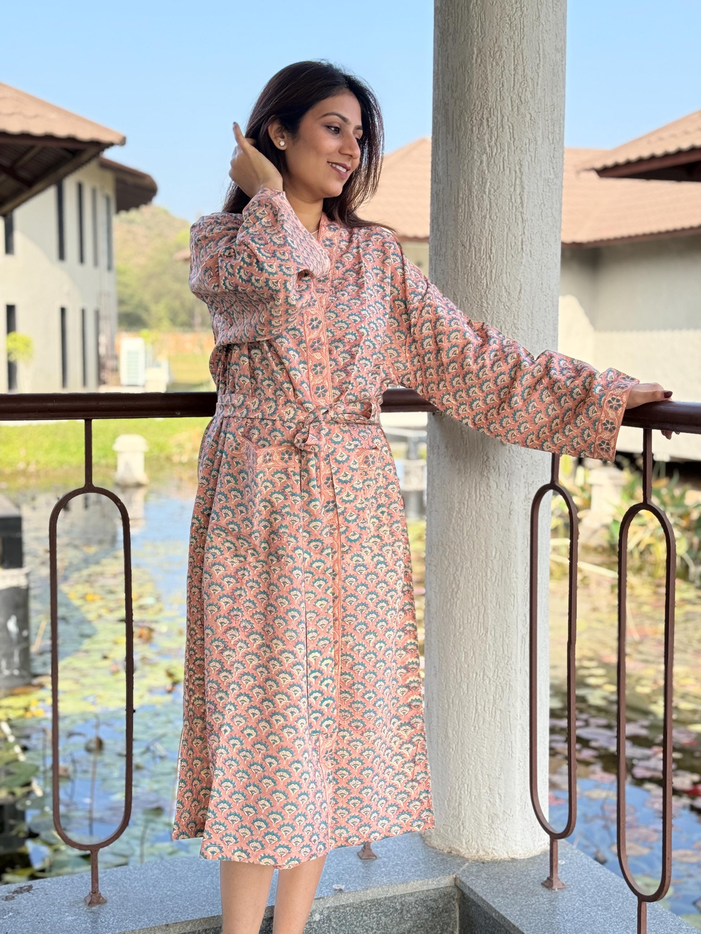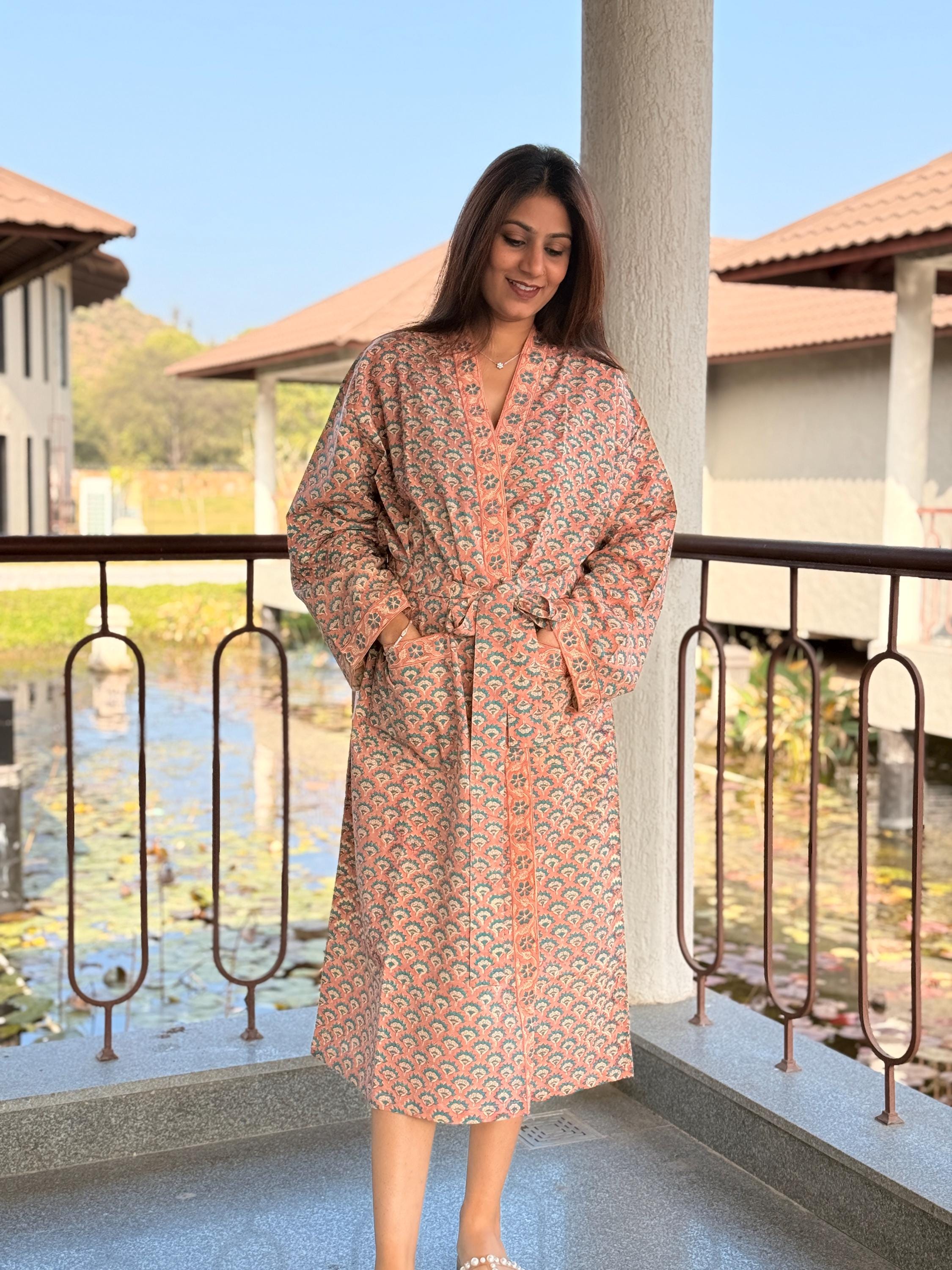 Experience relaxed elegance with our Hand Block Printed Cotton Bathrobe , thoughtfully handcrafted using traditional Indian block printing techniques. This Cotton Kimono features a soothing peach base with delicate teal and ivory floral motifs, creating a soft, earthy palette that feels both timeless and calming.