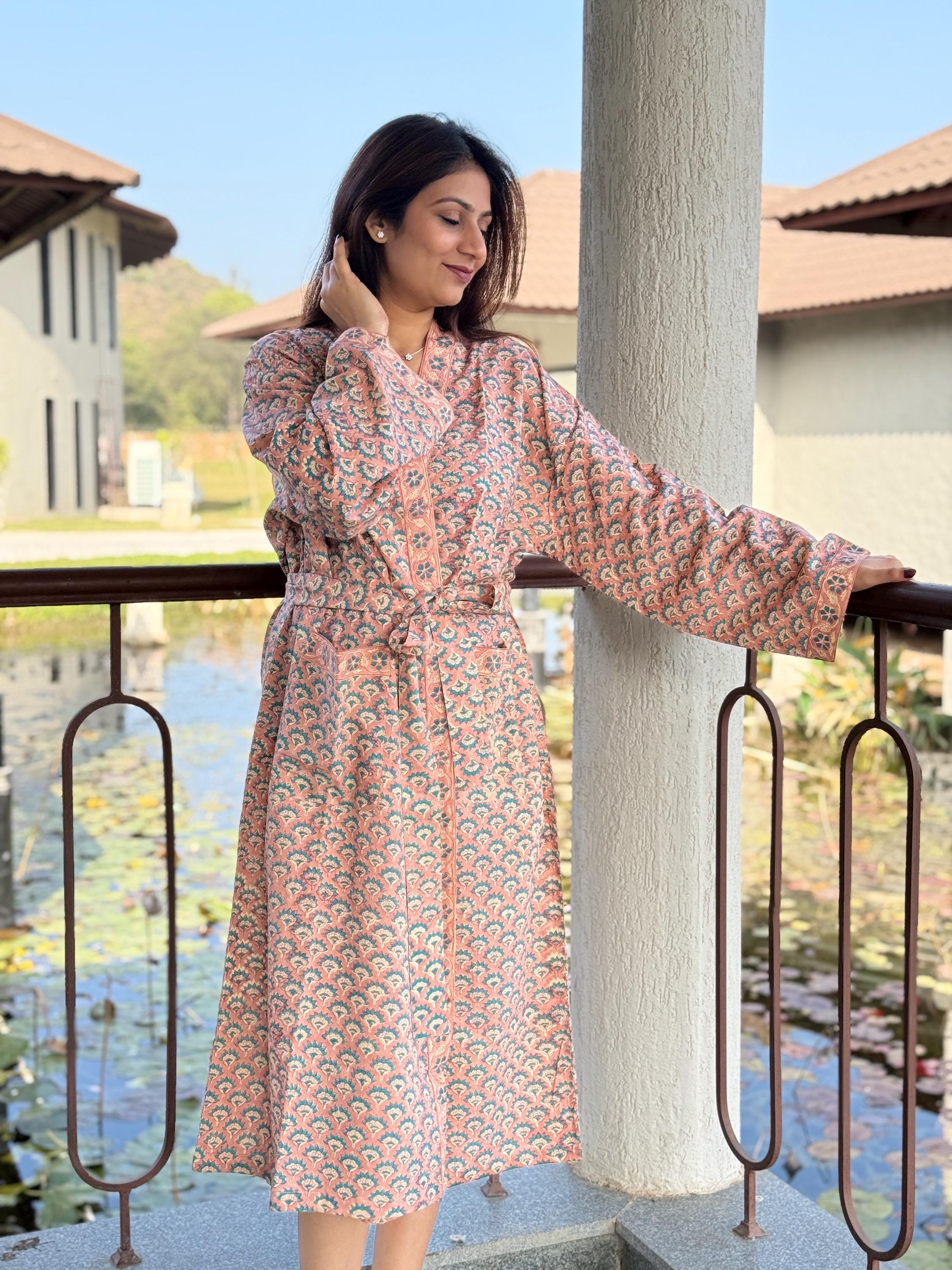 Hand Block Print Cotton Bathrobe, Natural Dye Kimono Robe, Lightweight Spa Robe, Handmade Gift for Her or Him