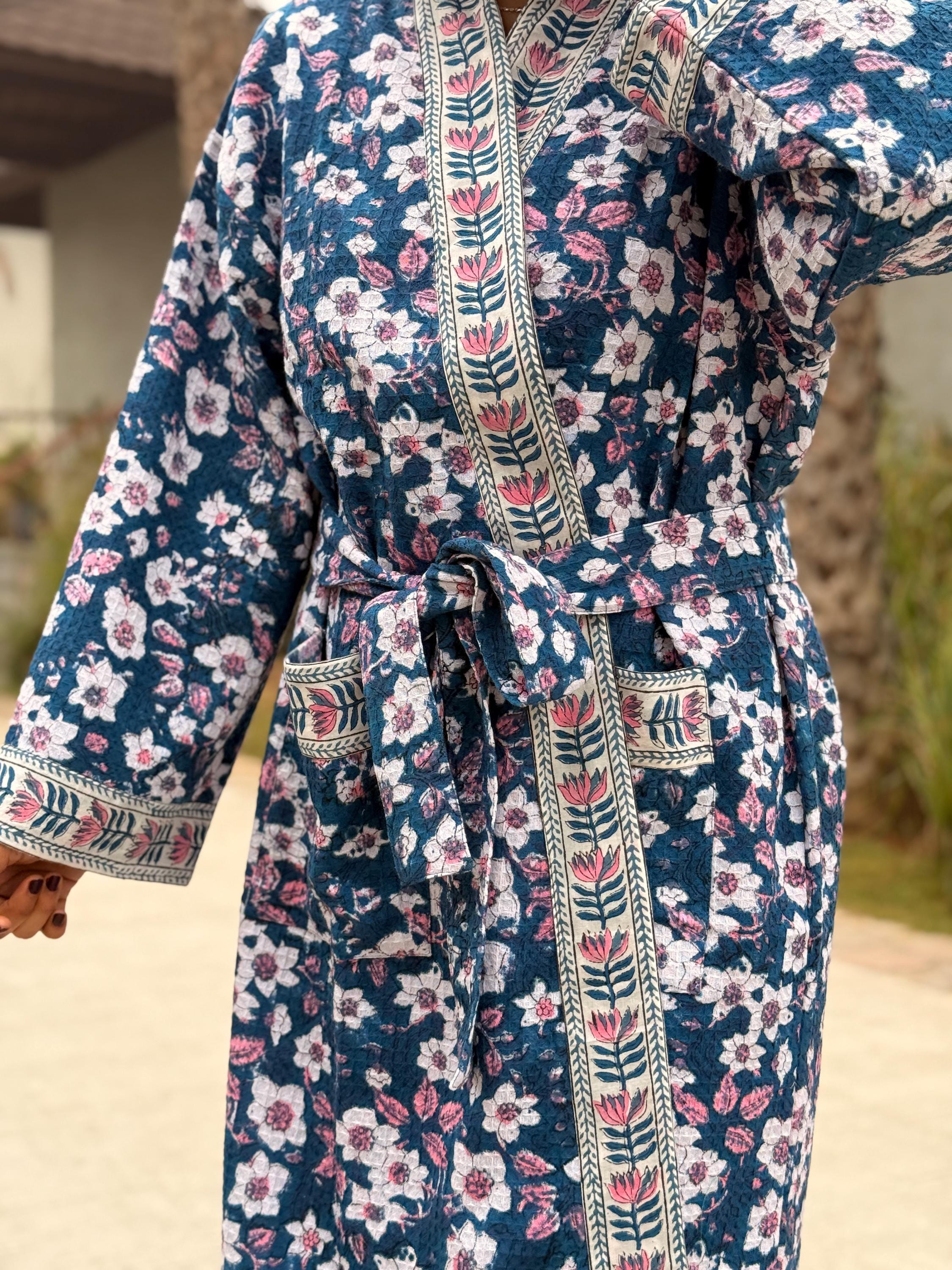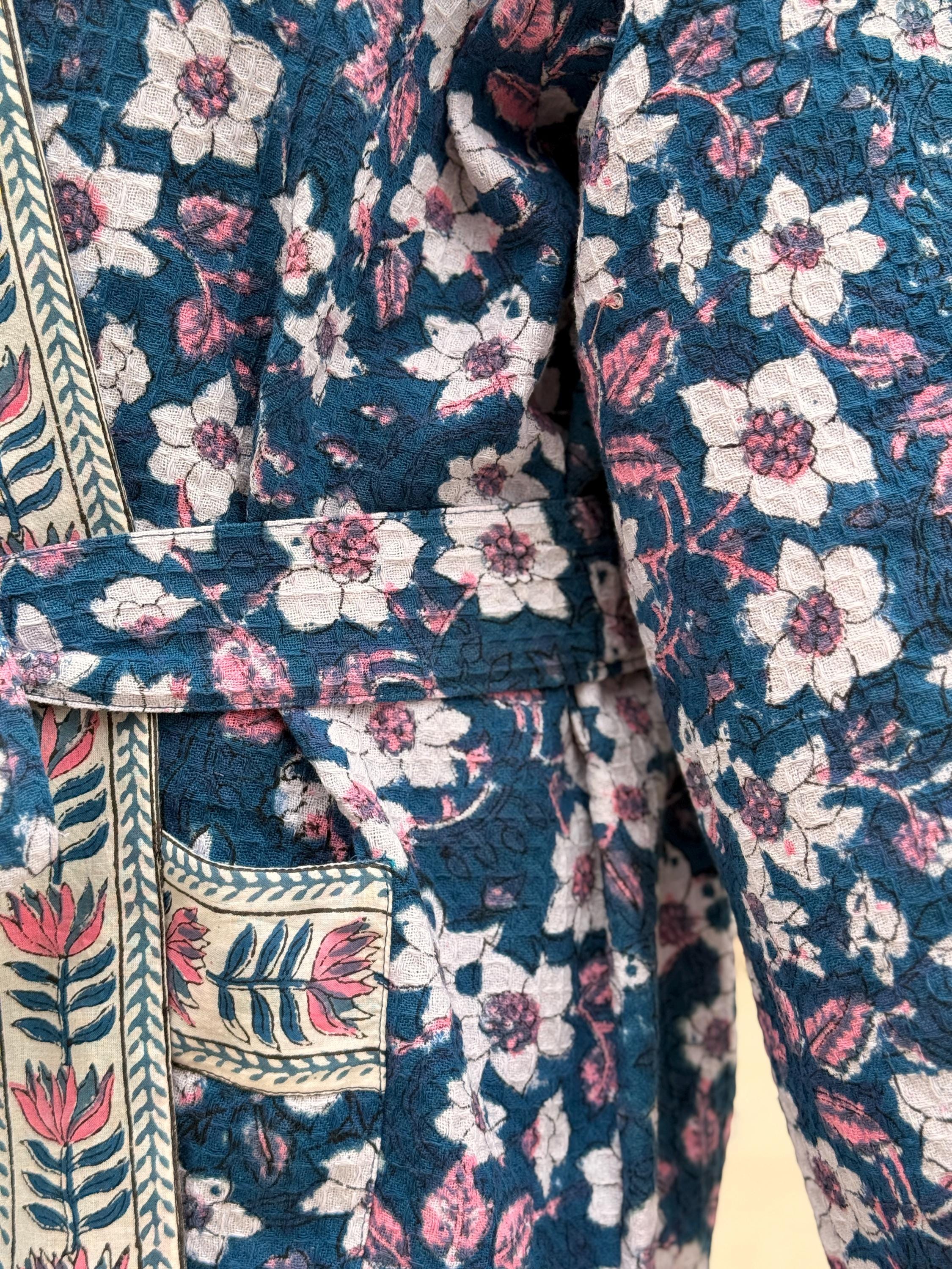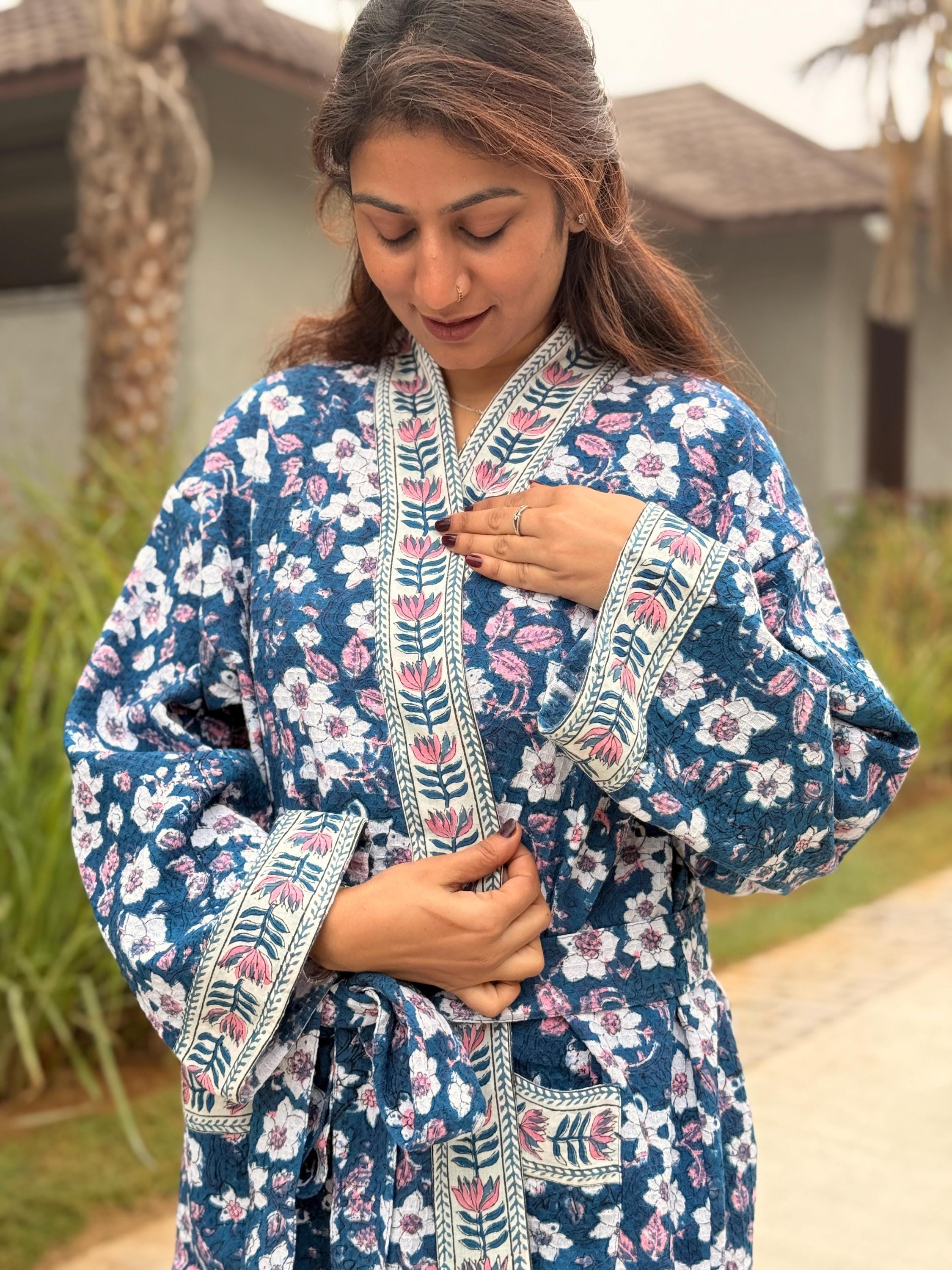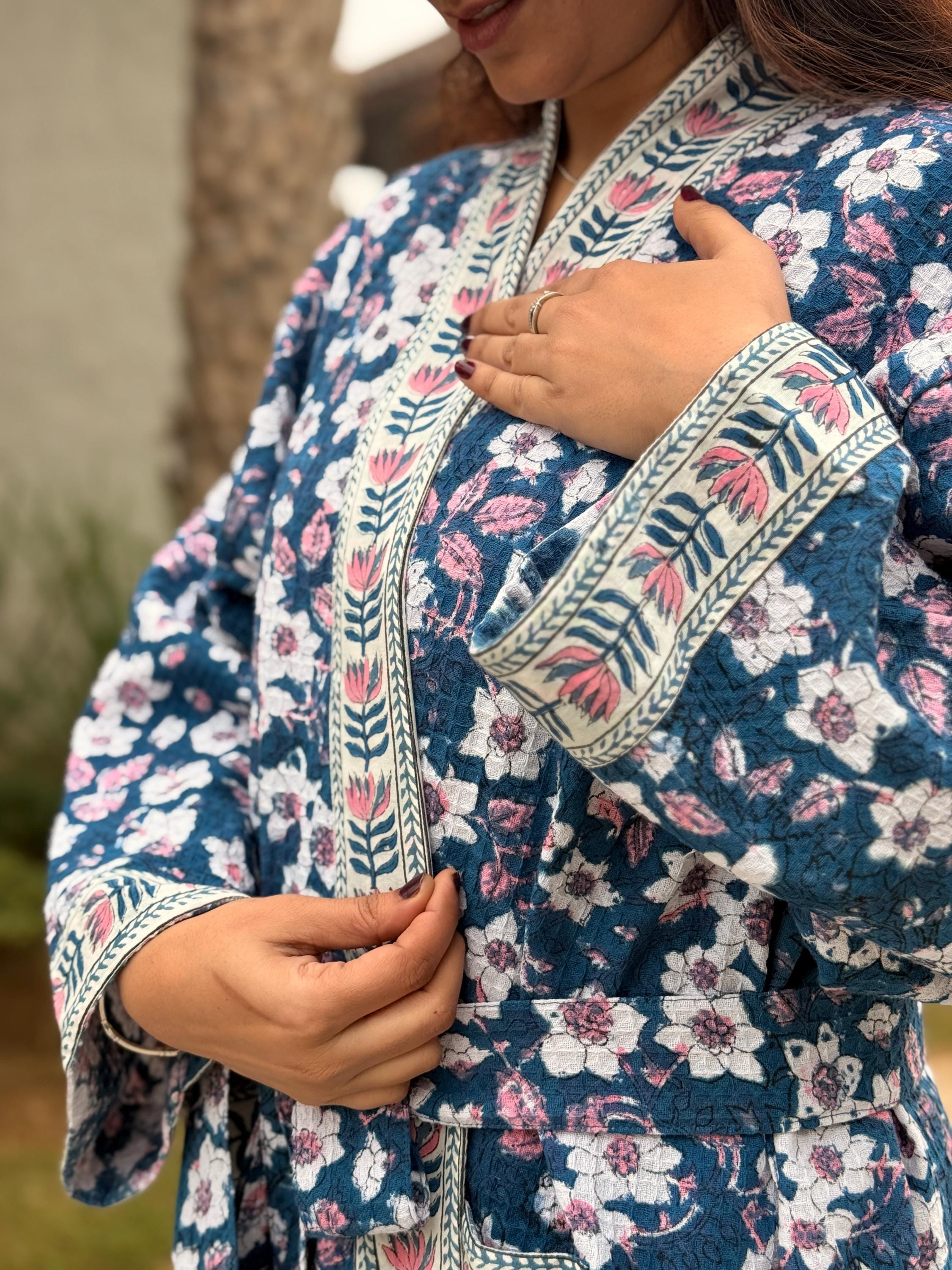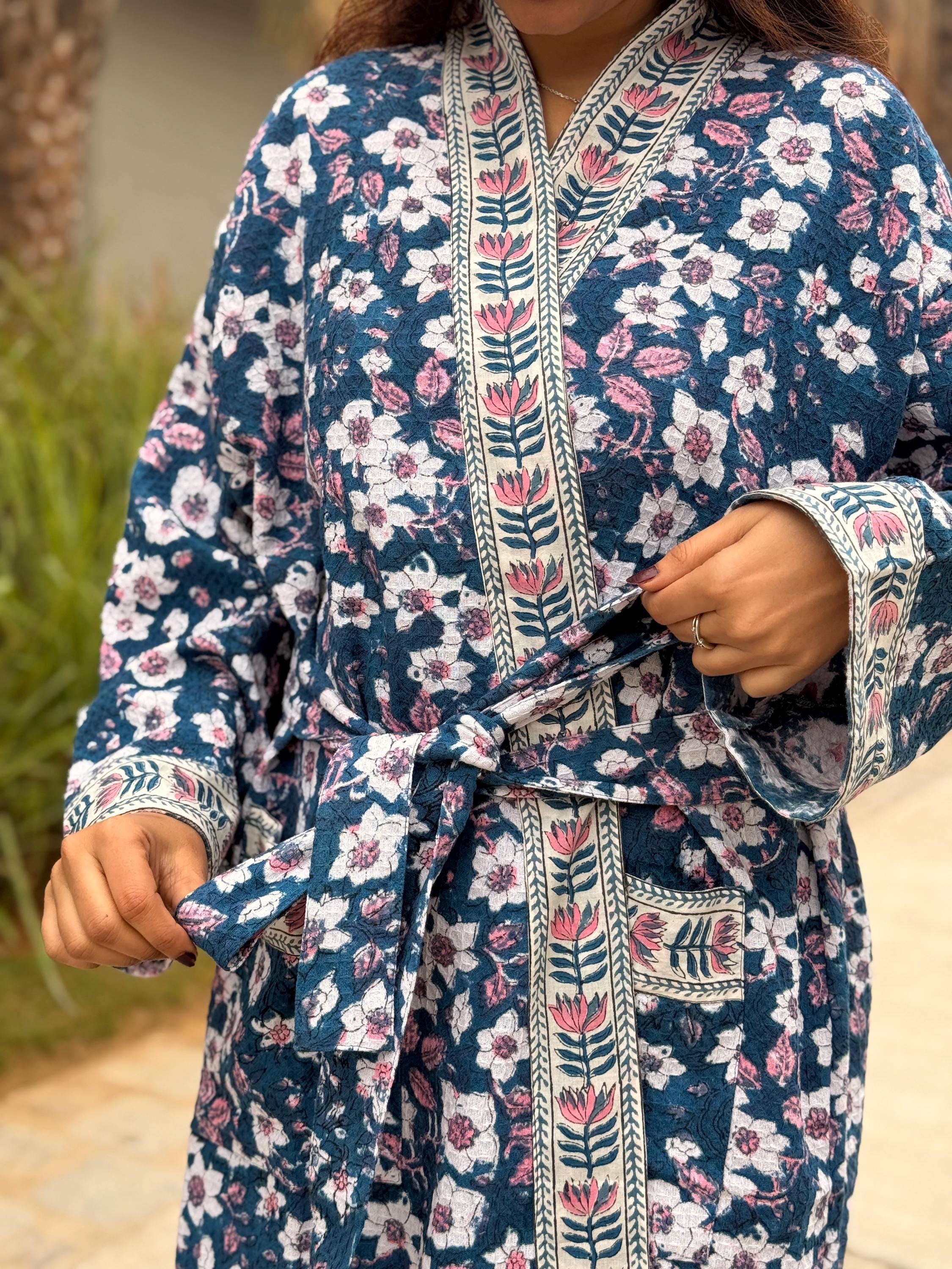 This robe is made from 100% breathable cotton waffle fabric, featuring a charming blue floral hand block print highlighted with a contrasting border along the neckline, sleeves, and front panel. The waffle weave adds gentle texture and light absorbency, making it ideal as a bathrobe, dressing gown, or cozy loungewear.
