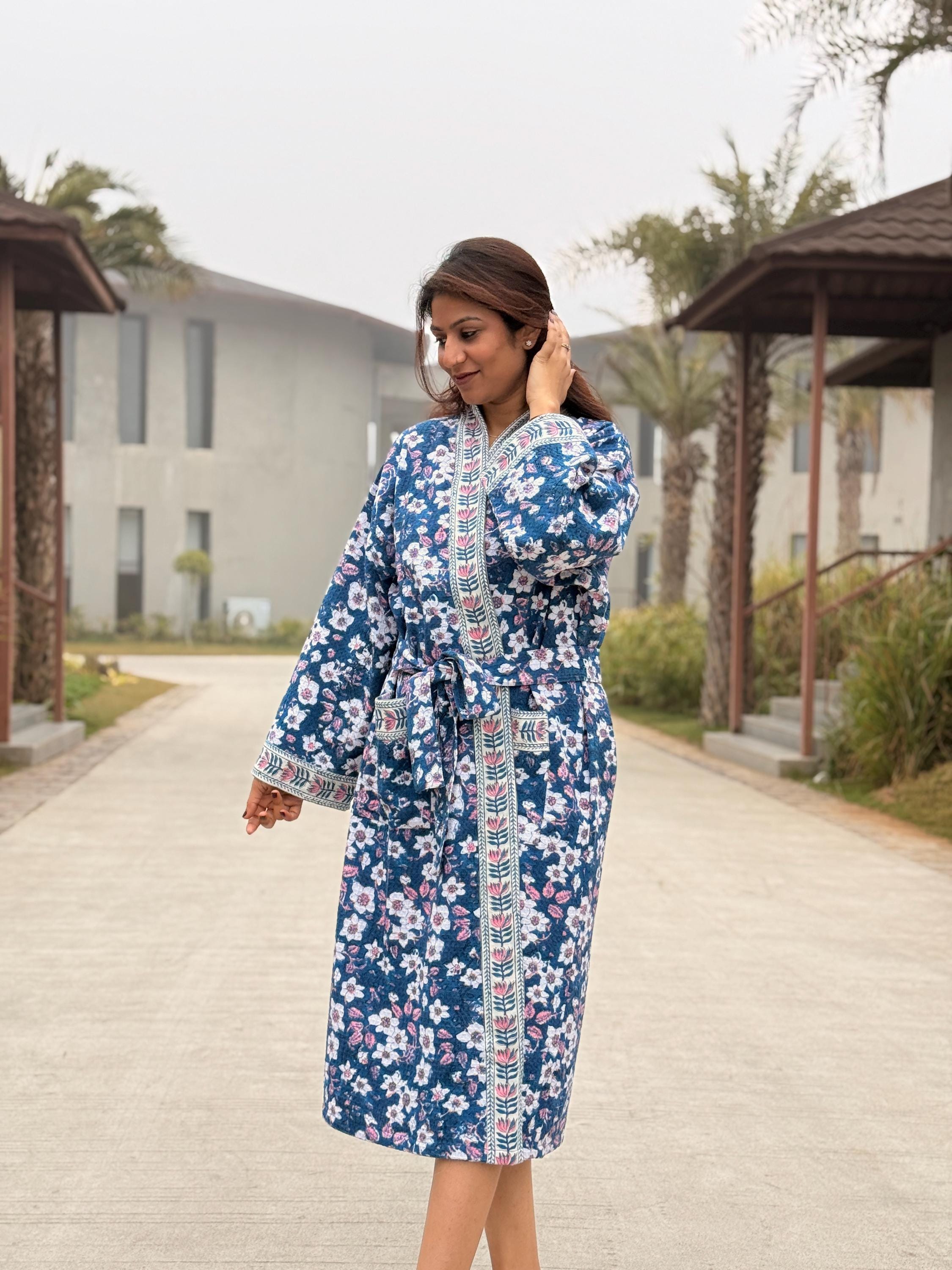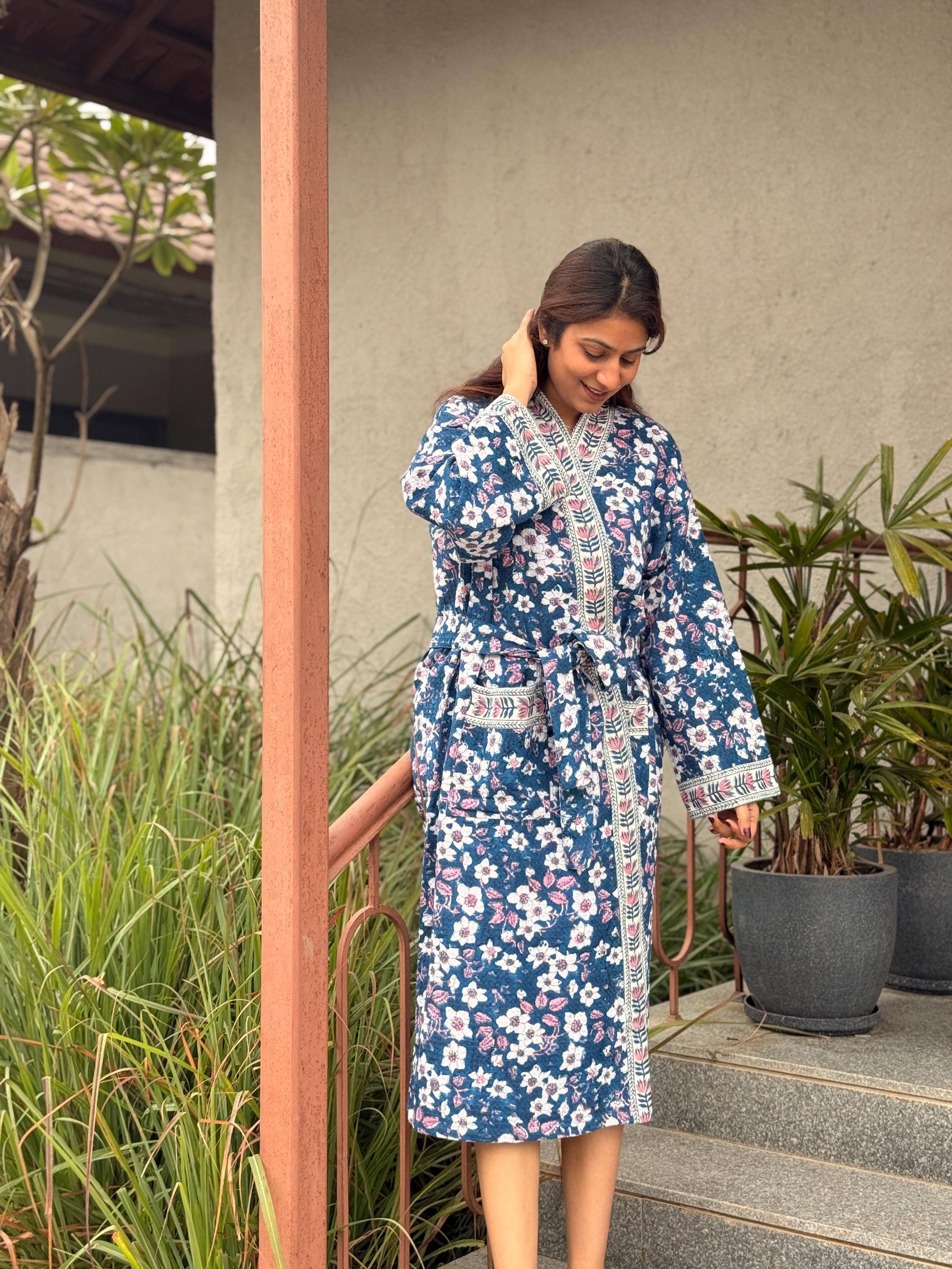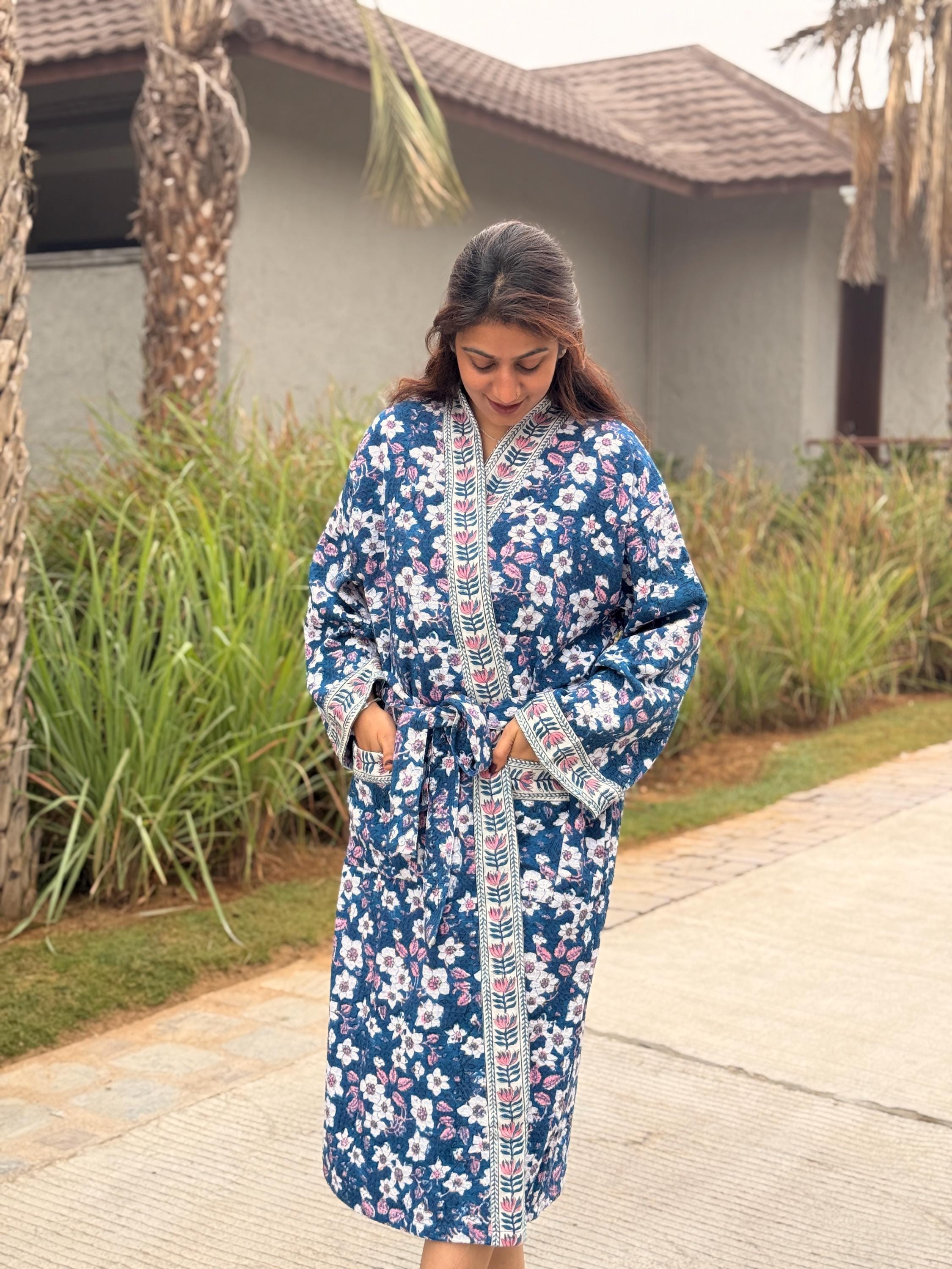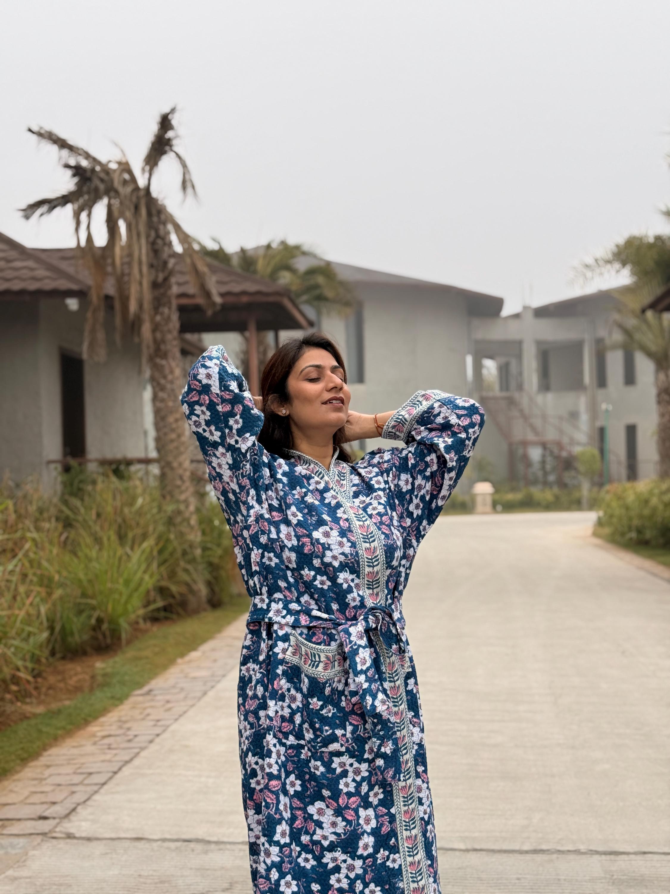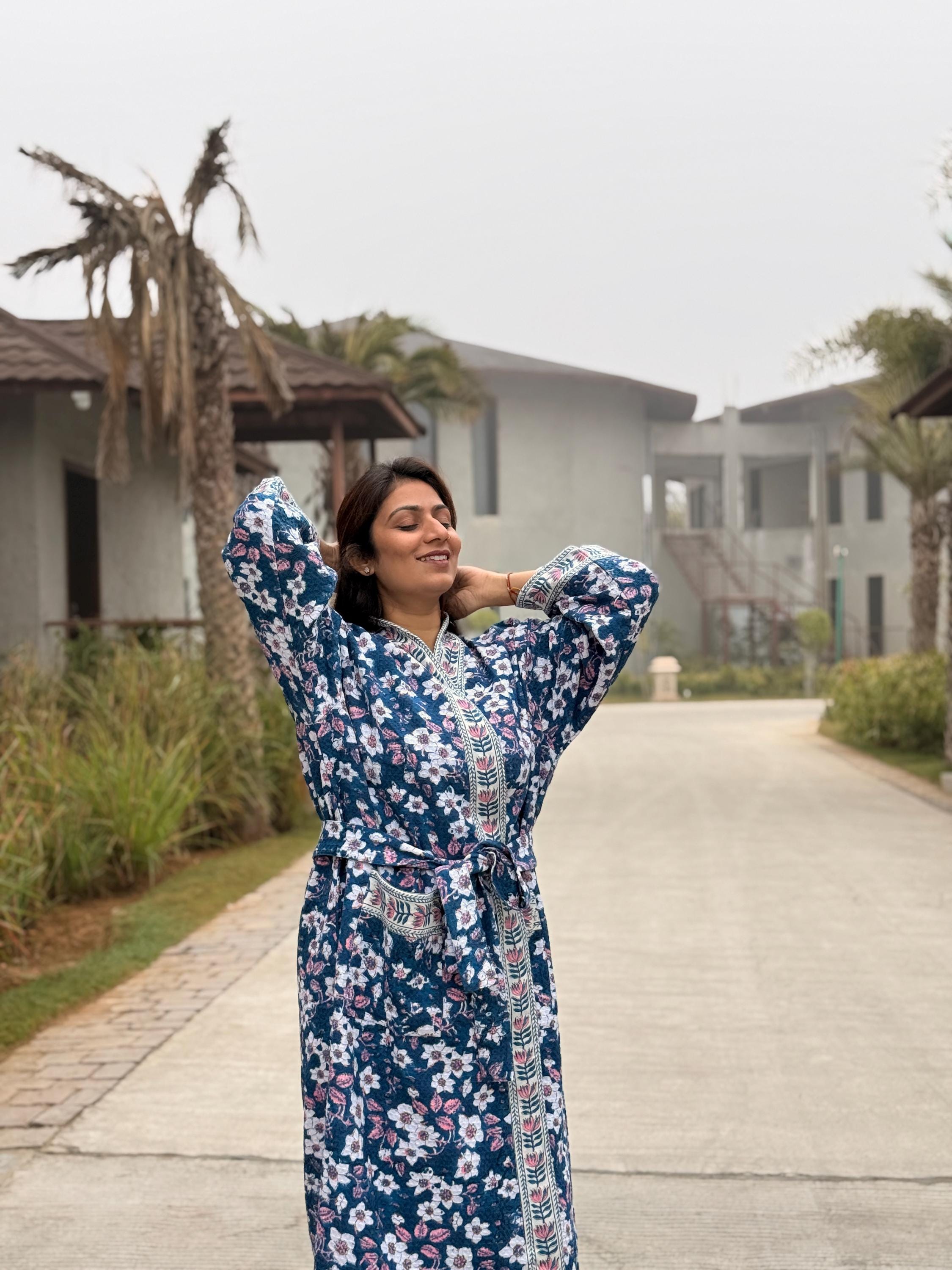 This robe is made from 100% breathable cotton waffle fabric, featuring a charming blue floral hand block print highlighted with a contrasting border along the neckline, sleeves, and front panel. The waffle weave adds gentle texture and light absorbency, making it ideal as a bathrobe, dressing gown, or cozy loungewear.
