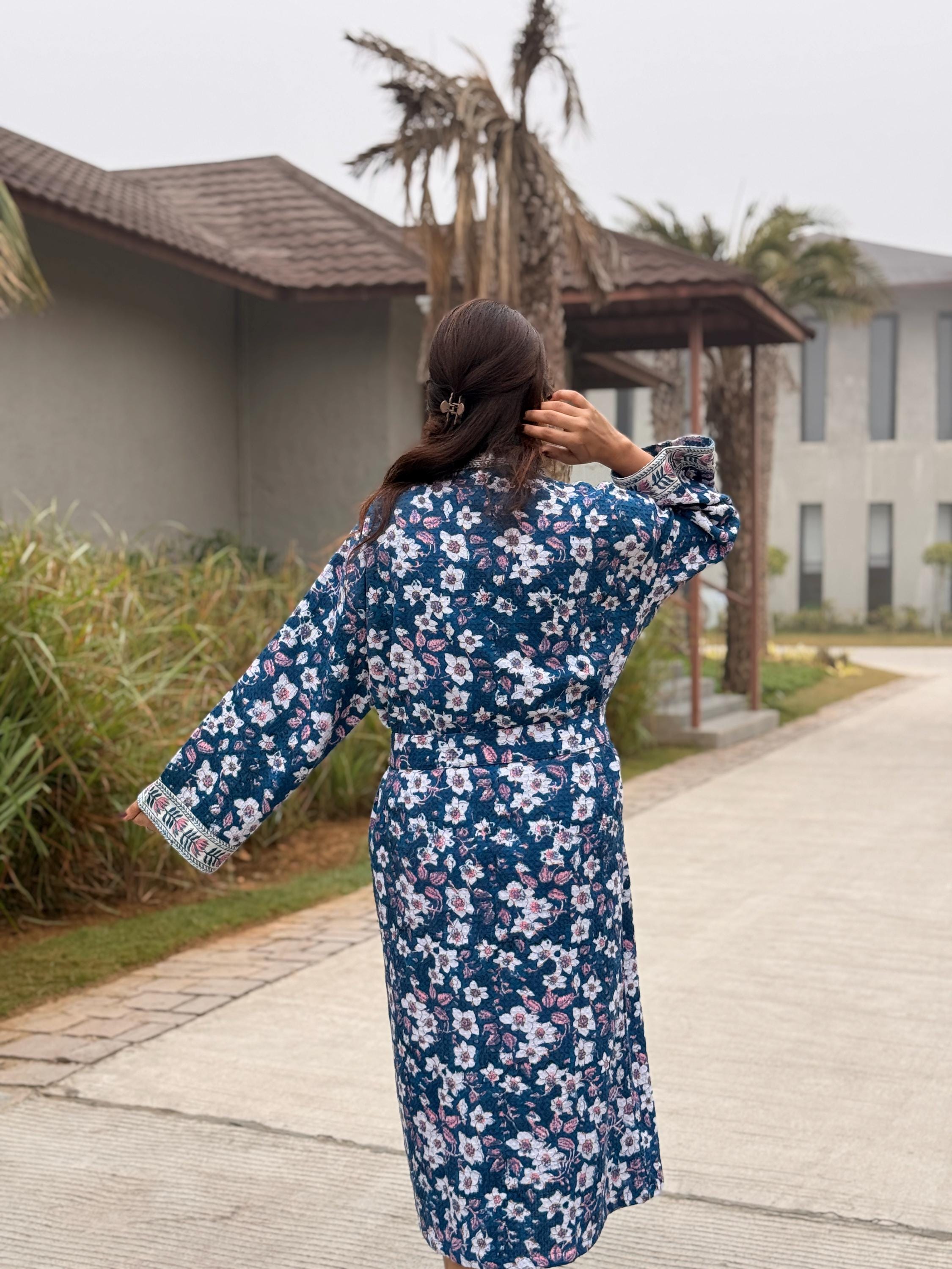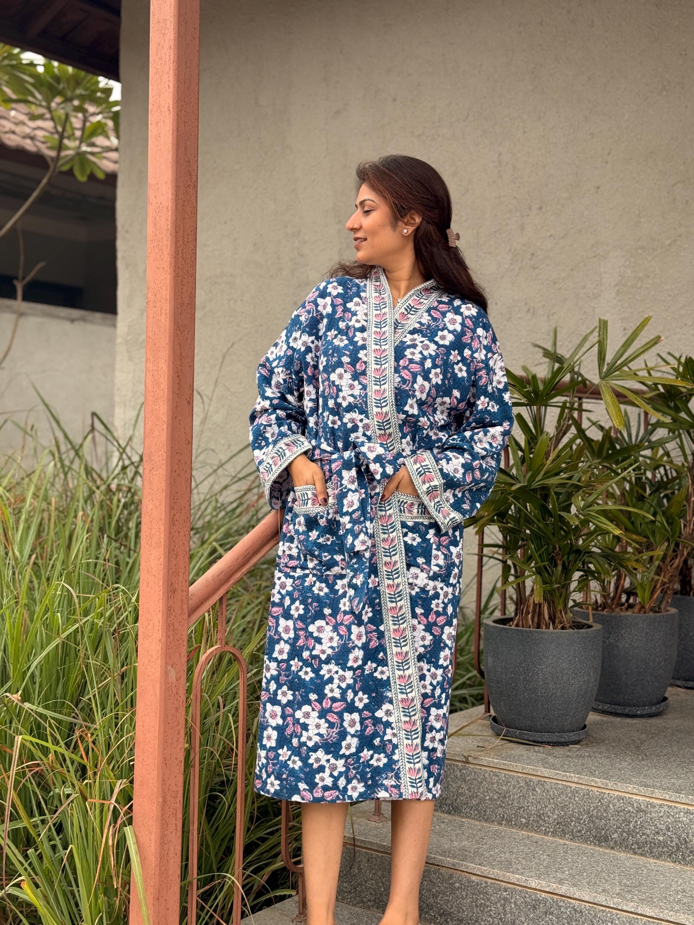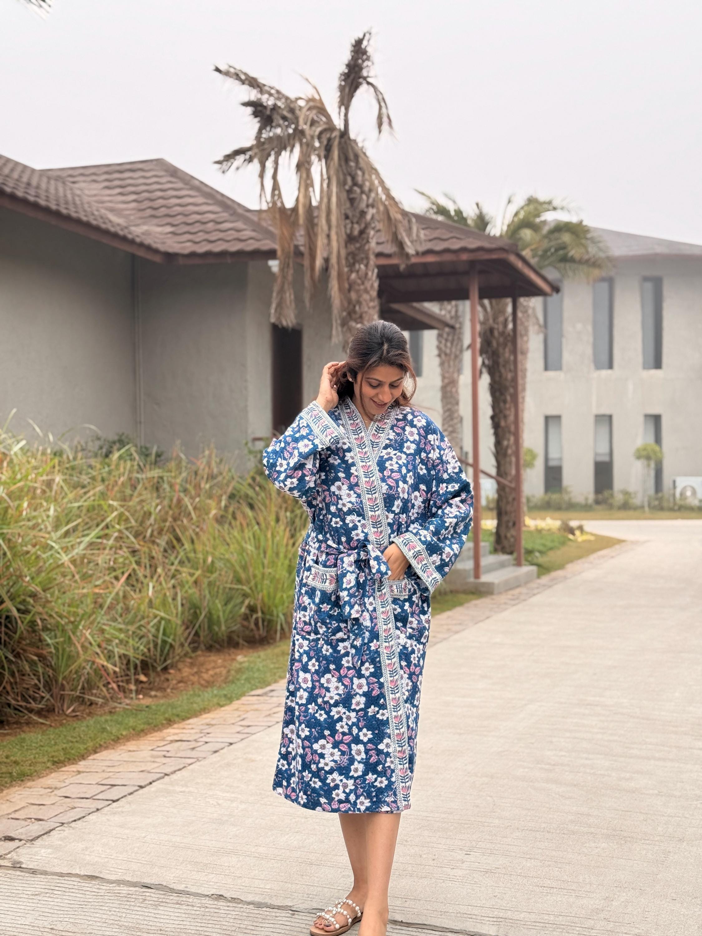 Each piece is individually hand block printed by skilled artisans, using traditional wooden blocks and age-old techniques. The result is a robe that feels personal, timeless, and truly one of a kind