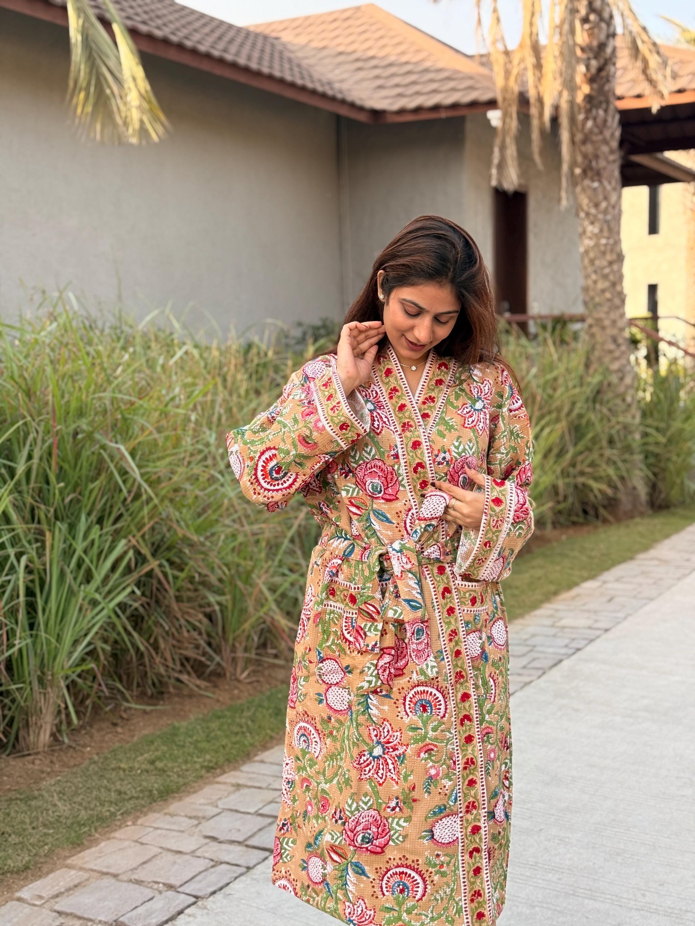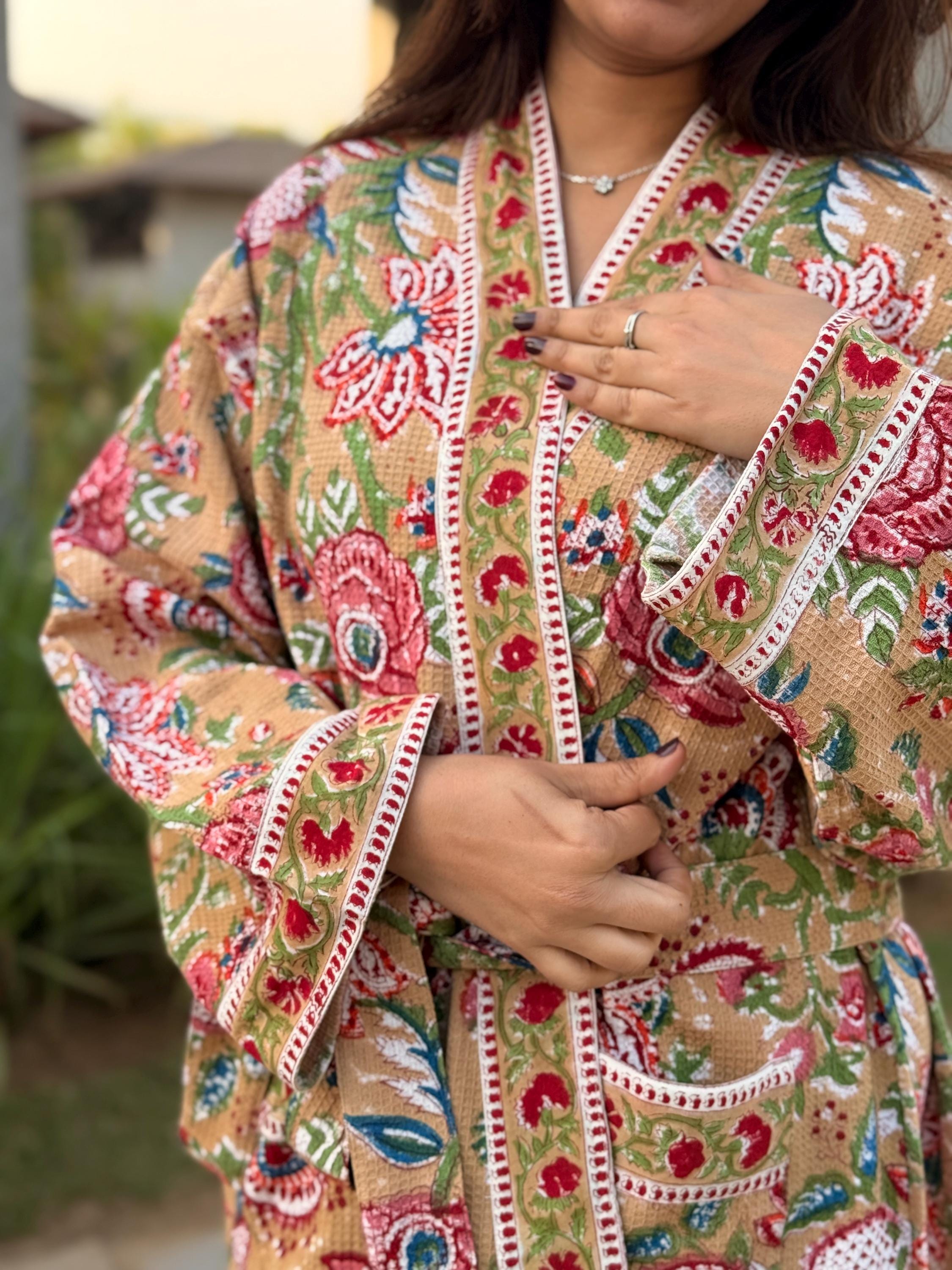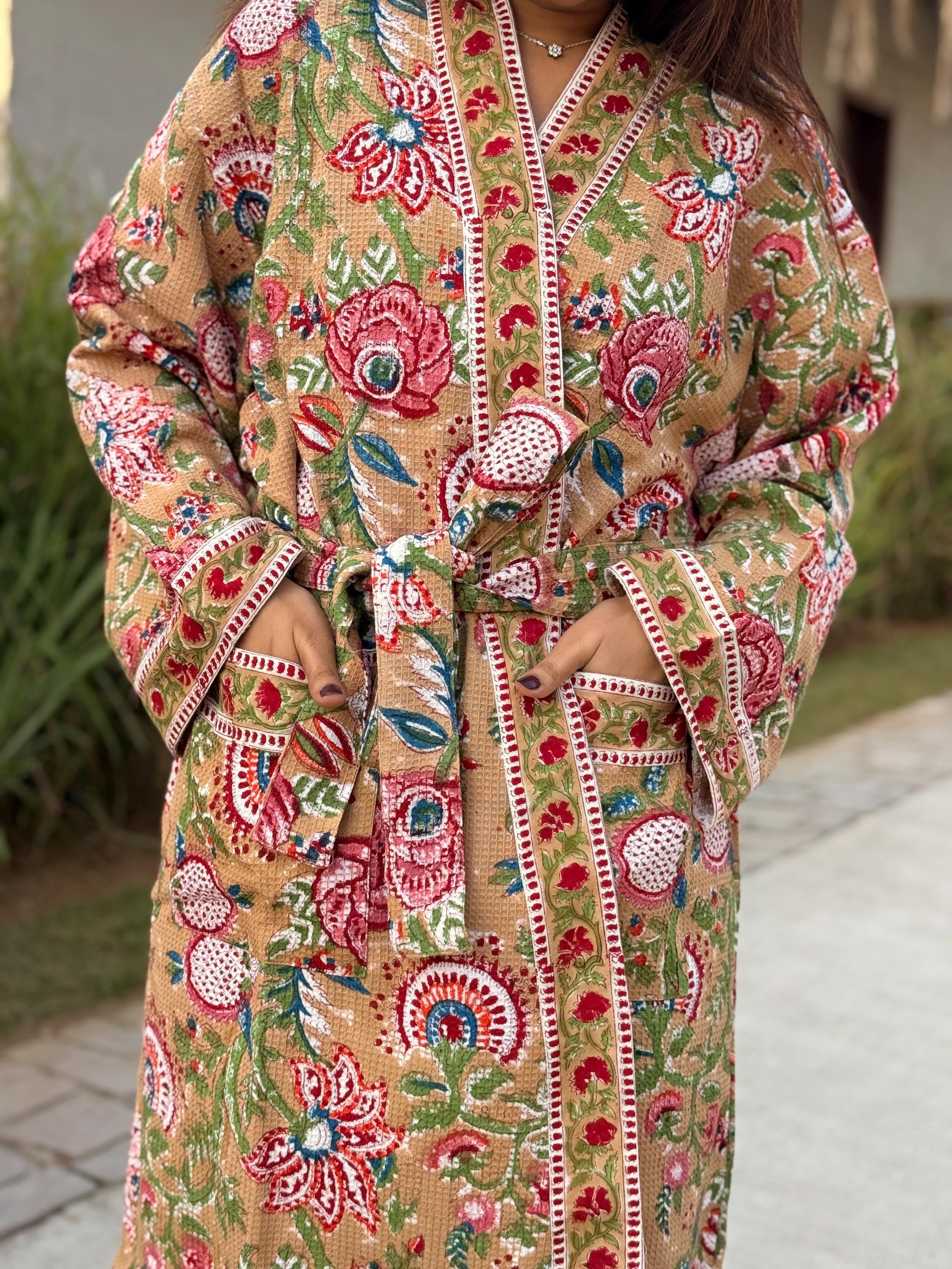 Celebrate heritage craftsmanship and everyday comfort with our Hand Block Printed Cotton Waffle Kimono Robe, lovingly handmade using traditional Indian techniques.