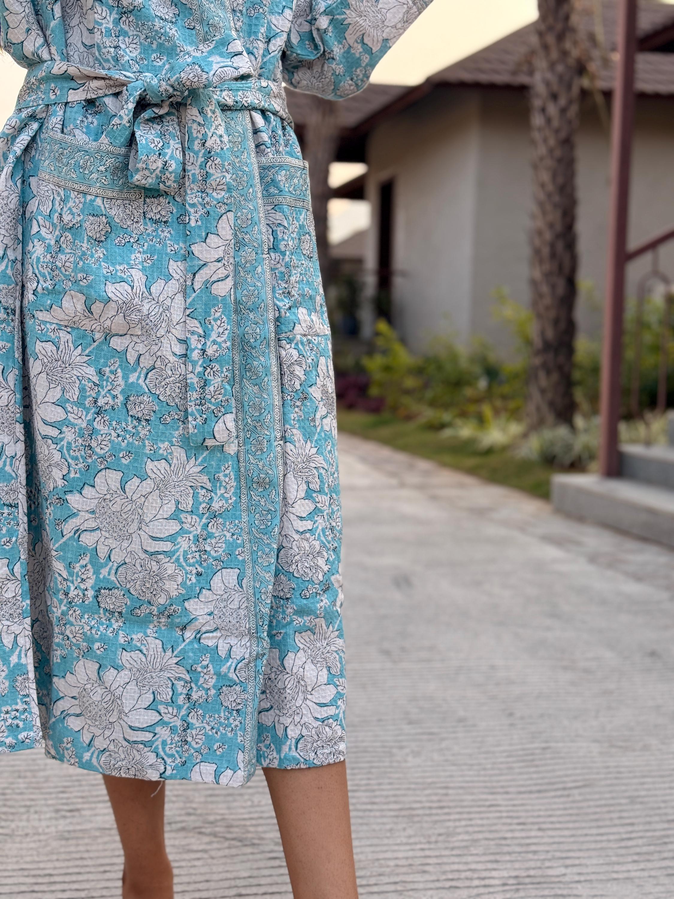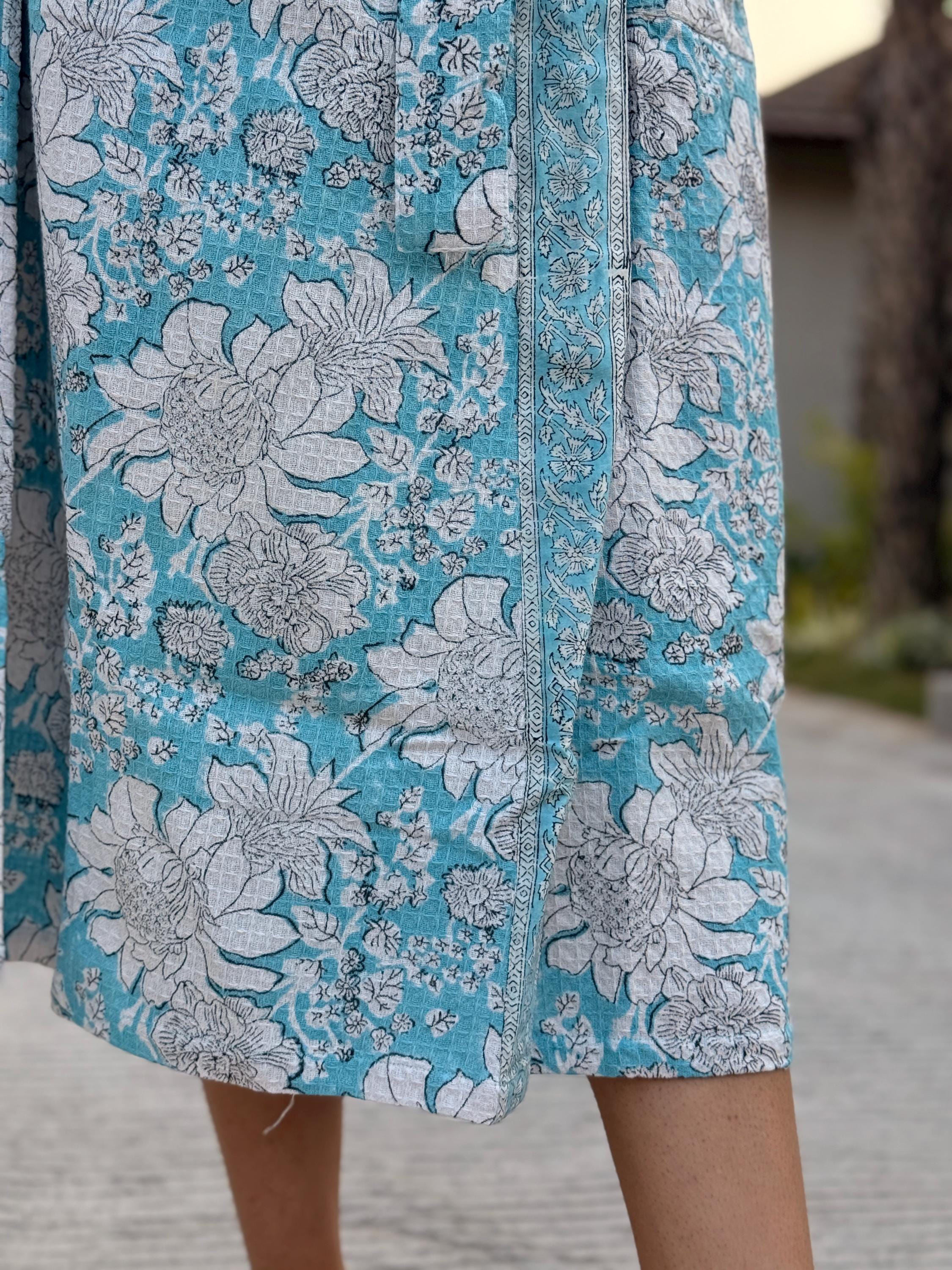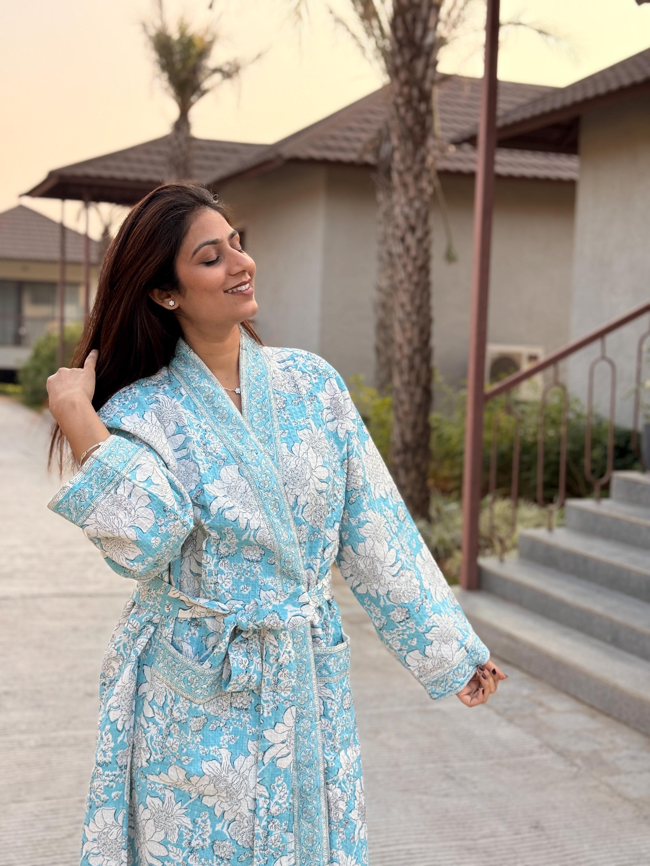 Crafted from 100% breathable cotton waffle fabric, this robe features a serene sky blue base adorned with delicate white floral block prints. The soft waffle weave adds gentle texture and light absorbency, making it ideal for everyday lounging, spa moments, or post-bath relaxation.