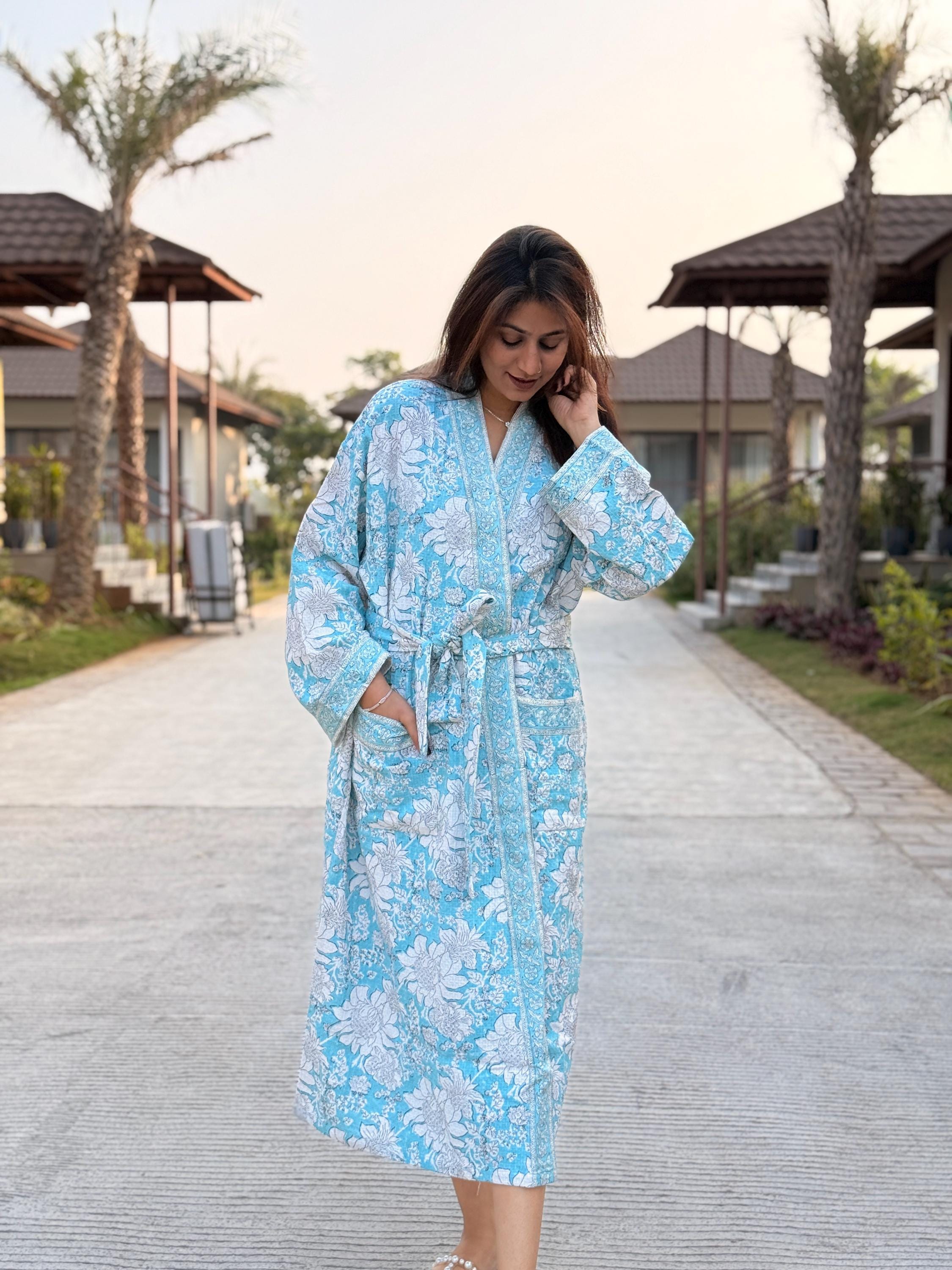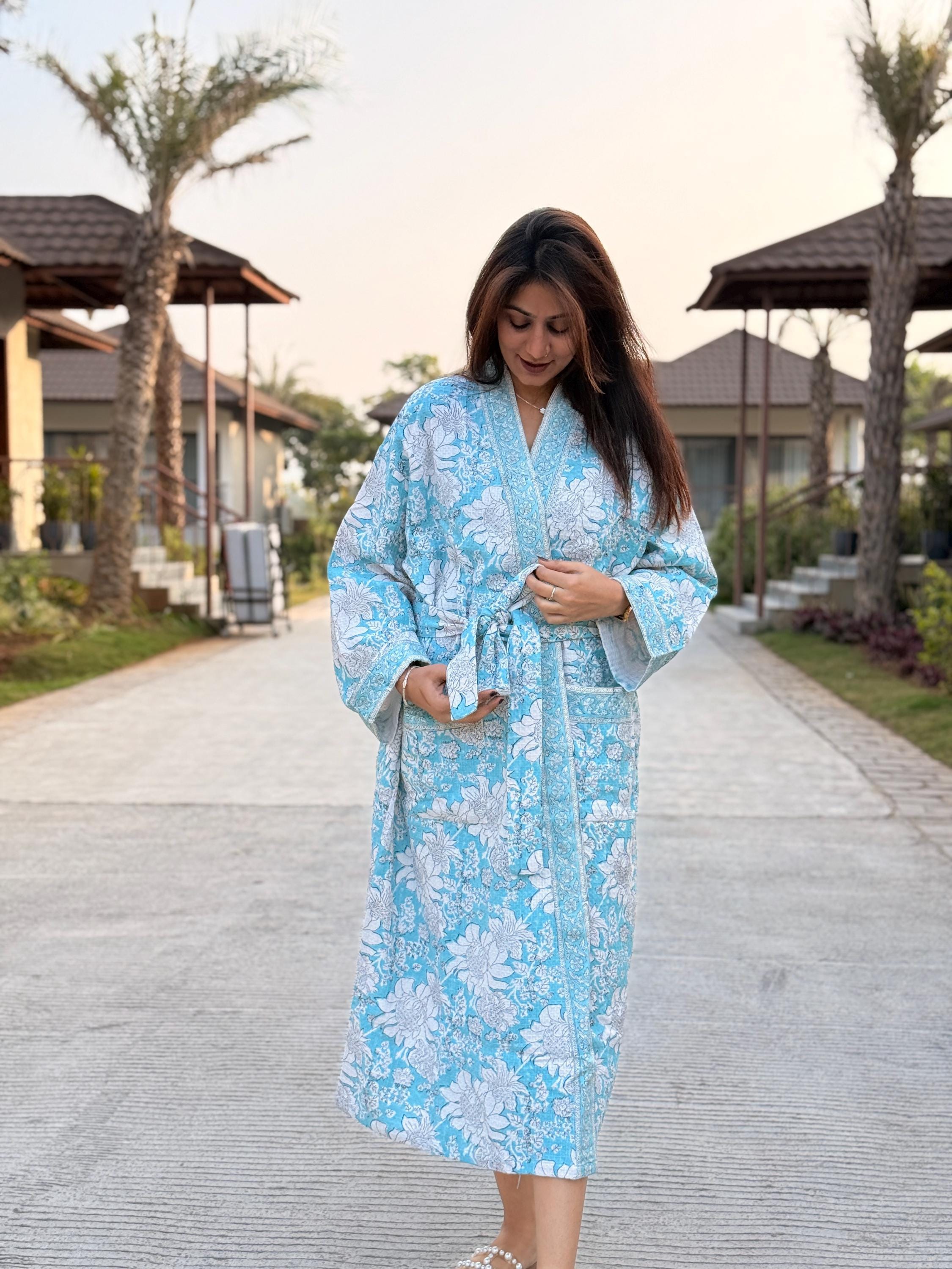 Each robe is individually hand block printed by skilled artisans, ensuring no two pieces are exactly alike. Designed in a classic kimono silhouette, it includes a relaxed wrap fit, adjustable waist tie, wide sleeves, and functional front pockets—bringing together beauty and comfort in perfect balance.