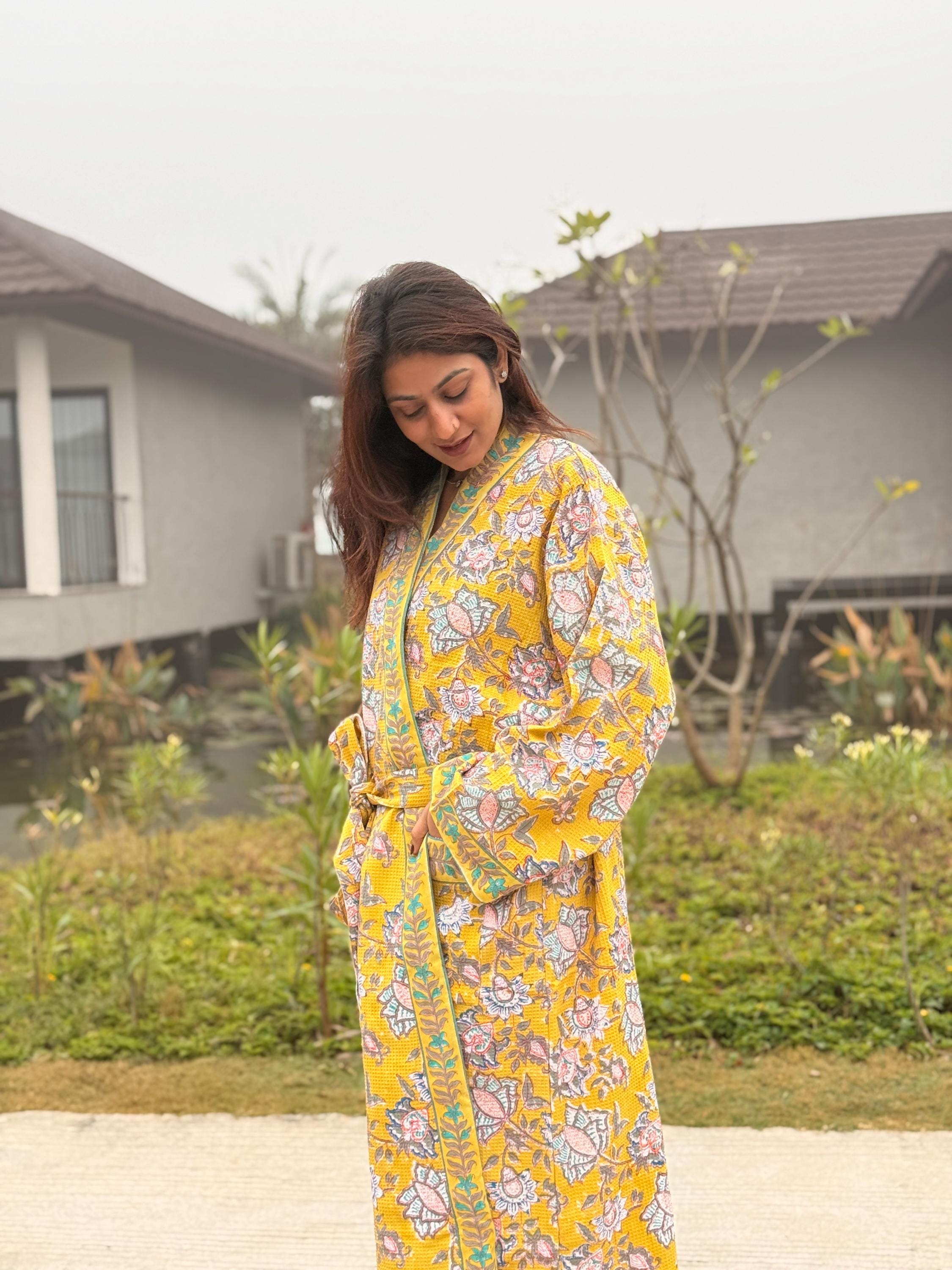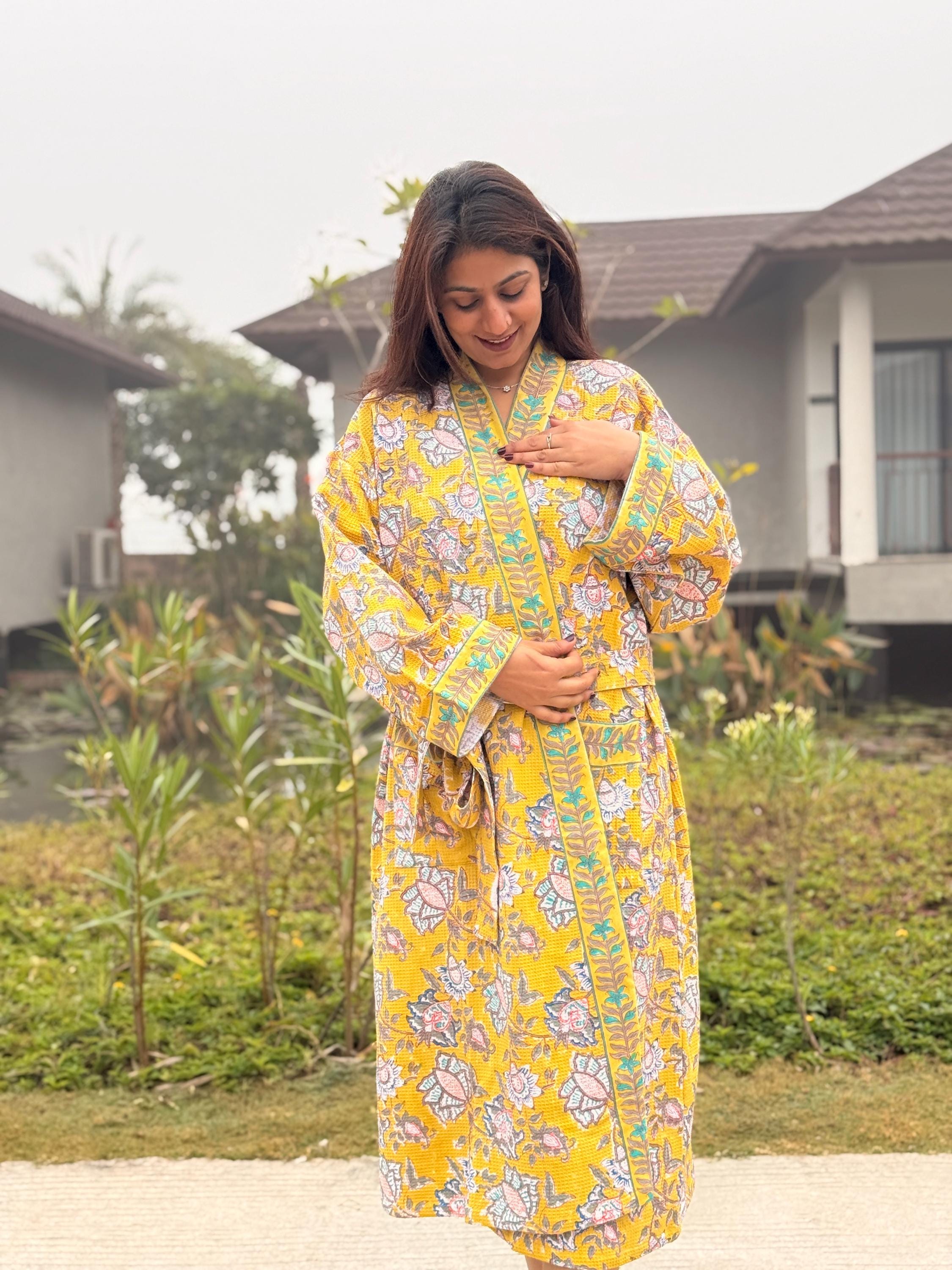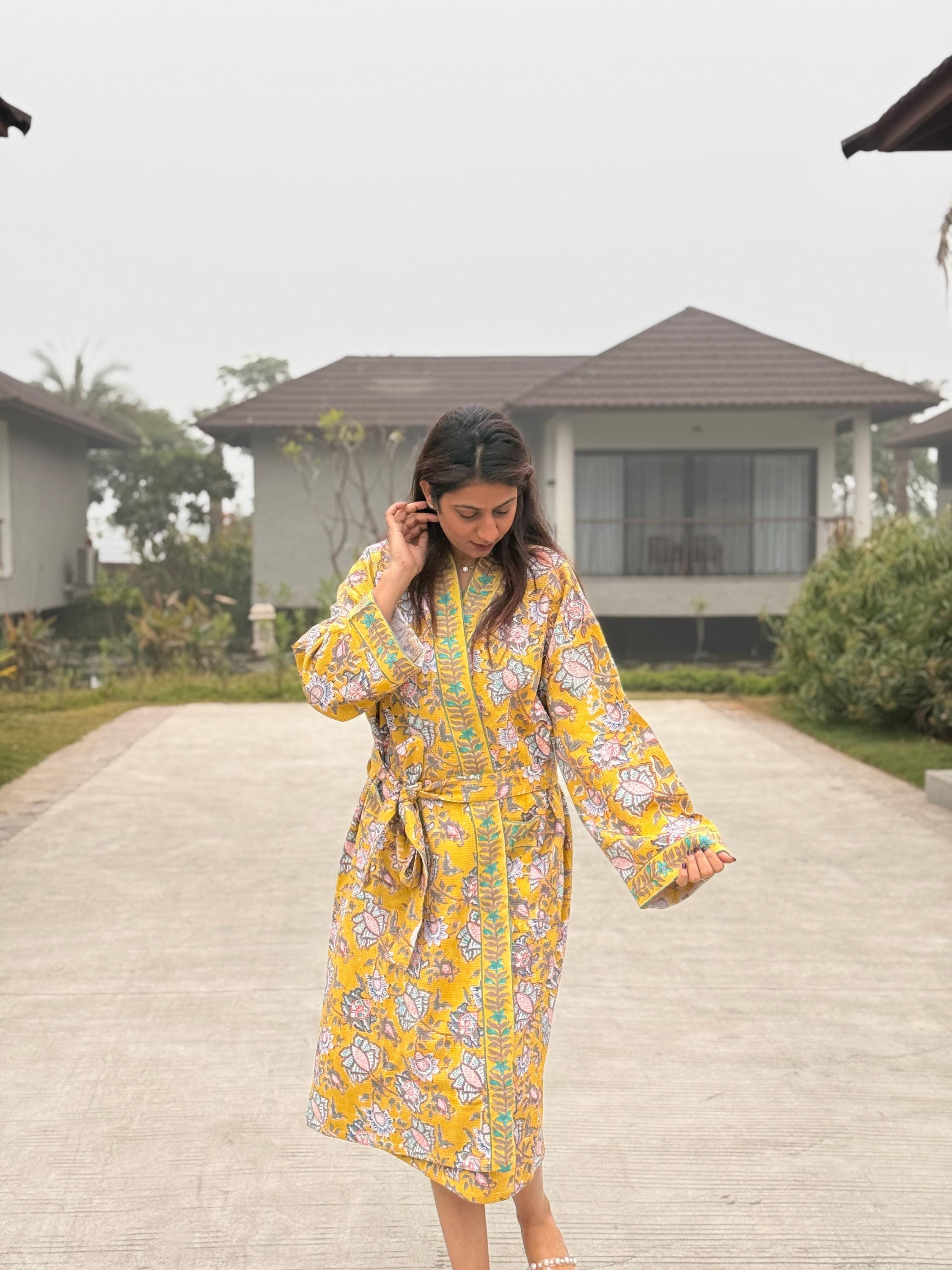 Each robe is individually hand block printed, making every piece unique. Slight variations in print and color are natural and reflect the beauty of authentic handmade textiles.