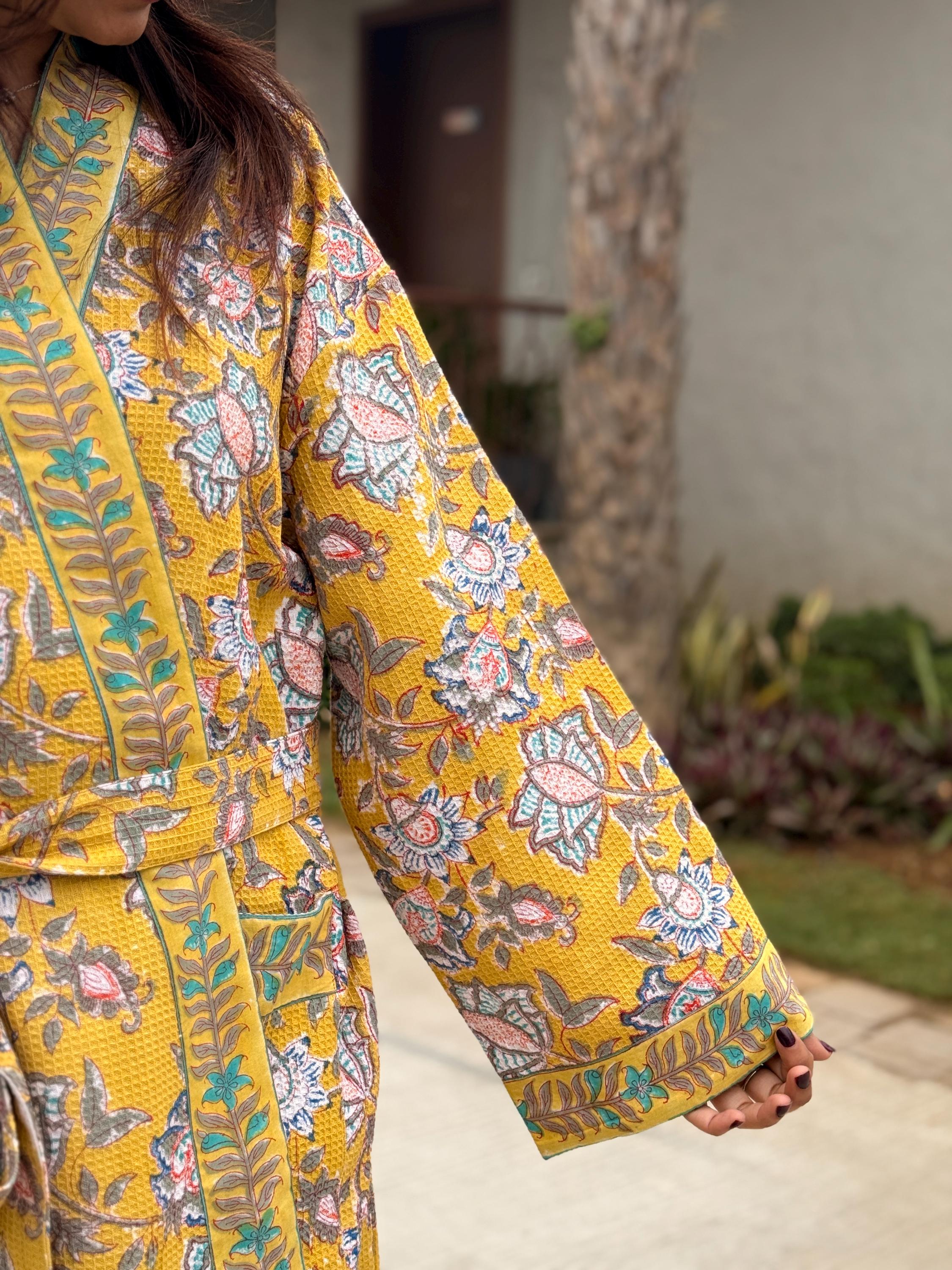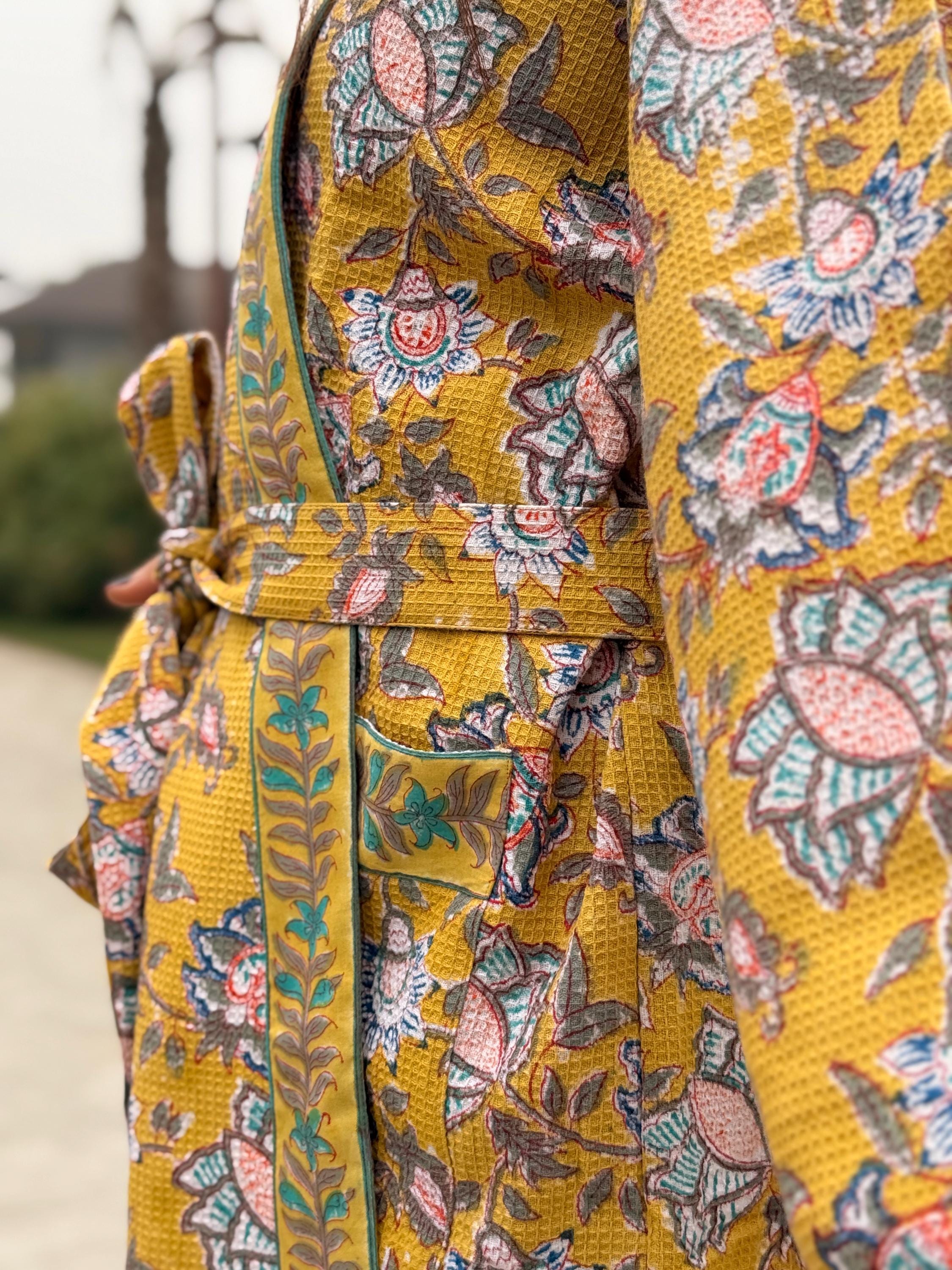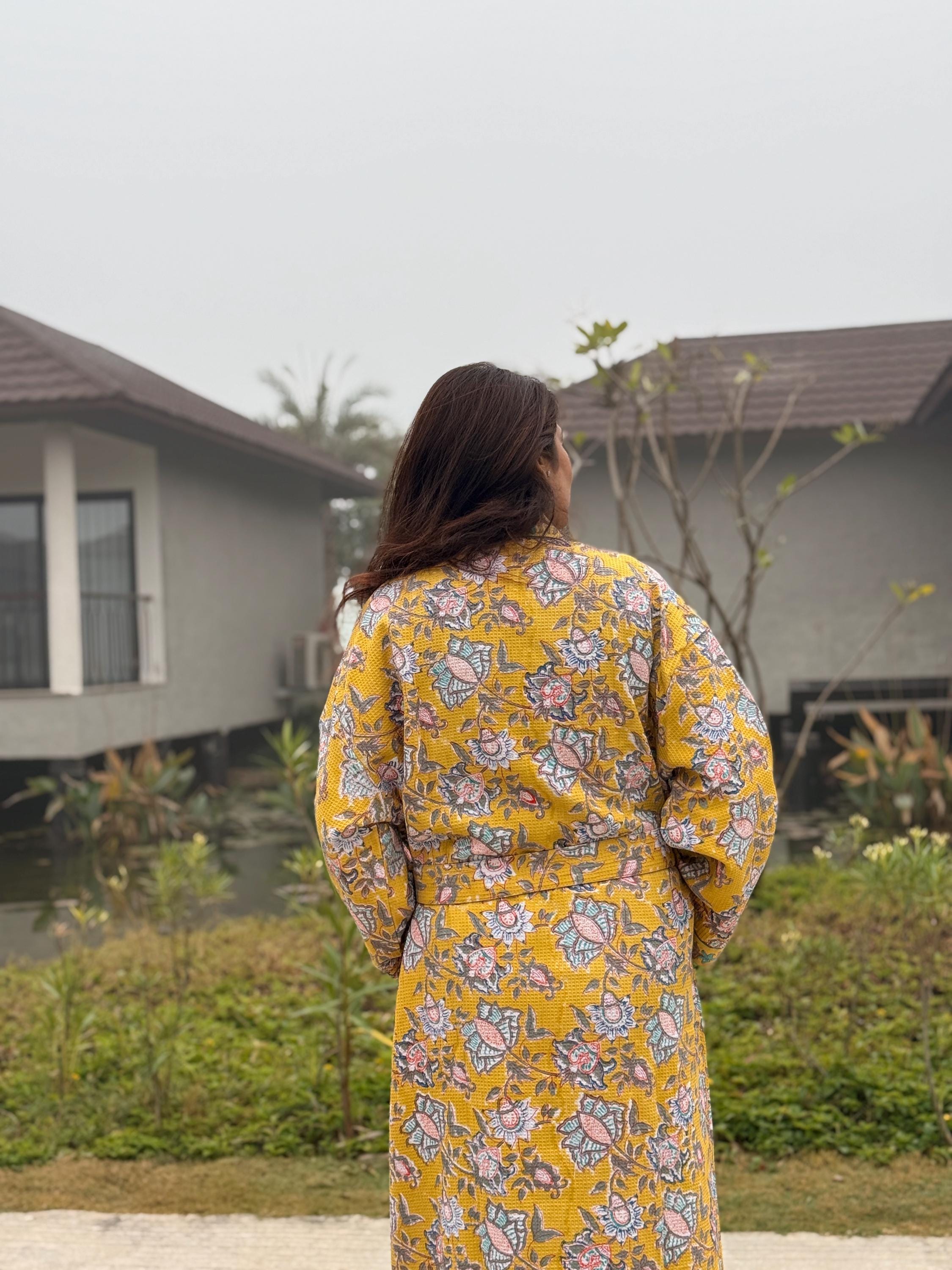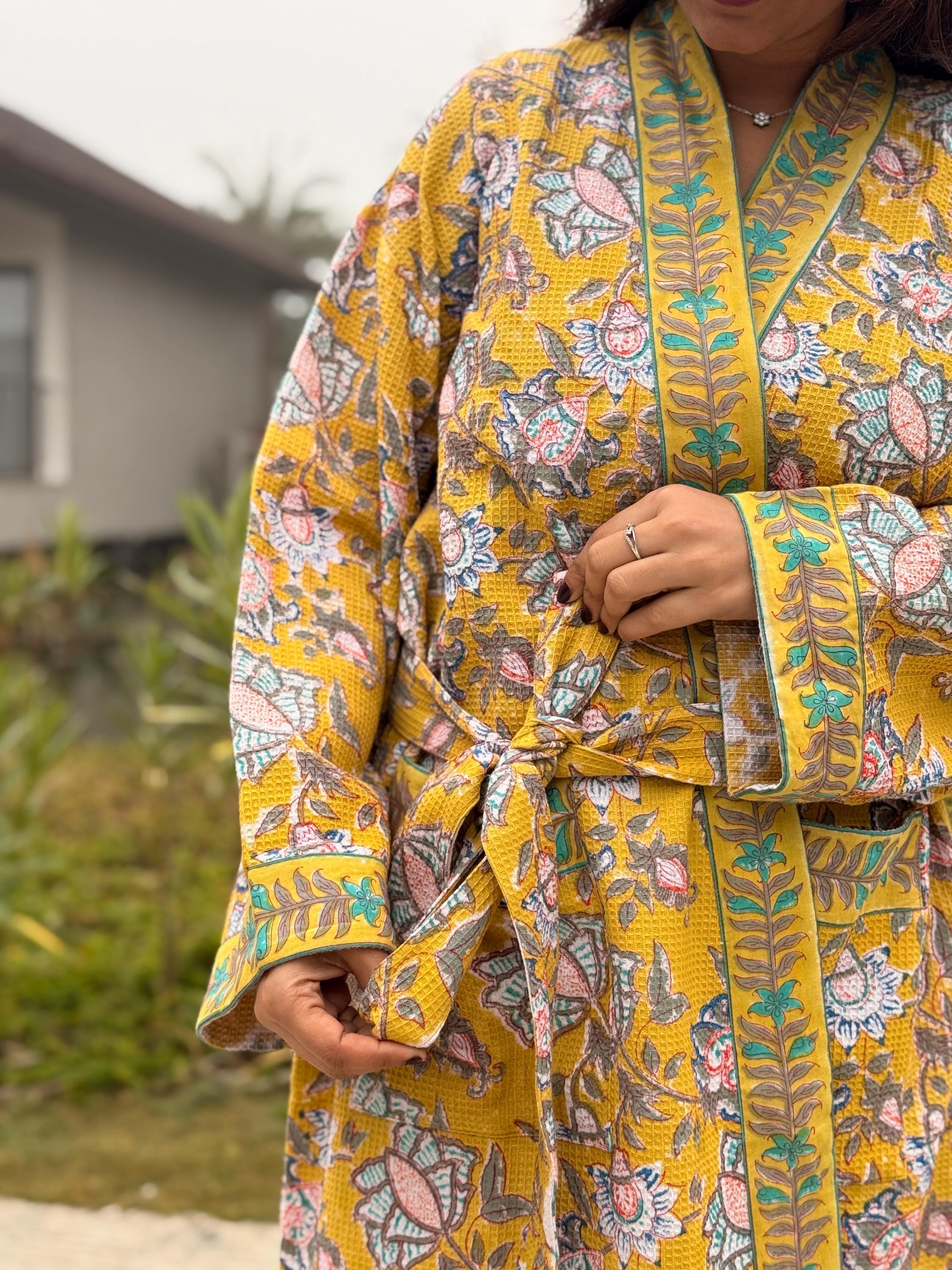Add warmth and artisanal charm to your daily routine with our Hand Block Printed Waffle Cotton Kimono Bathrobe, beautifully handcrafted by skilled artisans in India. Featuring a rich mustard yellow base with delicate floral motifs and contrast hand-printed borders, this robe is a celebration of traditional craftsmanship and effortless comfort.