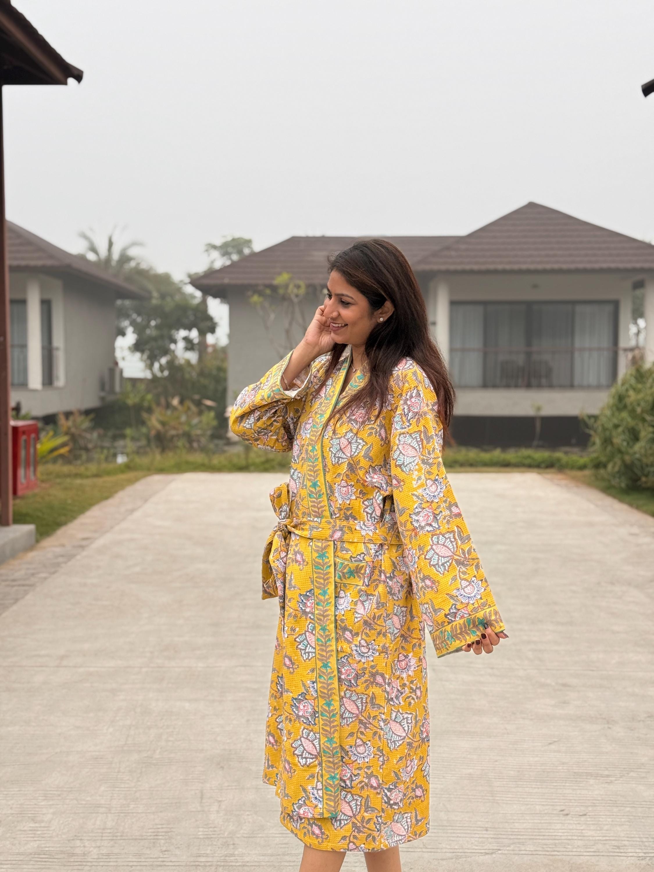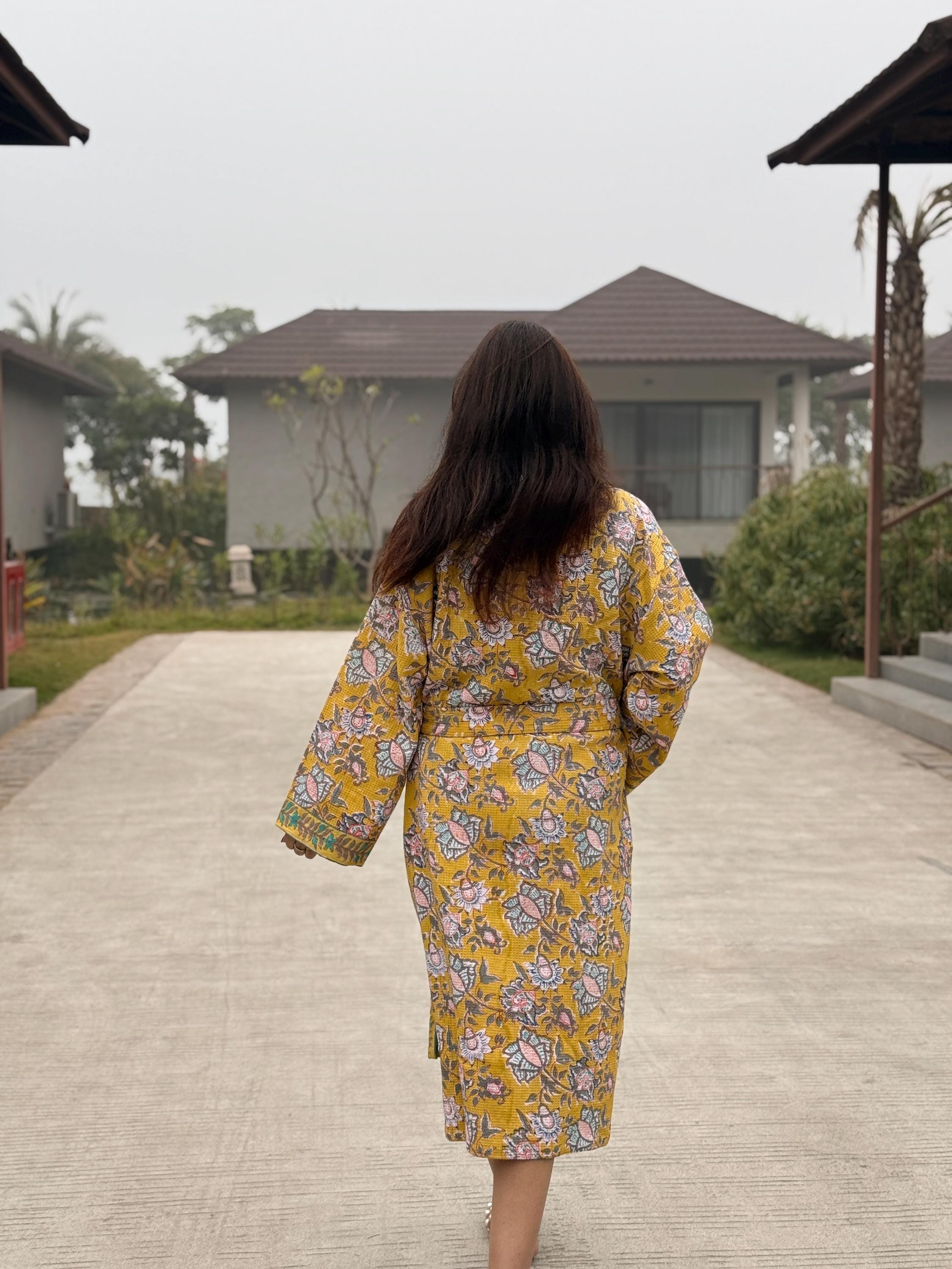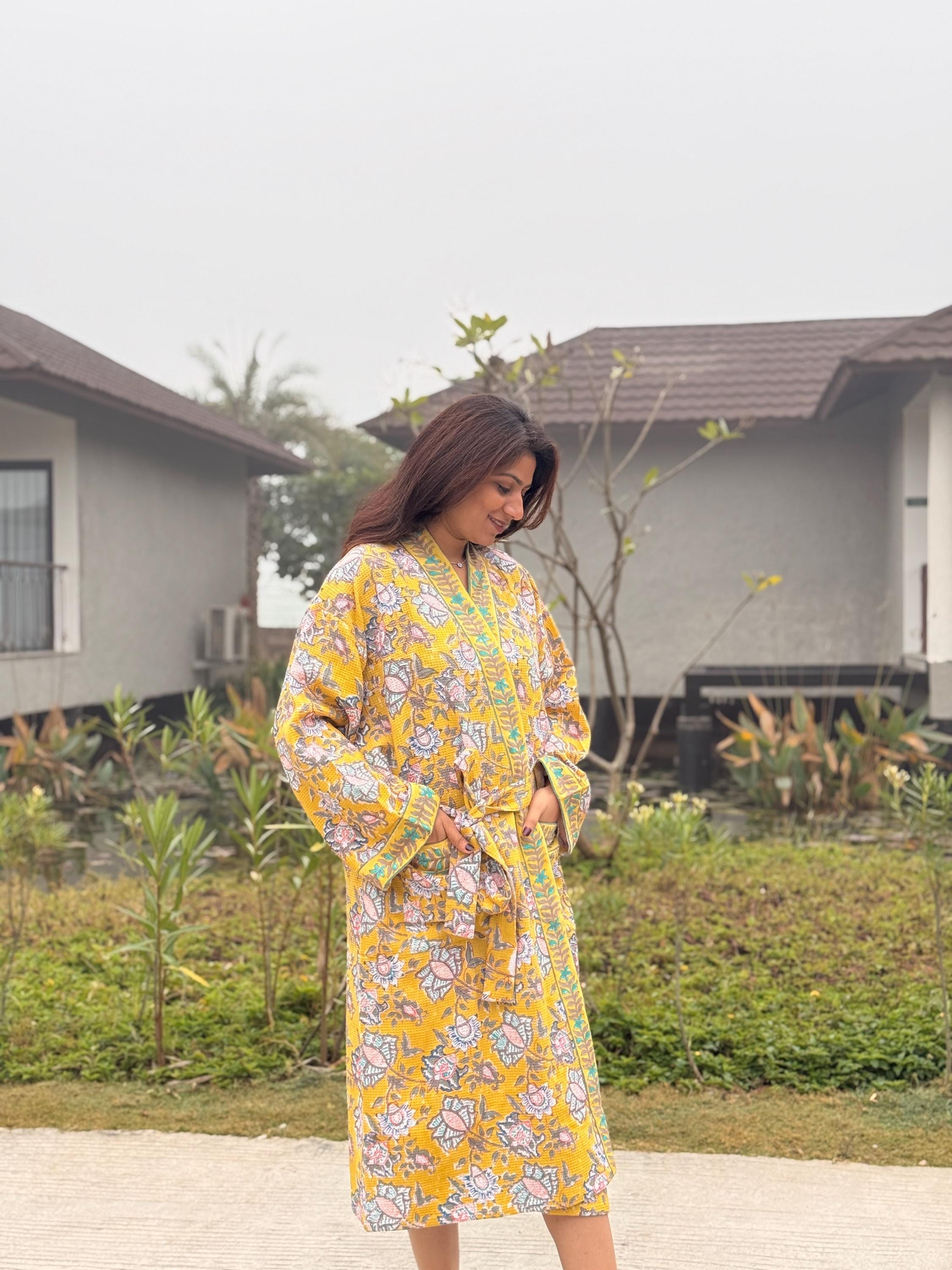 Add warmth and artisanal charm to your daily routine with our Hand Block Printed Waffle Cotton Kimono Bathrobe, beautifully handcrafted by skilled artisans in India. Featuring a rich mustard yellow base with delicate floral motifs and contrast hand-printed borders, this robe is a celebration of traditional craftsmanship and effortless comfort.
