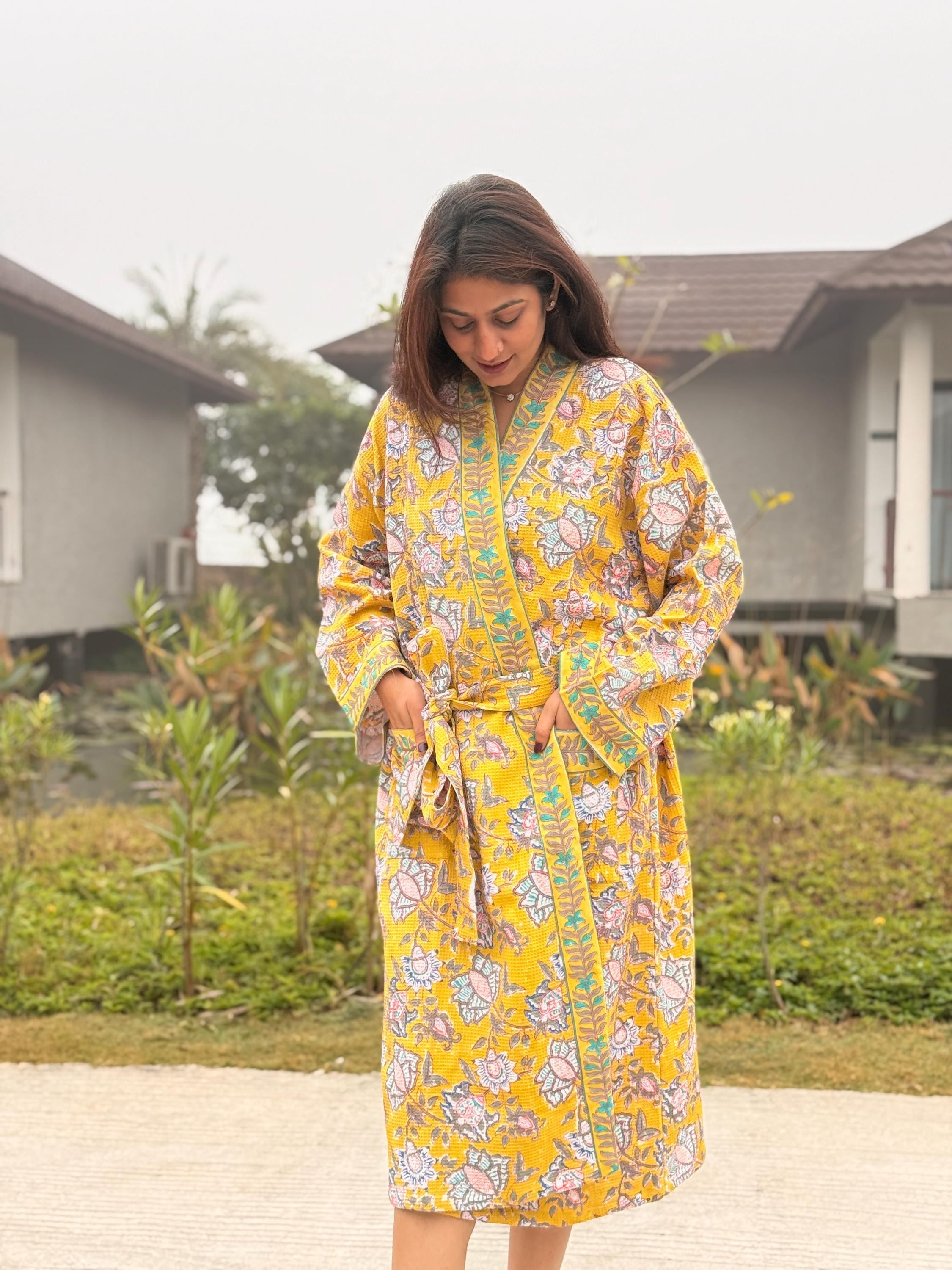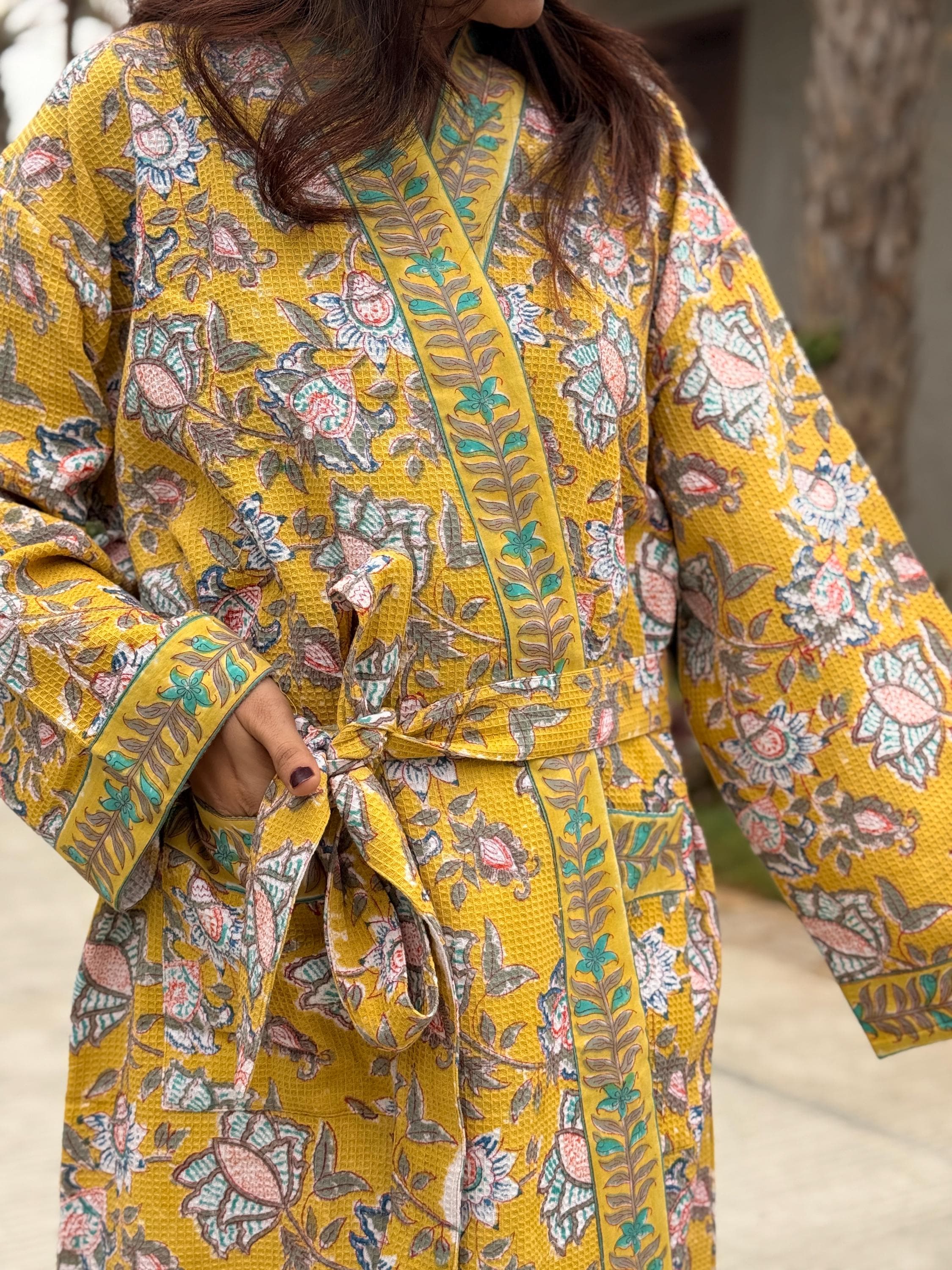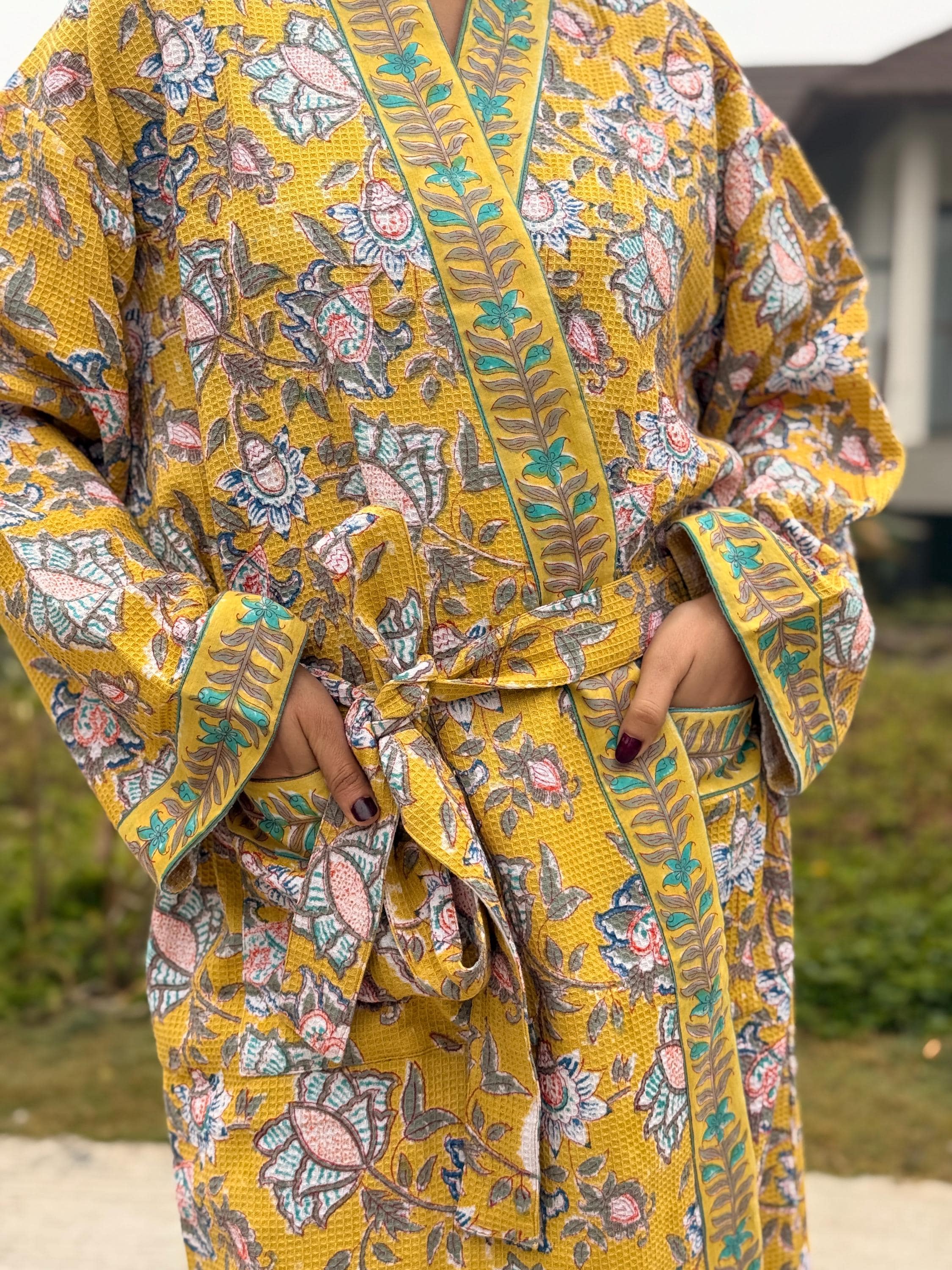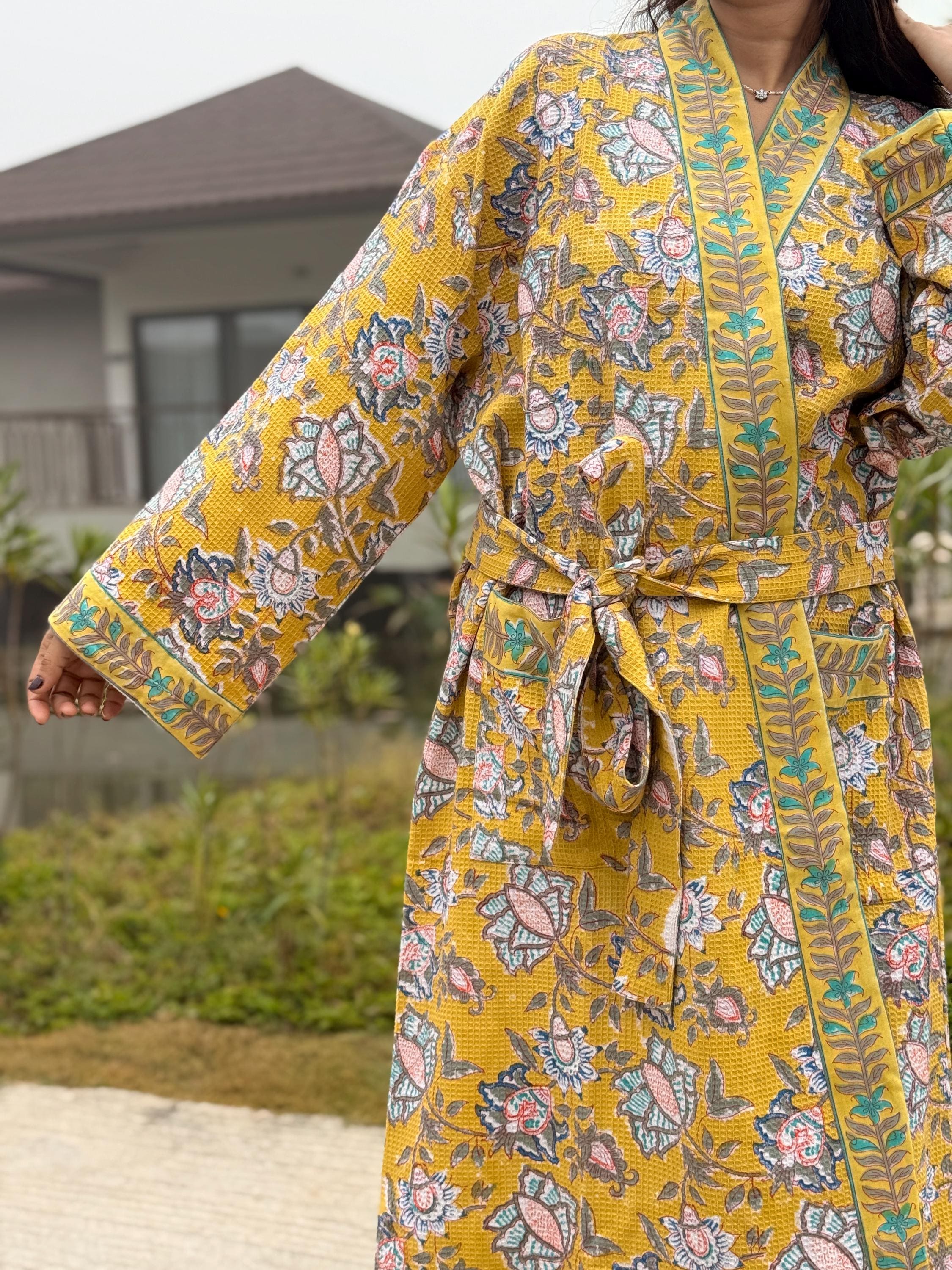 Add warmth and artisanal charm to your daily routine with our Hand Block Printed Waffle Cotton Kimono Bathrobe, beautifully handcrafted by skilled artisans in India. Featuring a rich mustard yellow base with delicate floral motifs and contrast hand-printed borders, this robe is a celebration of traditional craftsmanship and effortless comfort.