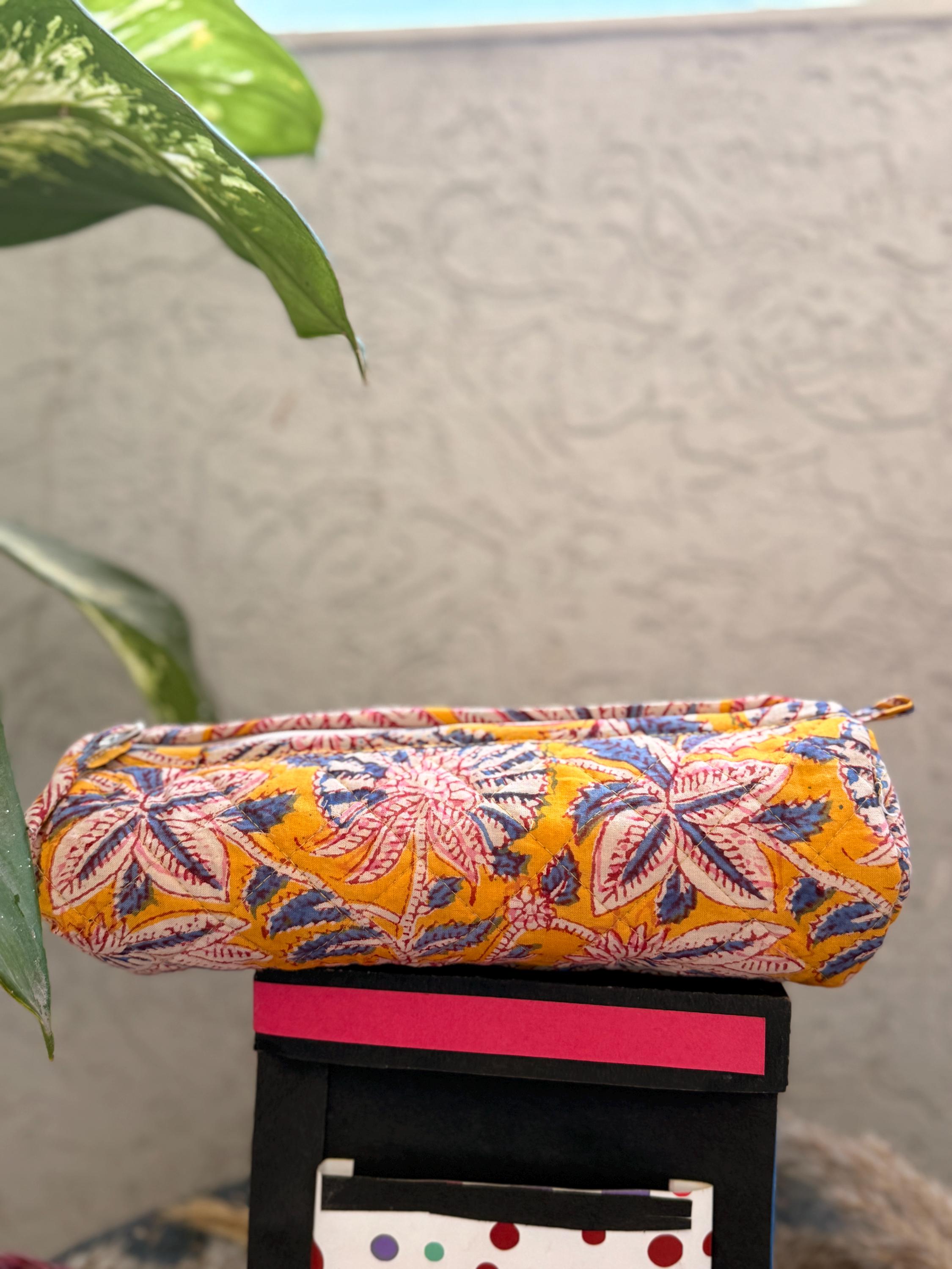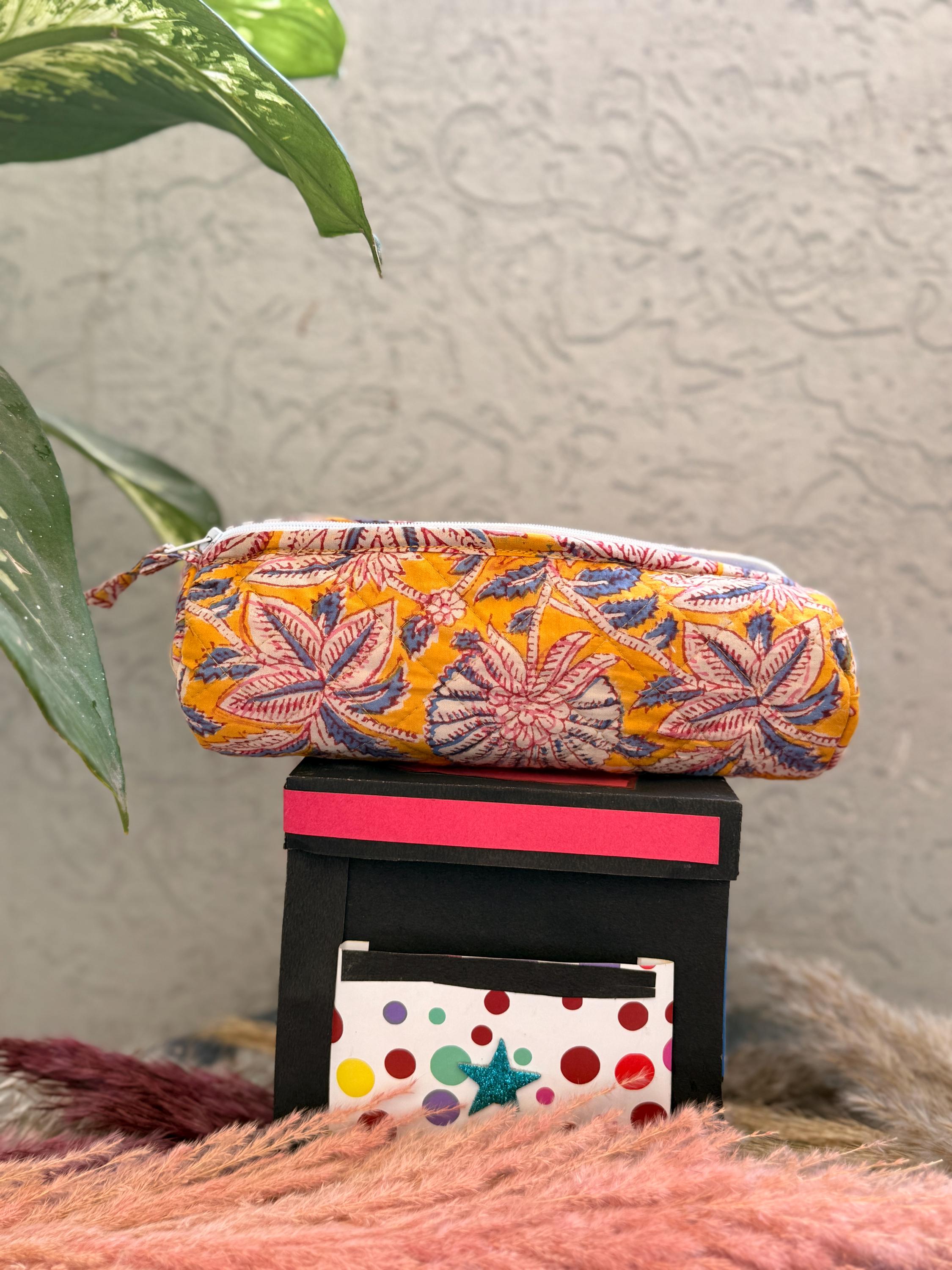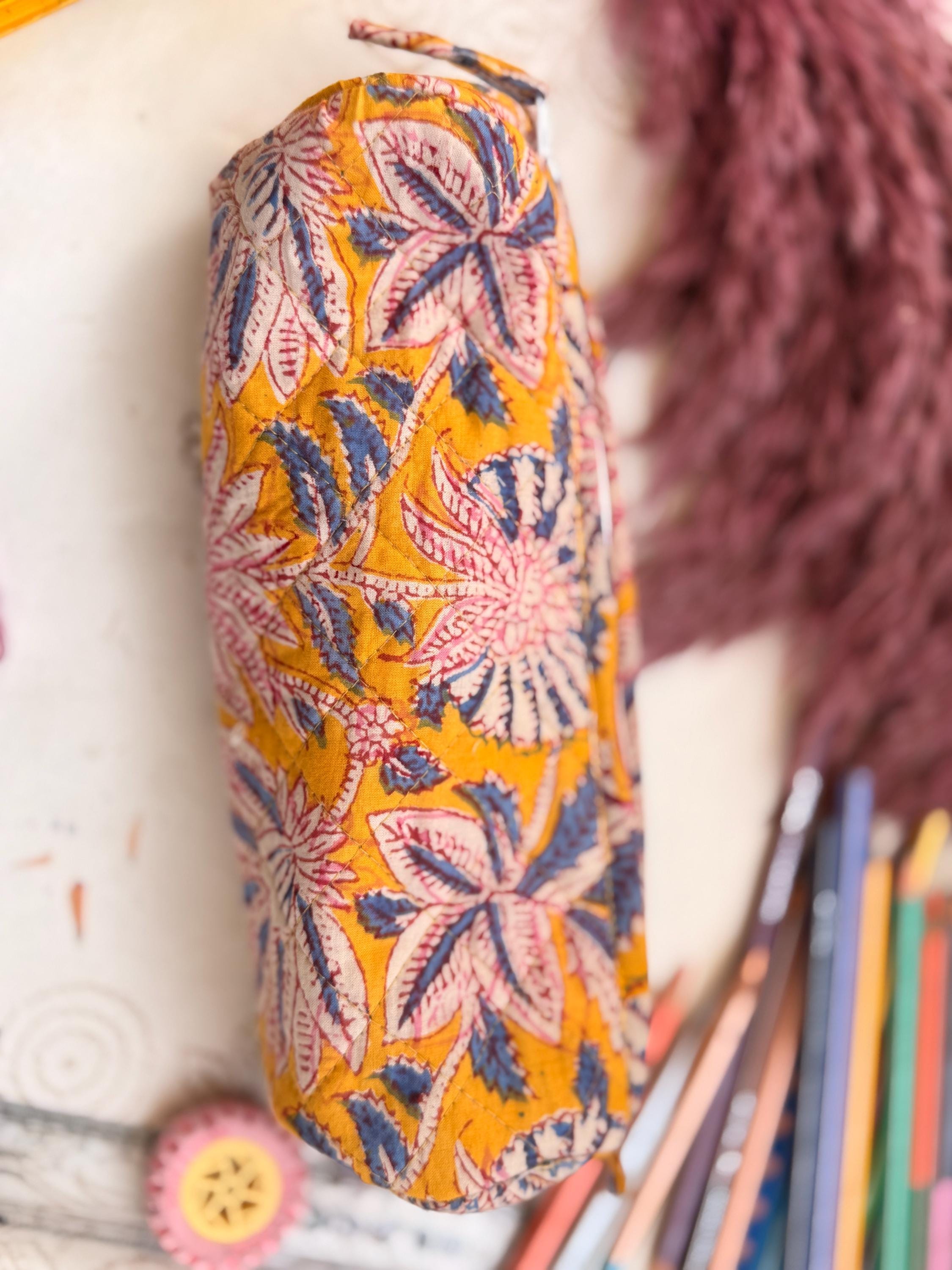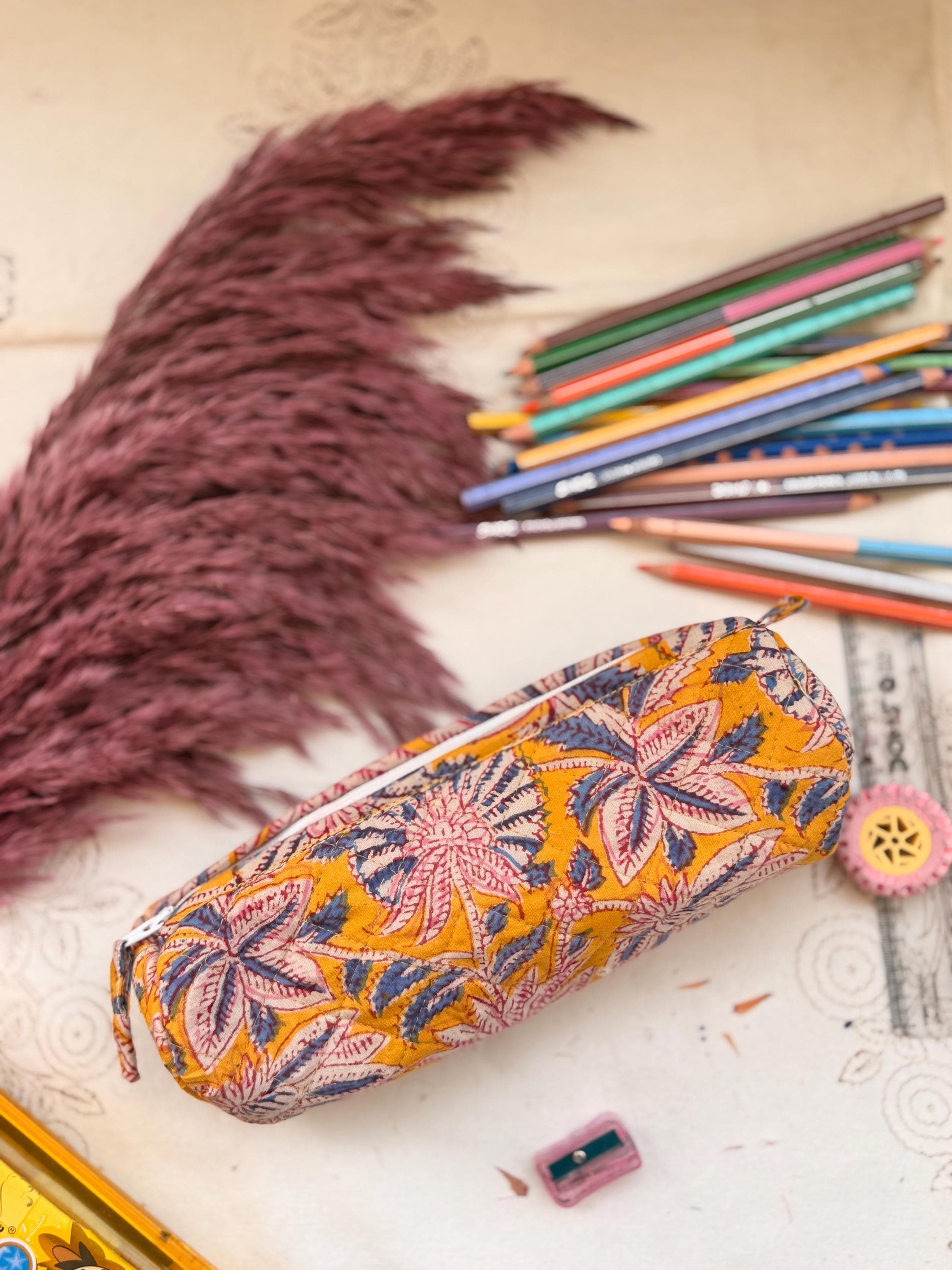 Add a pop of color and artisan charm to your daily essentials with our Hand Block Printed Cotton Pencil Pouch, handcrafted by skilled artisans in India. Featuring a vibrant mustard yellow base with delicate pink and blue floral motifs, this pouch beautifully showcases traditional Indian block printing artistry.