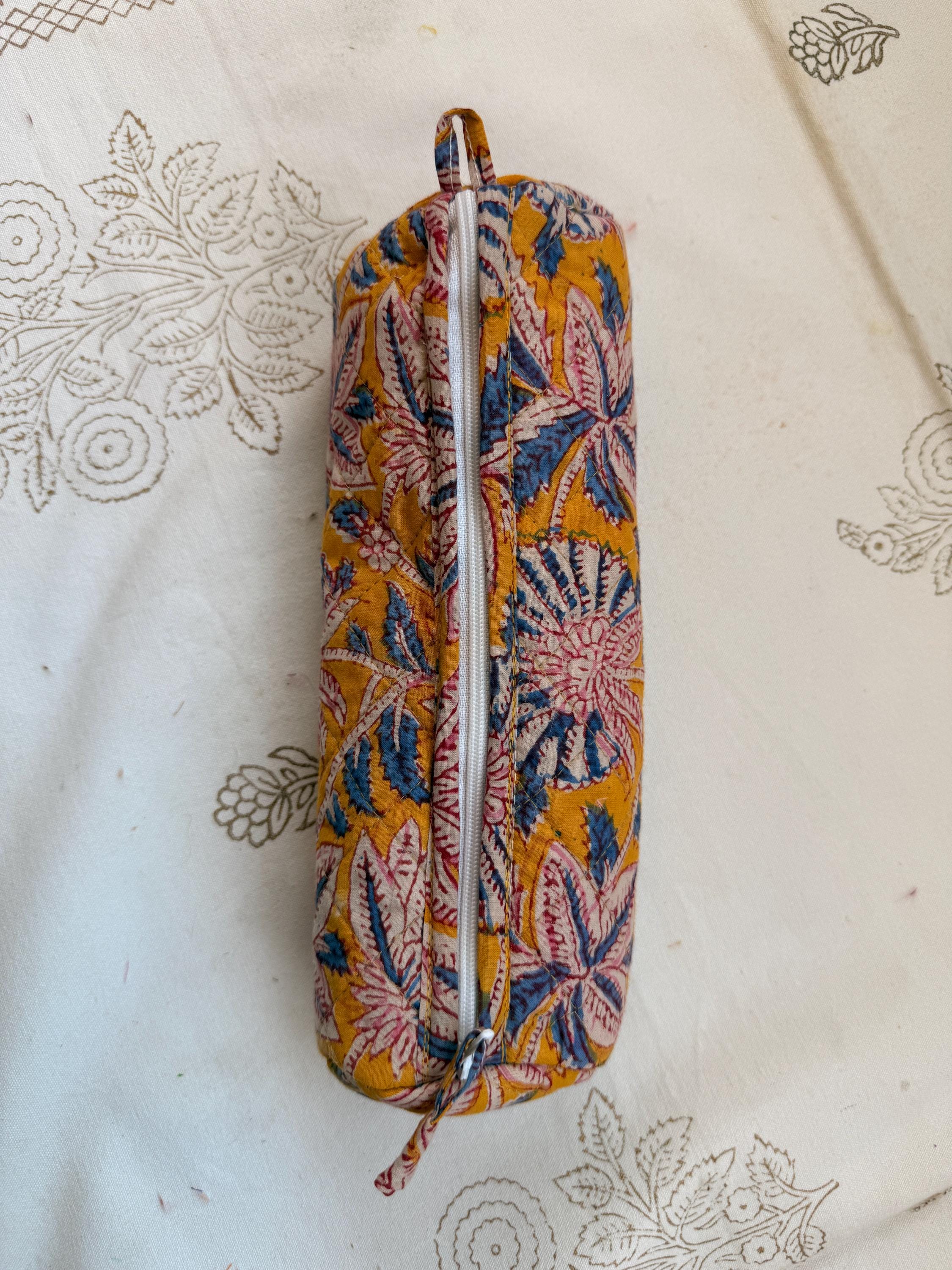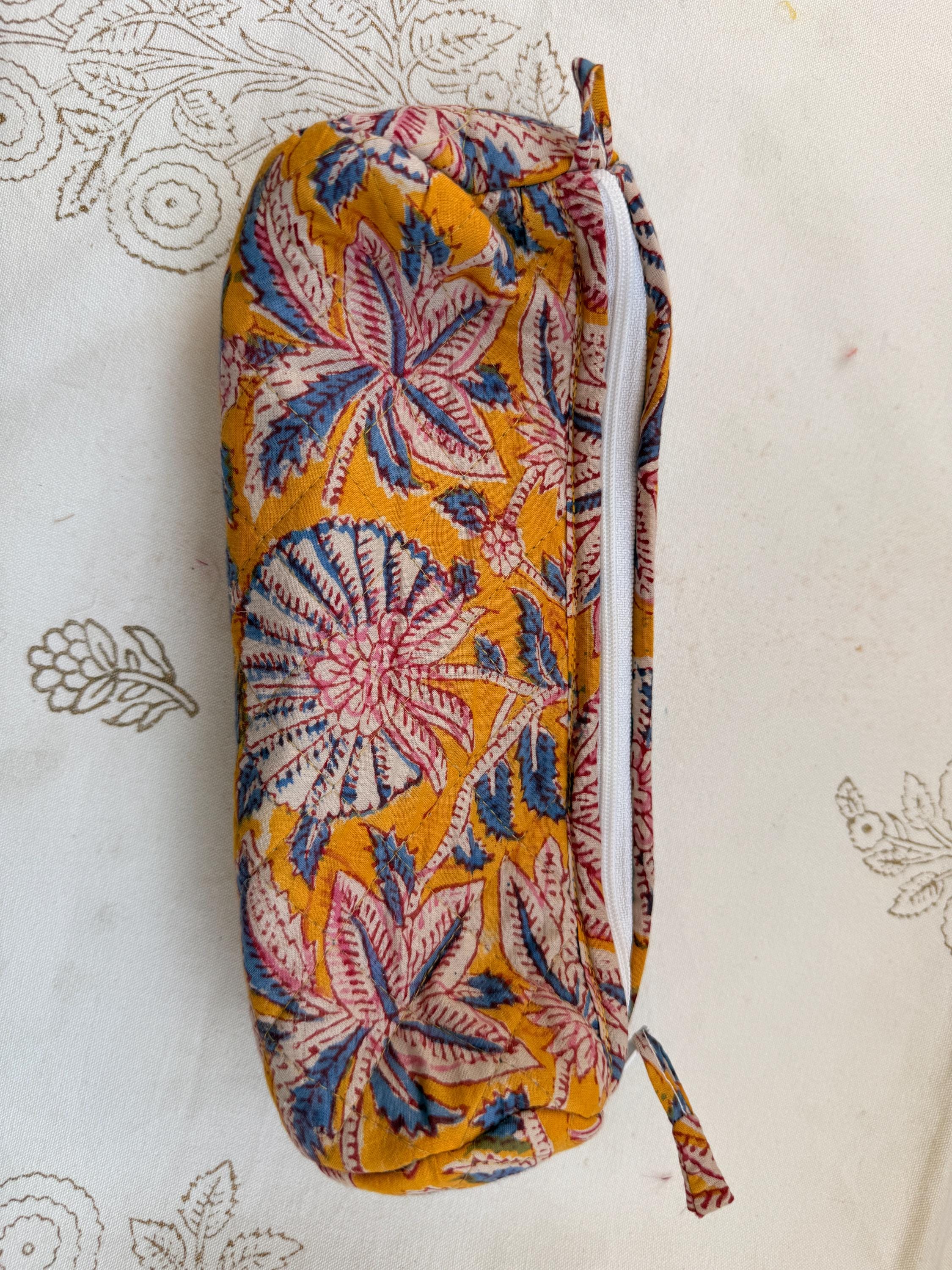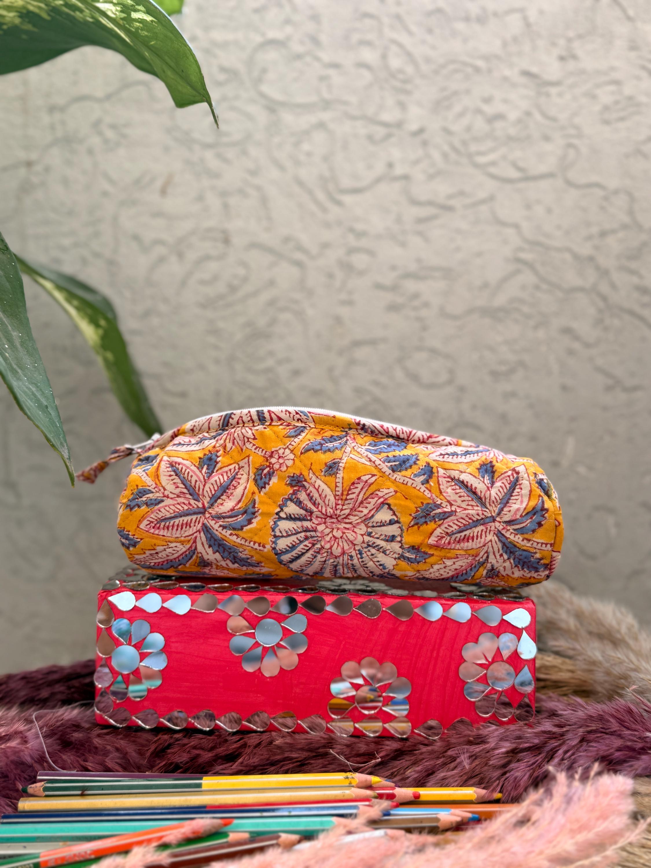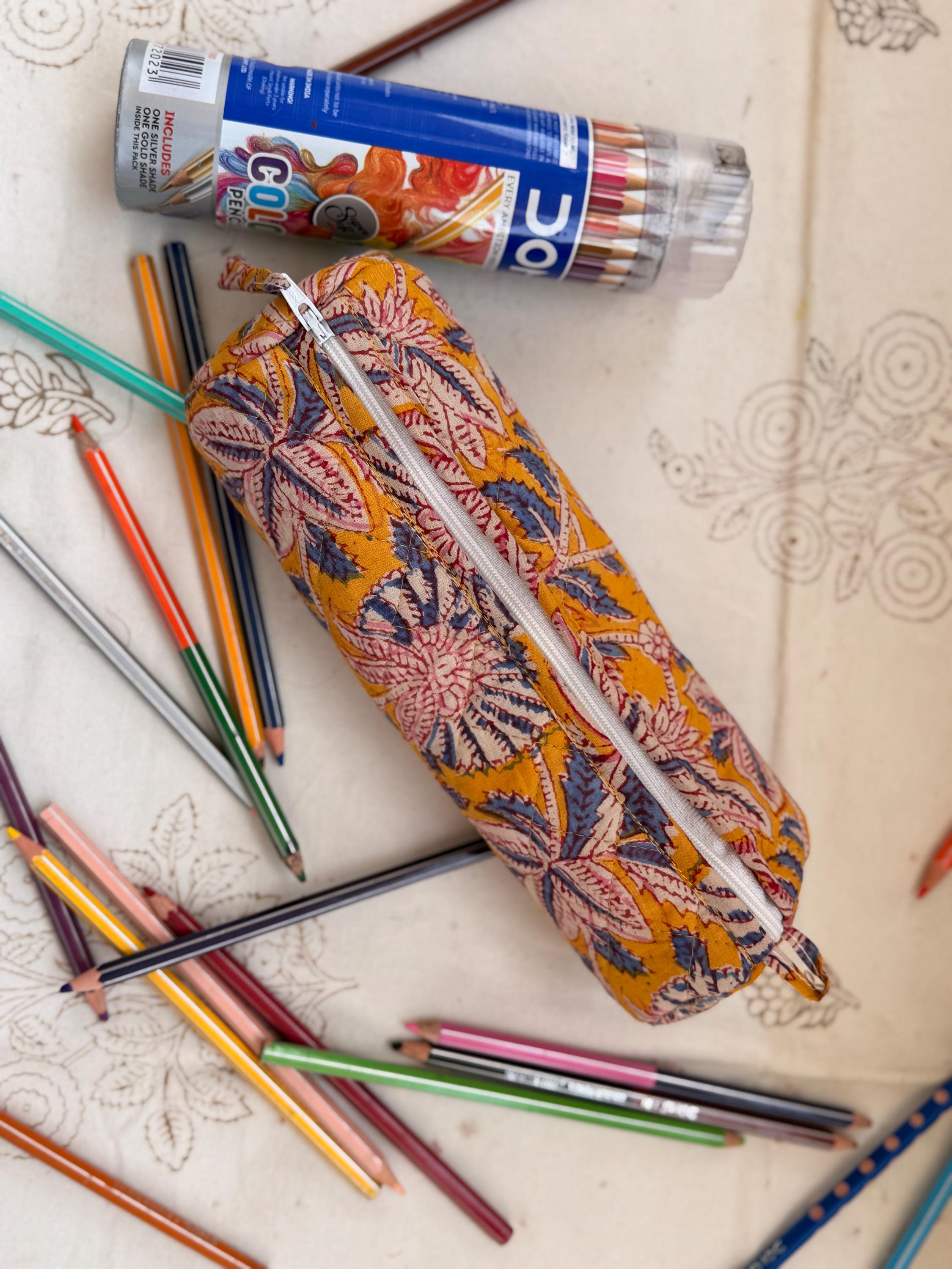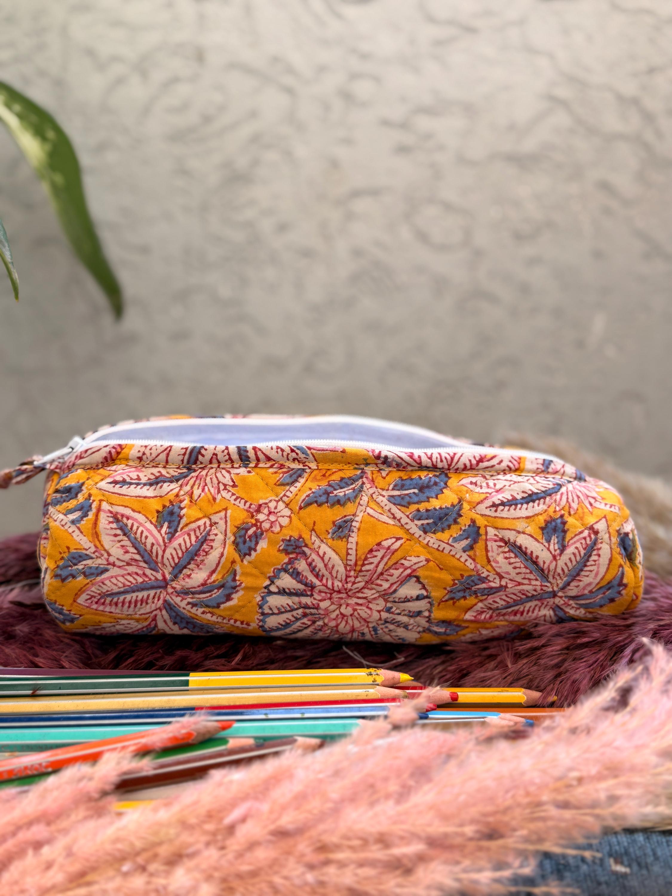 Add a pop of color and artisan charm to your daily essentials with our Hand Block Printed Cotton Pencil Pouch, handcrafted by skilled artisans in India. Featuring a vibrant mustard yellow base with delicate pink and blue floral motifs, this pouch beautifully showcases traditional Indian block printing artistry.