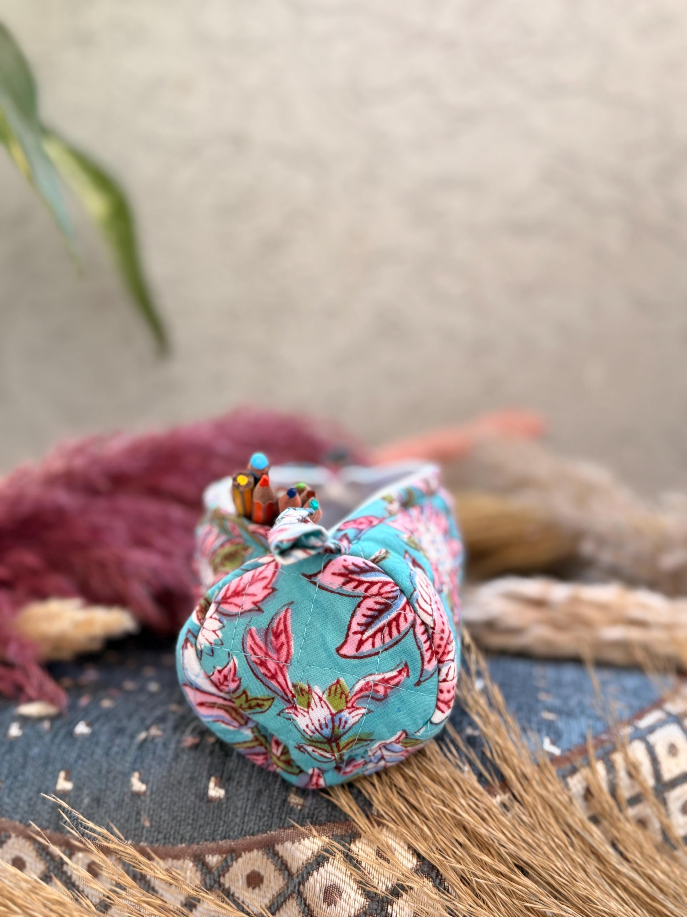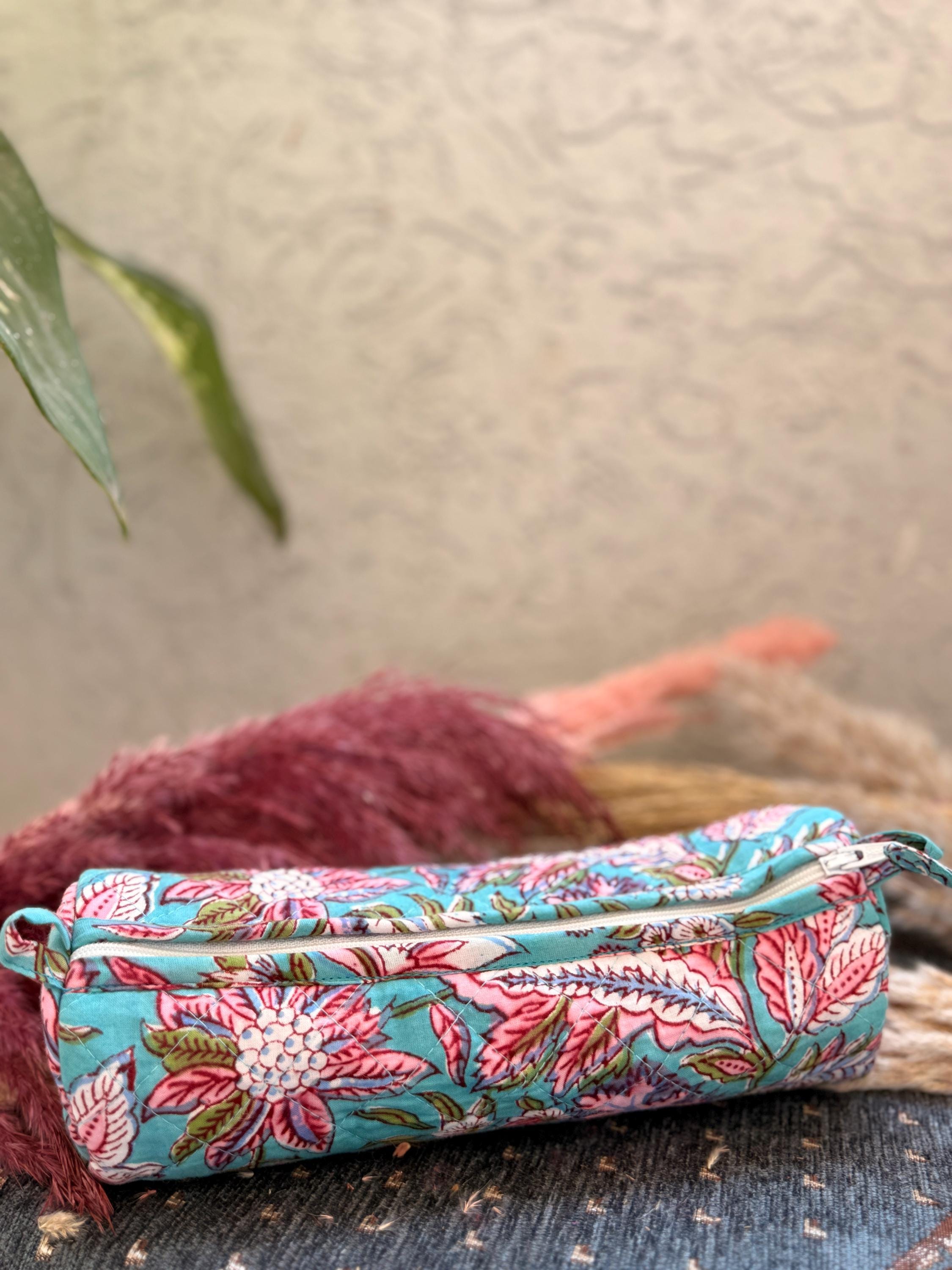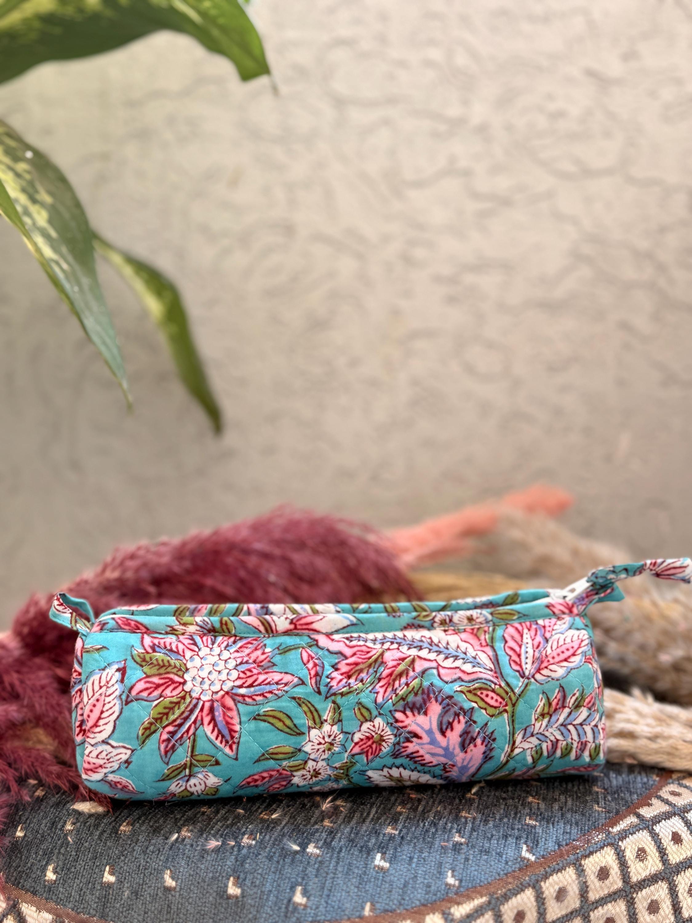 Each piece is individually hand block printed, making every pouch truly unique. Slight variations in print and color are natural and celebrate the authenticity of handmade craftsmanship.