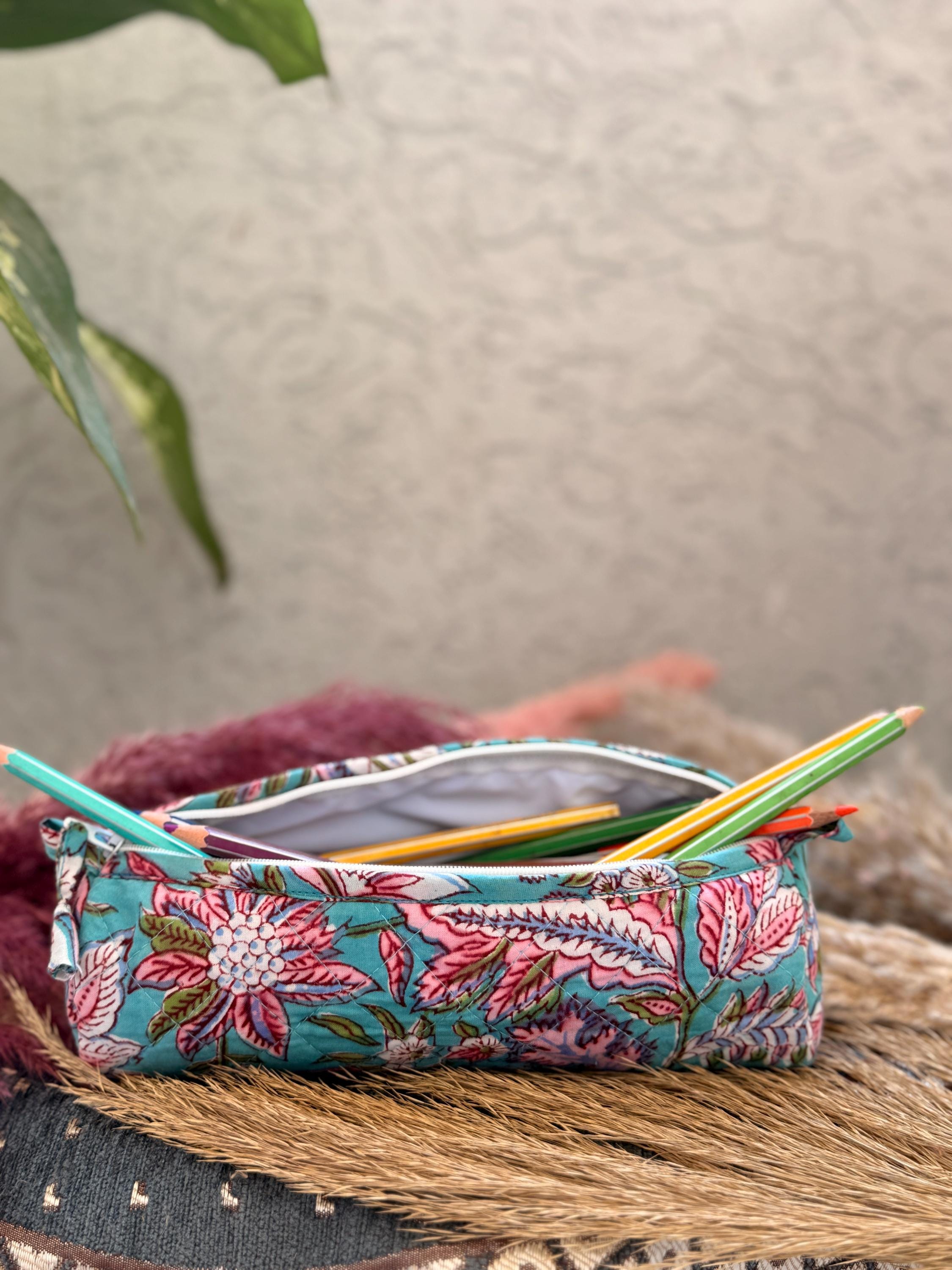 Hand Block Print Cotton Pencil Case, Handmade Zipper Pencil Bag, Stationery Pouch, Eco Friendly School Supplies Organizer