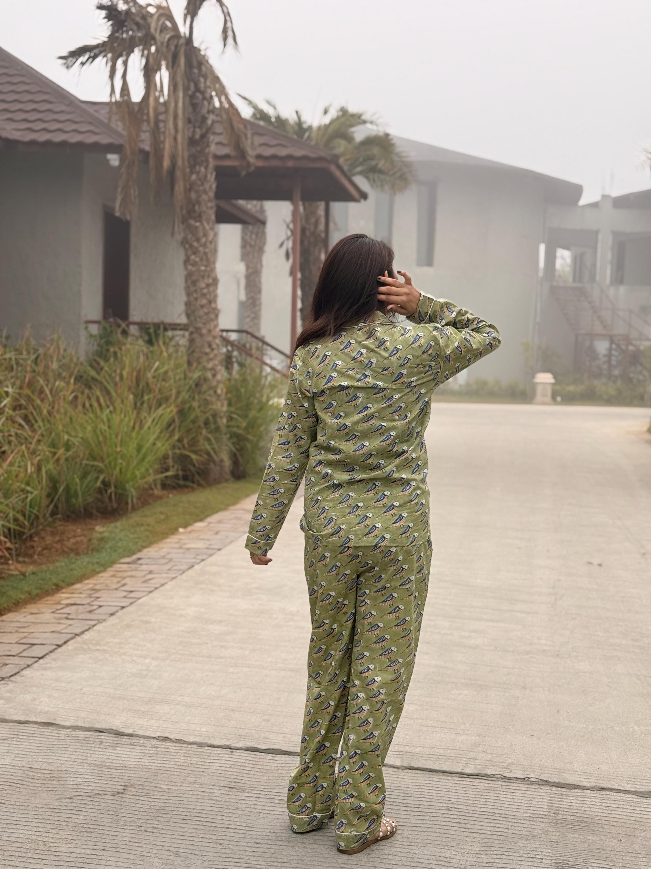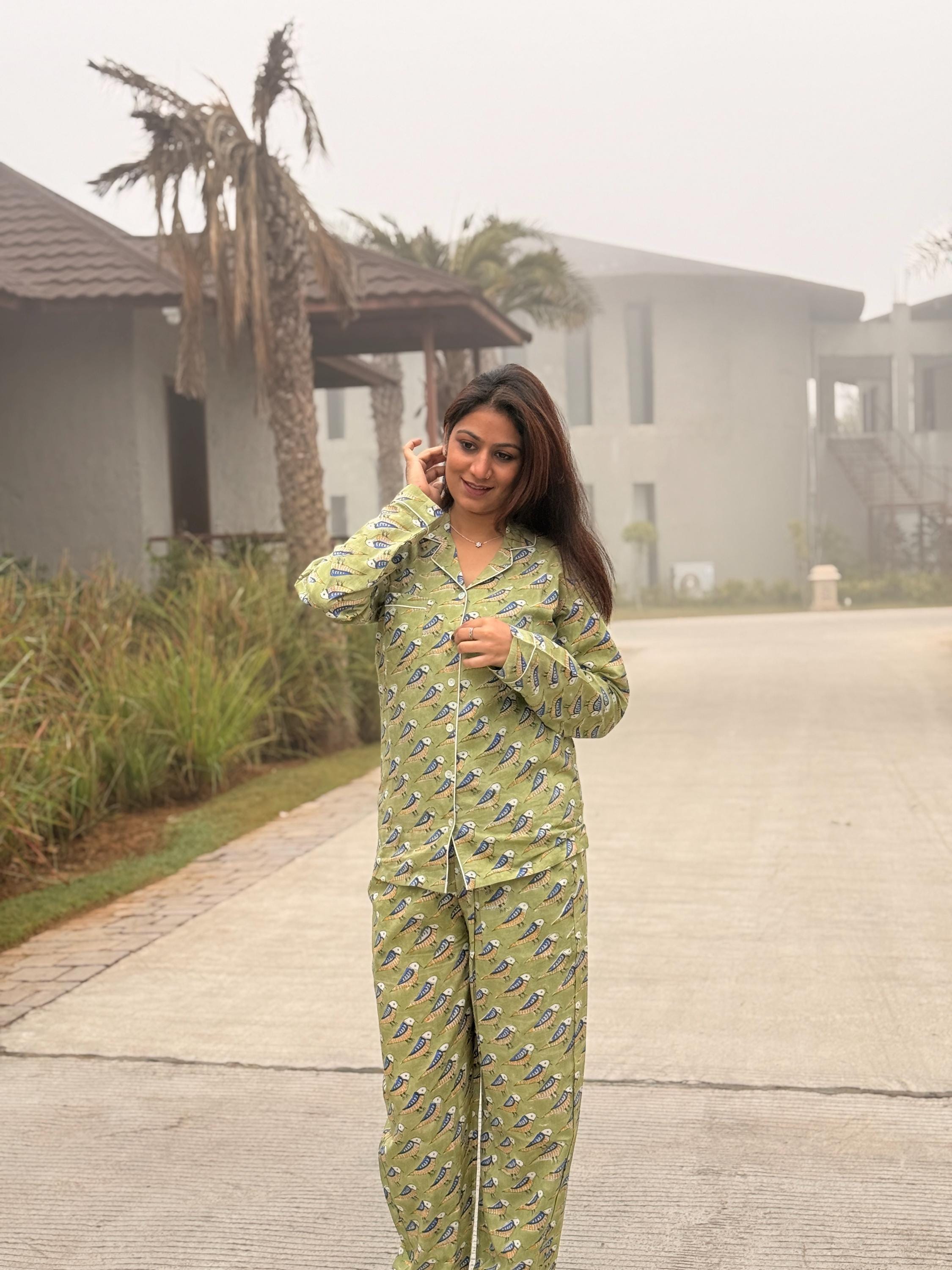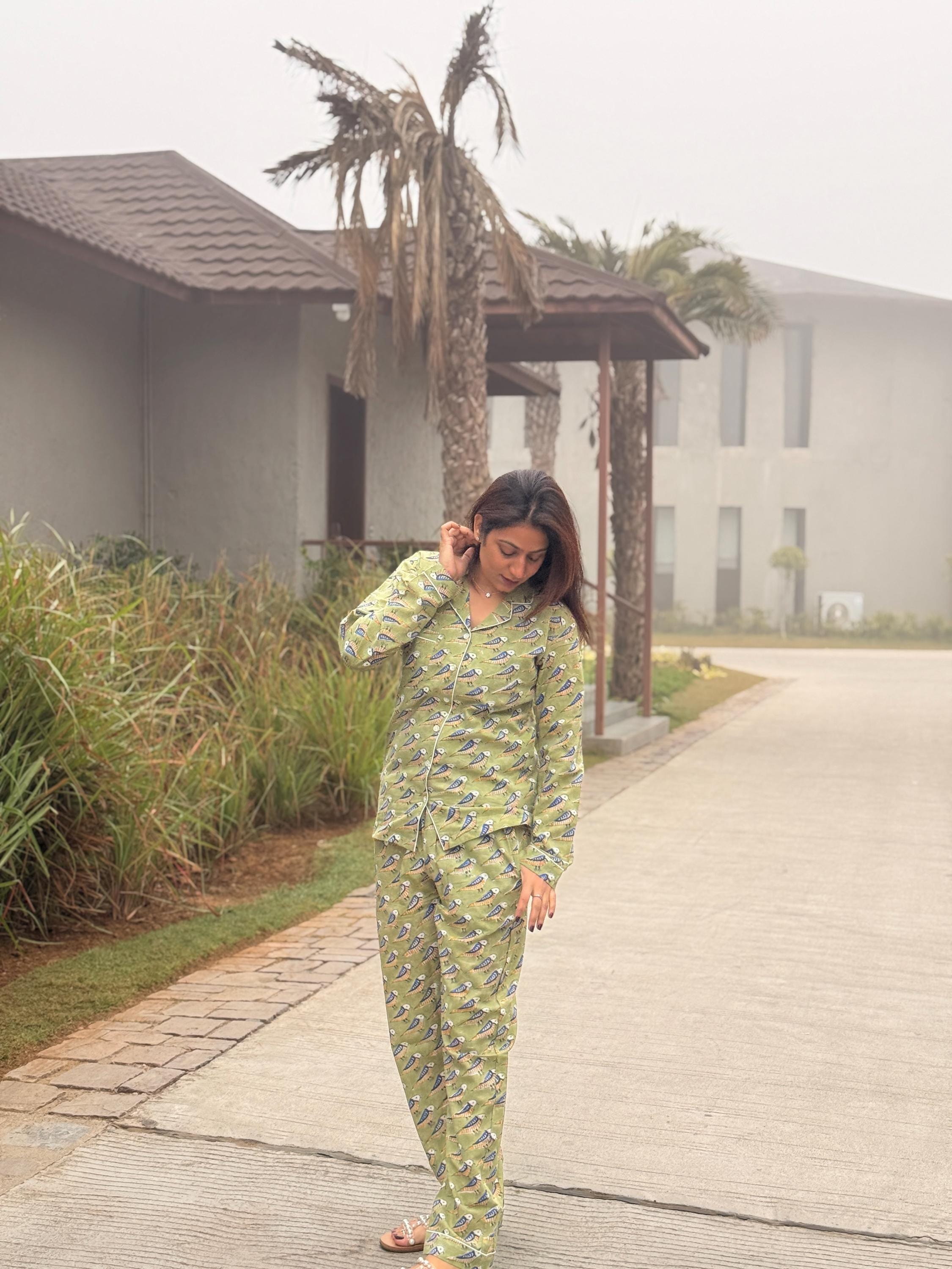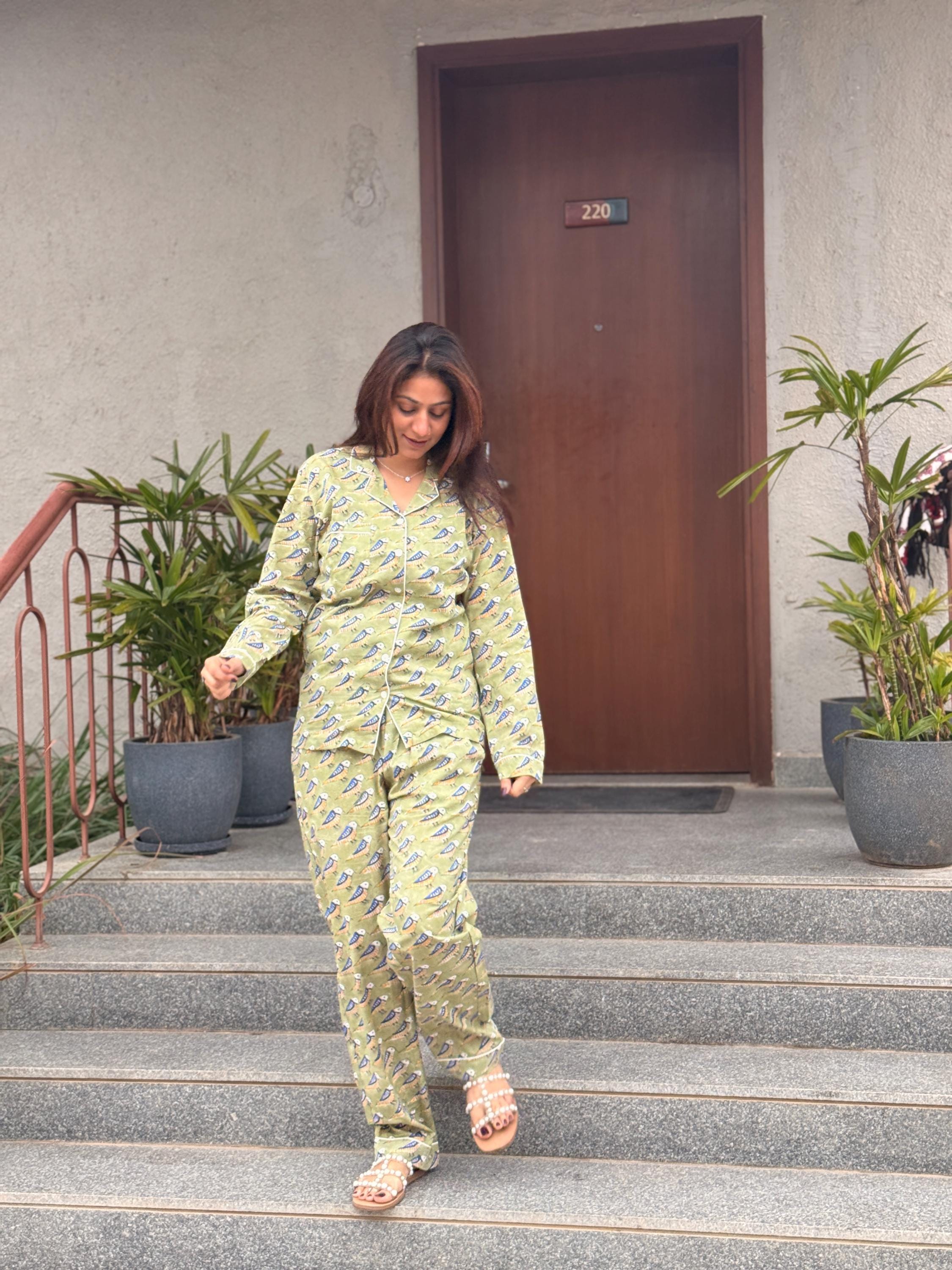 Crafted from soft, breathable cotton, the set includes a button-down long-sleeve top paired with easy-fit pajama pants, making it perfect for sleeping, lounging, or relaxed home wear. The soothing green base with delicate all-over block print motifs gives the night suit a fresh, calming look that feels light on the skin—ideal for all seasons.