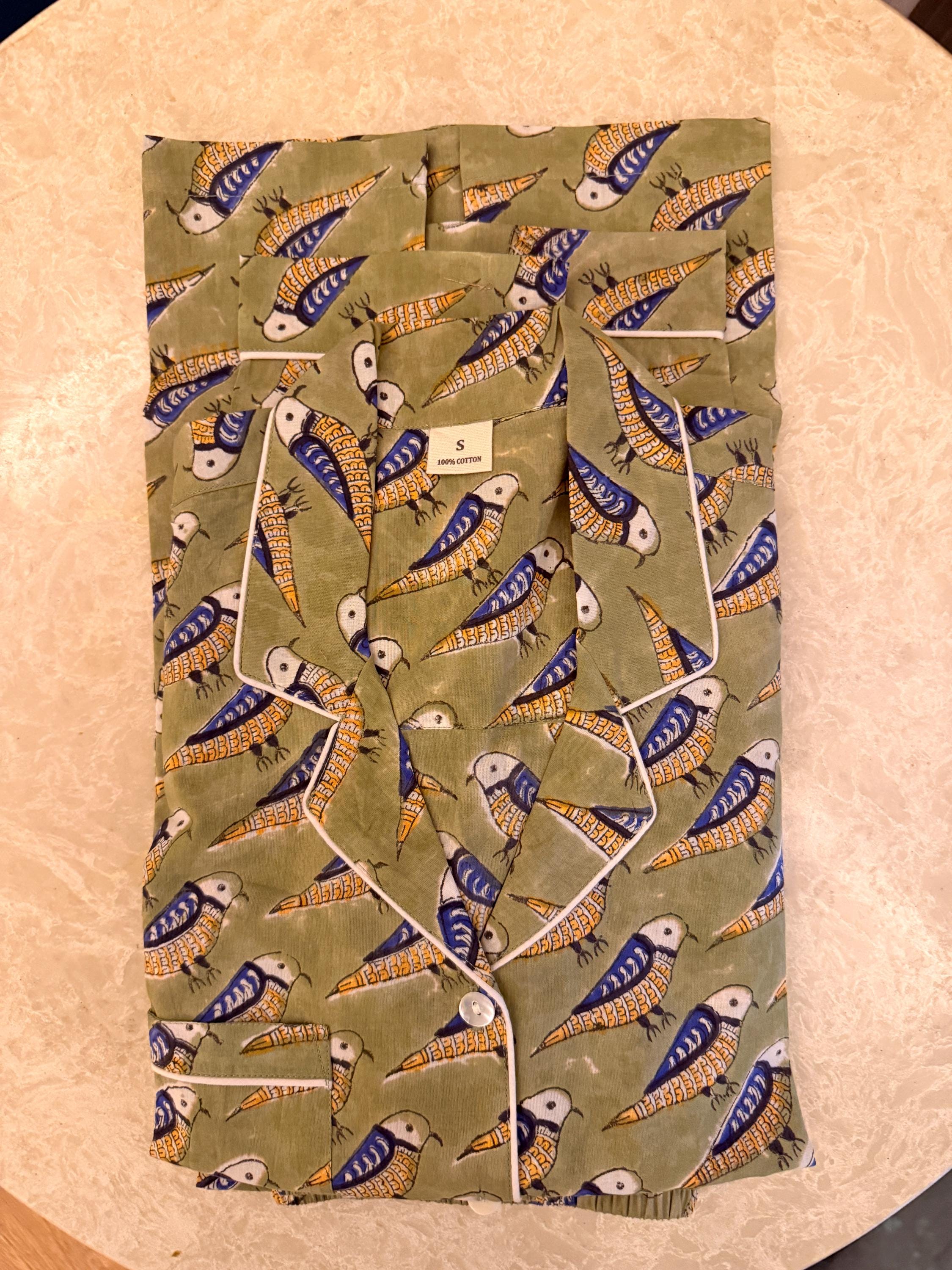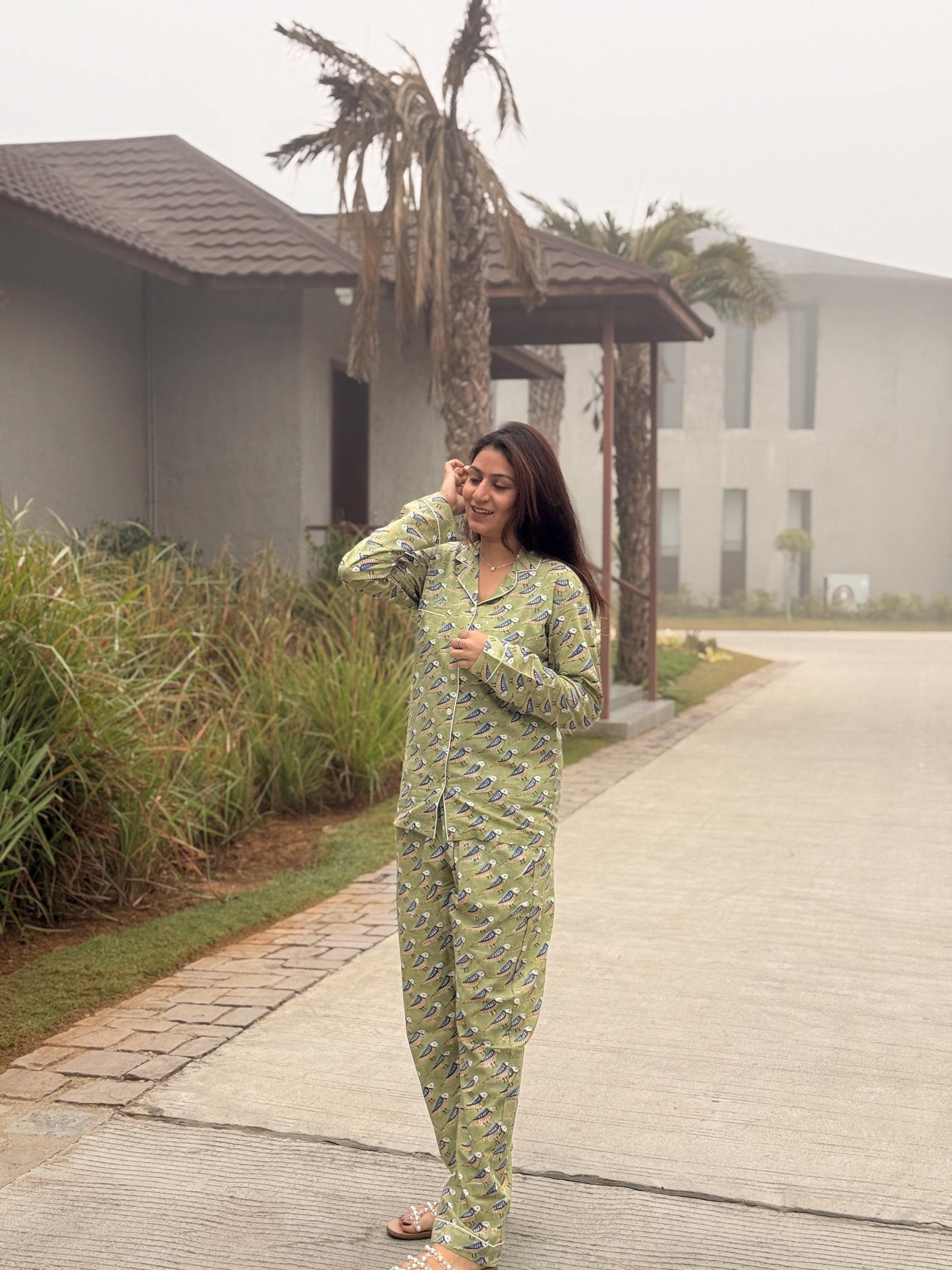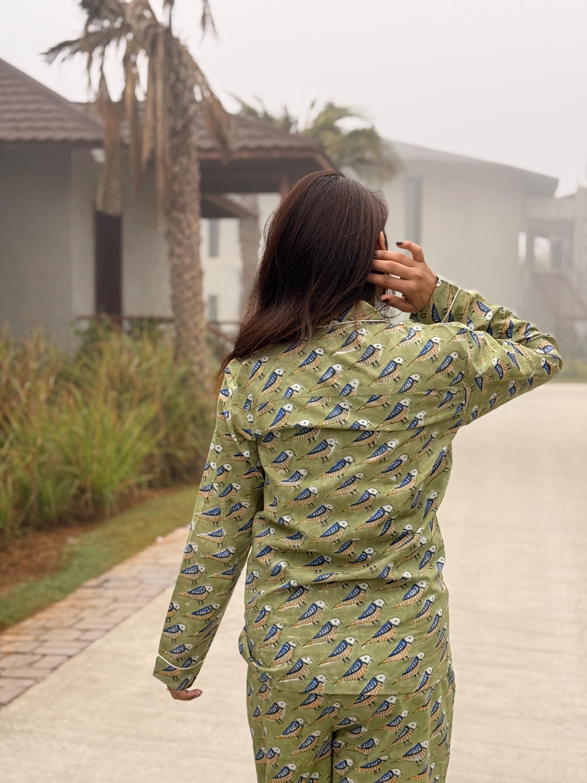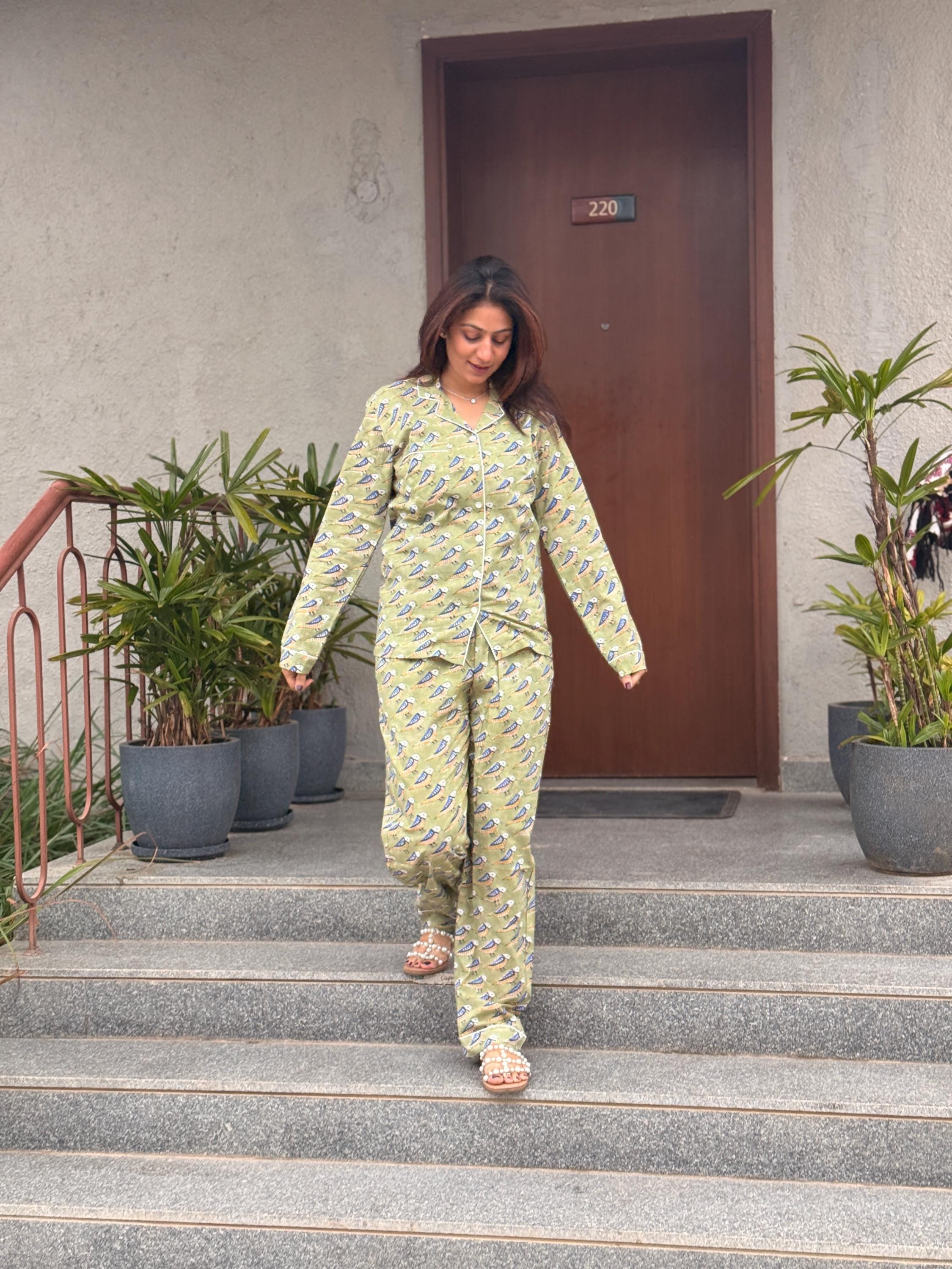 Crafted from soft, breathable cotton, the set includes a button-down long-sleeve top paired with easy-fit pajama pants, making it perfect for sleeping, lounging, or relaxed home wear. The soothing green base with delicate all-over block print motifs gives the night suit a fresh, calming look that feels light on the skin—ideal for all seasons.