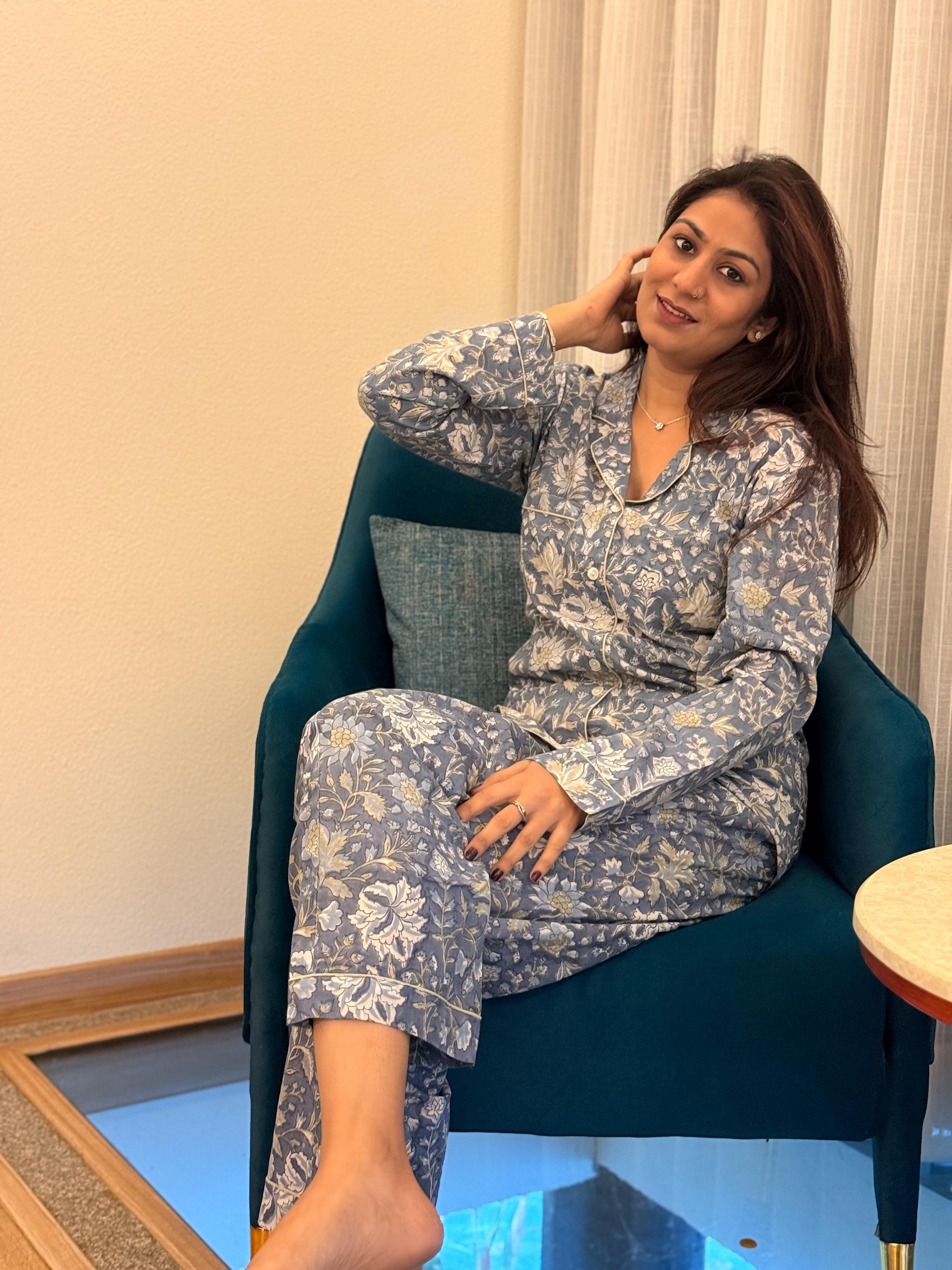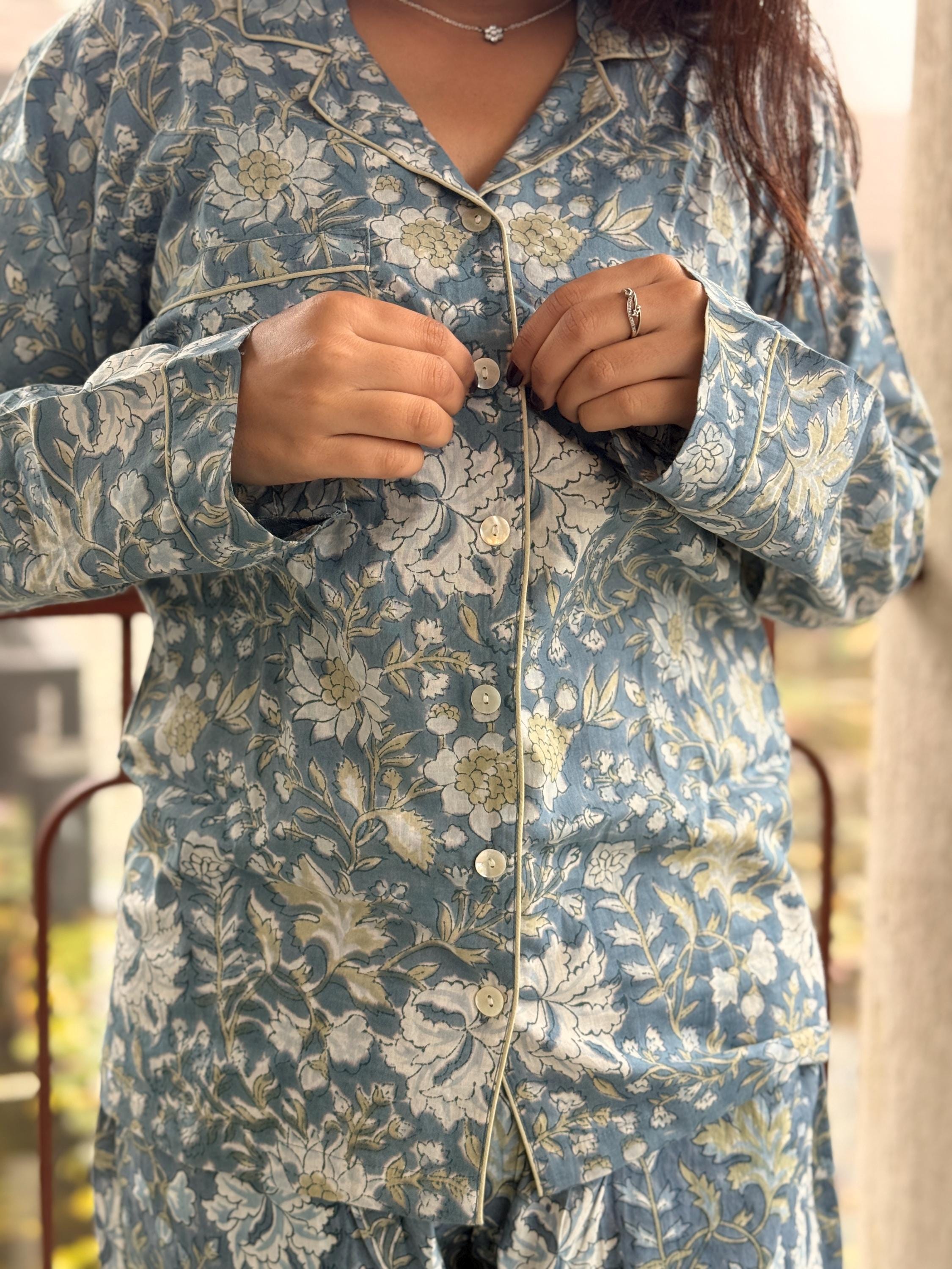 Made from soft, breathable 100% cotton, the night suit features a button-down long-sleeve shirt paired with relaxed-fit pajama pants. The soothing sage grey base with delicate white & mustard floral block print creates a calm, elegant look—perfect for unwinding after a long day.