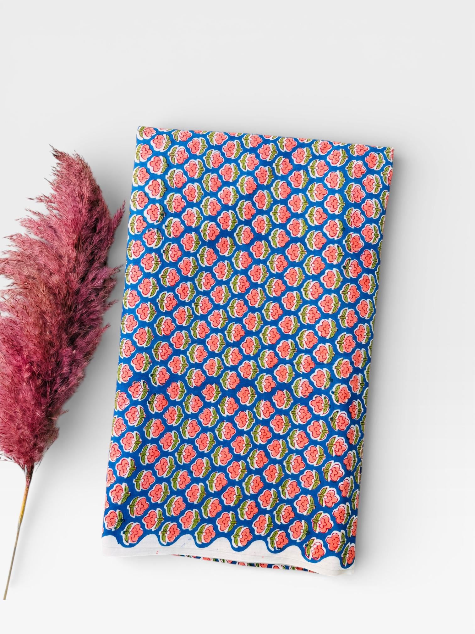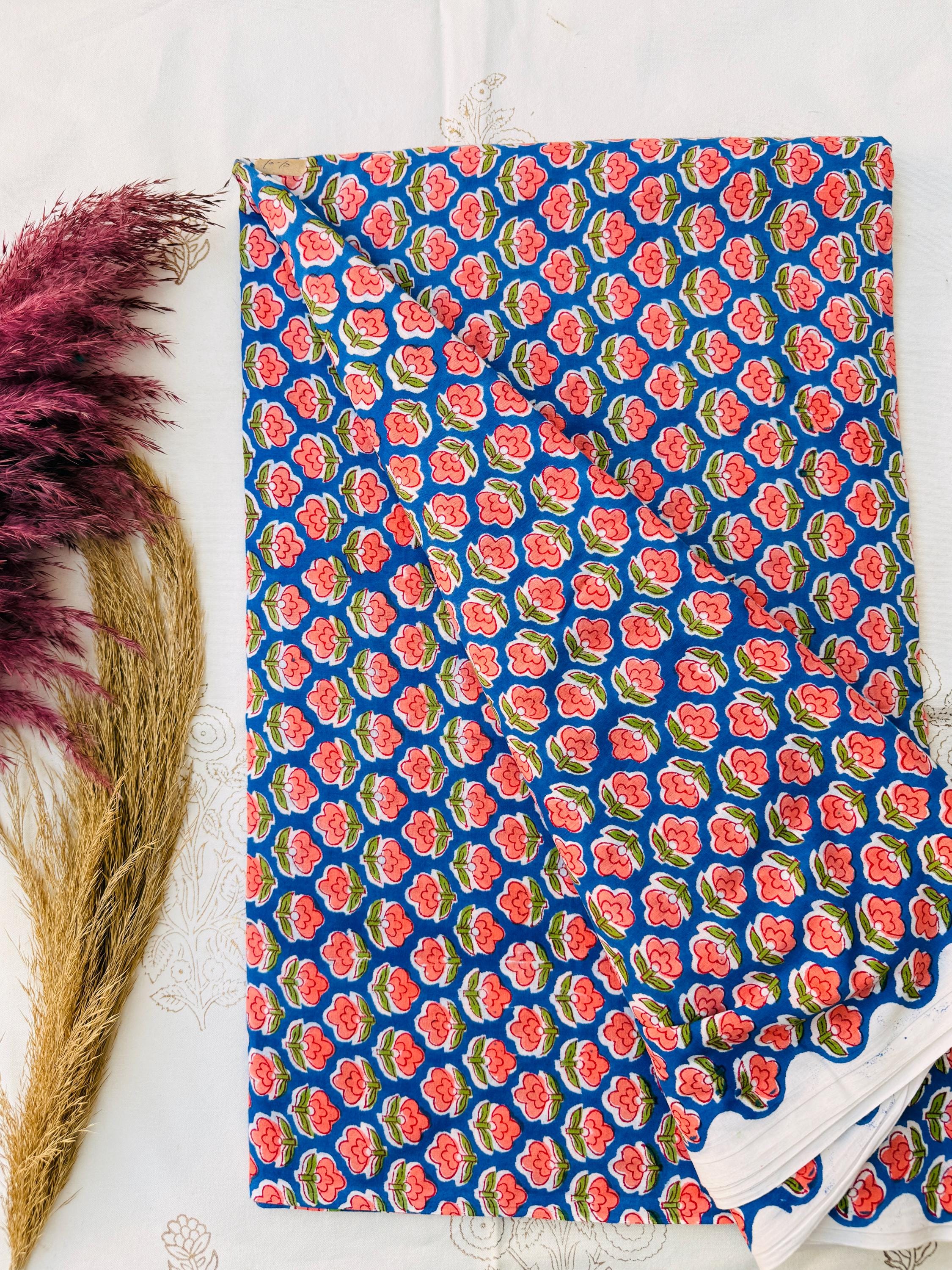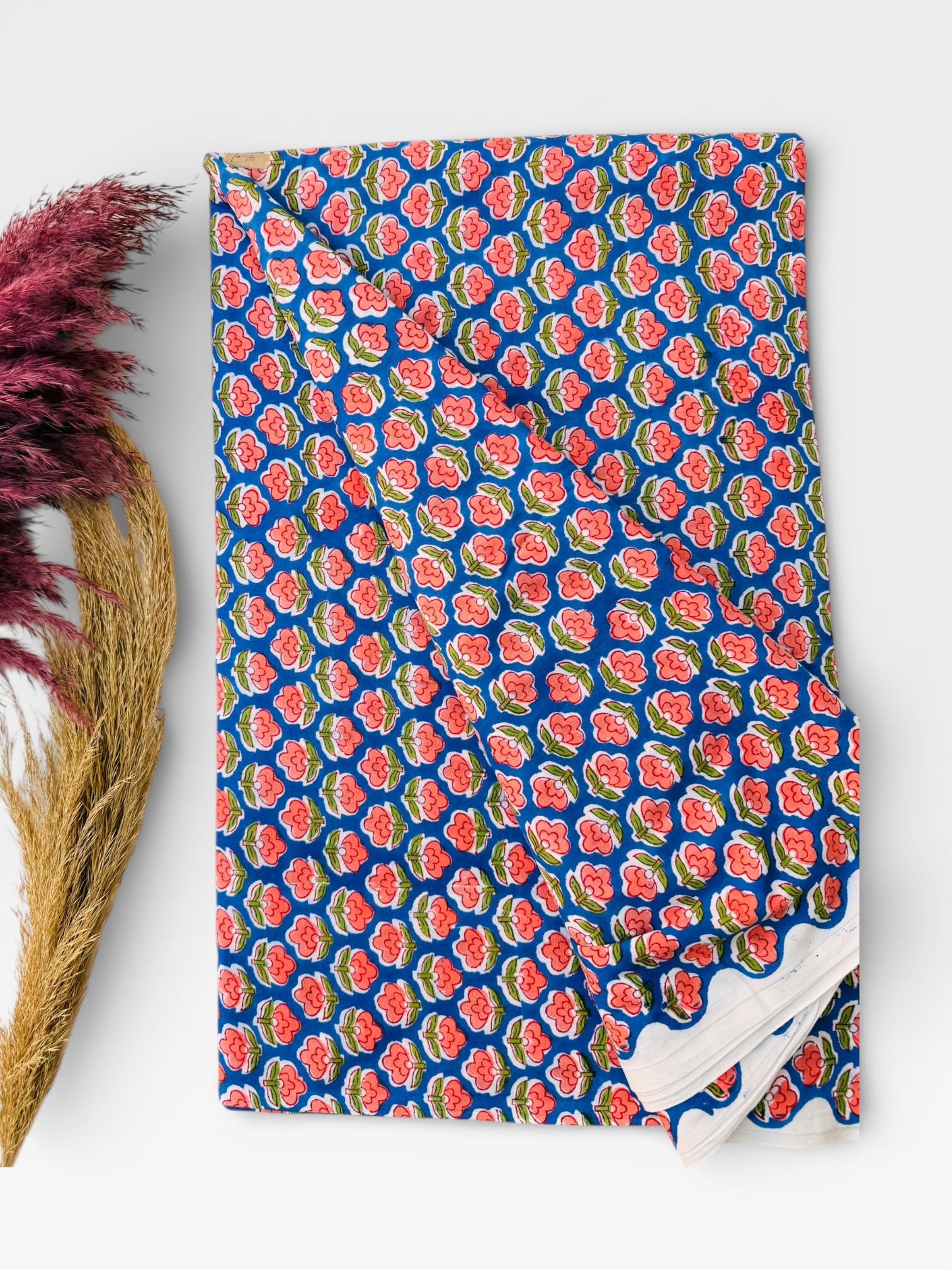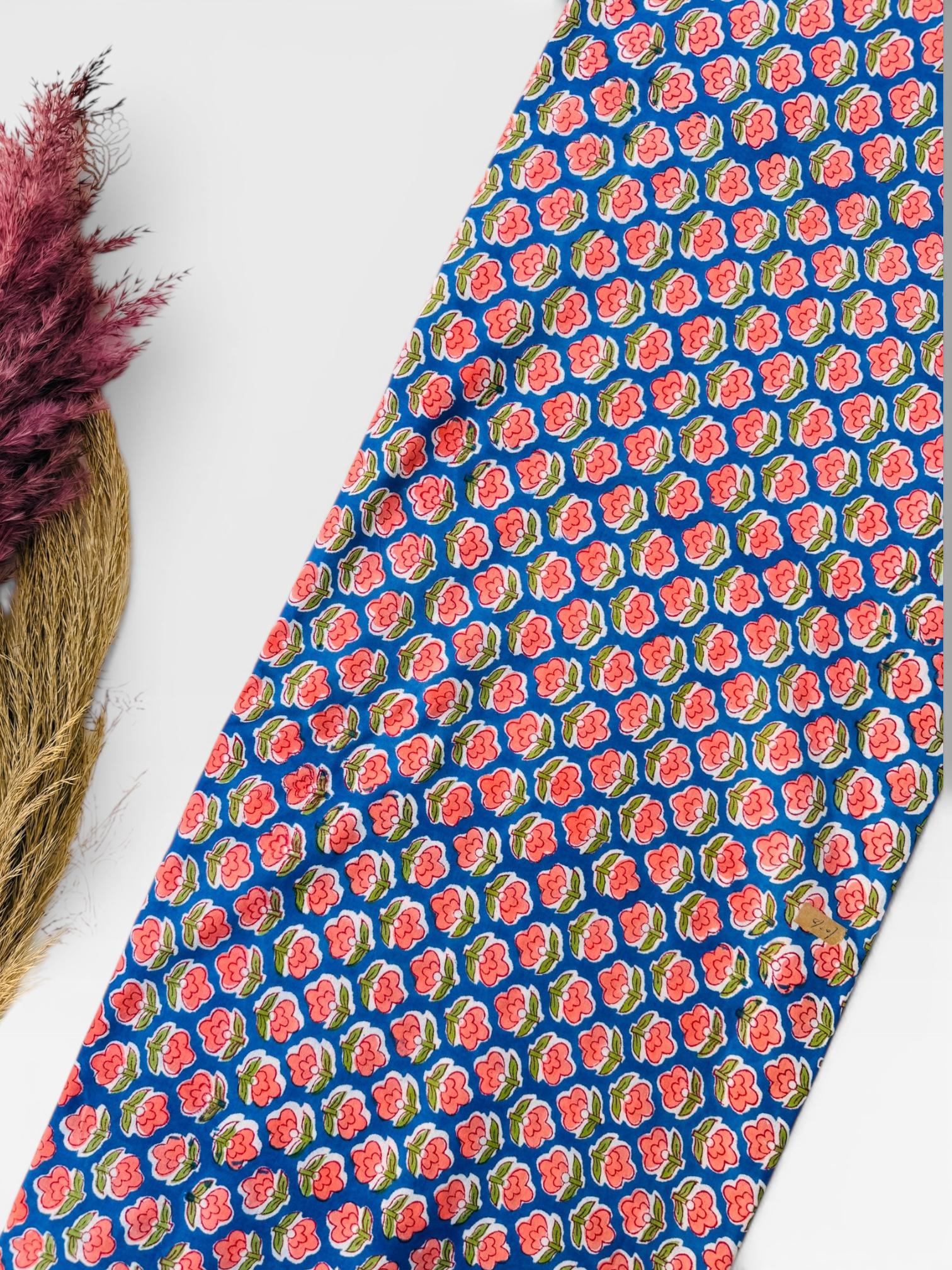 Bring timeless Indian craftsmanship into your creative projects with this Hand Block Printed Cotton Running Fabric. Printed by skilled artisans using traditional wooden blocks, this fabric features a charming pink floral motif on a vibrant blue base, inspired by classic Jaipur block print designs.