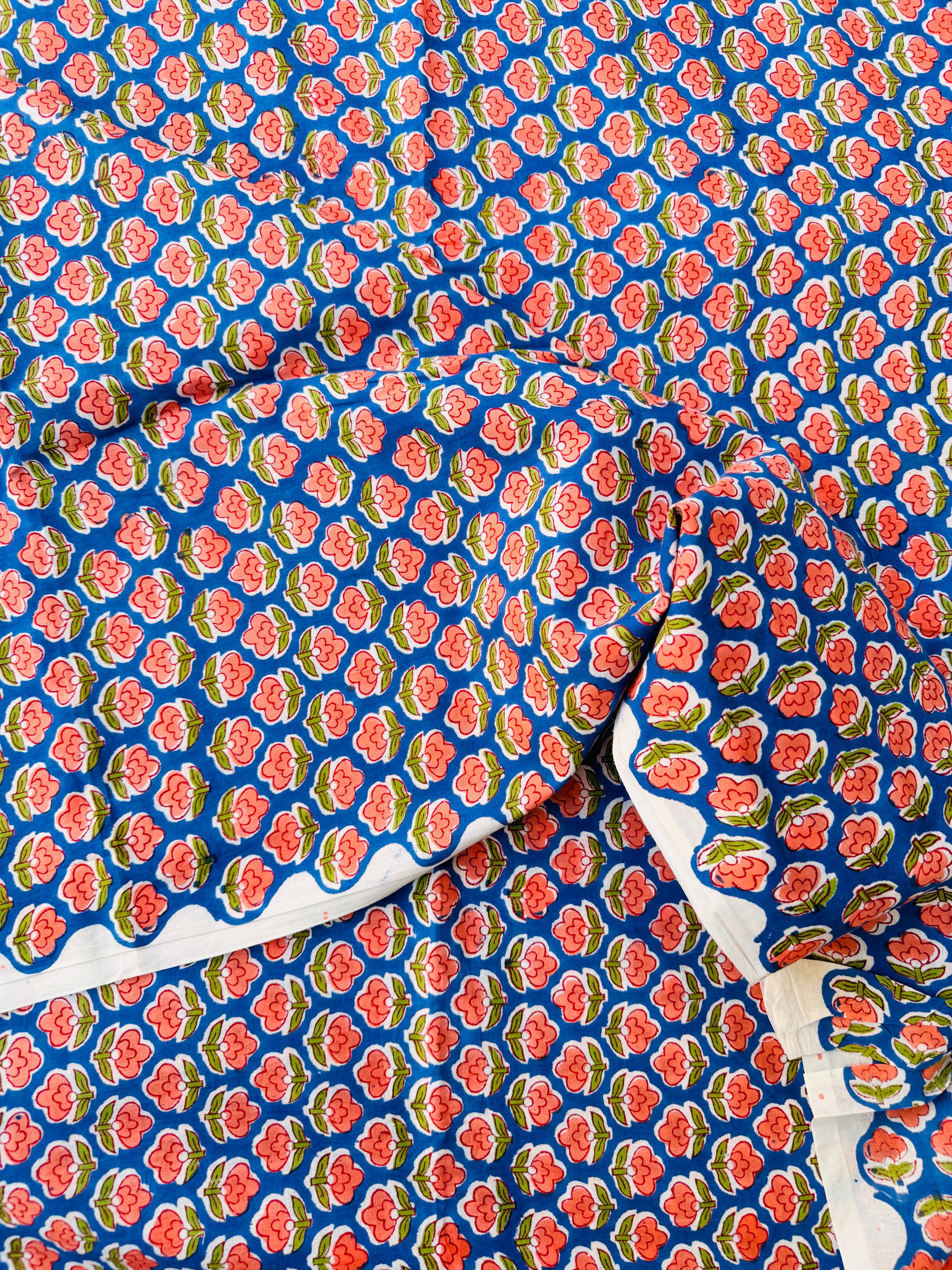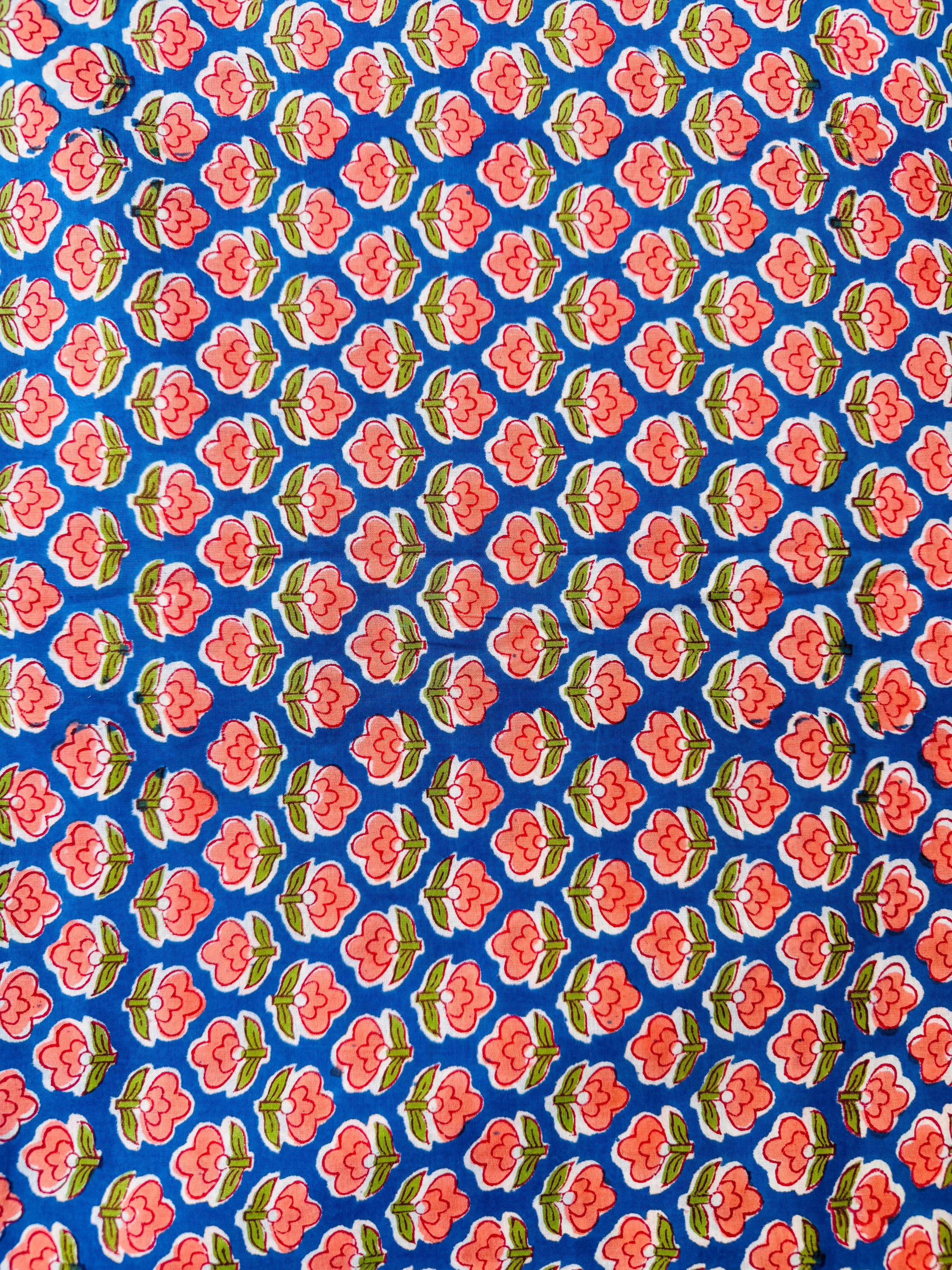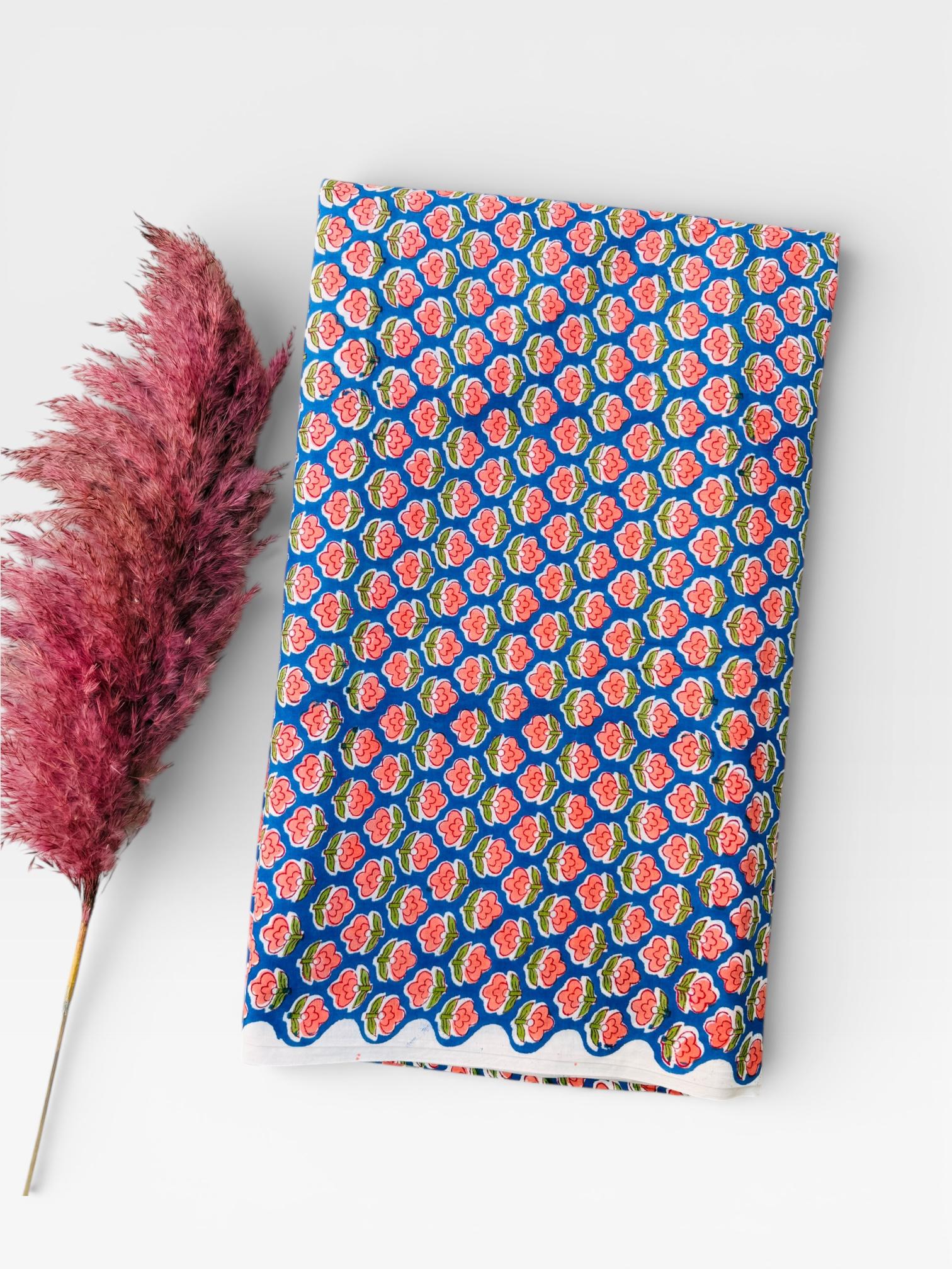 Bring timeless Indian craftsmanship into your creative projects with this Hand Block Printed Cotton Running Fabric. Printed by skilled artisans using traditional wooden blocks, this fabric features a charming pink floral motif on a vibrant blue base, inspired by classic Jaipur block print designs.