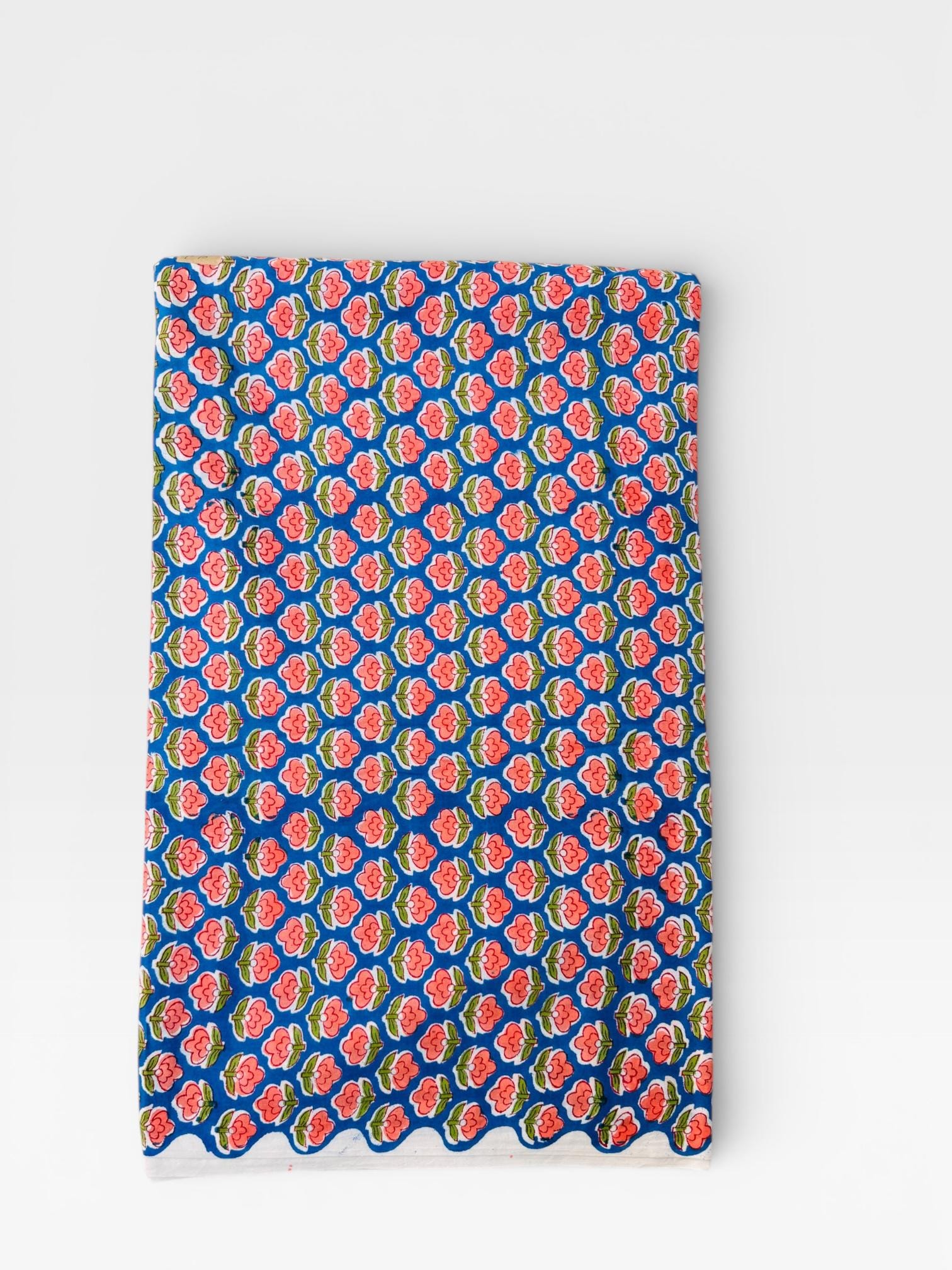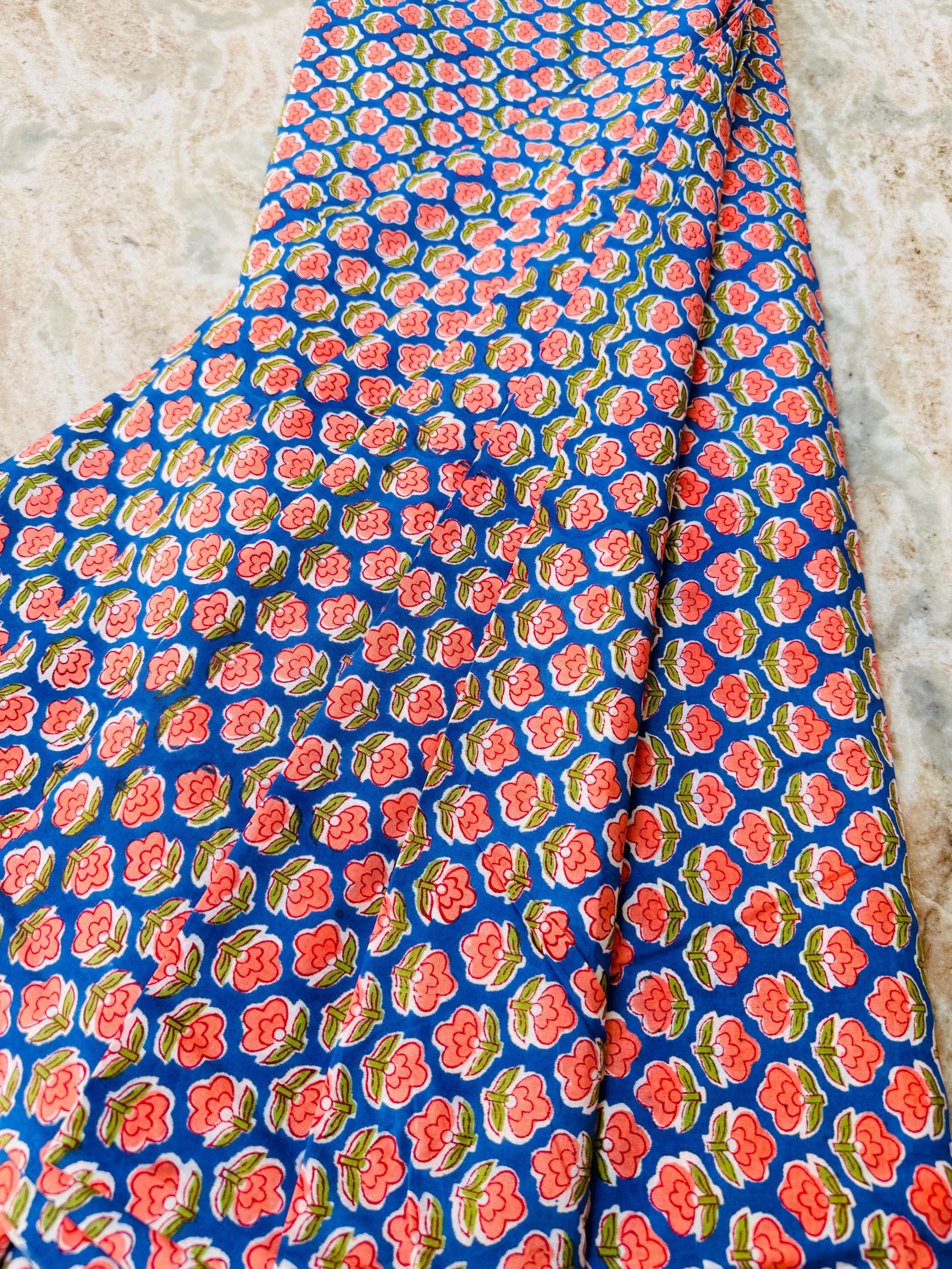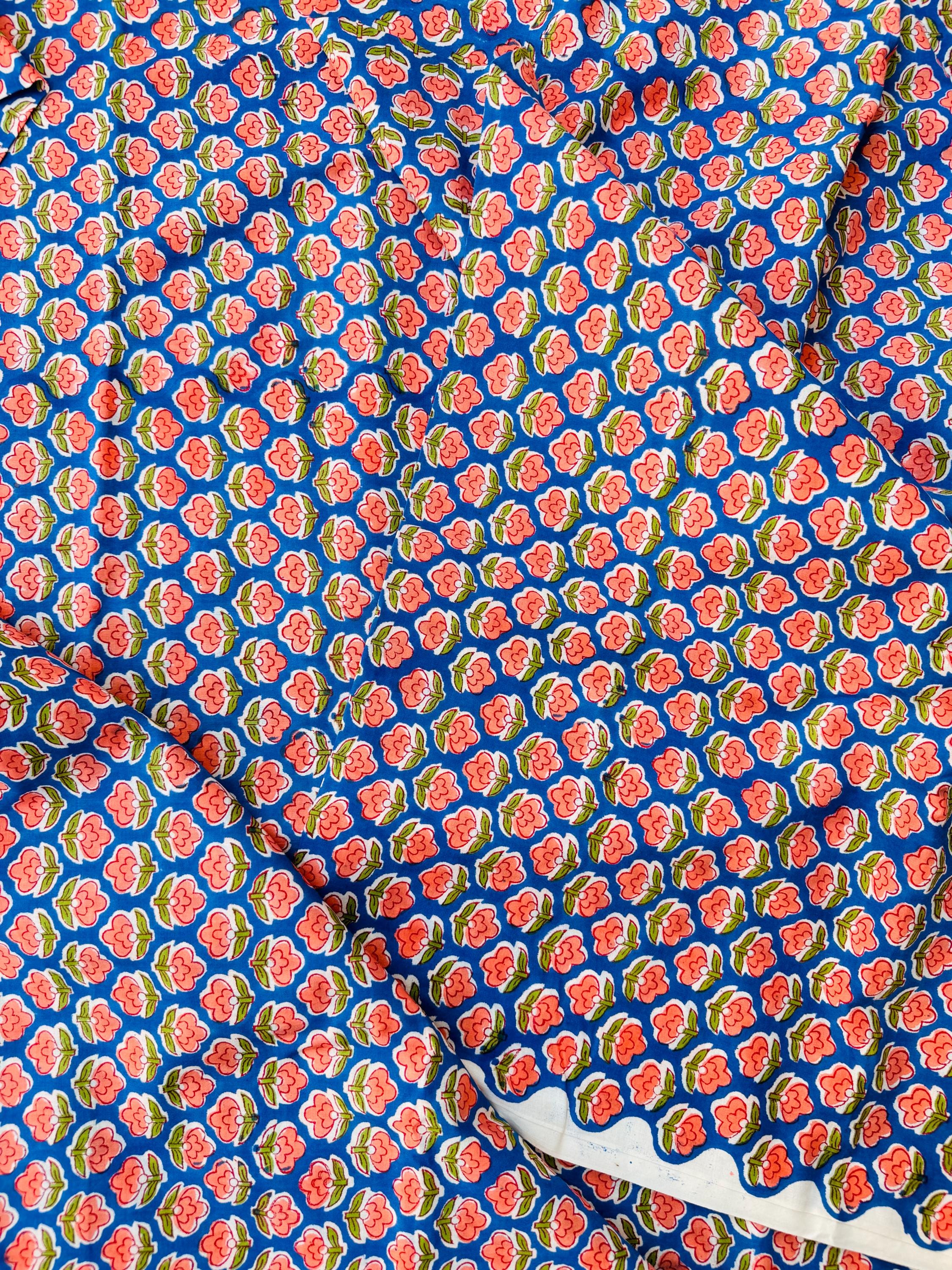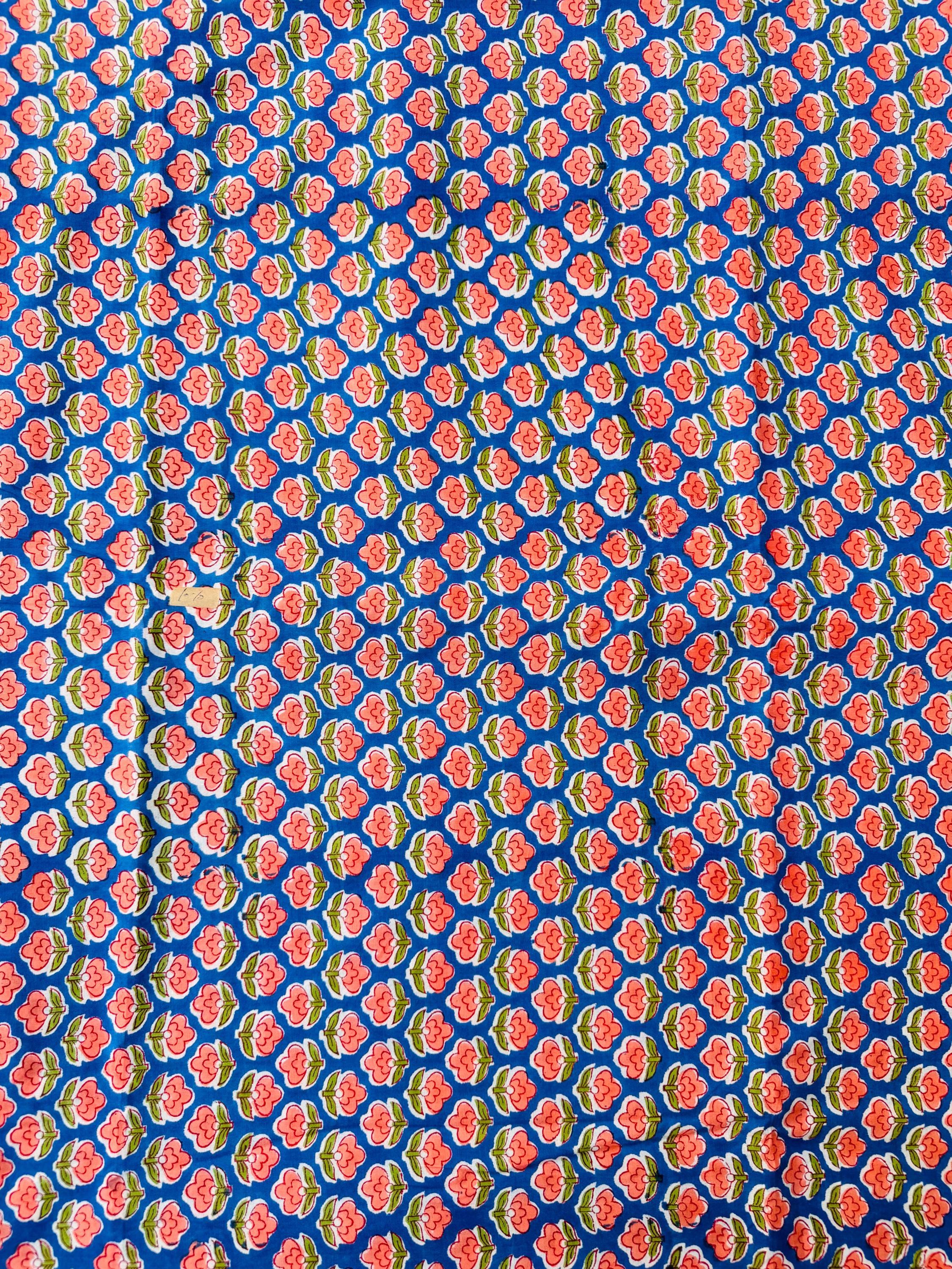 Bring timeless Indian craftsmanship into your creative projects with this Hand Block Printed Cotton Running Fabric. Printed by skilled artisans using traditional wooden blocks, this fabric features a charming pink floral motif on a vibrant blue base, inspired by classic Jaipur block print designs.