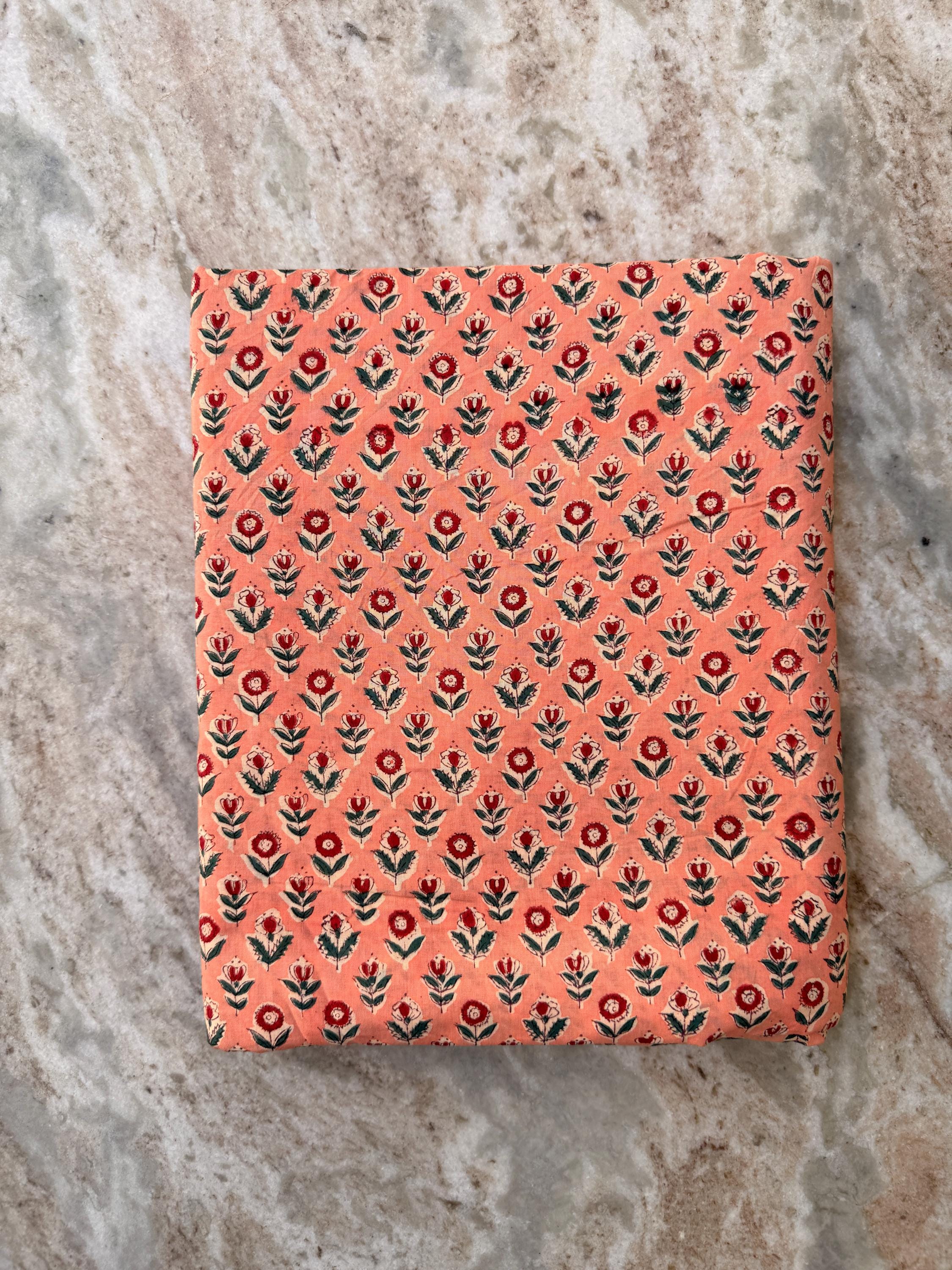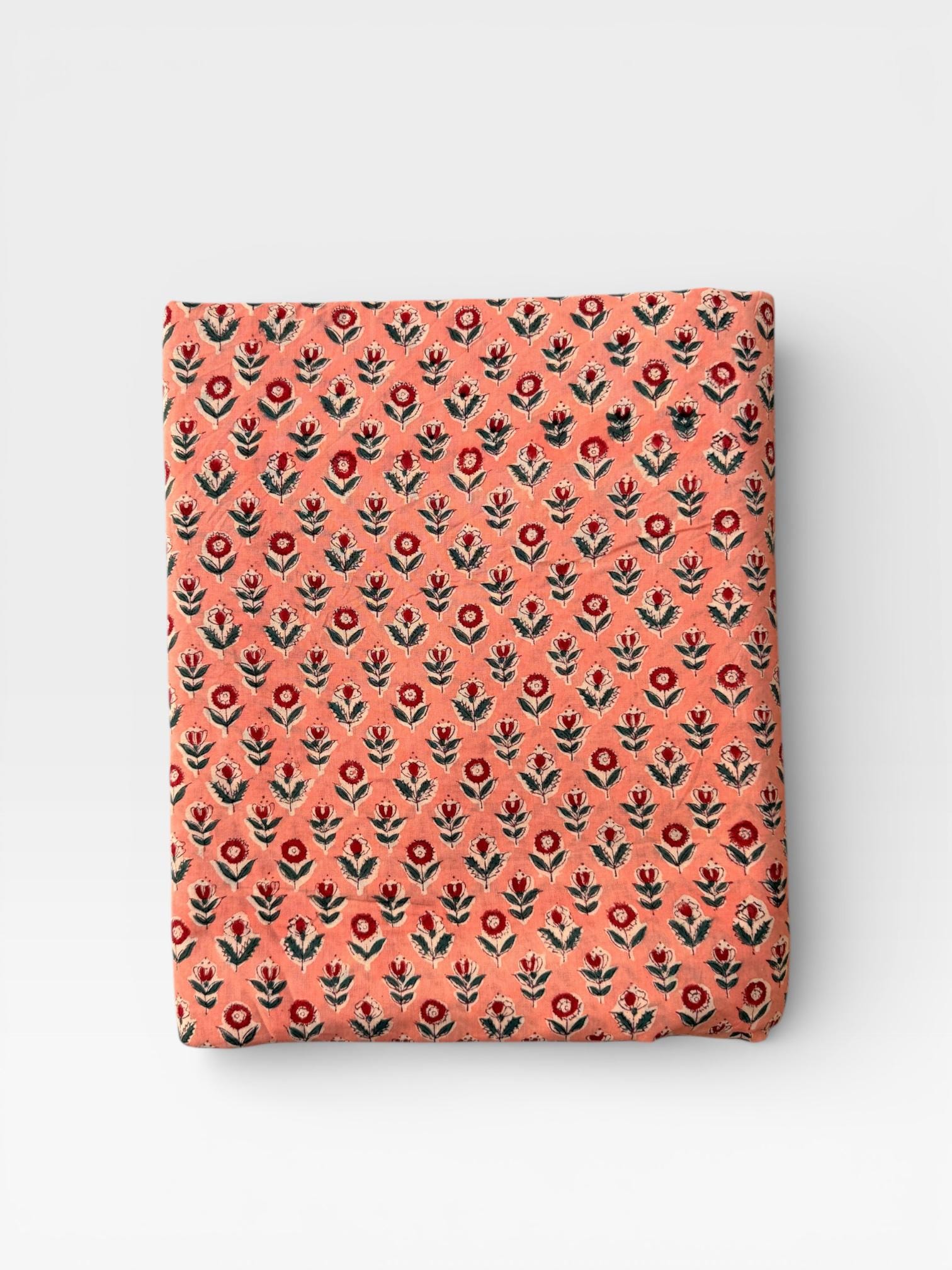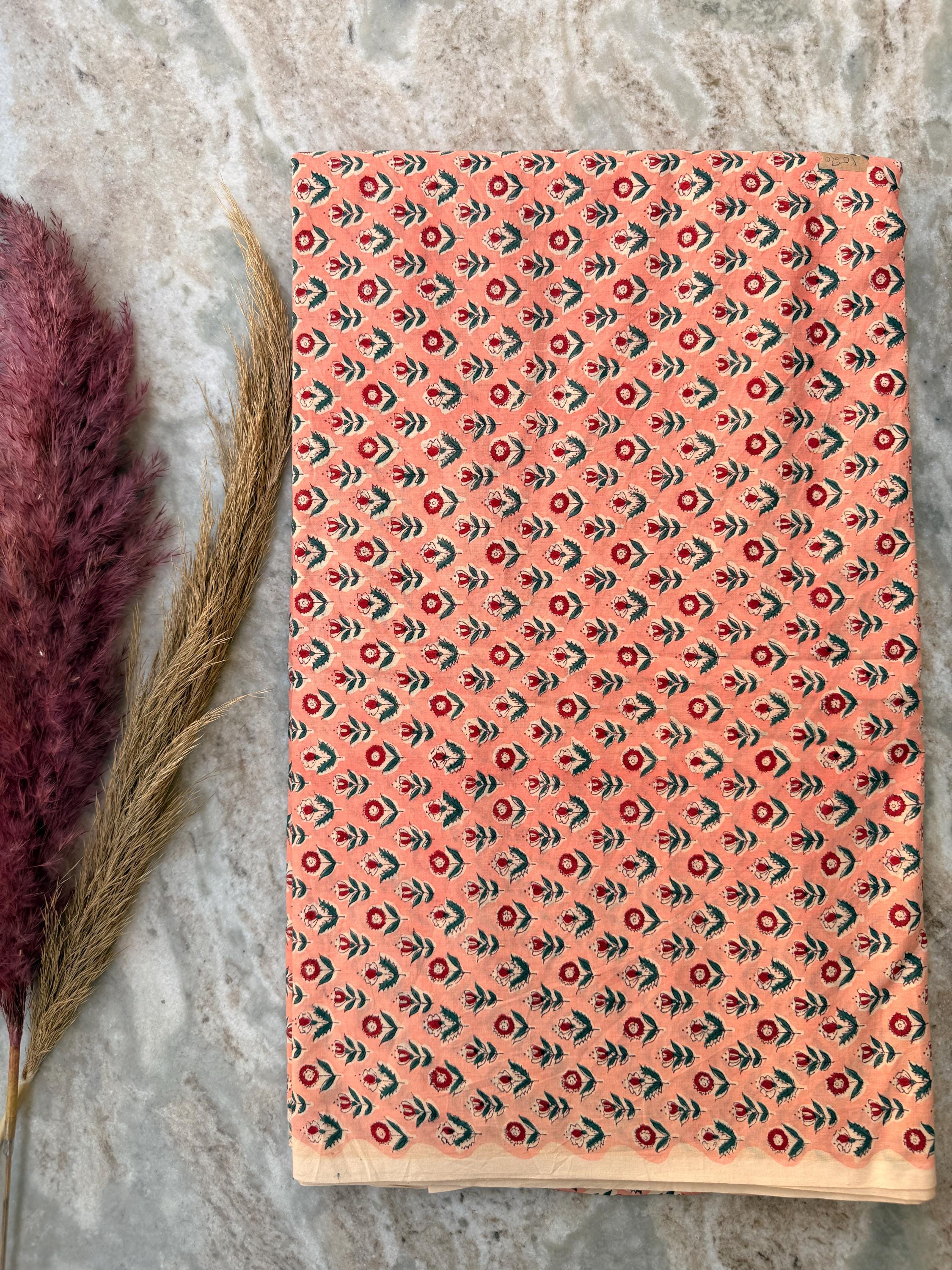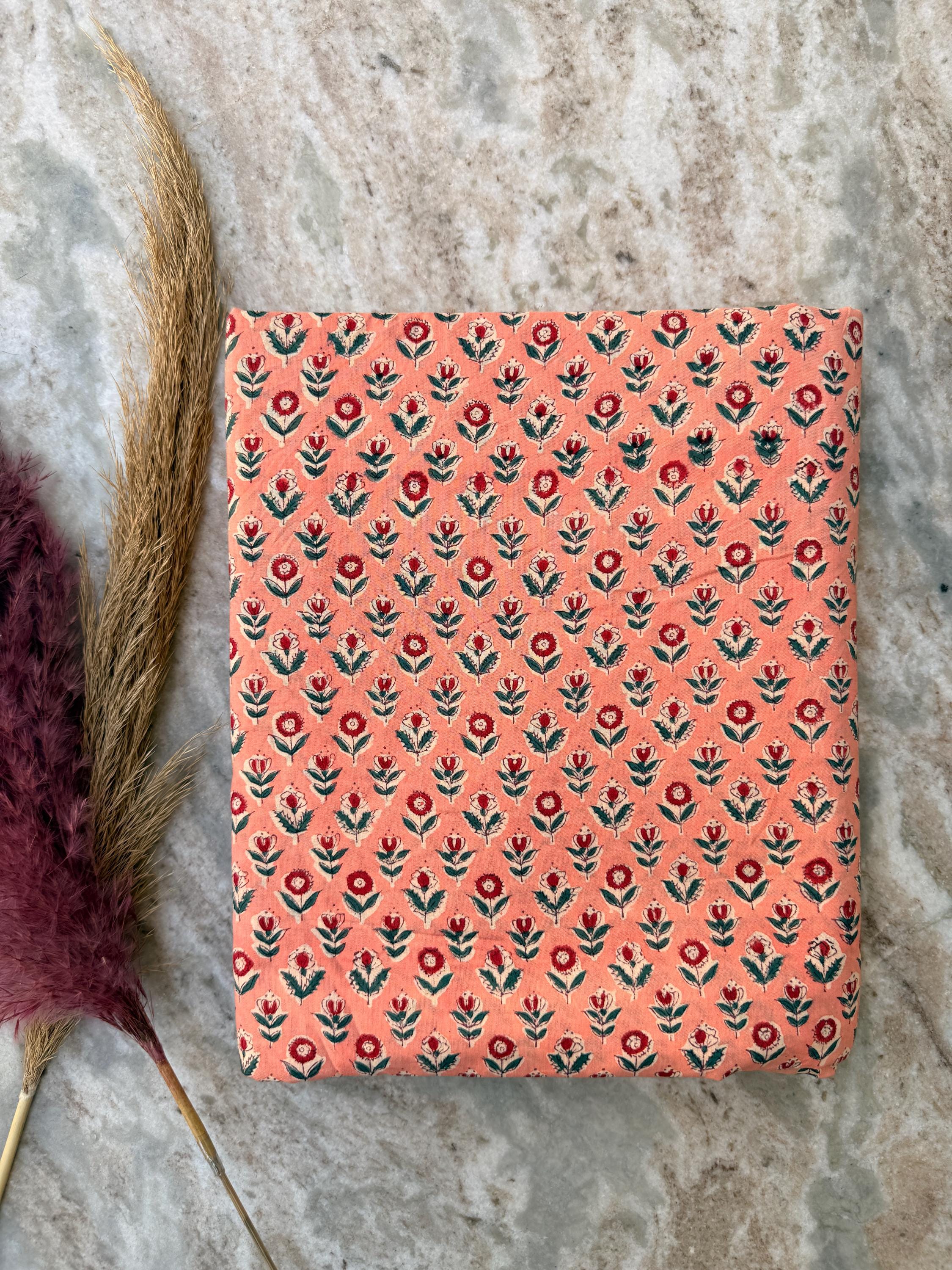 Bring subtle elegance to your sewing projects with this Hand Block Printed Cotton Running Fabric, featuring a delicate floral buti pattern in earthy red and green tones on a soft peach base. Each motif is individually hand-stamped using traditional wooden blocks, keeping alive the heritage craft of Indian block printing.