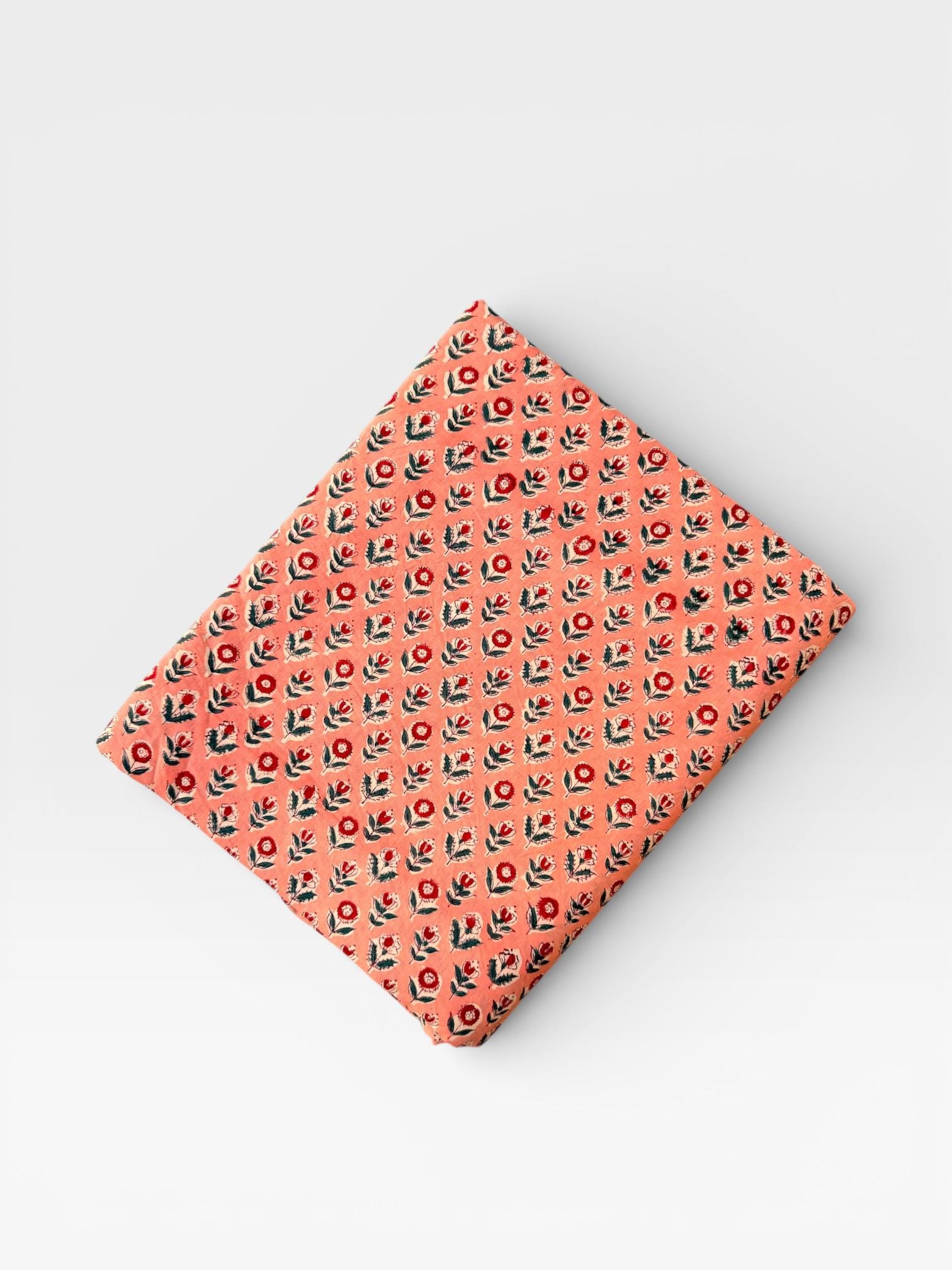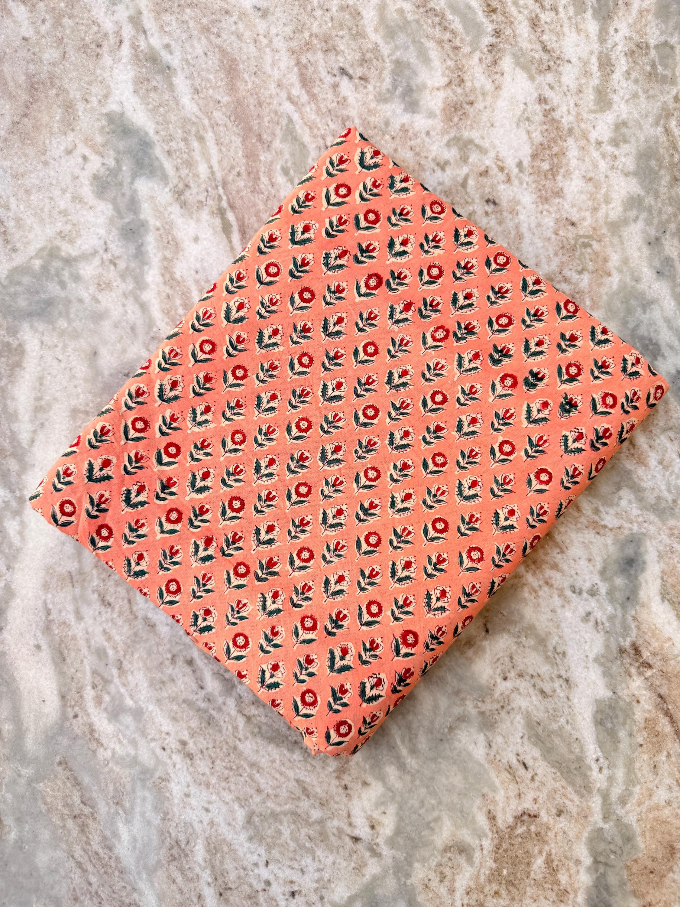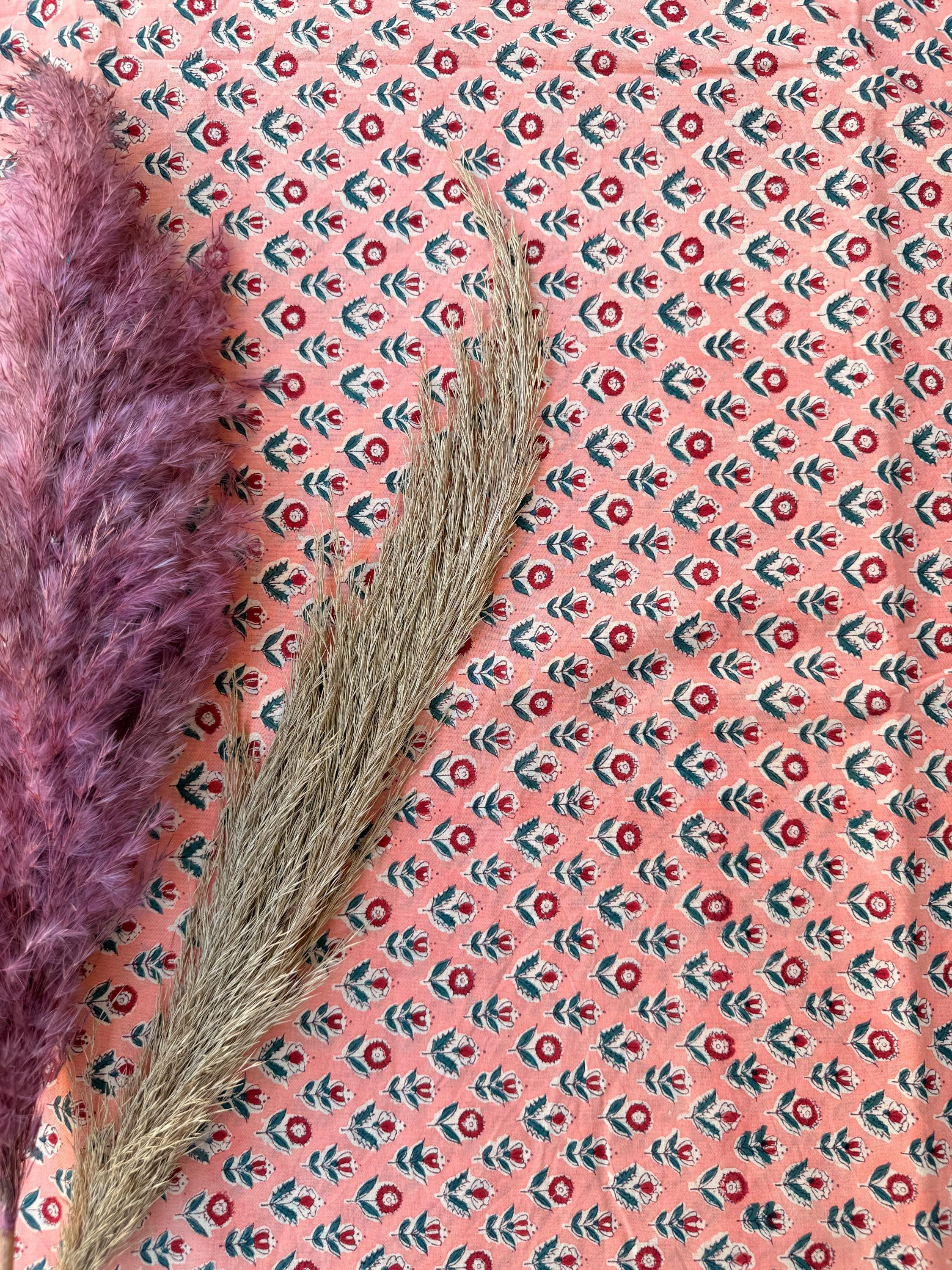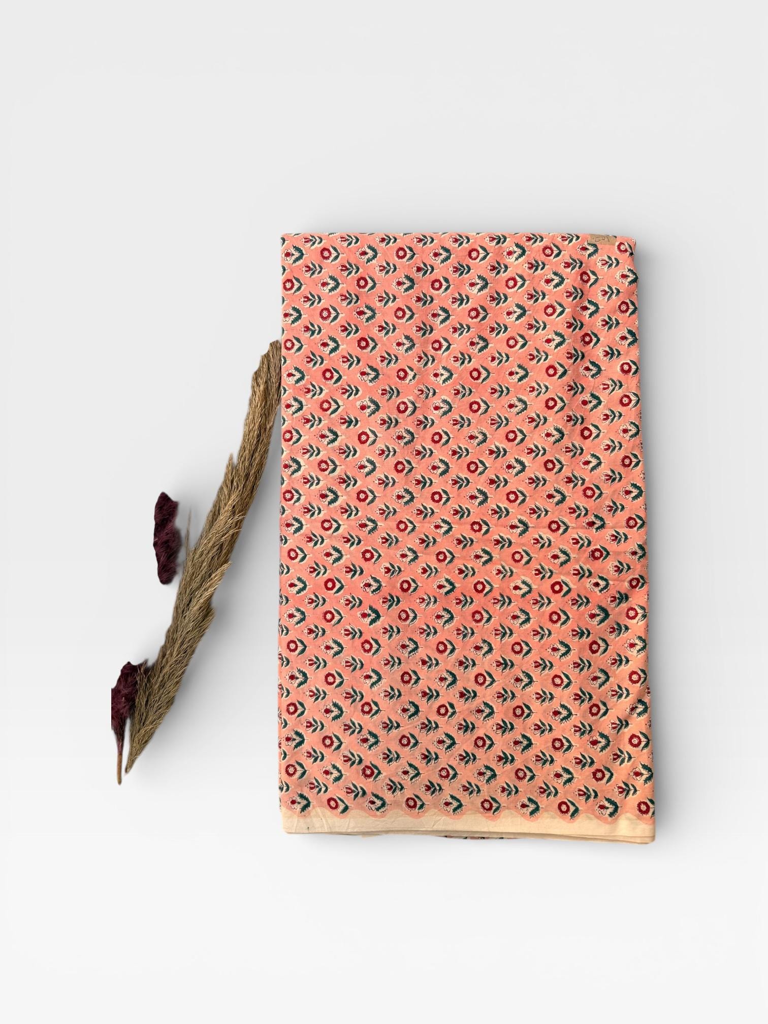 Bring subtle elegance to your sewing projects with this Hand Block Printed Cotton Running Fabric, featuring a delicate floral buti pattern in earthy red and green tones on a soft peach base. Each motif is individually hand-stamped using traditional wooden blocks, keeping alive the heritage craft of Indian block printing.