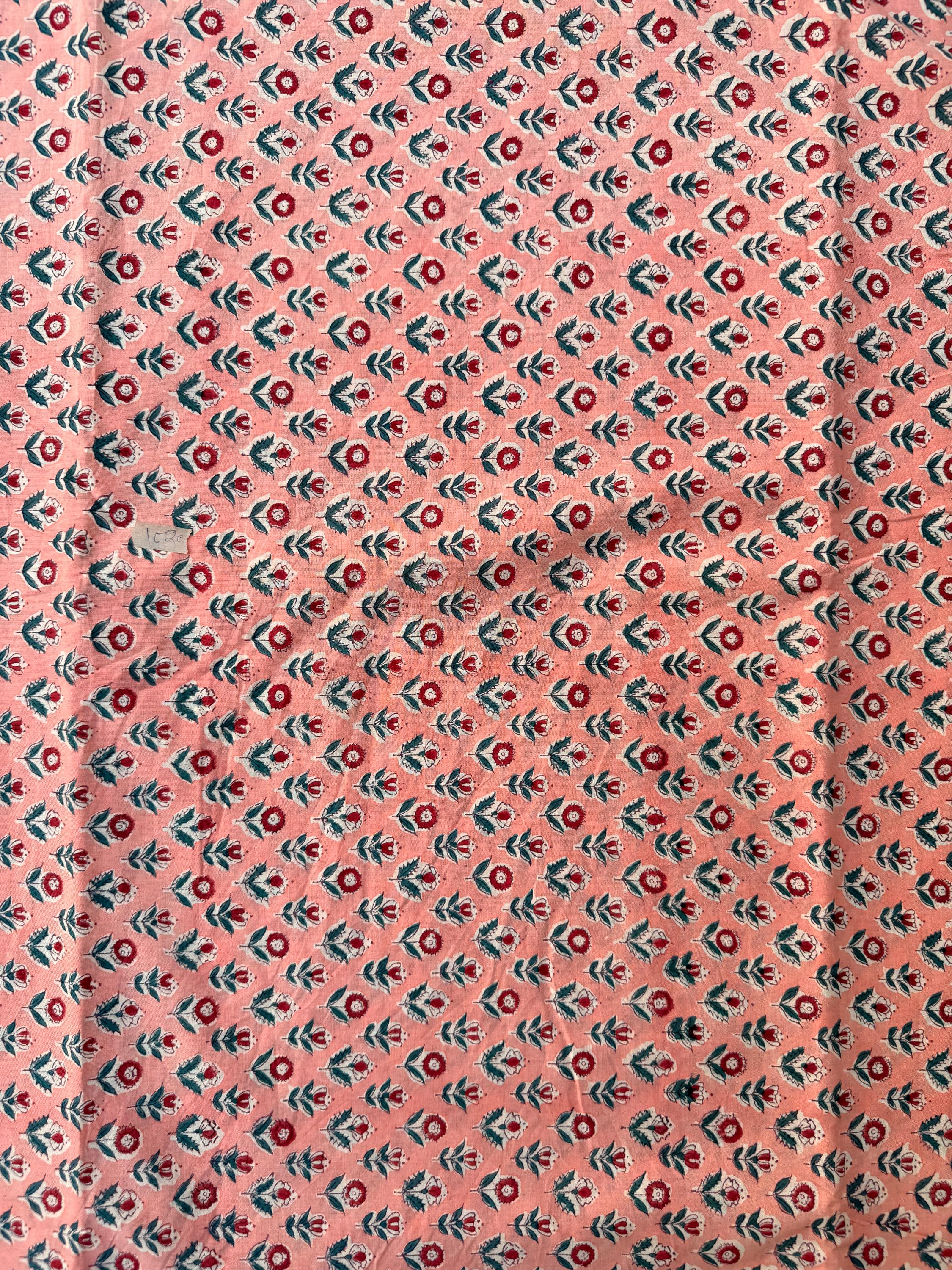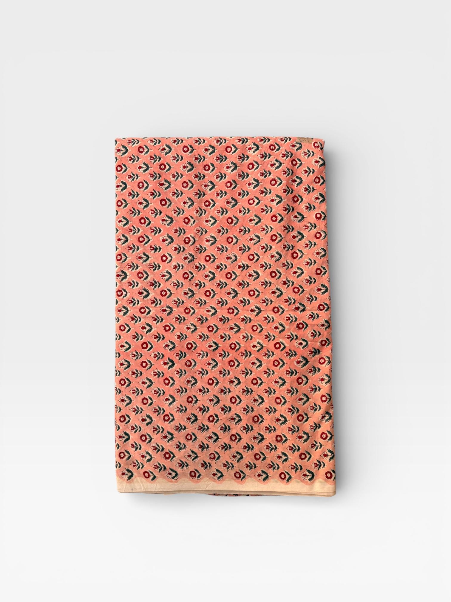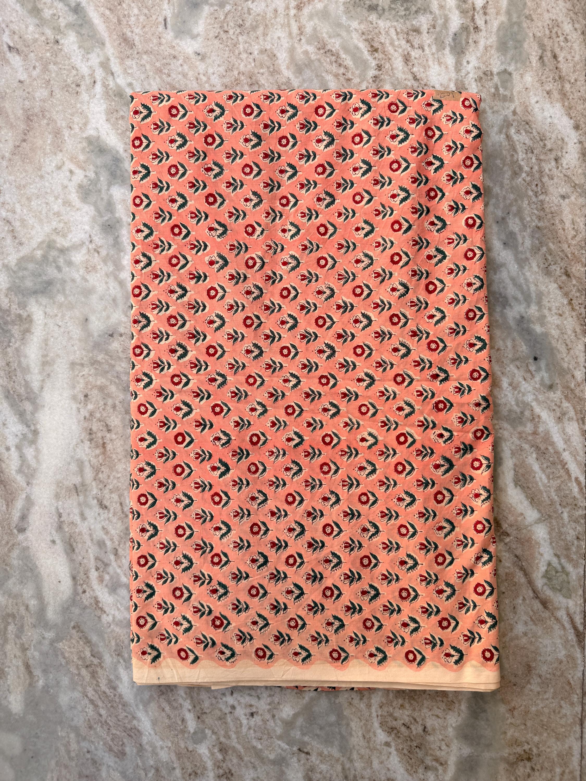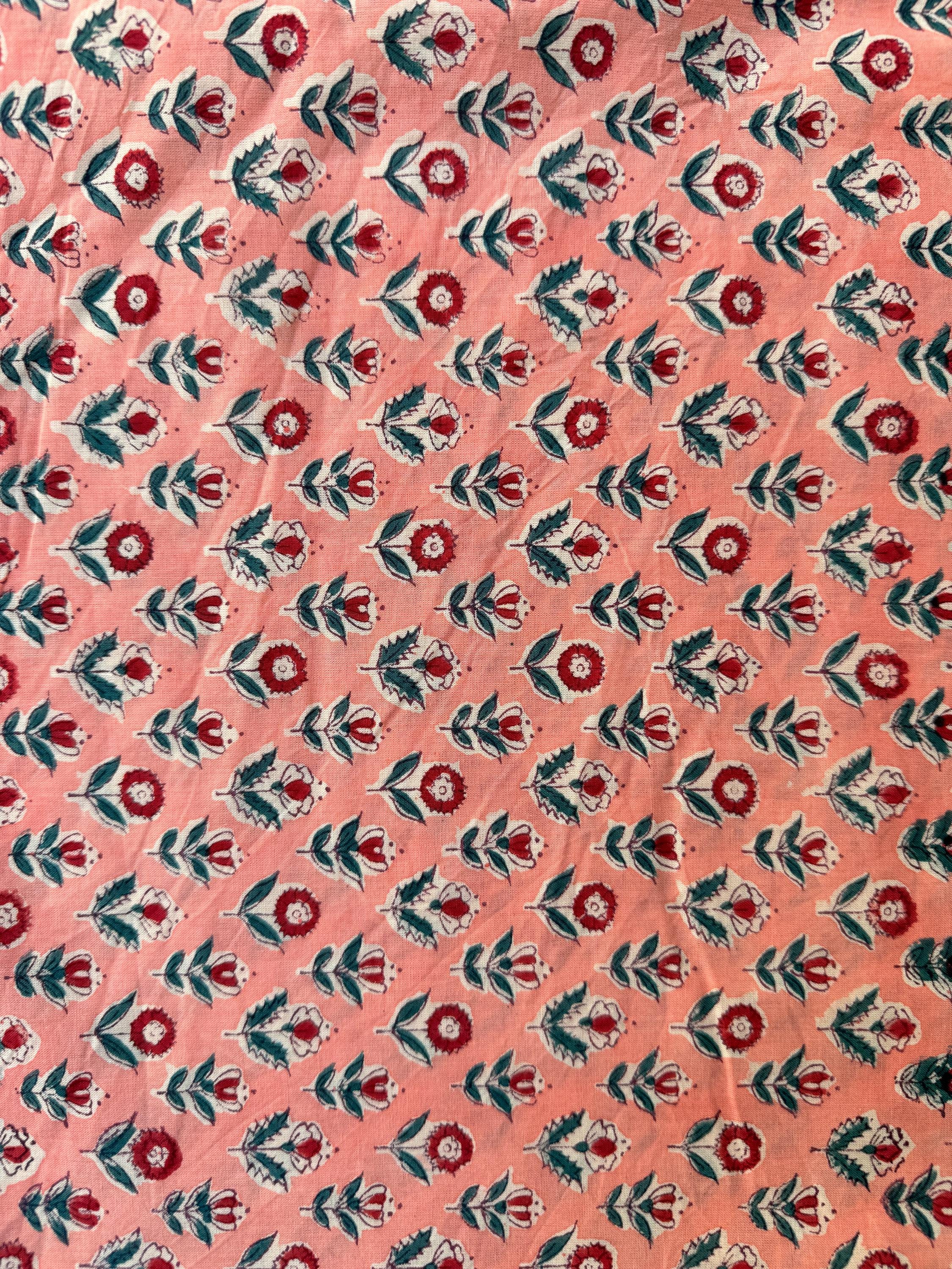 Bring subtle elegance to your sewing projects with this Hand Block Printed Cotton Running Fabric, featuring a delicate floral buti pattern in earthy red and green tones on a soft peach base. Each motif is individually hand-stamped using traditional wooden blocks, keeping alive the heritage craft of Indian block printing.
