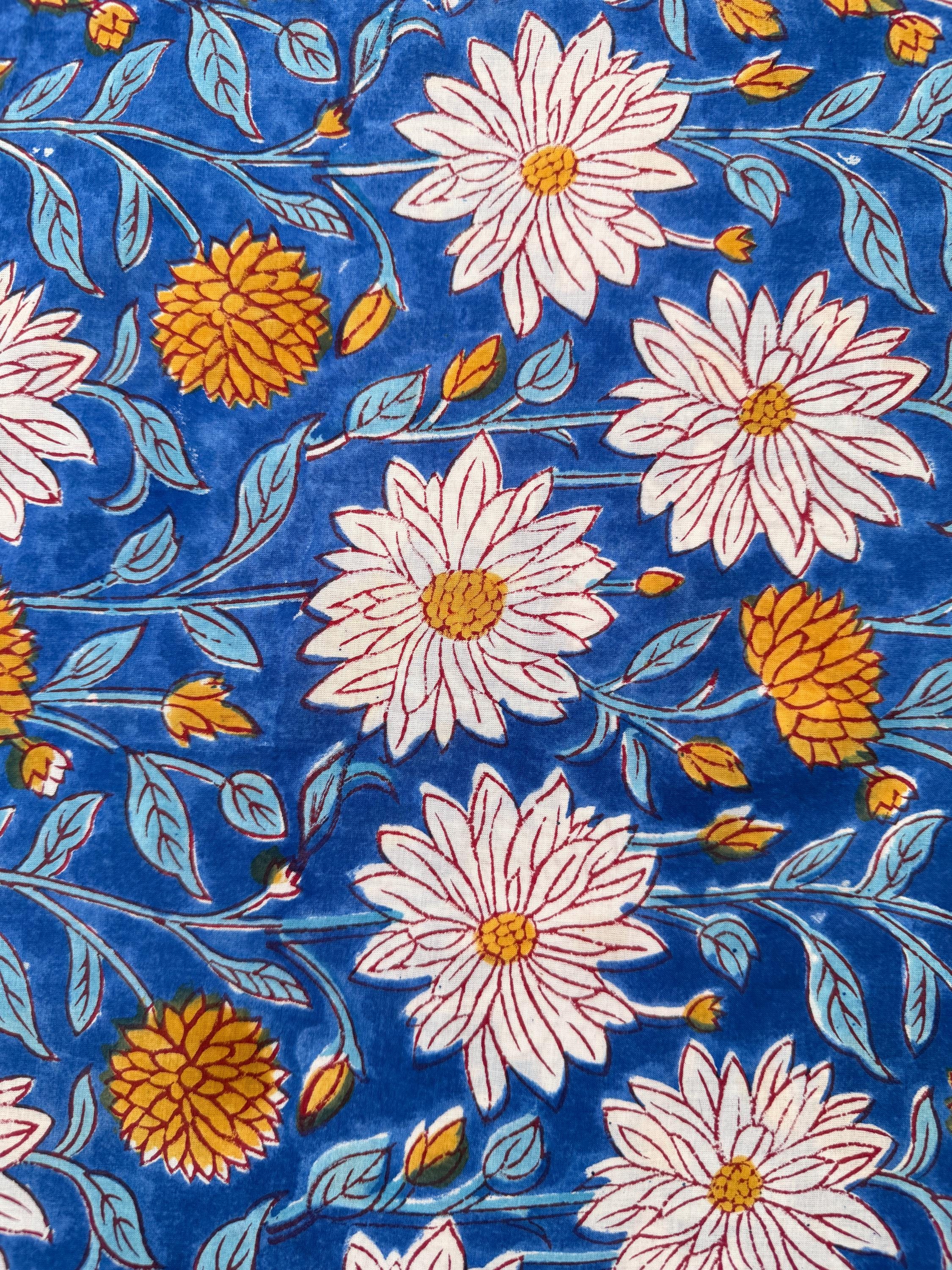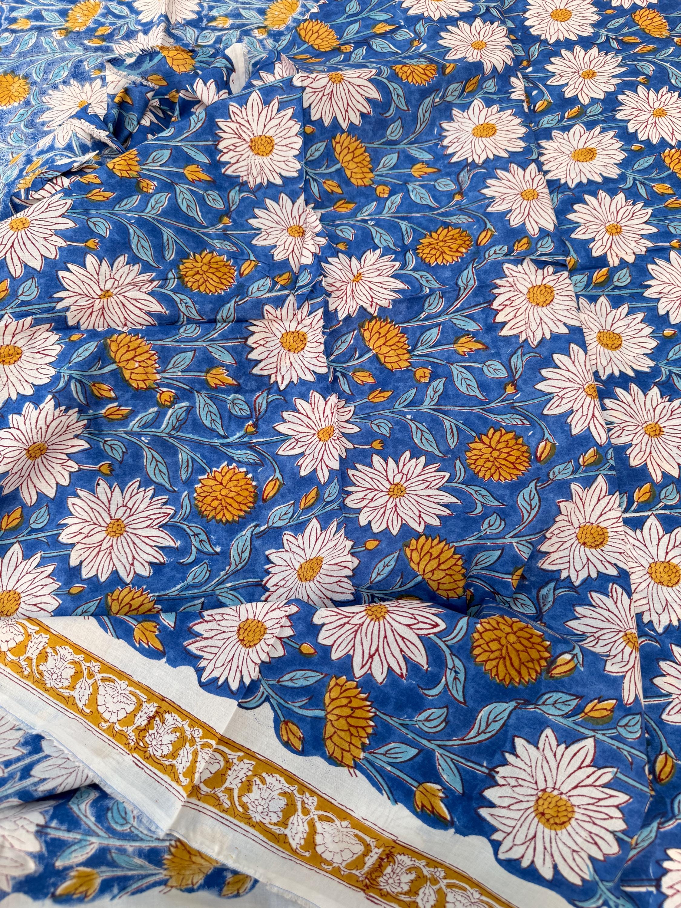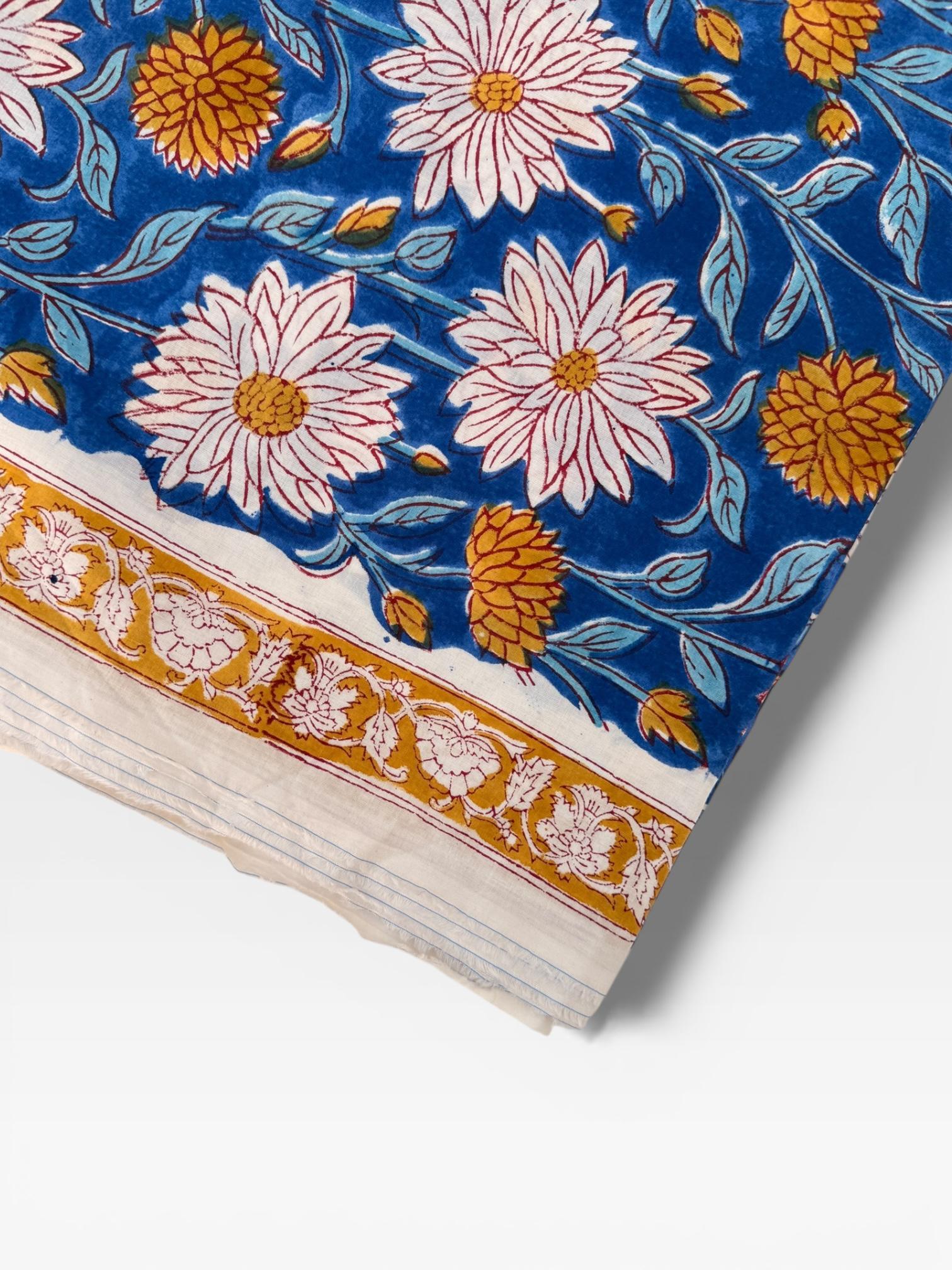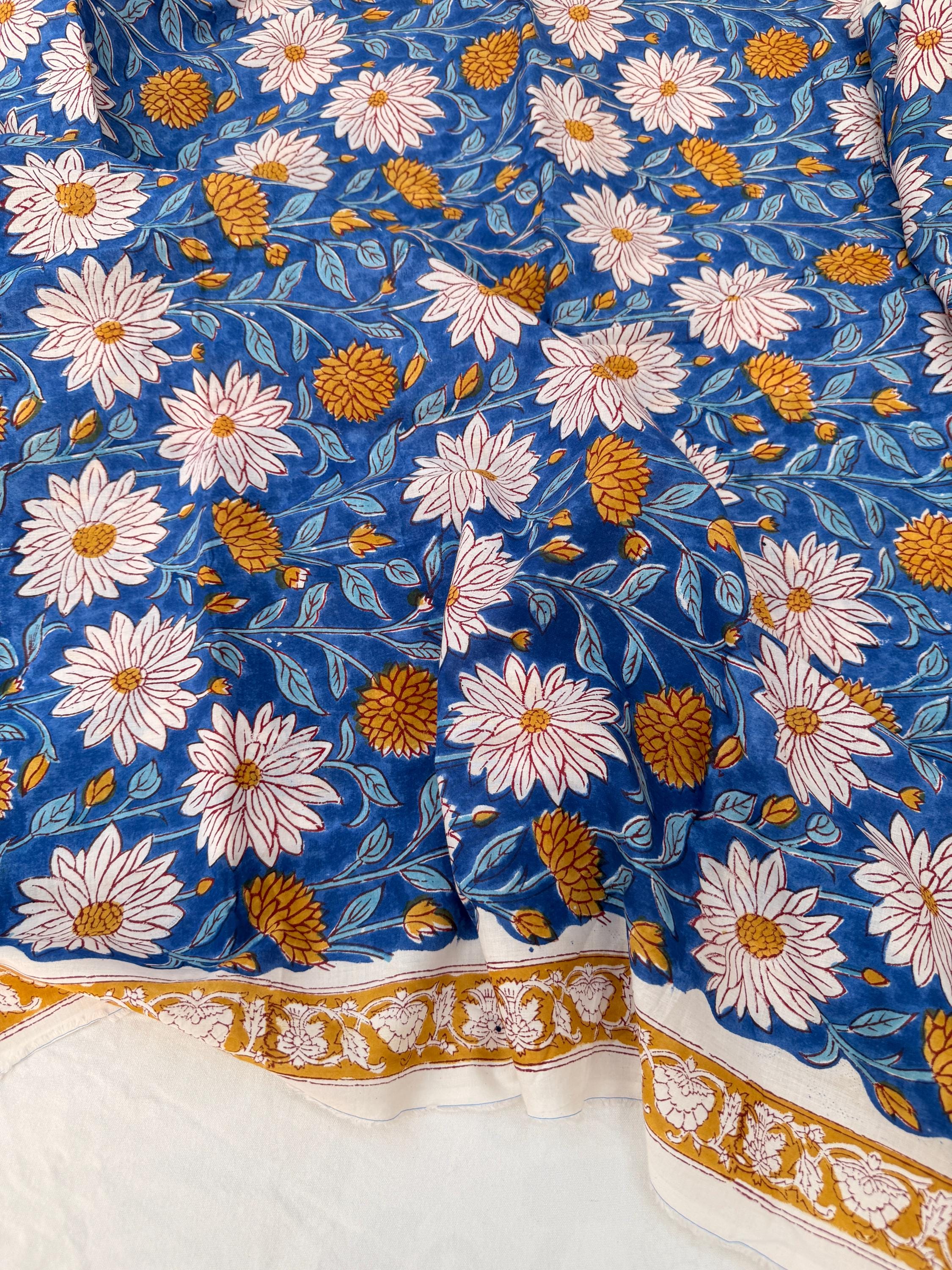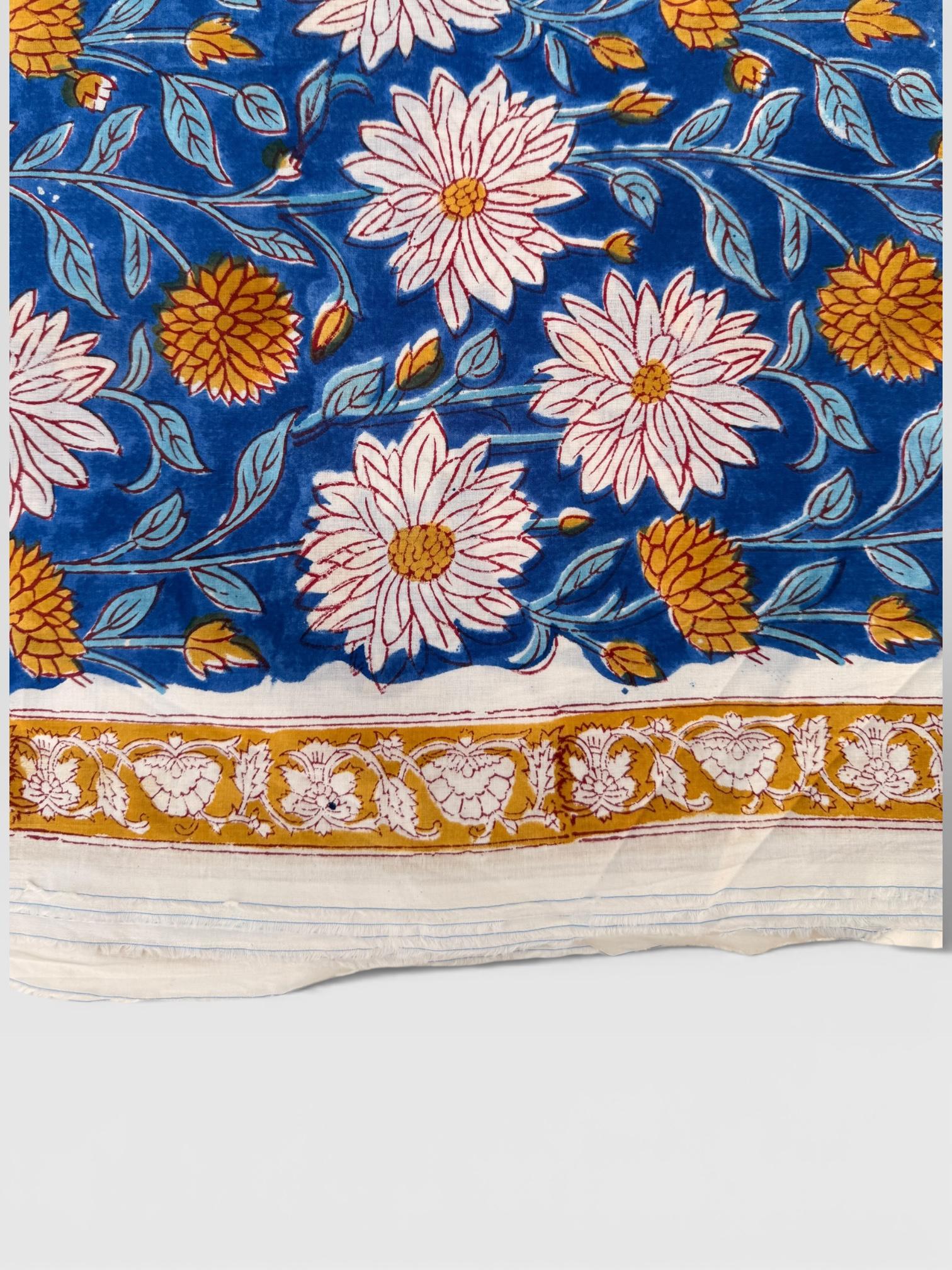 This fabric features an elegant blue base adorned with soft ivory floral motifs and mustard yellow accents, finished with a delicate hand-printed border. Each motif is individually stamped by skilled artisans, making every yard unique with natural variations that celebrate the beauty of handmade textiles.