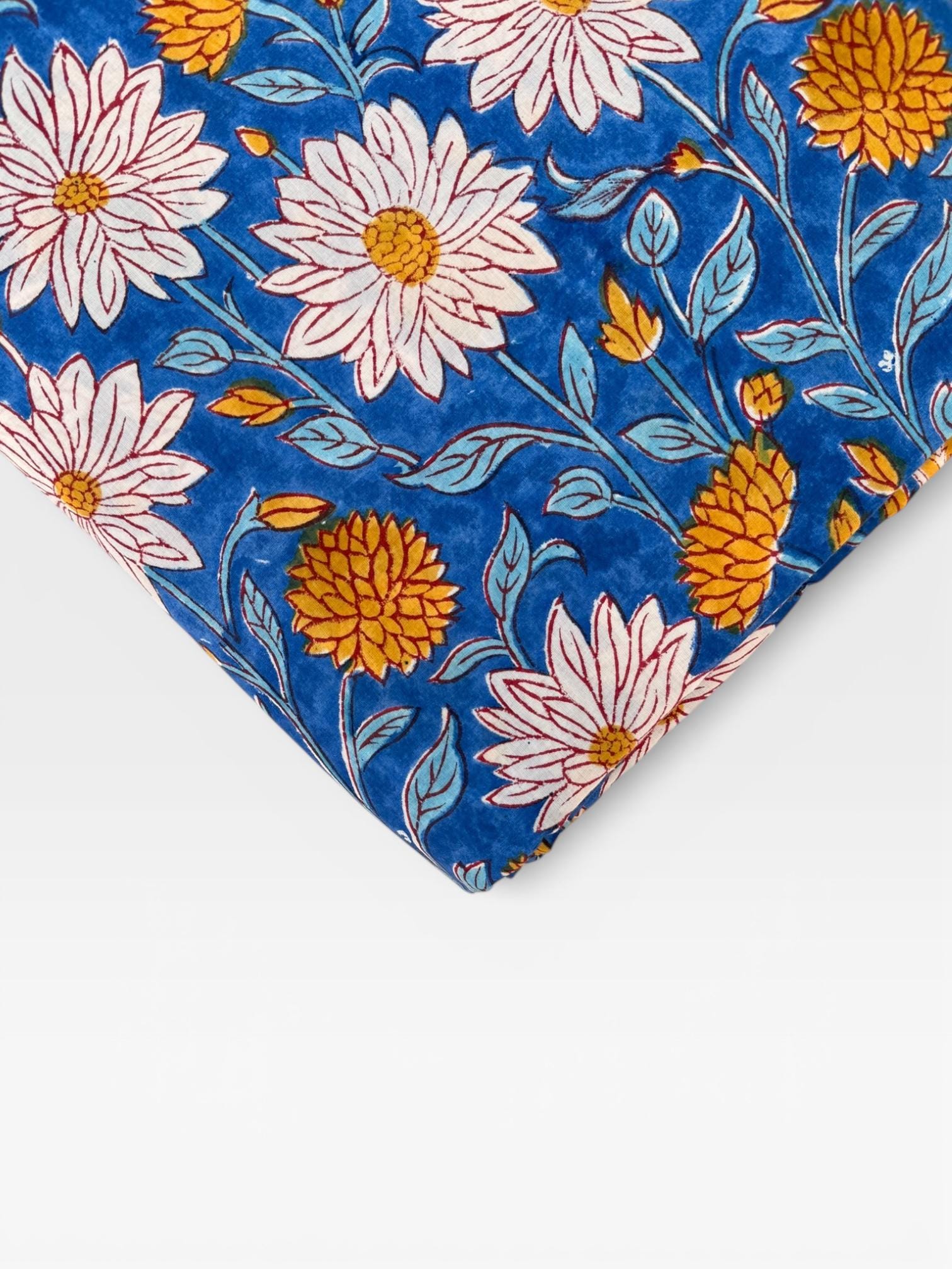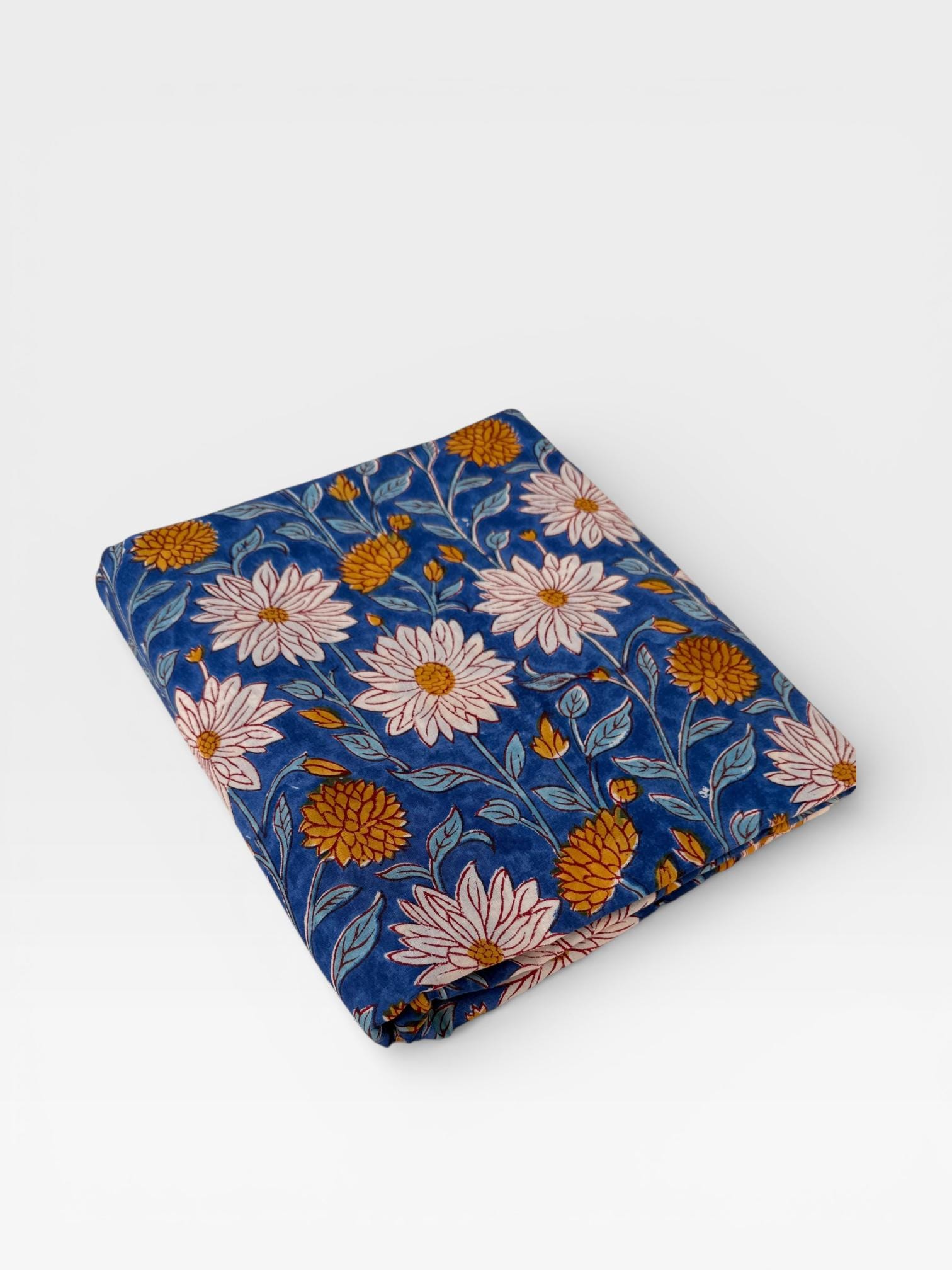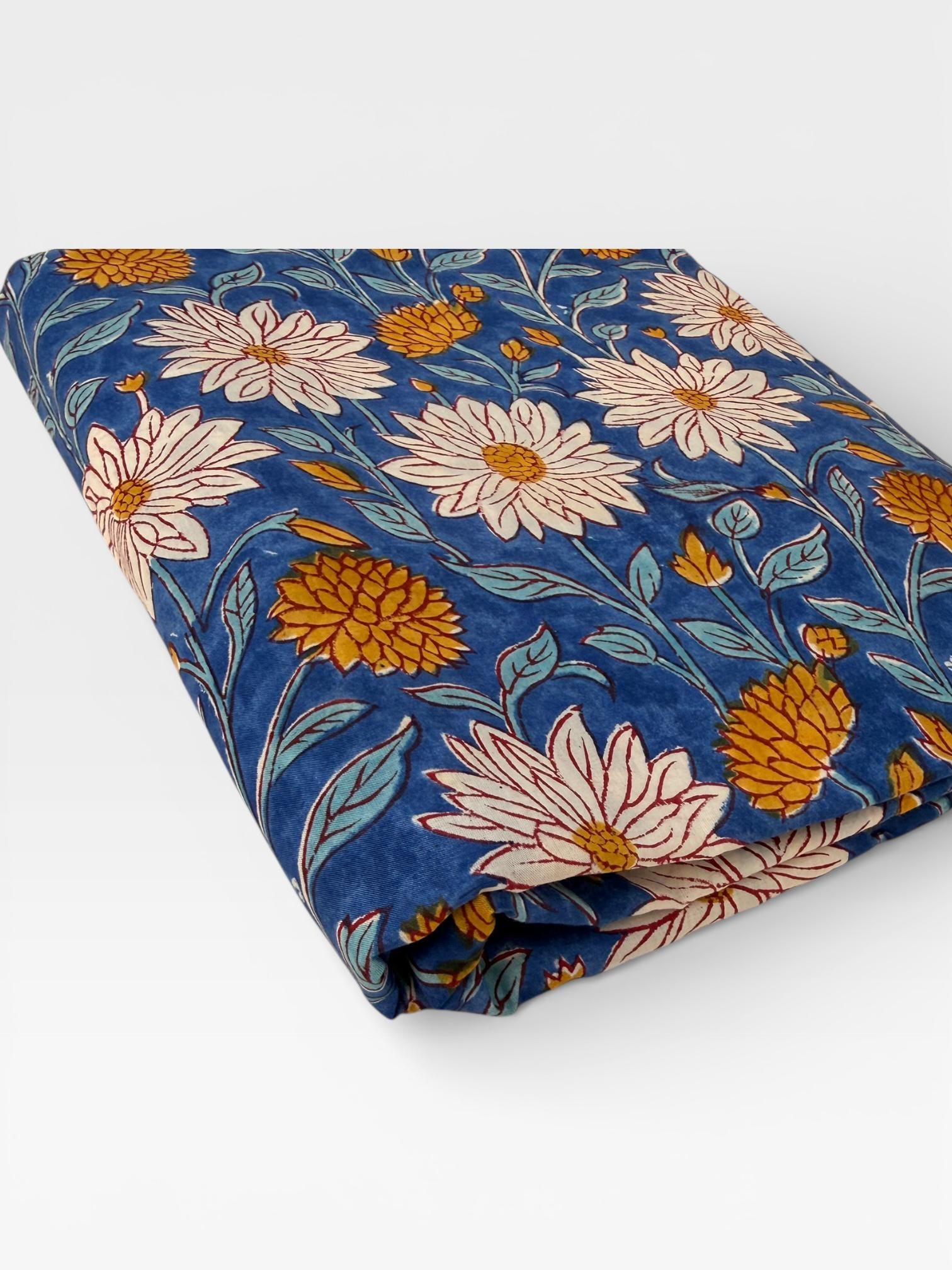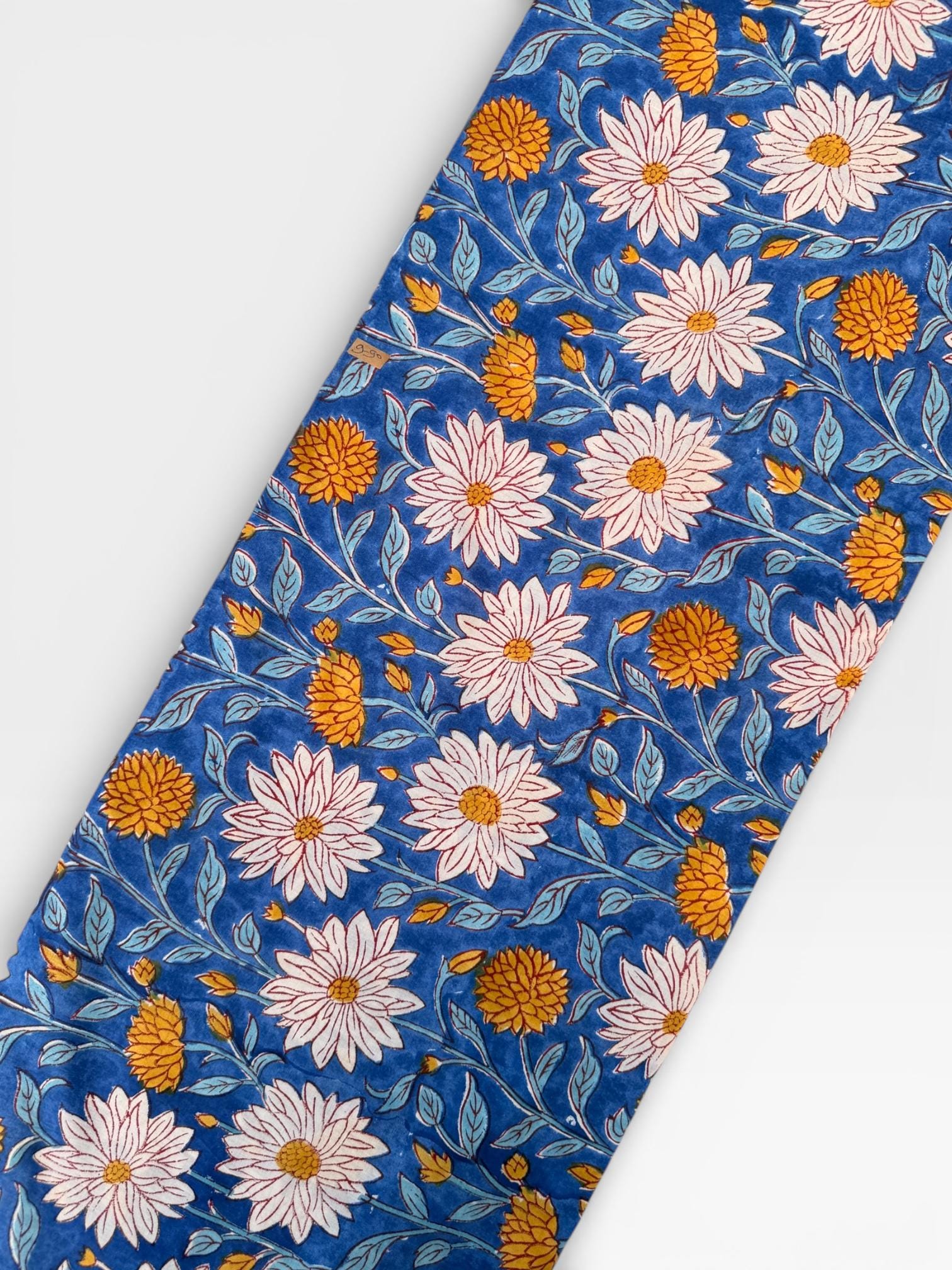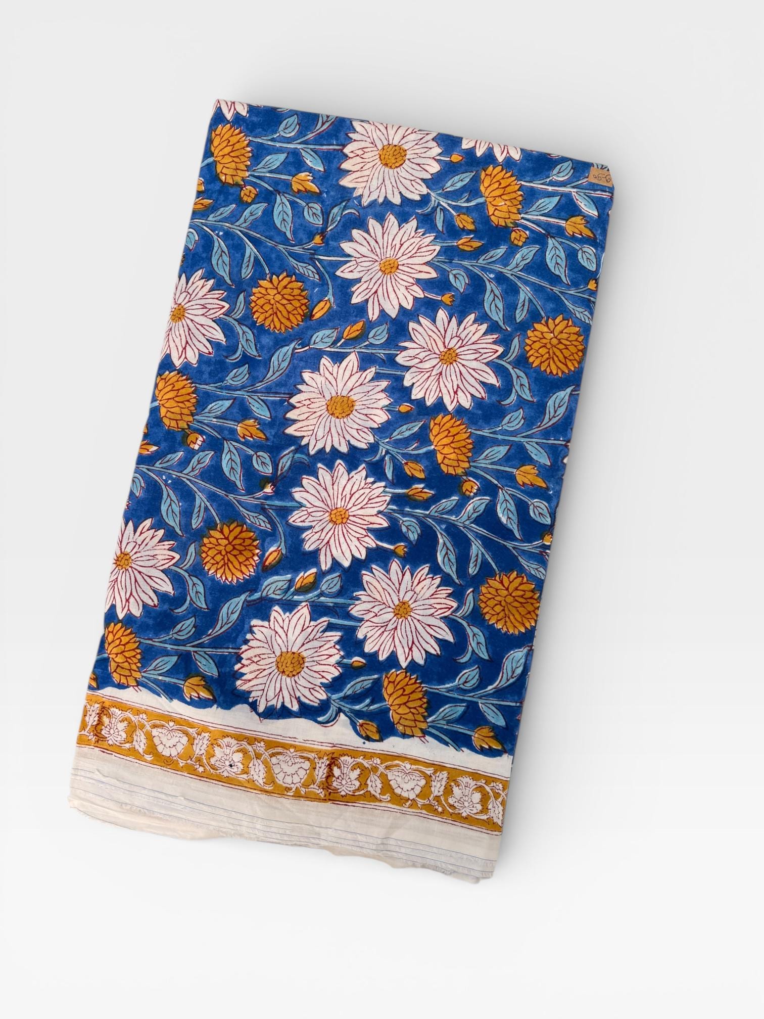 This fabric features an elegant blue base adorned with soft ivory floral motifs and mustard yellow accents, finished with a delicate hand-printed border. Each motif is individually stamped by skilled artisans, making every yard unique with natural variations that celebrate the beauty of handmade textiles.