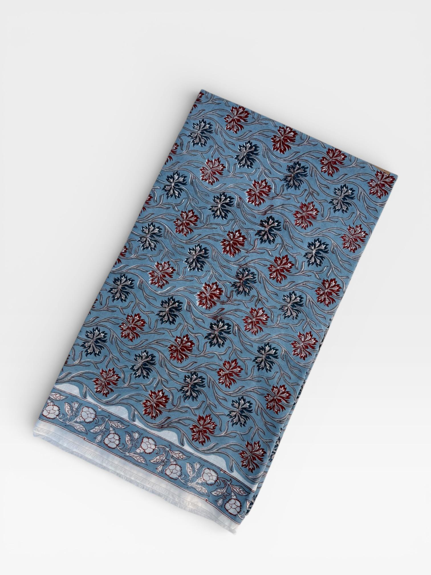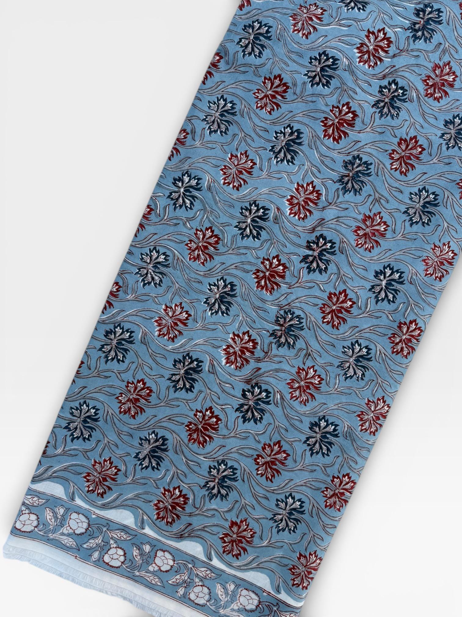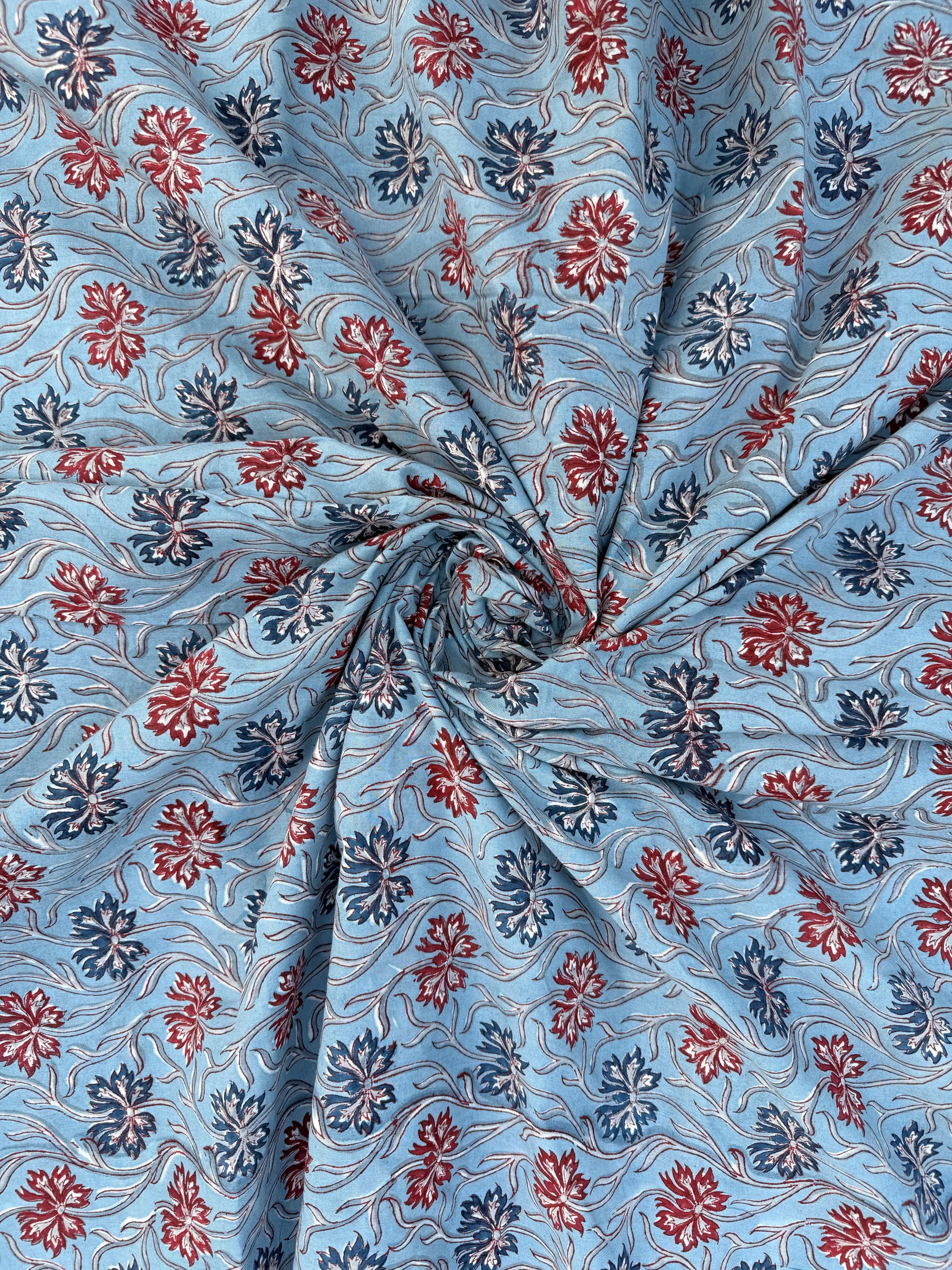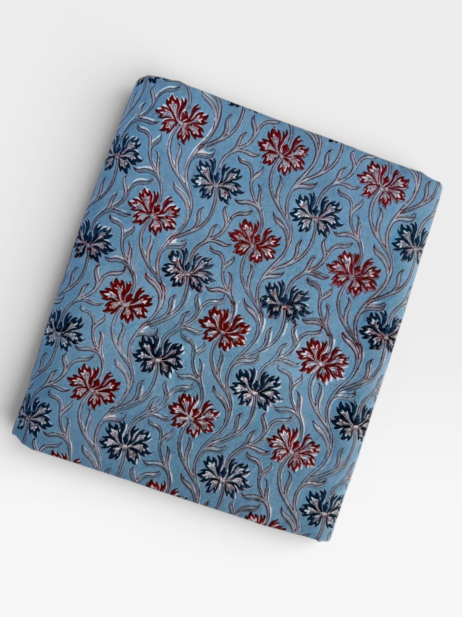 Add timeless beauty to your handmade creations with this hand block printed cotton running fabric, featuring a soothing dusty blue base adorned with delicate floral motifs in deep maroon, indigo, and soft ivory, connected by flowing vine patterns.