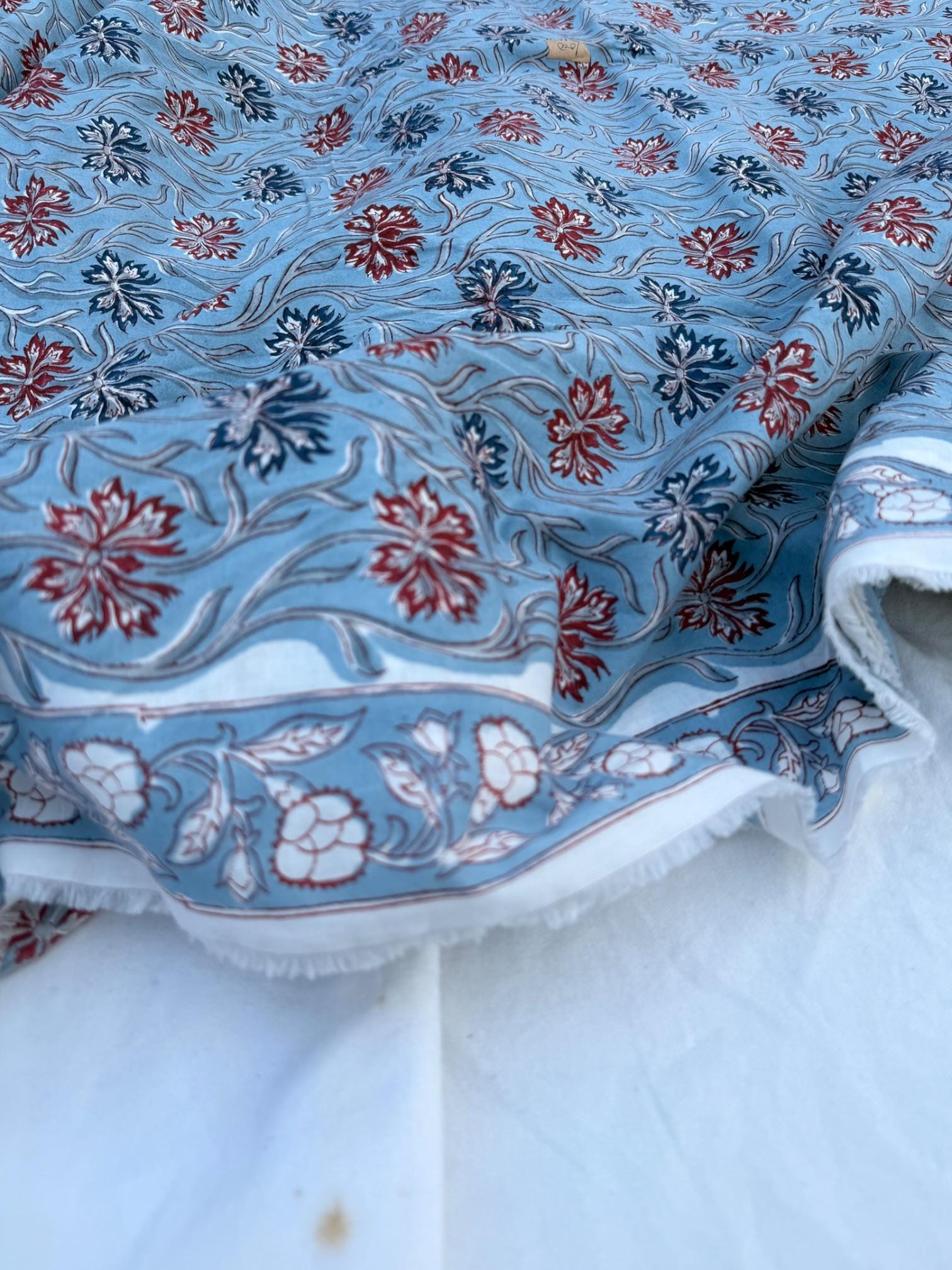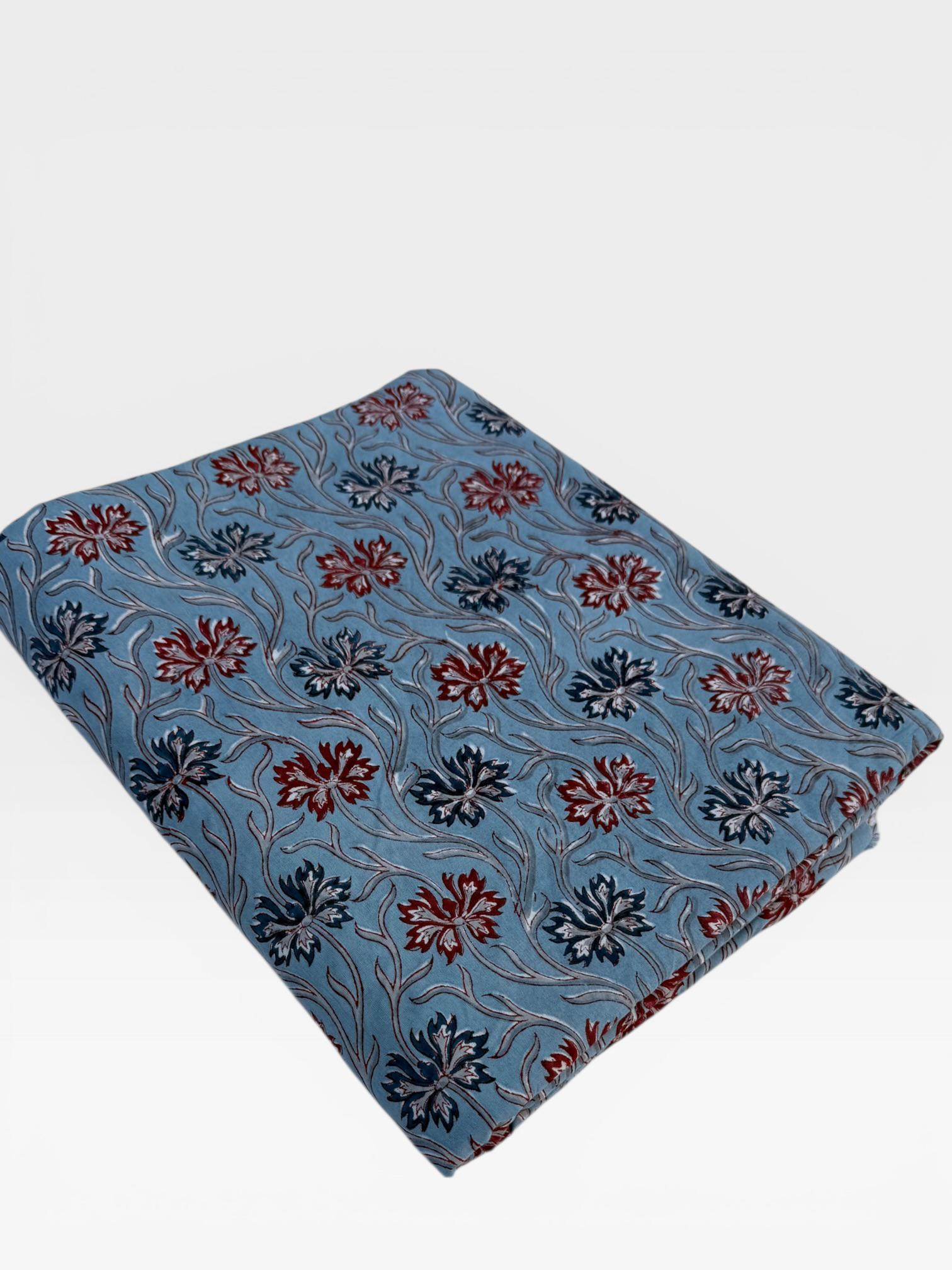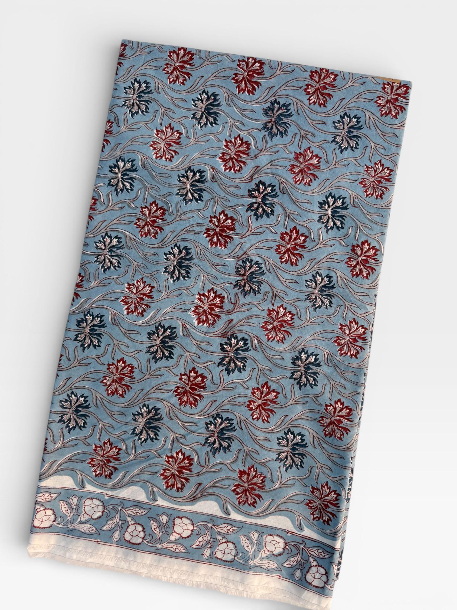 Add timeless beauty to your handmade creations with this hand block printed cotton running fabric, featuring a soothing dusty blue base adorned with delicate floral motifs in deep maroon, indigo, and soft ivory, connected by flowing vine patterns.