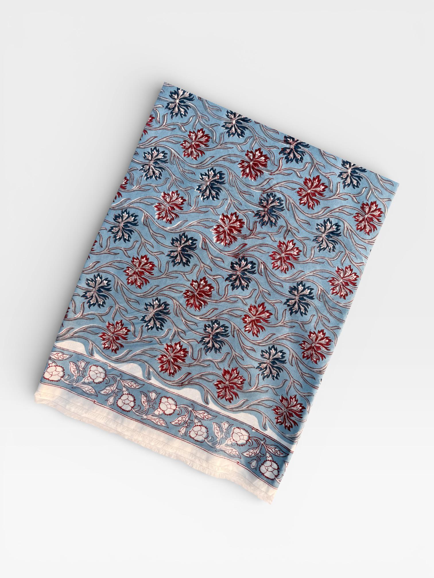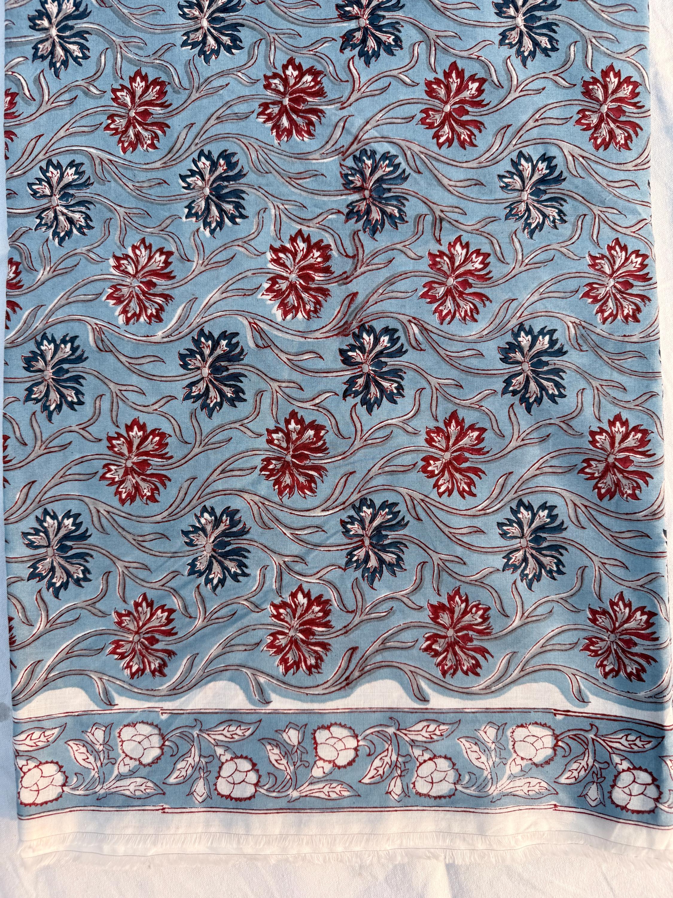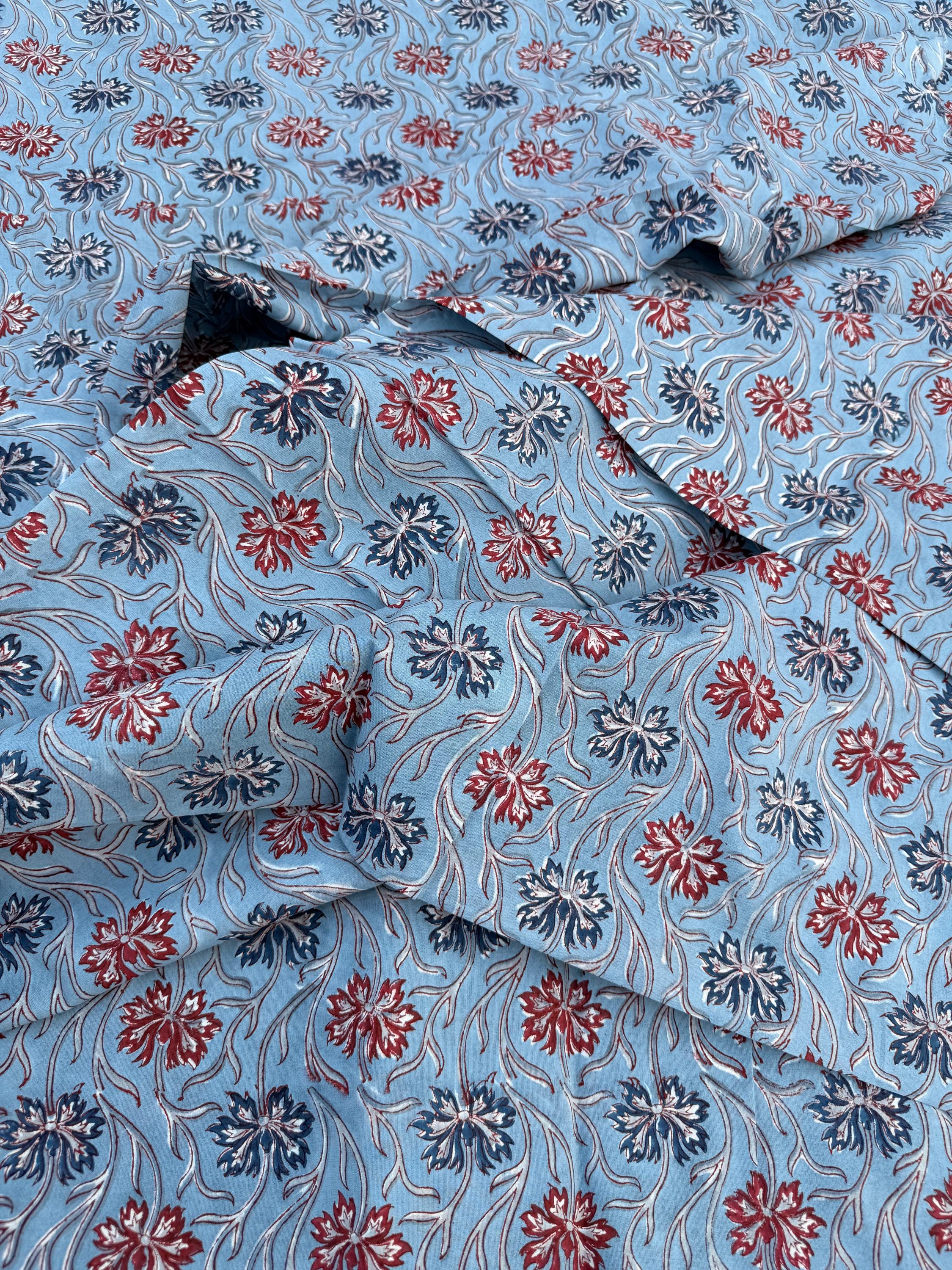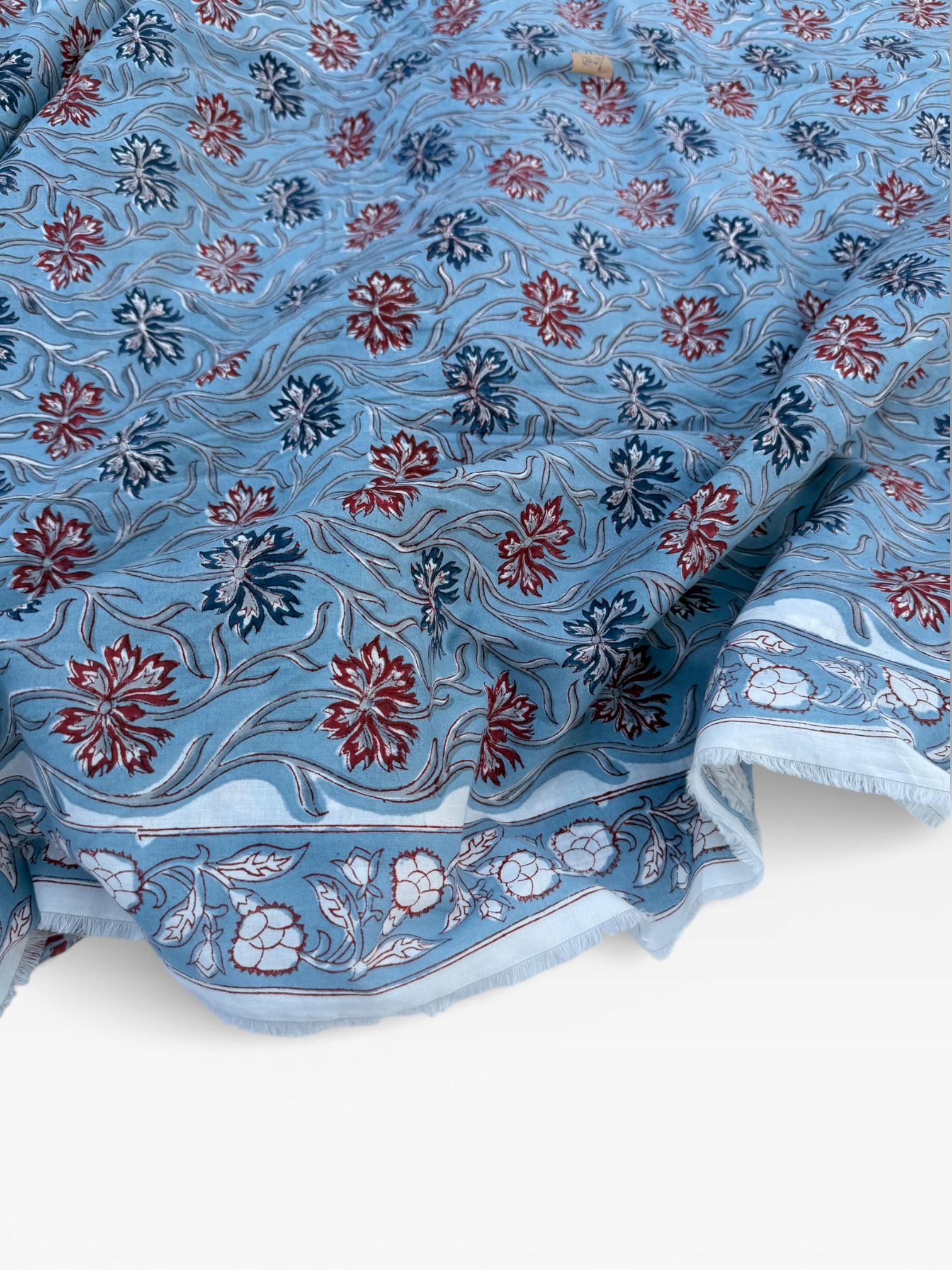 Add timeless beauty to your handmade creations with this hand block printed cotton running fabric, featuring a soothing dusty blue base adorned with delicate floral motifs in deep maroon, indigo, and soft ivory, connected by flowing vine patterns.