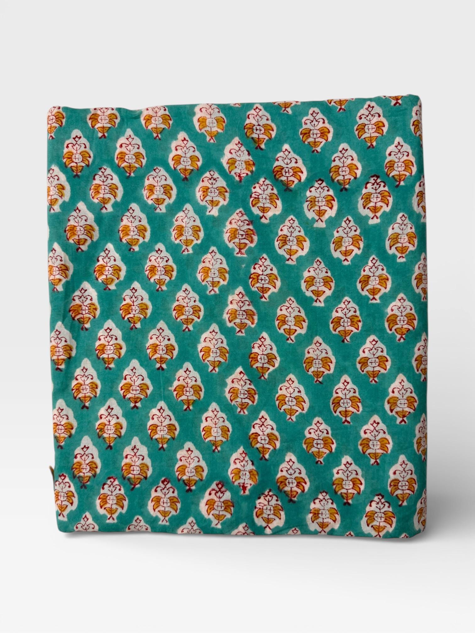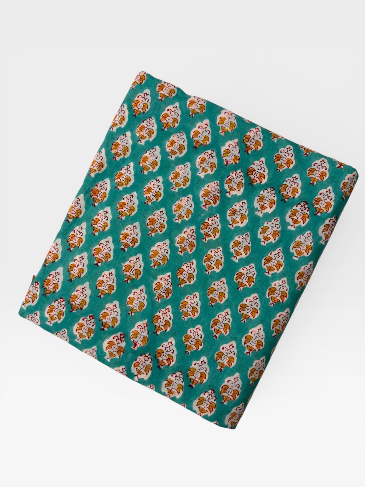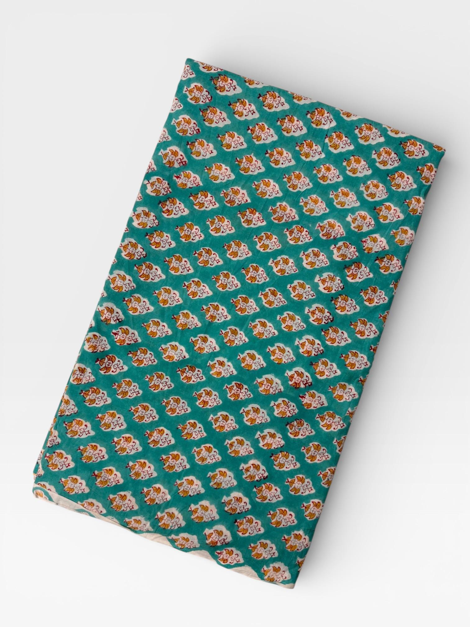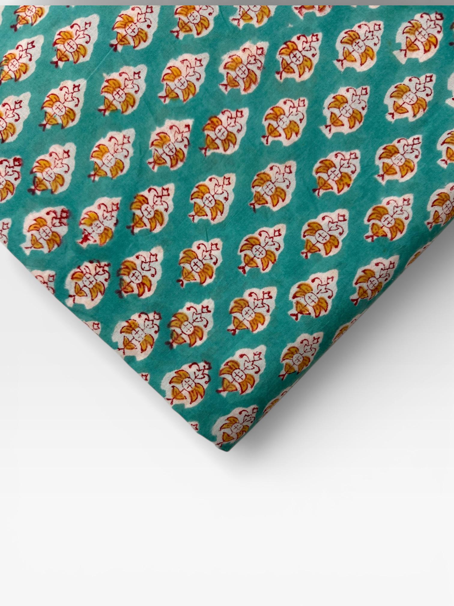 Add a fresh pop of color to your creations with this hand block printed cotton running fabric, crafted using traditional wooden blocks by skilled Indian artisans. The fabric features a repeating floral buta motif in mustard yellow, white, and soft red, beautifully set against a rich teal green base.