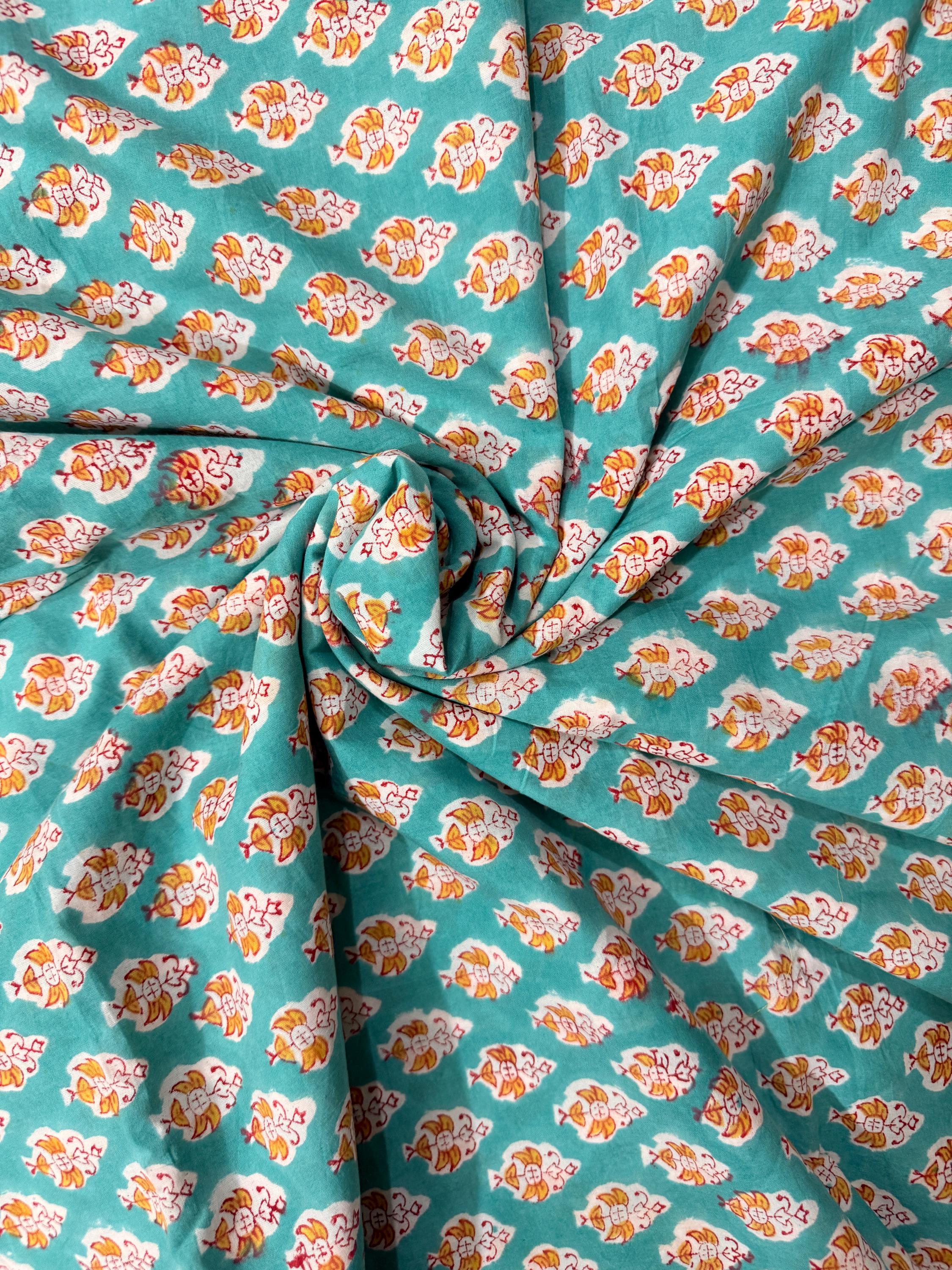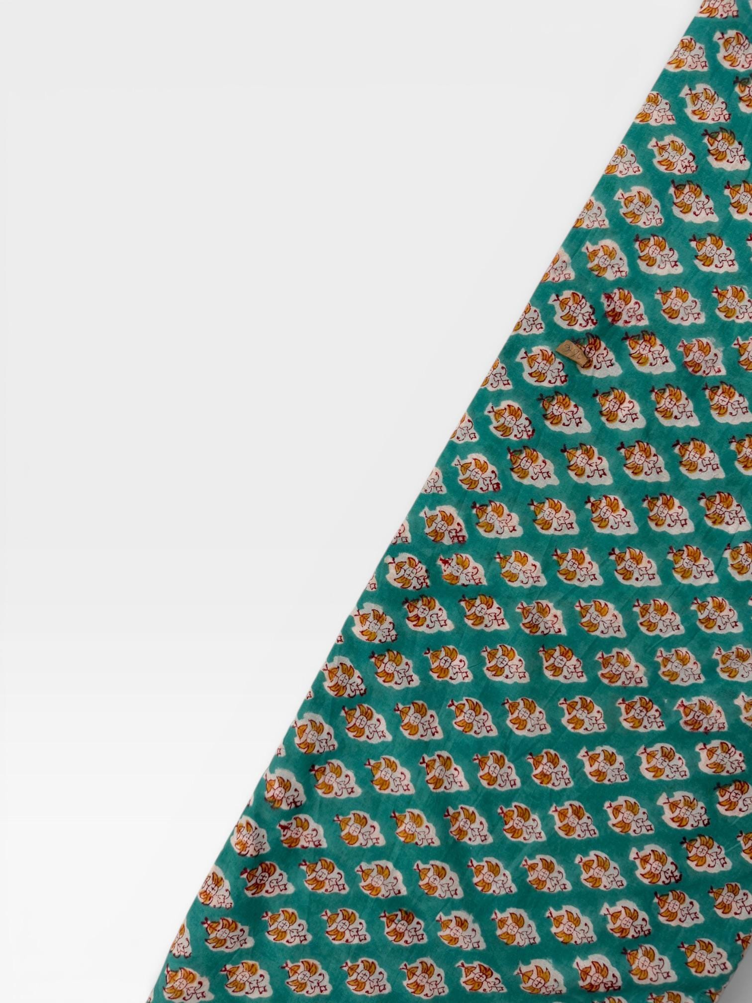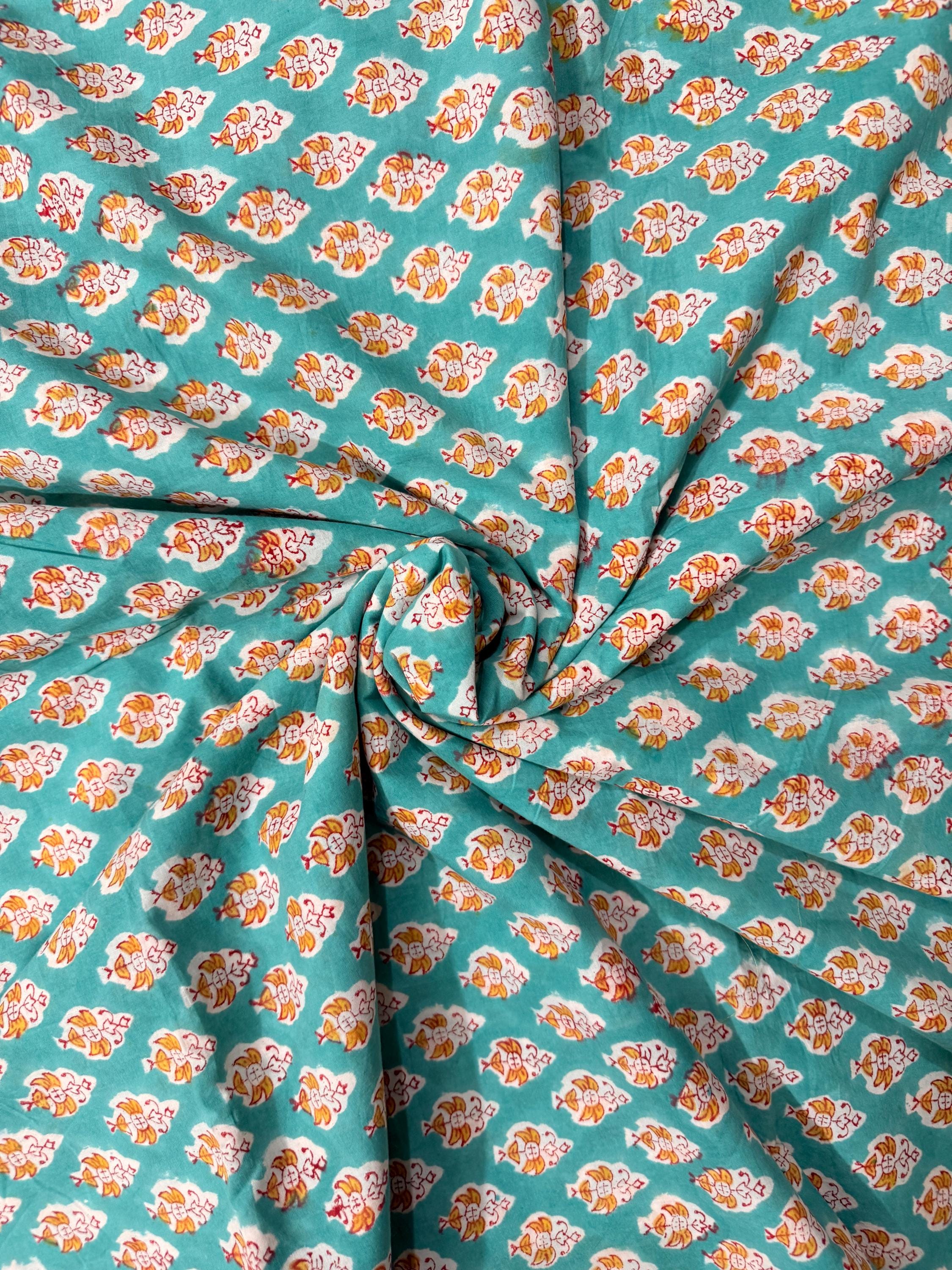 Add a fresh pop of color to your creations with this hand block printed cotton running fabric, crafted using traditional wooden blocks by skilled Indian artisans. The fabric features a repeating floral buta motif in mustard yellow, white, and soft red, beautifully set against a rich teal green base.