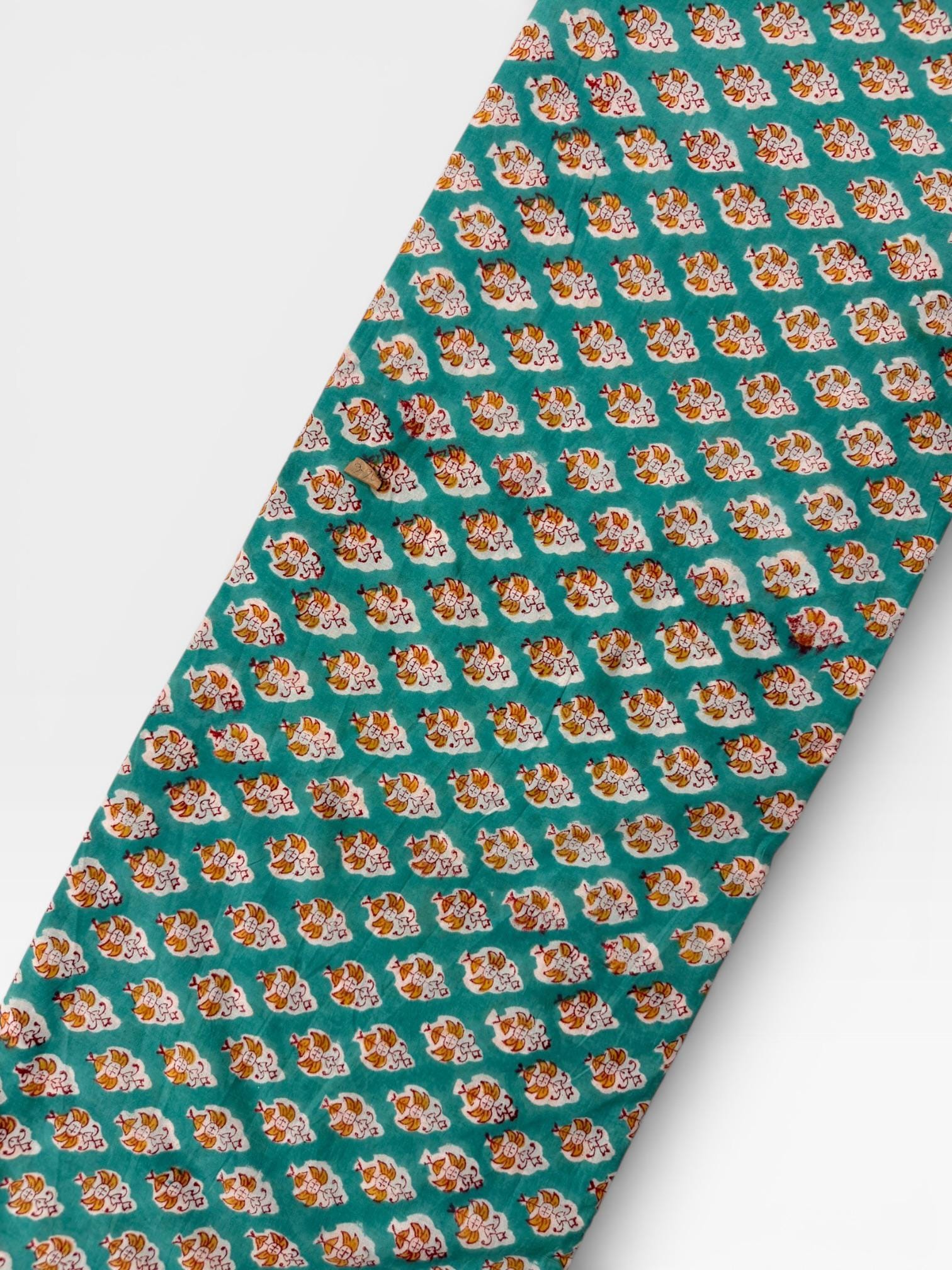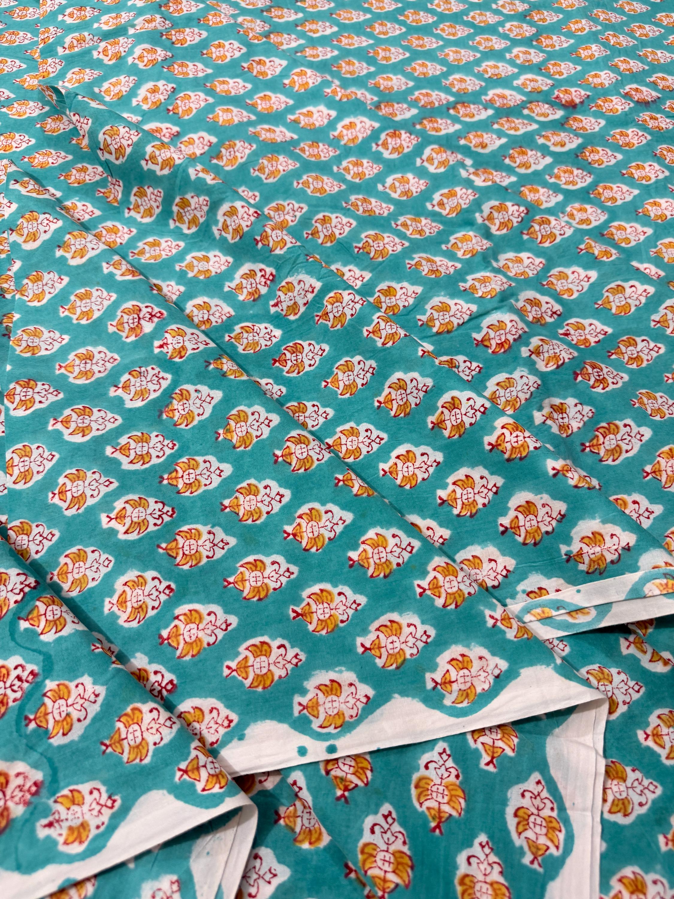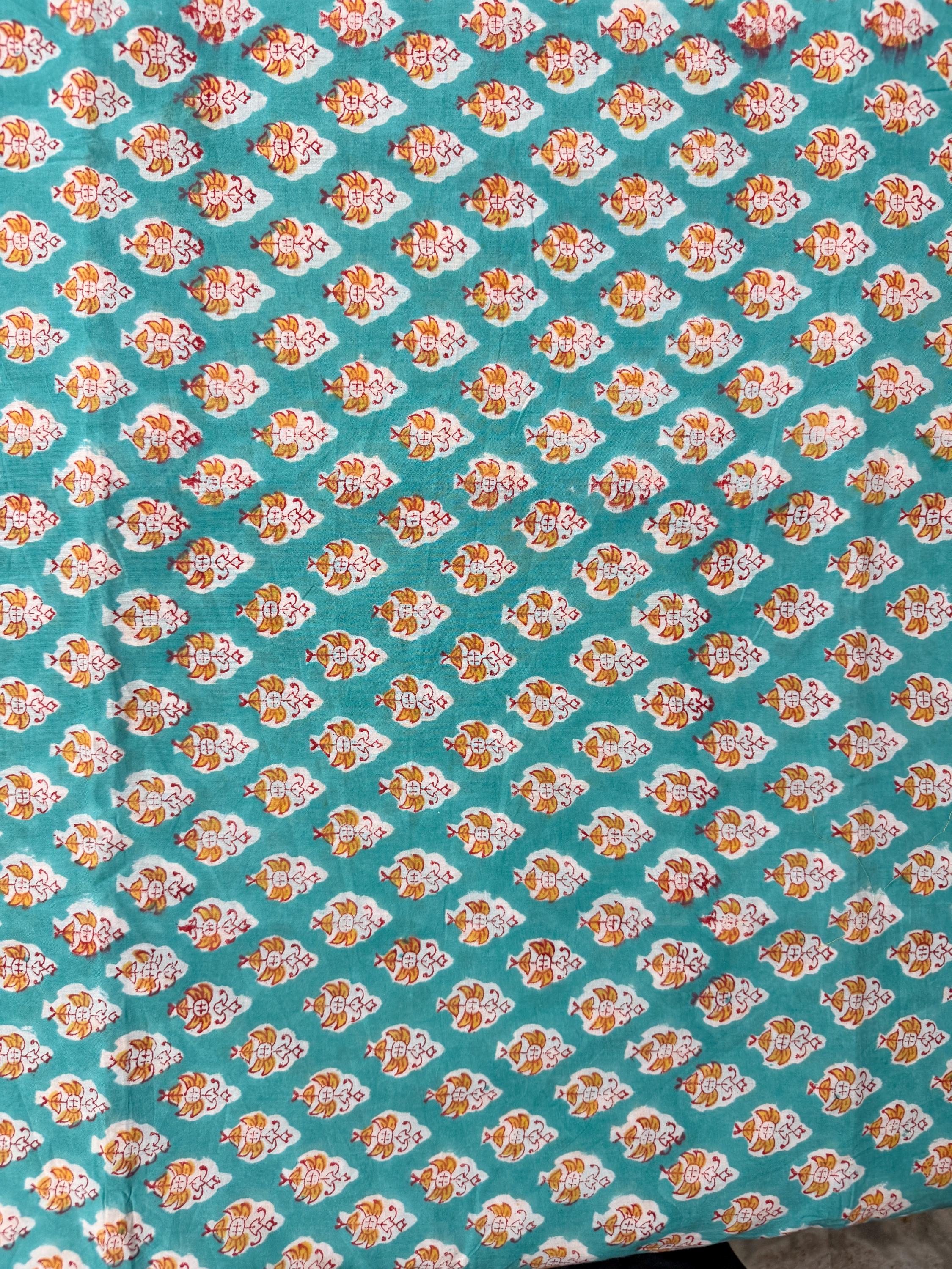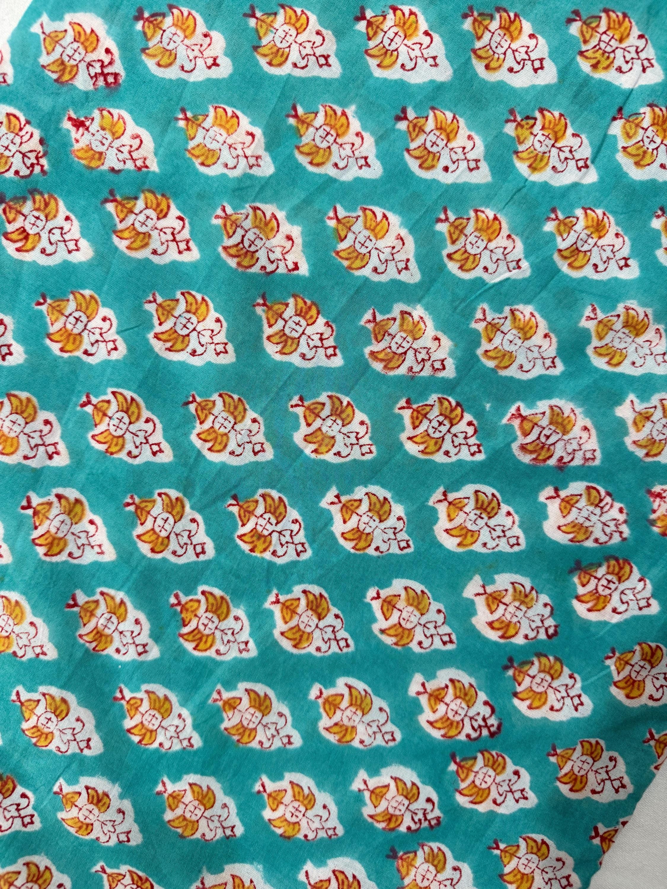 Add a fresh pop of color to your creations with this hand block printed cotton running fabric, crafted using traditional wooden blocks by skilled Indian artisans. The fabric features a repeating floral buta motif in mustard yellow, white, and soft red, beautifully set against a rich teal green base.