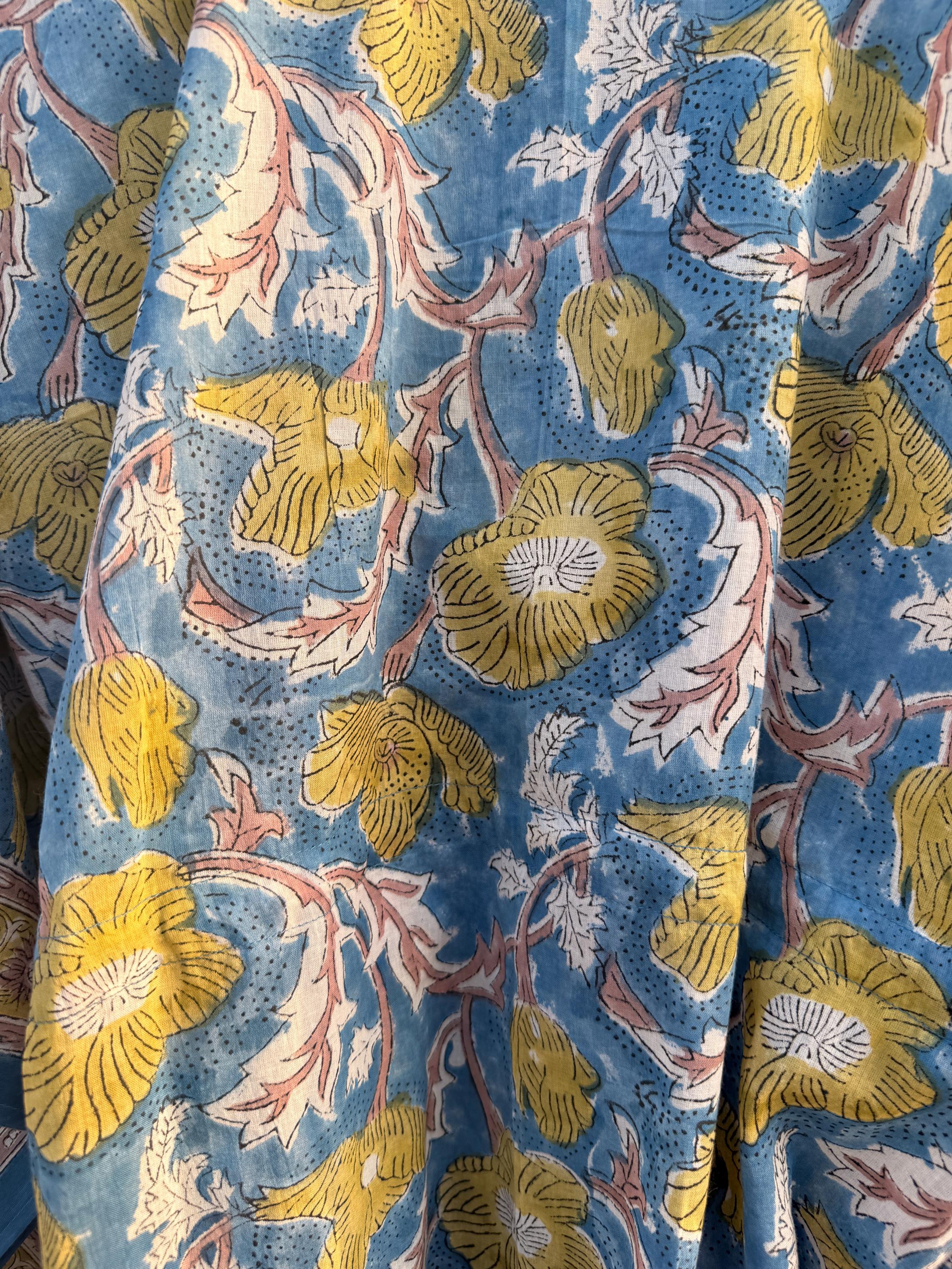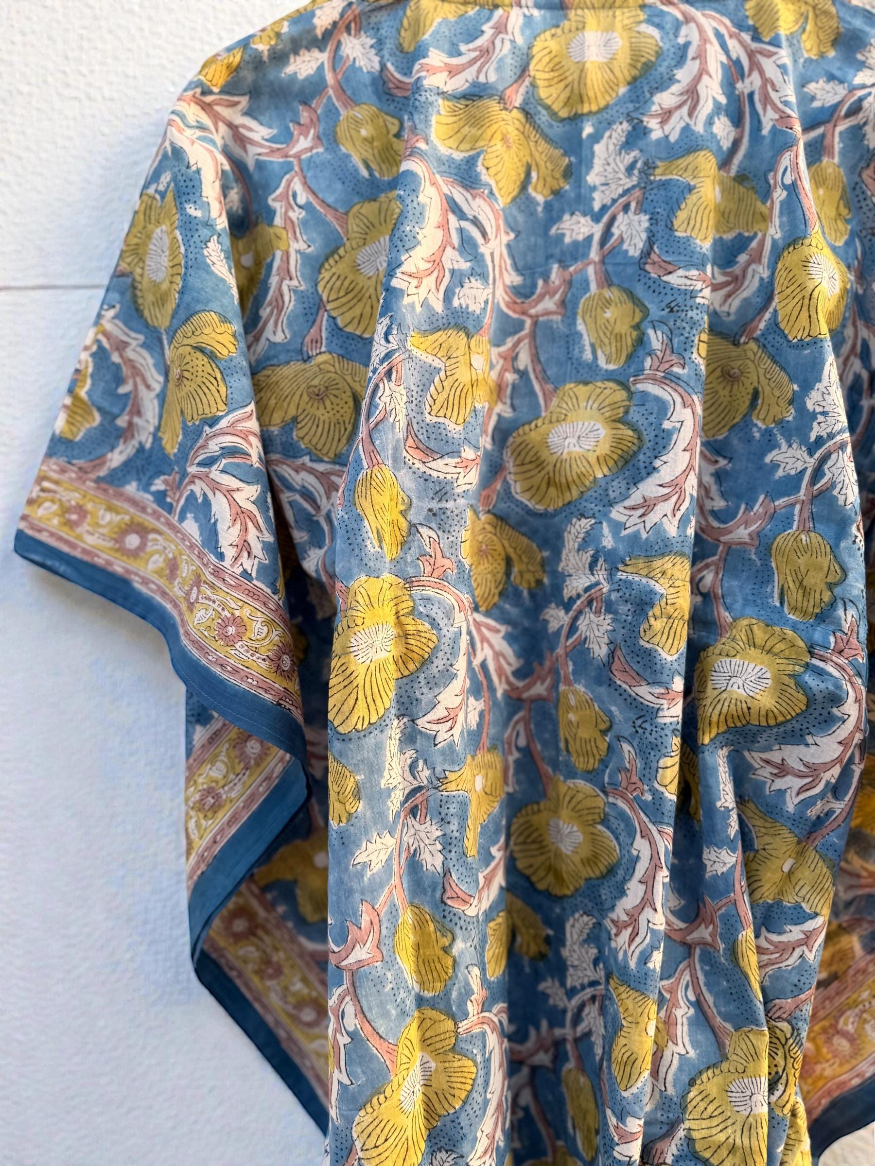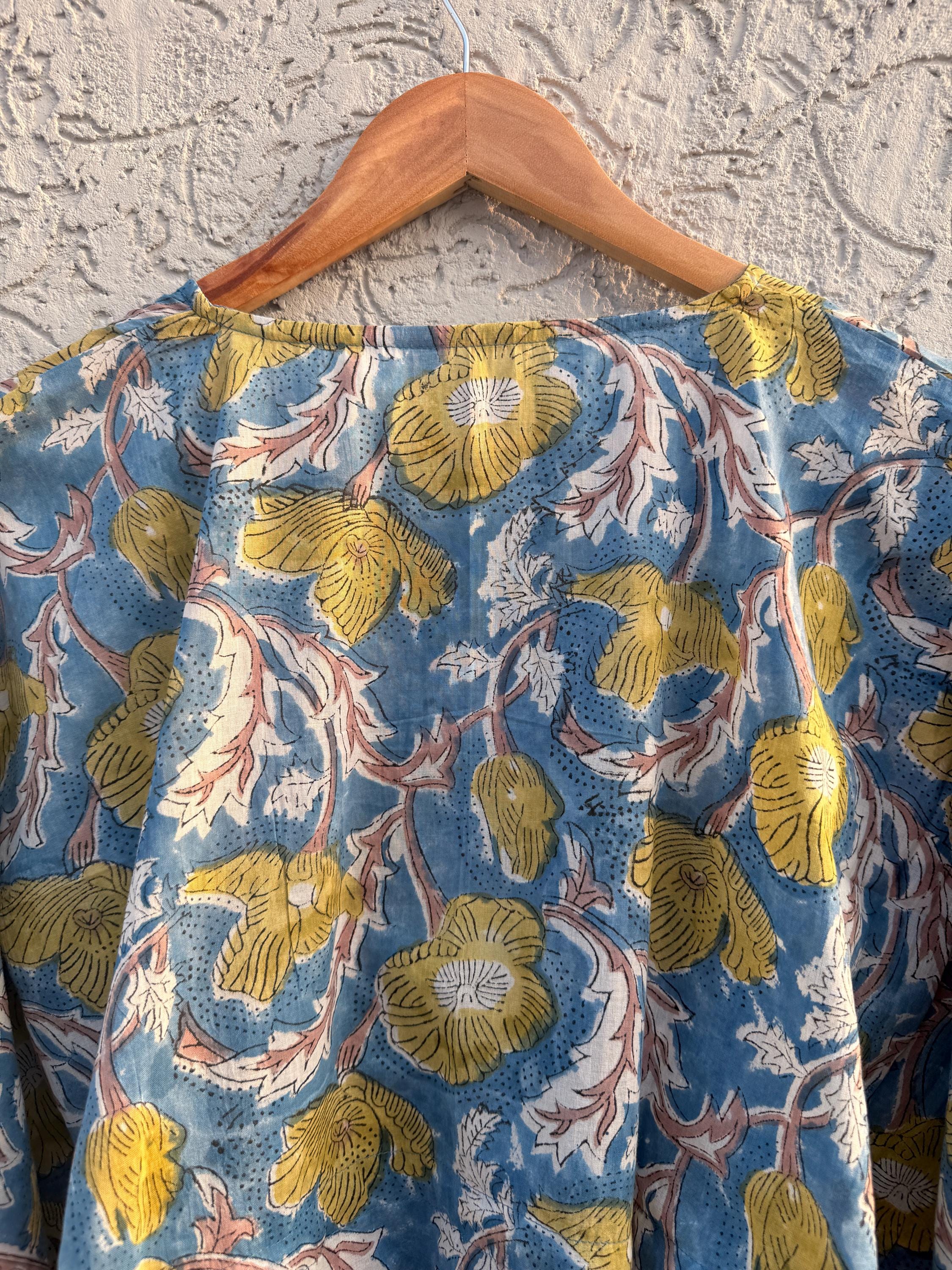 This free-size hand block printed cotton kaftan is designed for effortless comfort and timeless style. Crafted by skilled artisans using traditional Indian block printing techniques, this kaftan features a calming blue base adorned with mustard floral motifs and a beautifully coordinated contrast border along the sleeves and hem.