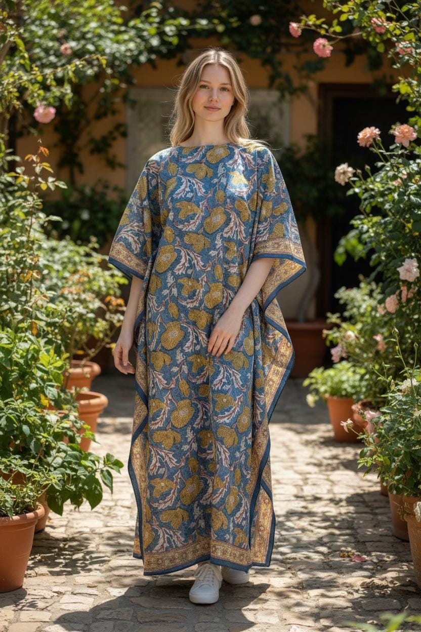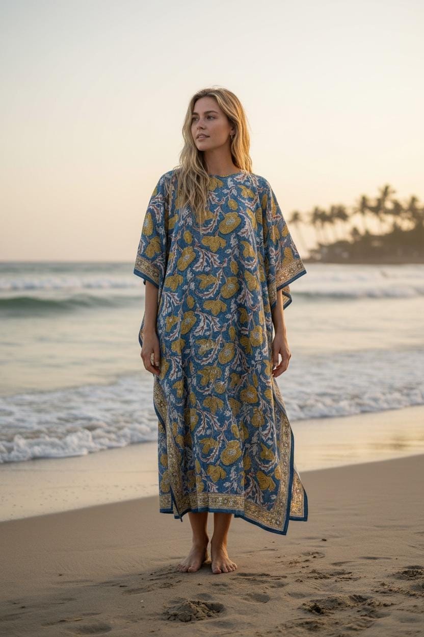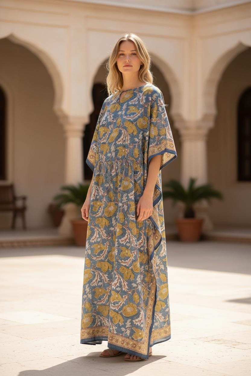 Every kaftan is individually hand printed, meaning no two pieces are exactly alike—small variations in print and color are part of its handmade charm and authenticity.