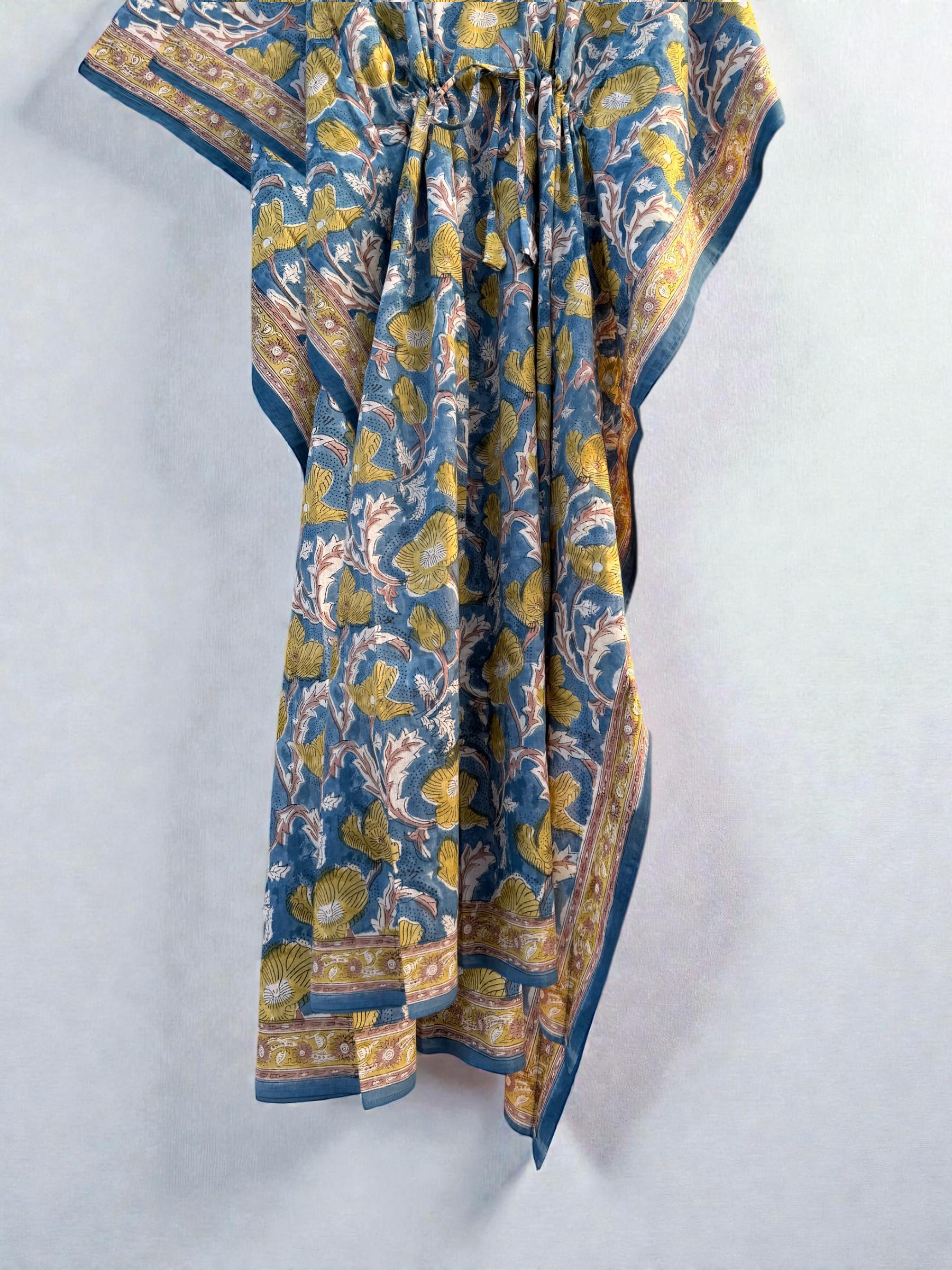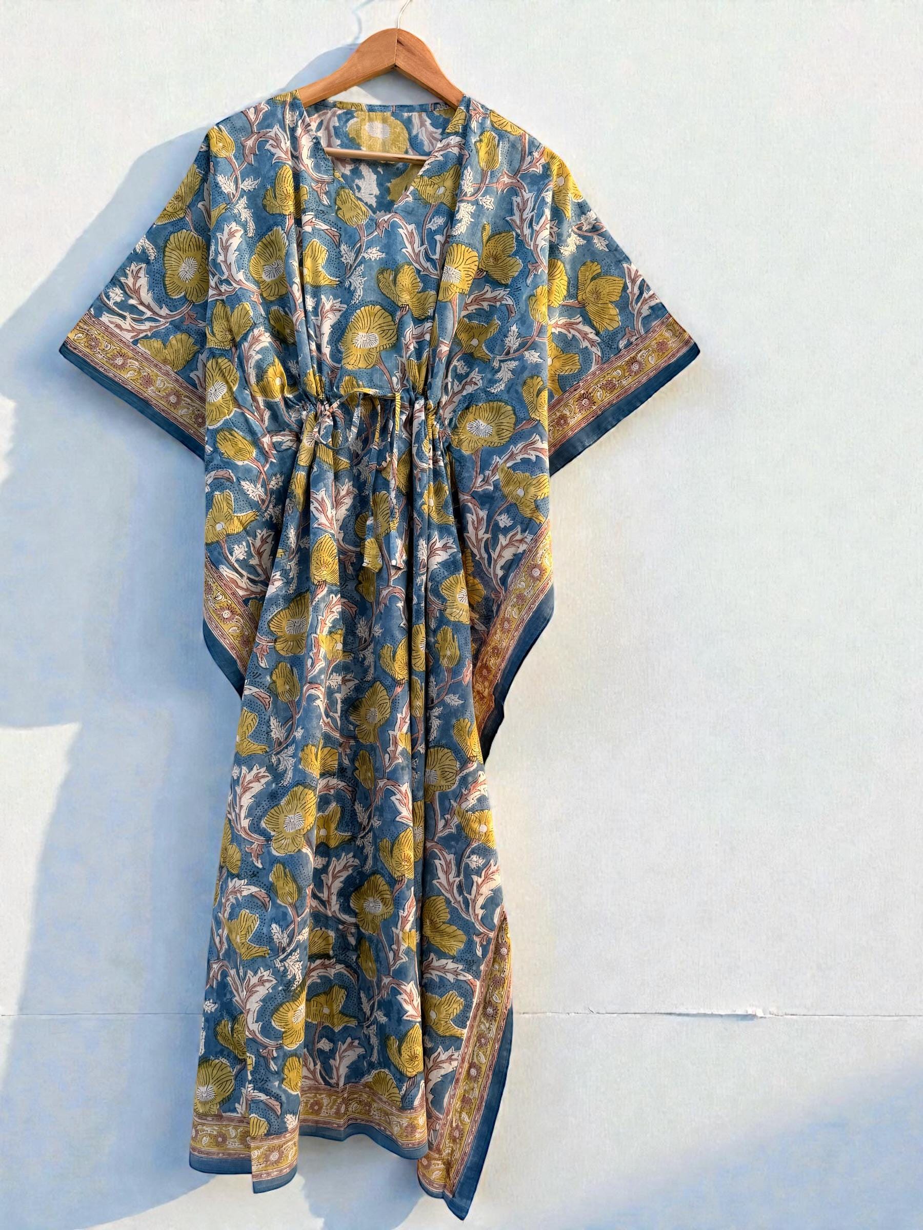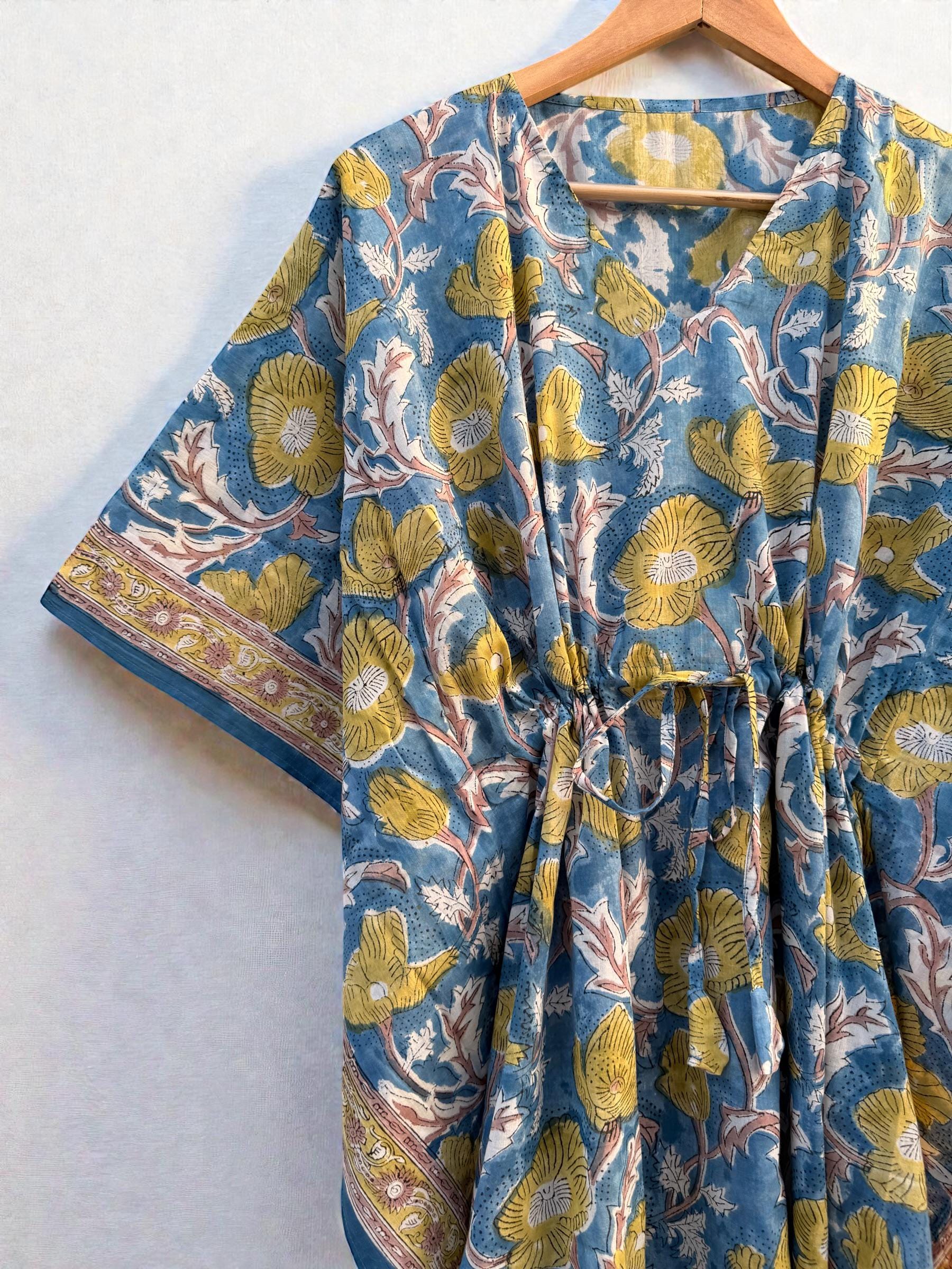 Hand Block Printed Cotton Kaftan - Floral Boho Lounge Dress Kaftan with Drawstring Waist | Indian Summer Dress, Beach & Resort Wear