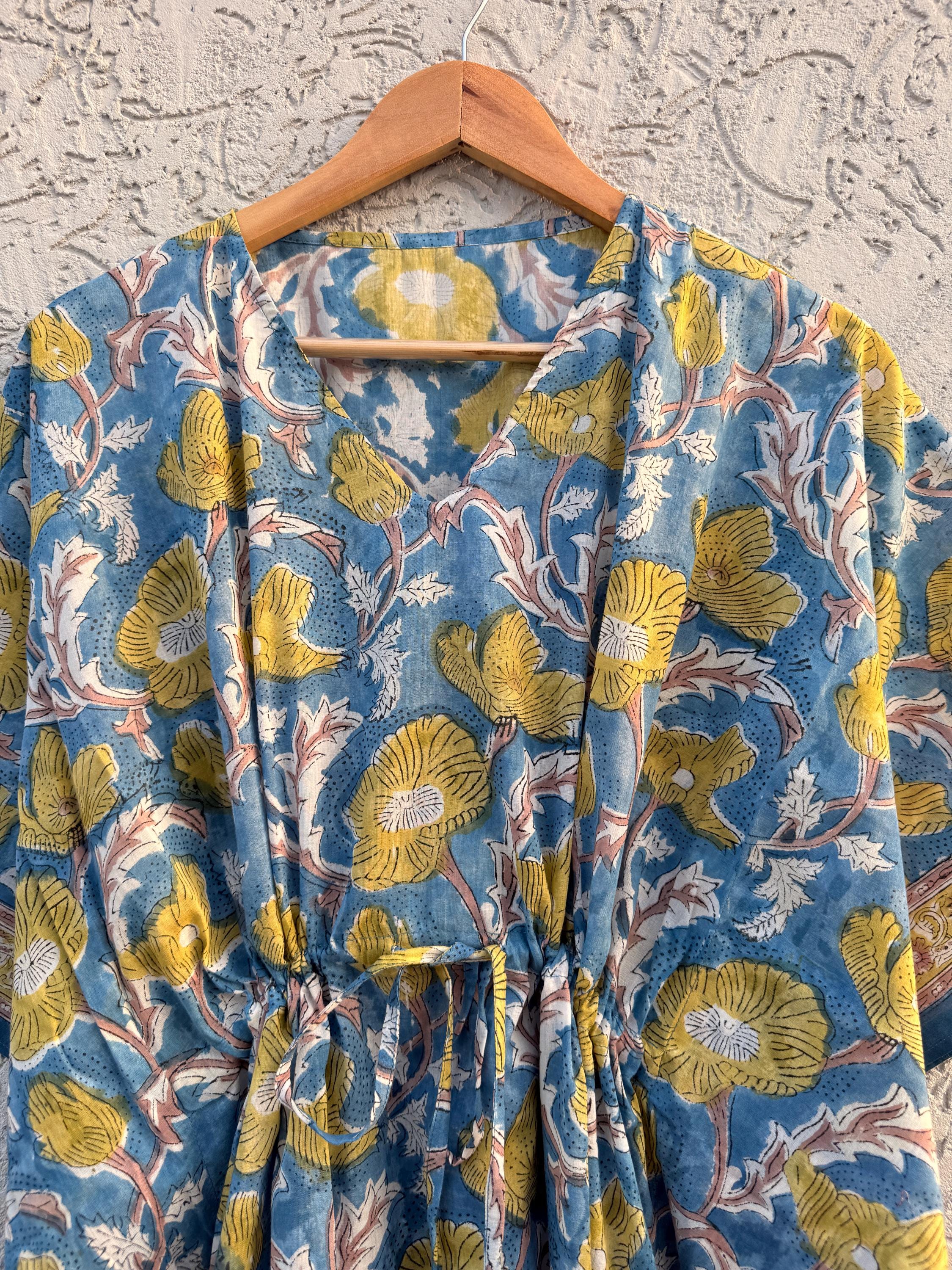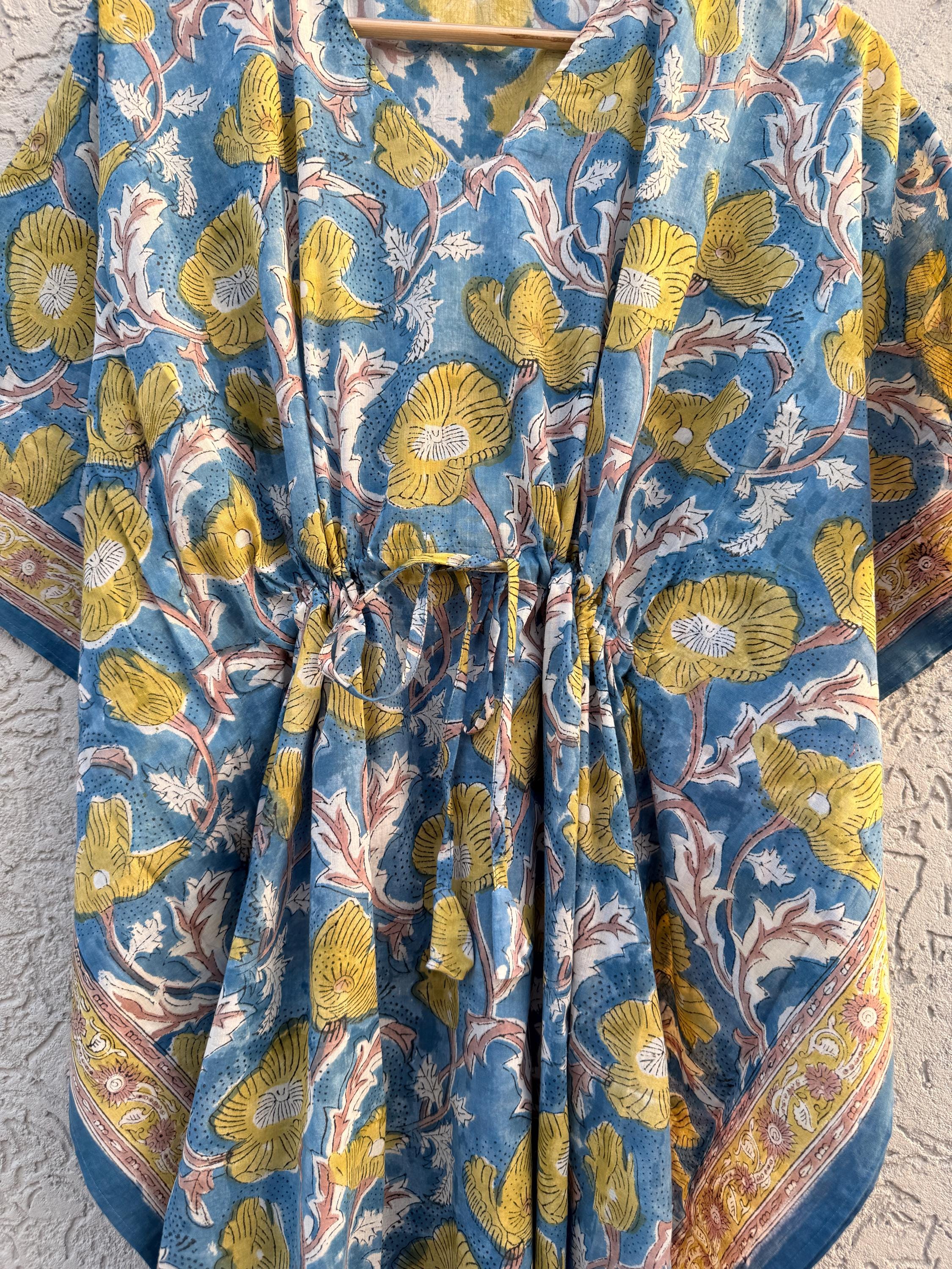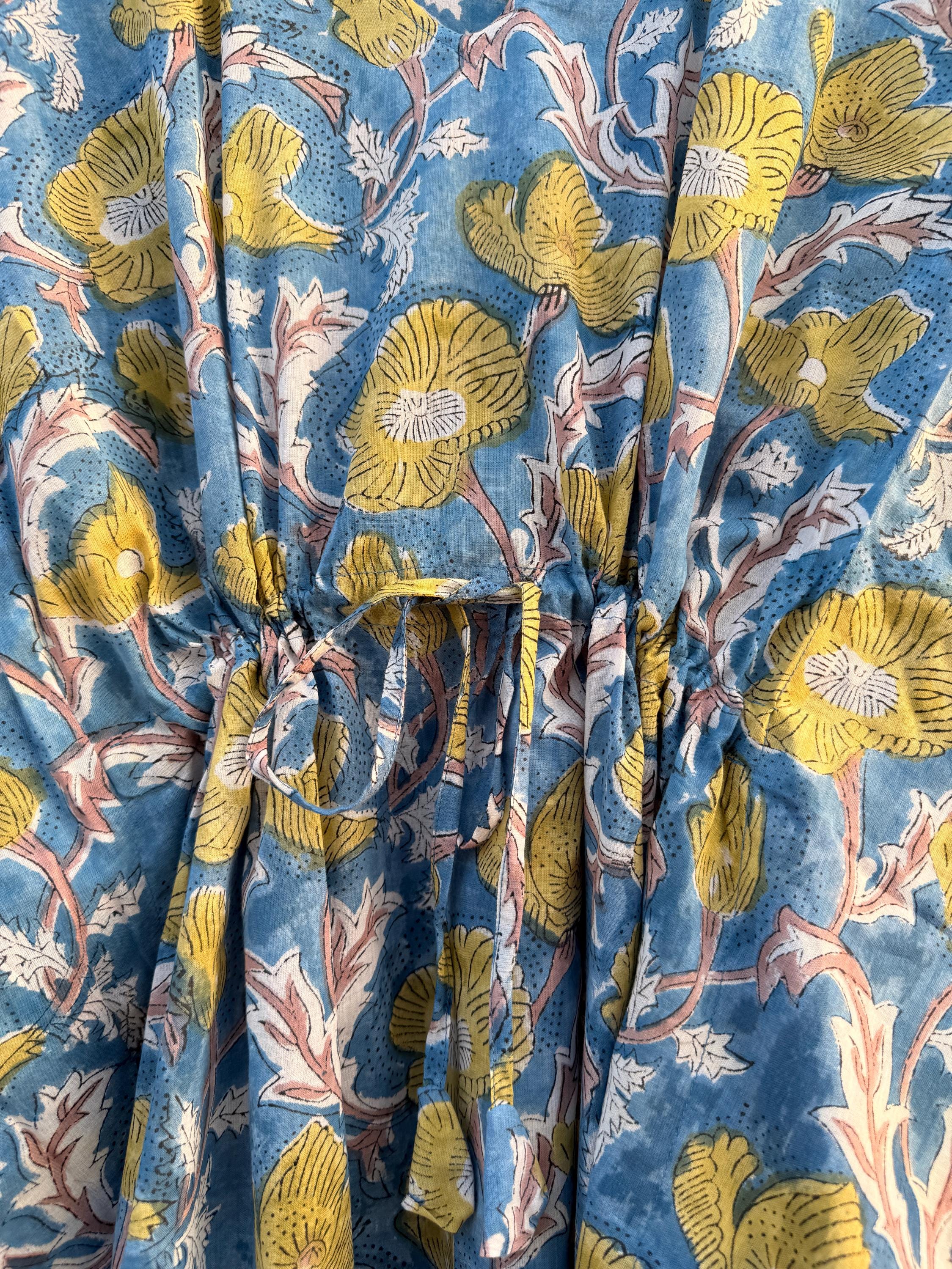 Hand Block Printed Cotton Kaftan - Floral Boho Lounge Dress Kaftan with Drawstring Waist | Indian Summer Dress, Beach & Resort Wear