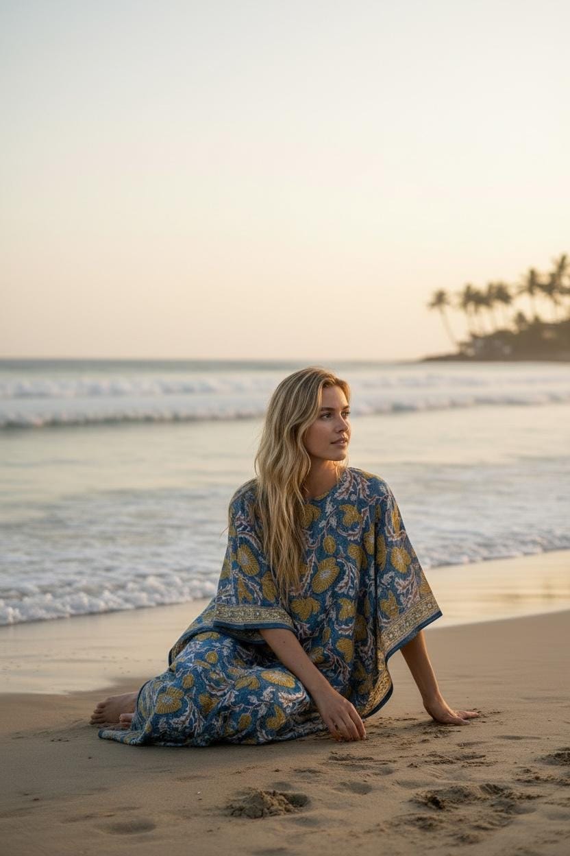 The silhouette is loose, flowy, and breathable, making it ideal for warm climates and all-day wear. A soft V-neckline and adjustable waist tie add gentle structure while keeping the fit relaxed and flattering. The lightweight cotton fabric feels airy against the skin, perfect for summer lounging, beach days, or slow vacation mornings.