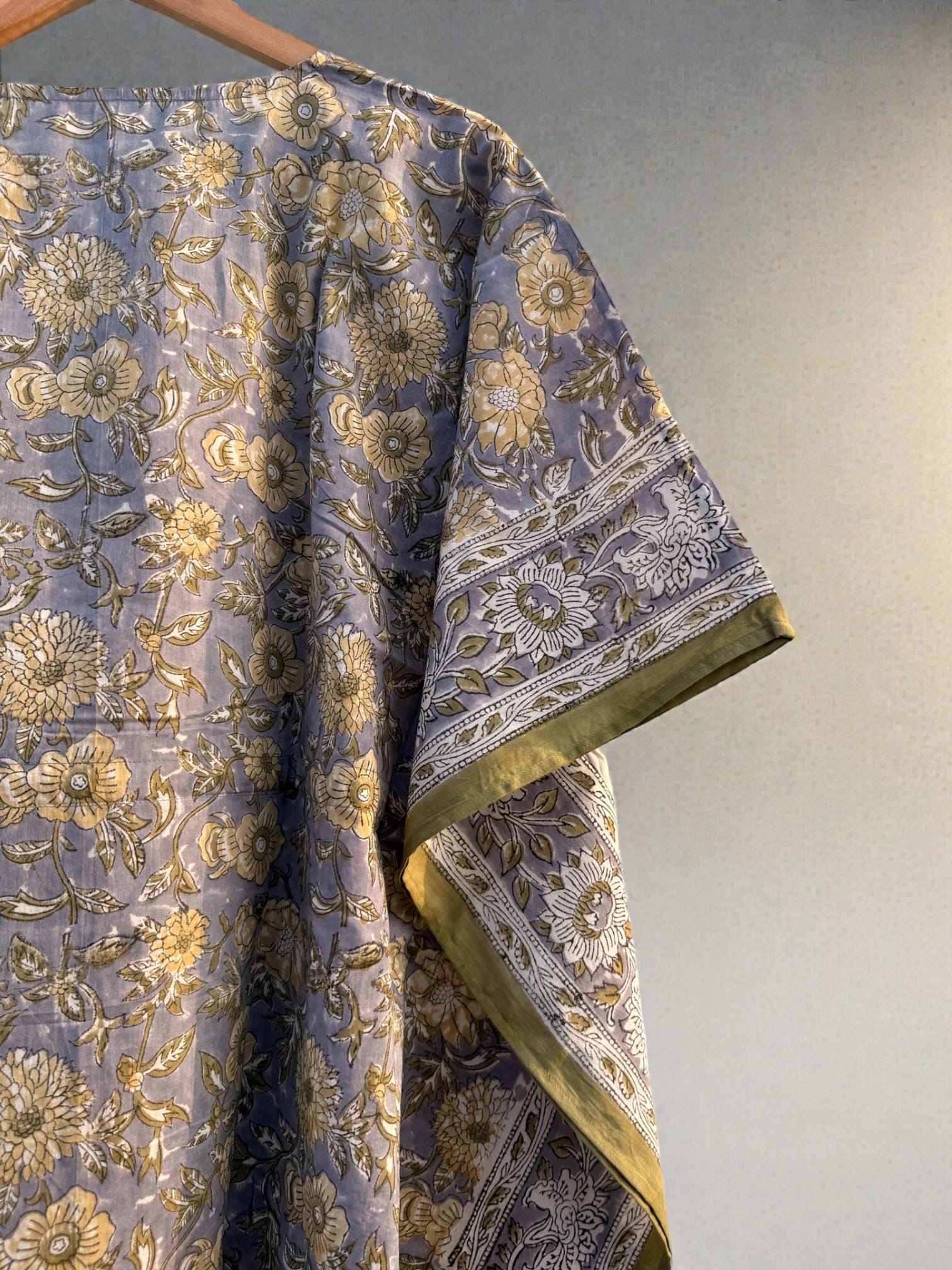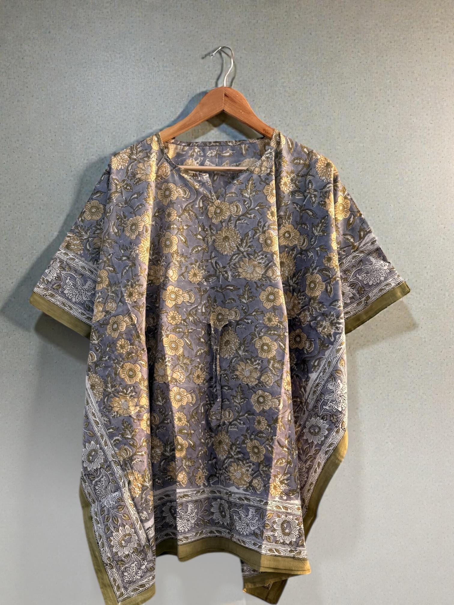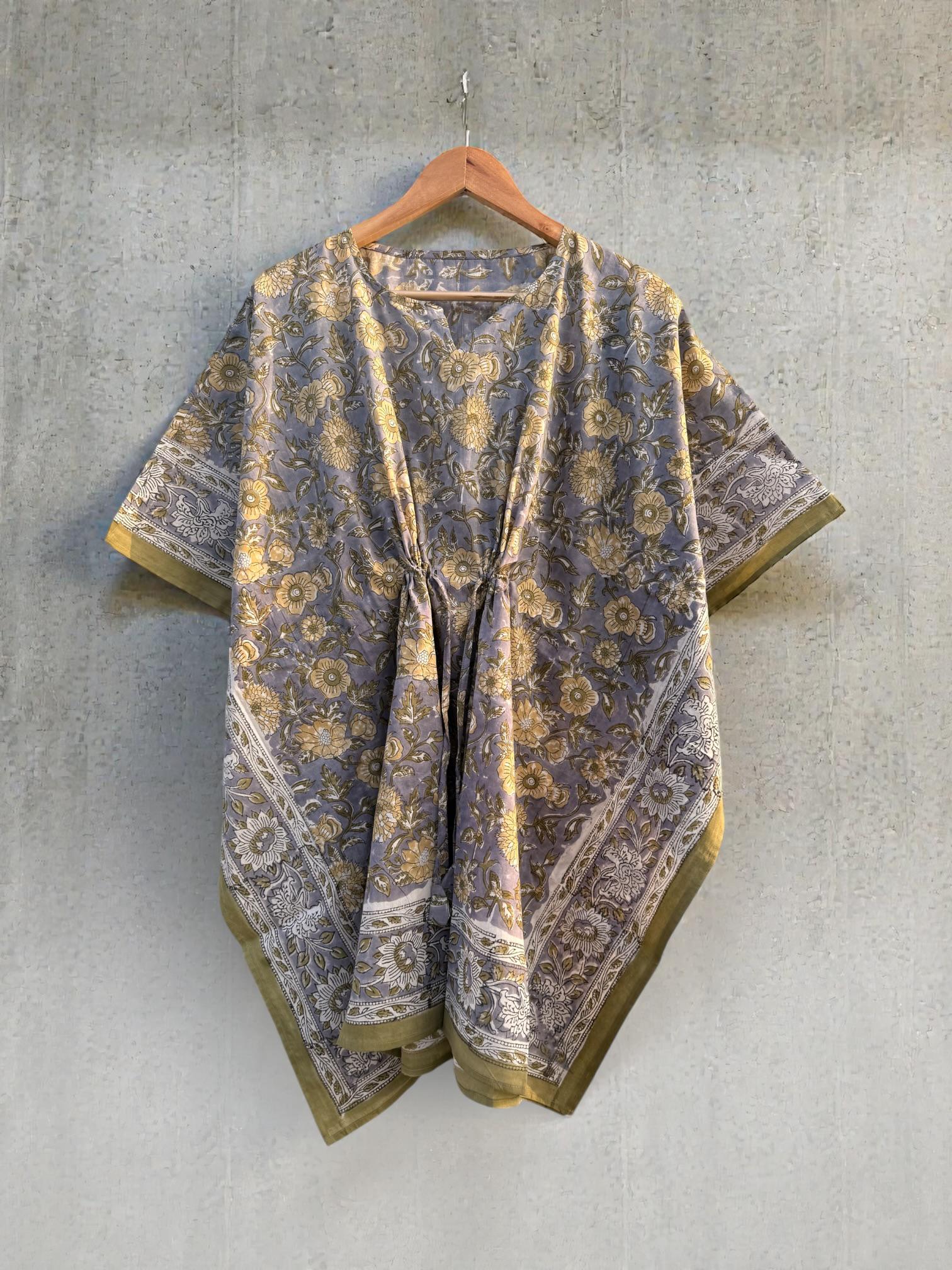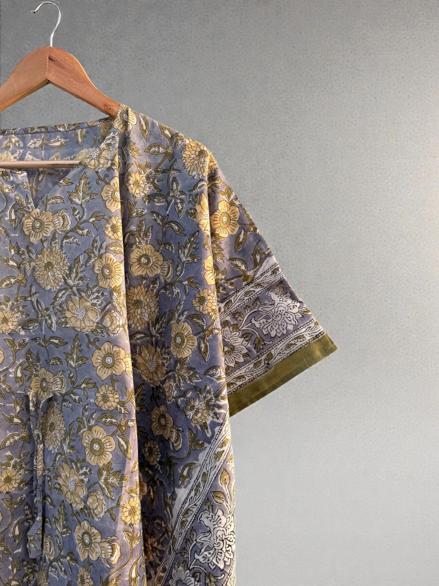 Add effortless elegance to your everyday wardrobe with this hand block printed short cotton kaftan, thoughtfully crafted by skilled Indian artisans. Featuring a soft muted grey-blue base with delicate floral motifs and a contrast traditional border, this piece reflects timeless block print artistry.