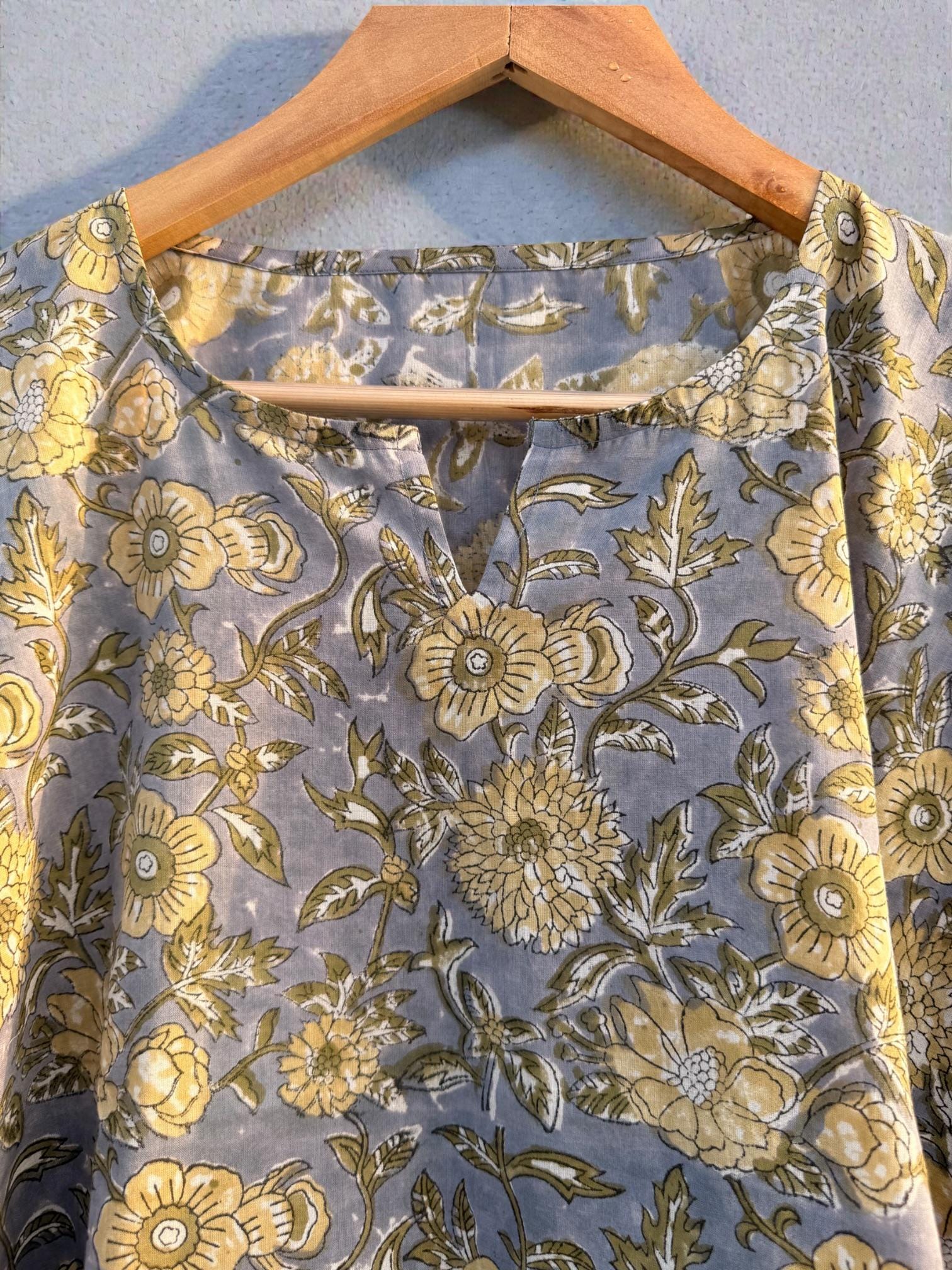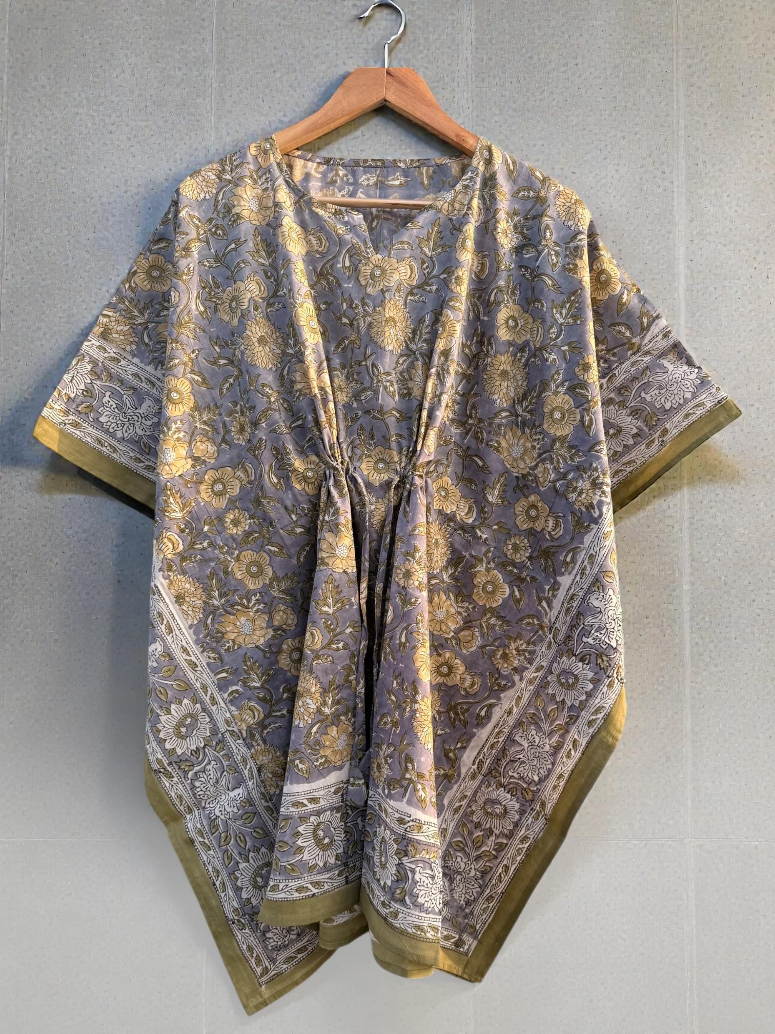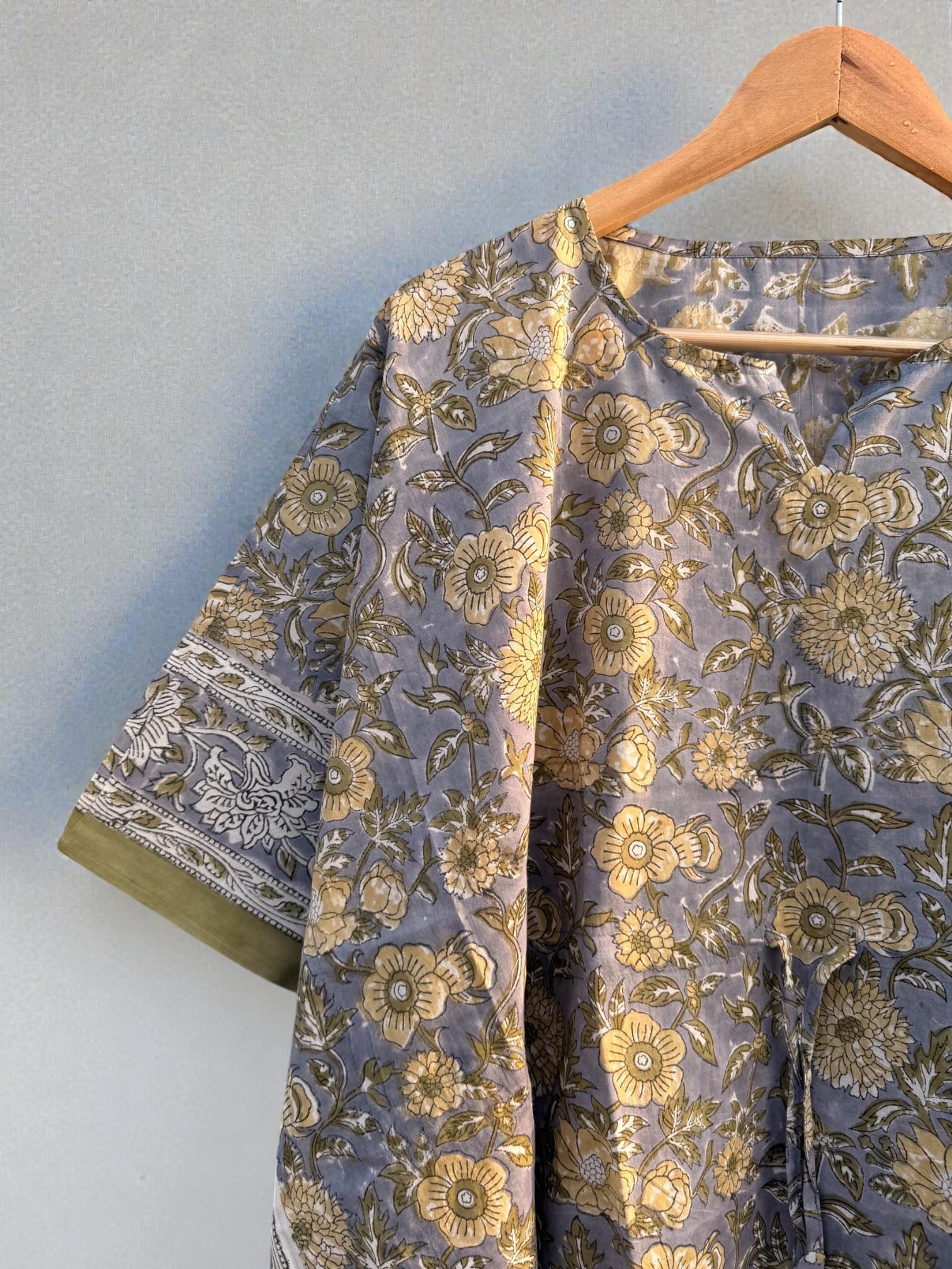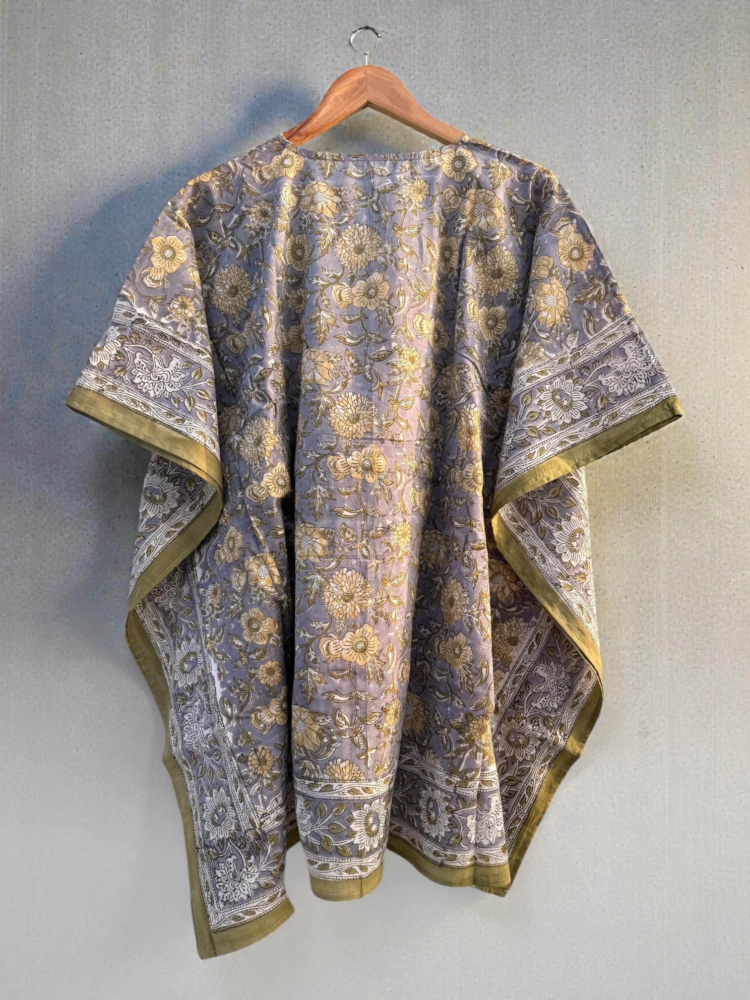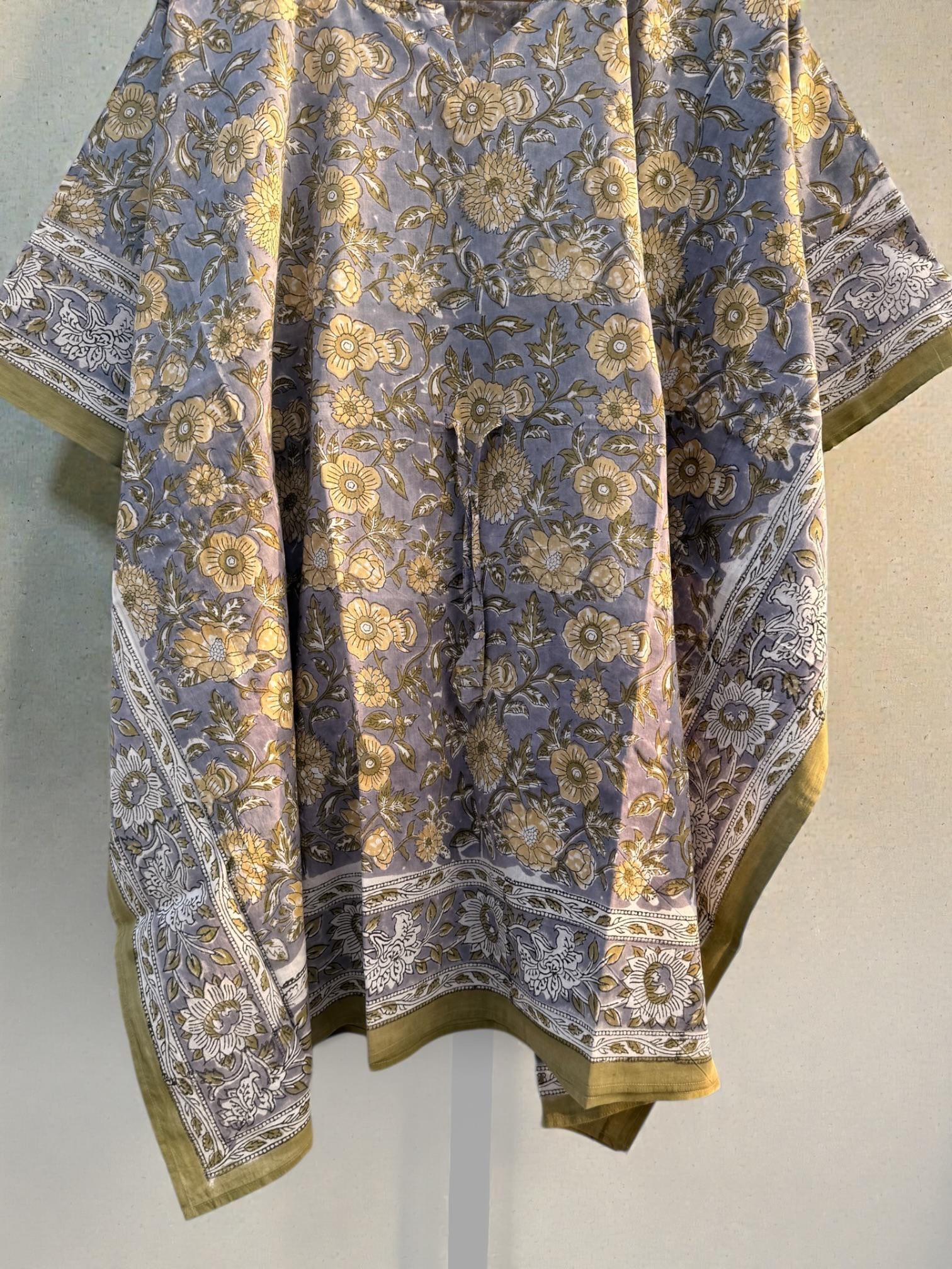 Add effortless elegance to your everyday wardrobe with this hand block printed short cotton kaftan, thoughtfully crafted by skilled Indian artisans. Featuring a soft muted grey-blue base with delicate floral motifs and a contrast traditional border, this piece reflects timeless block print artistry.