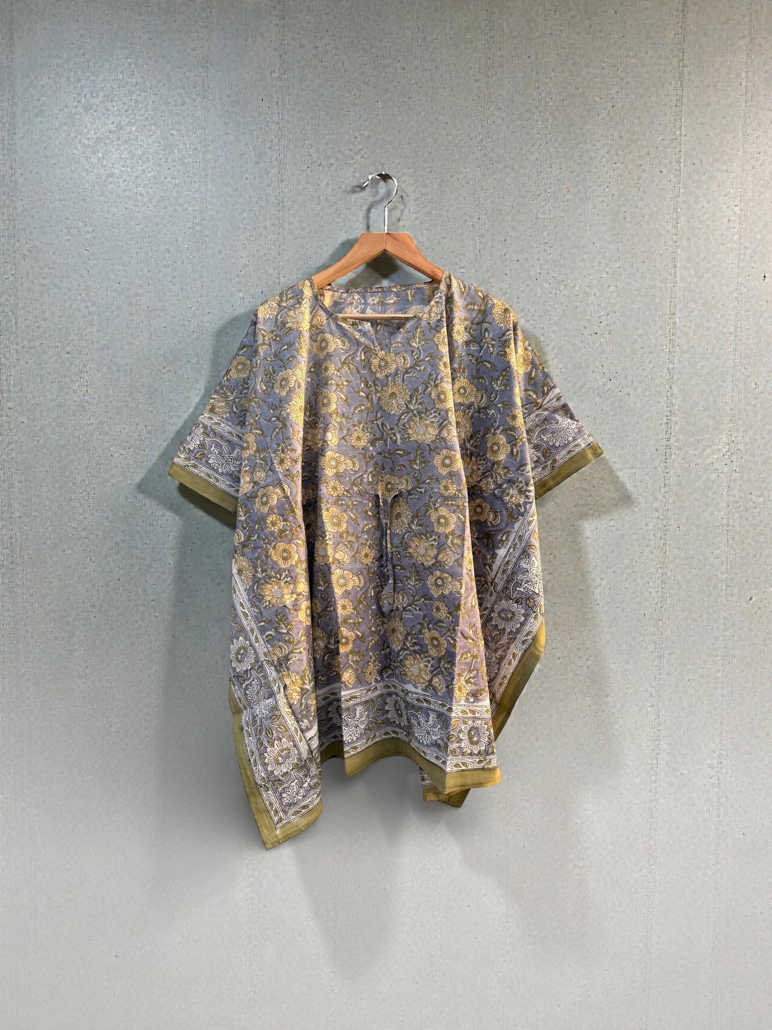 Hand Block Printed Cotton Kaftan – Floral Boho Lounge Top| Boho Summer Kaftan Dress, Relaxed Fit Tunic