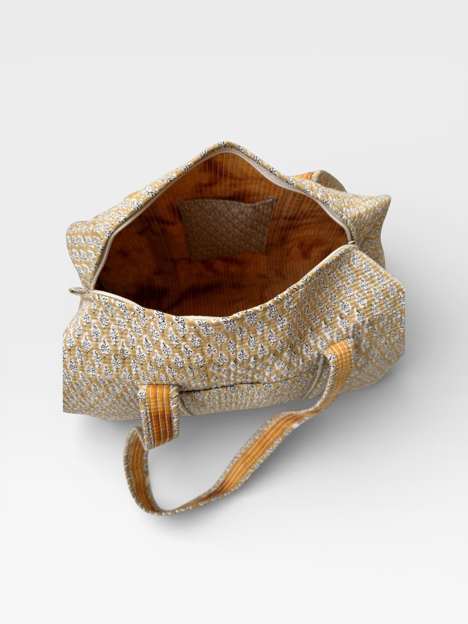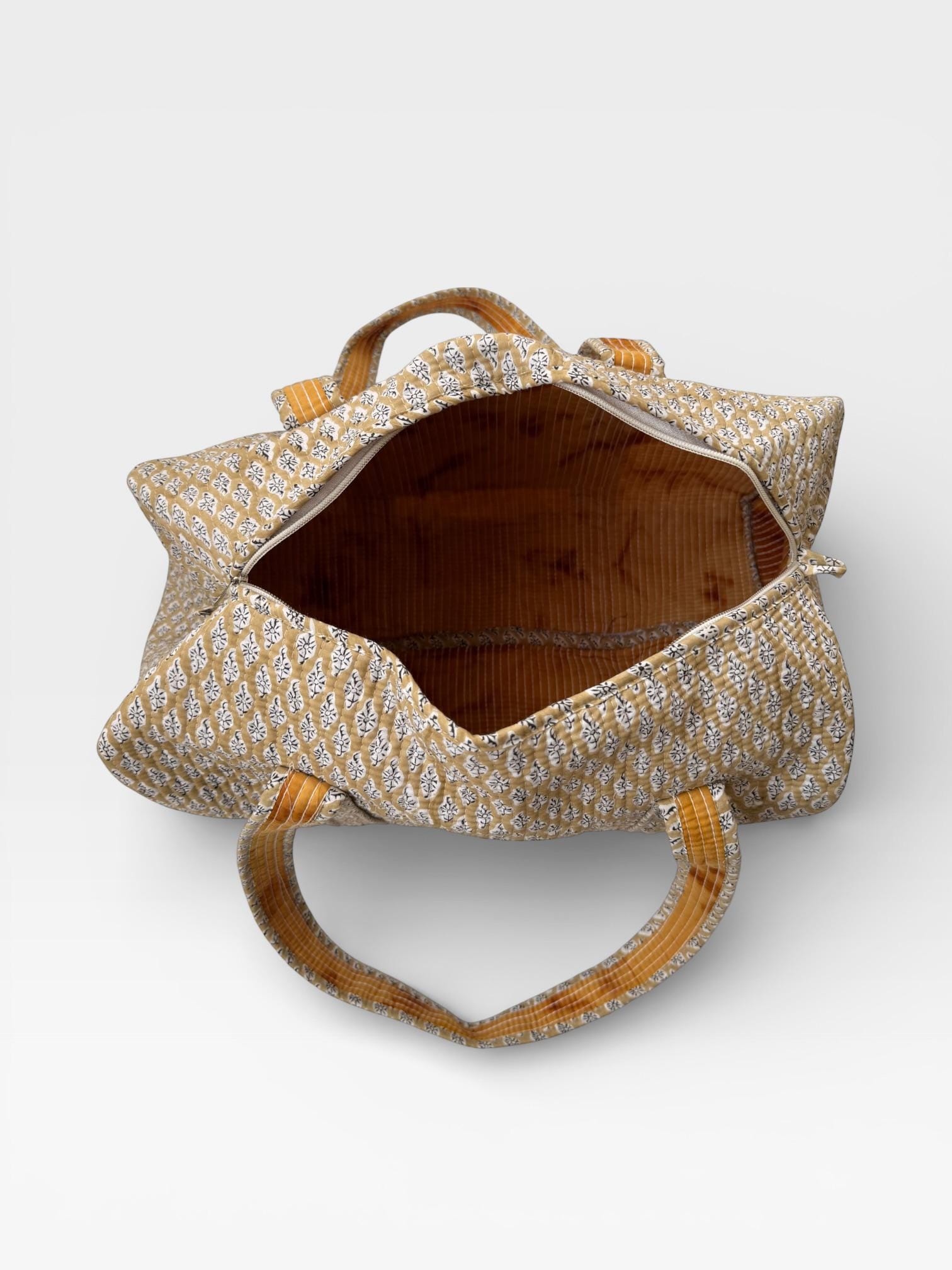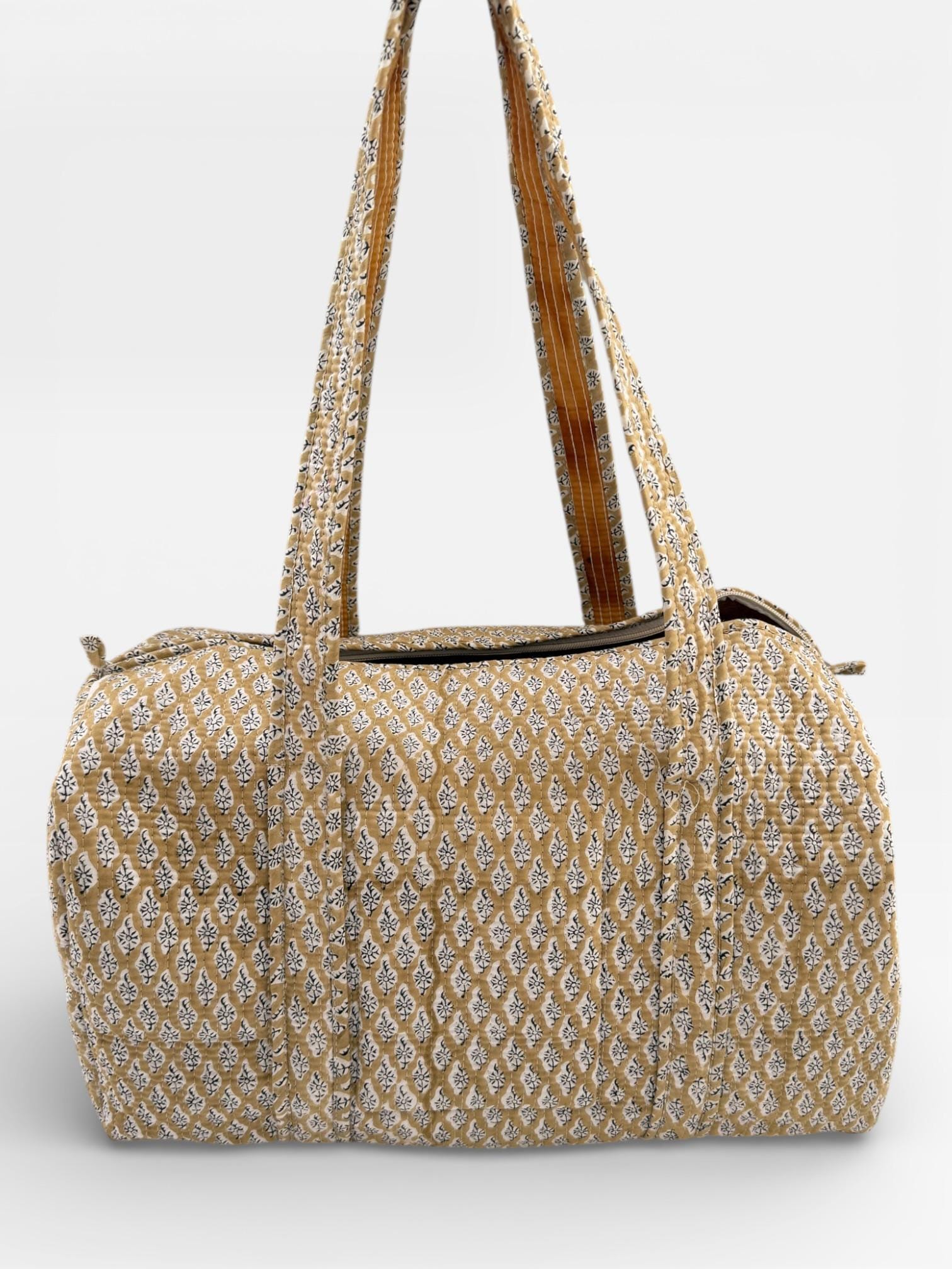 Spacious yet lightweight, it’s perfect for weekend trips, gym use, overnight stays, yoga sessions, or daily carry. The sturdy cotton fabric, reinforced handles, and roomy interior make it both durable and practical, while the unique block print adds a distinctive boho charm.