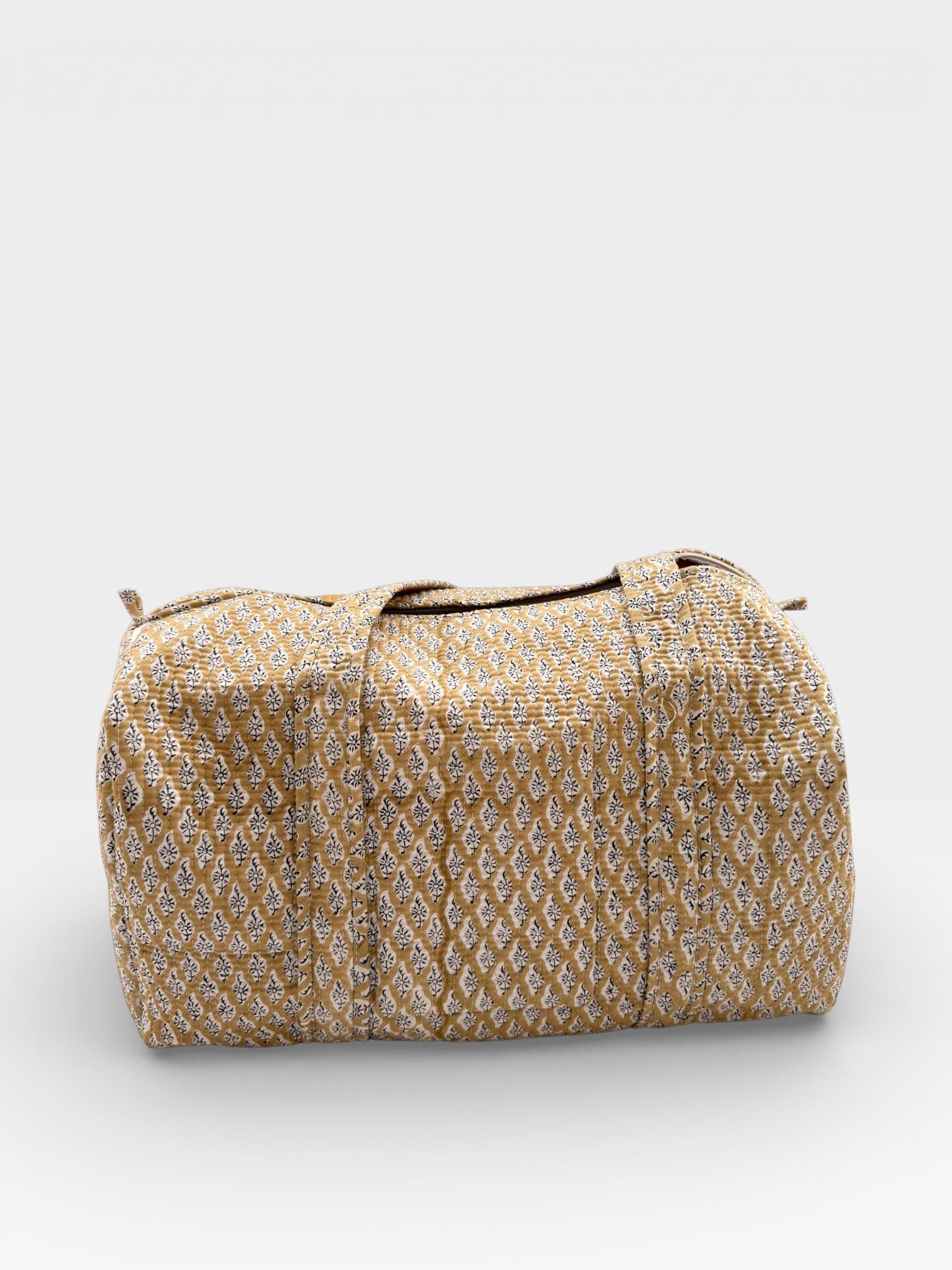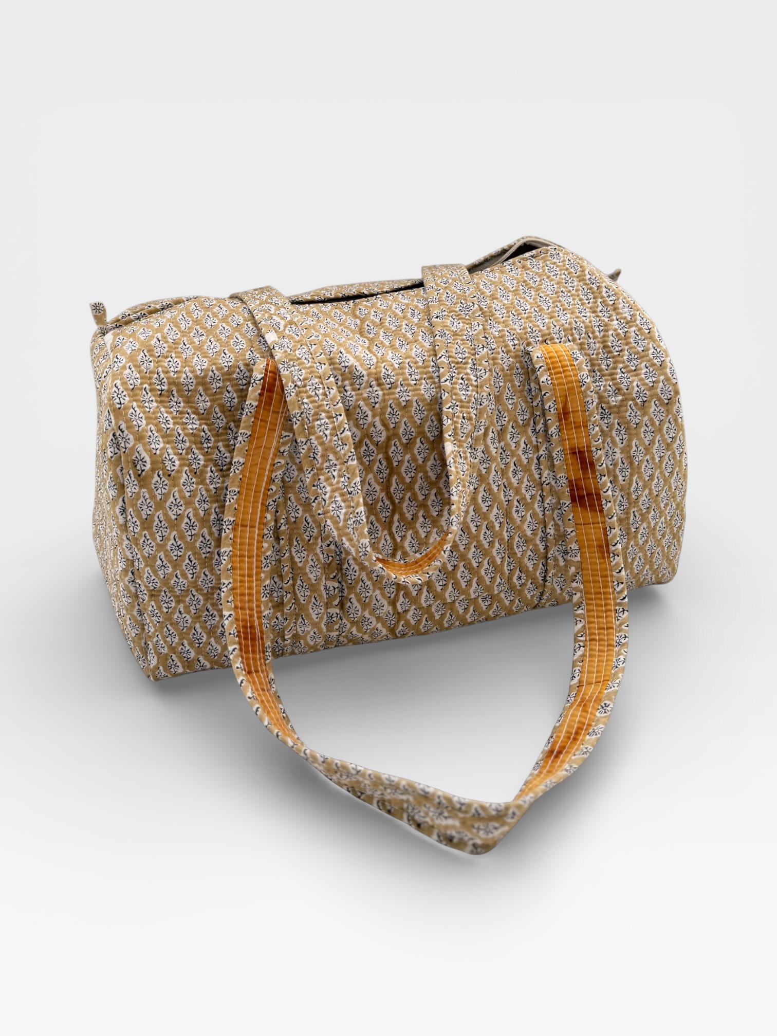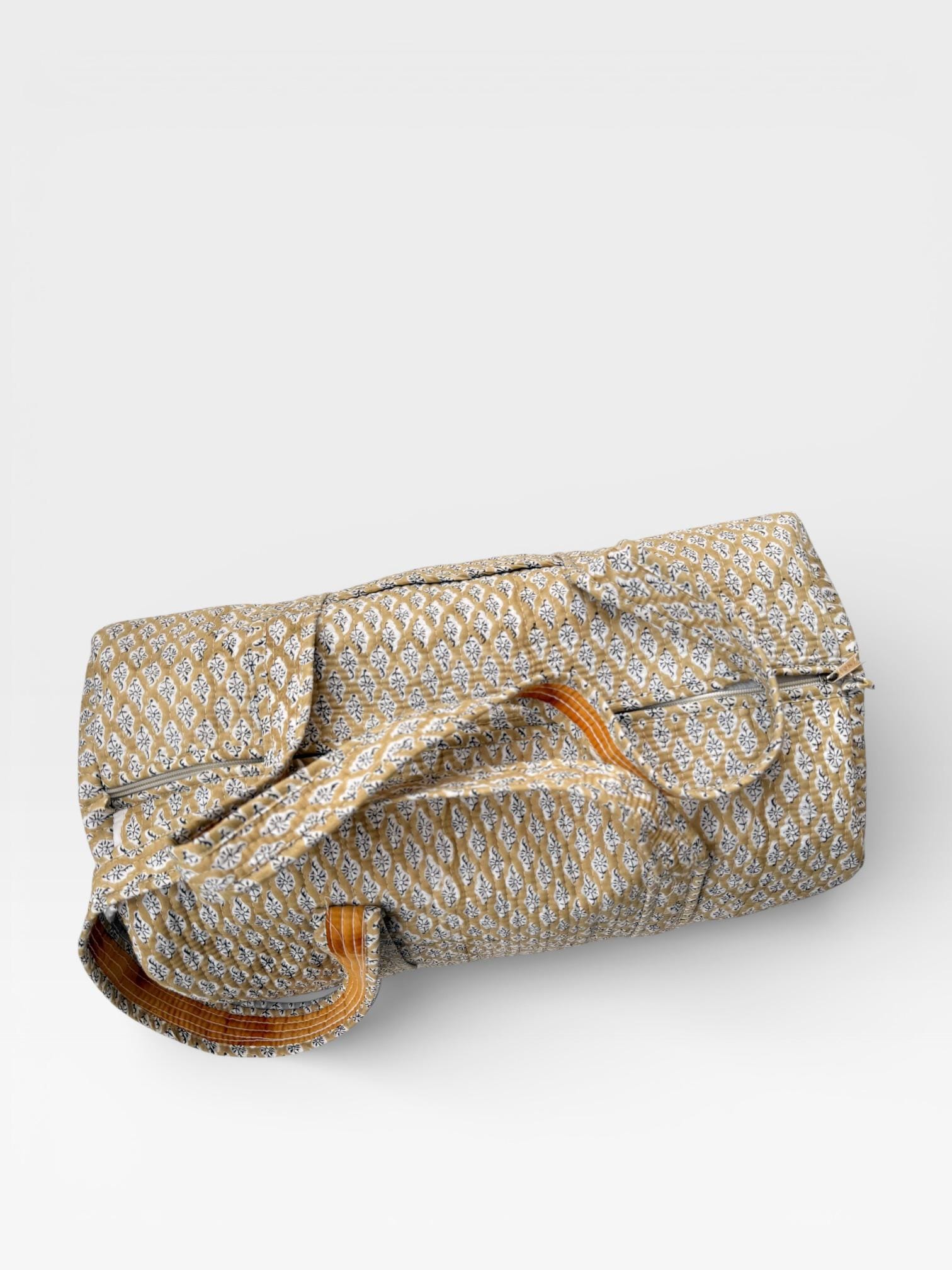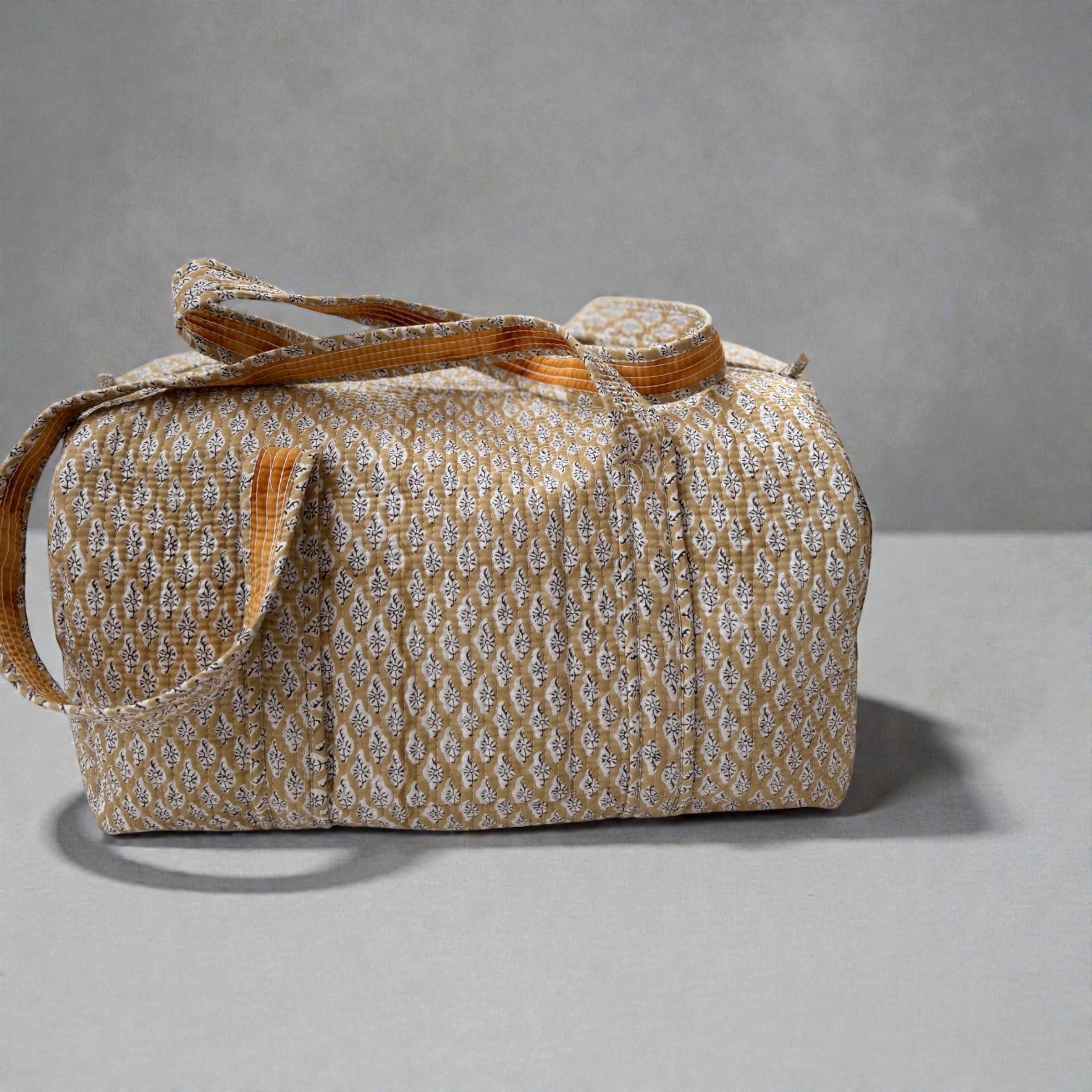 Travel in style with this hand block printed cotton duffle bag, crafted using traditional Indian block printing techniques. Featuring vibrant floral motifs and a timeless artisanal design, this bag blends functionality with handcrafted beauty.
